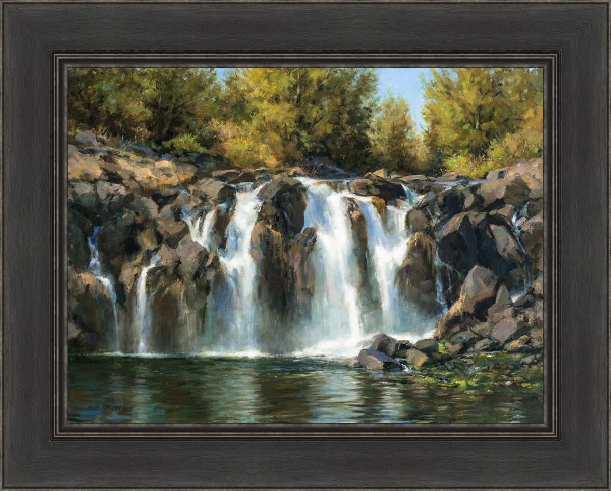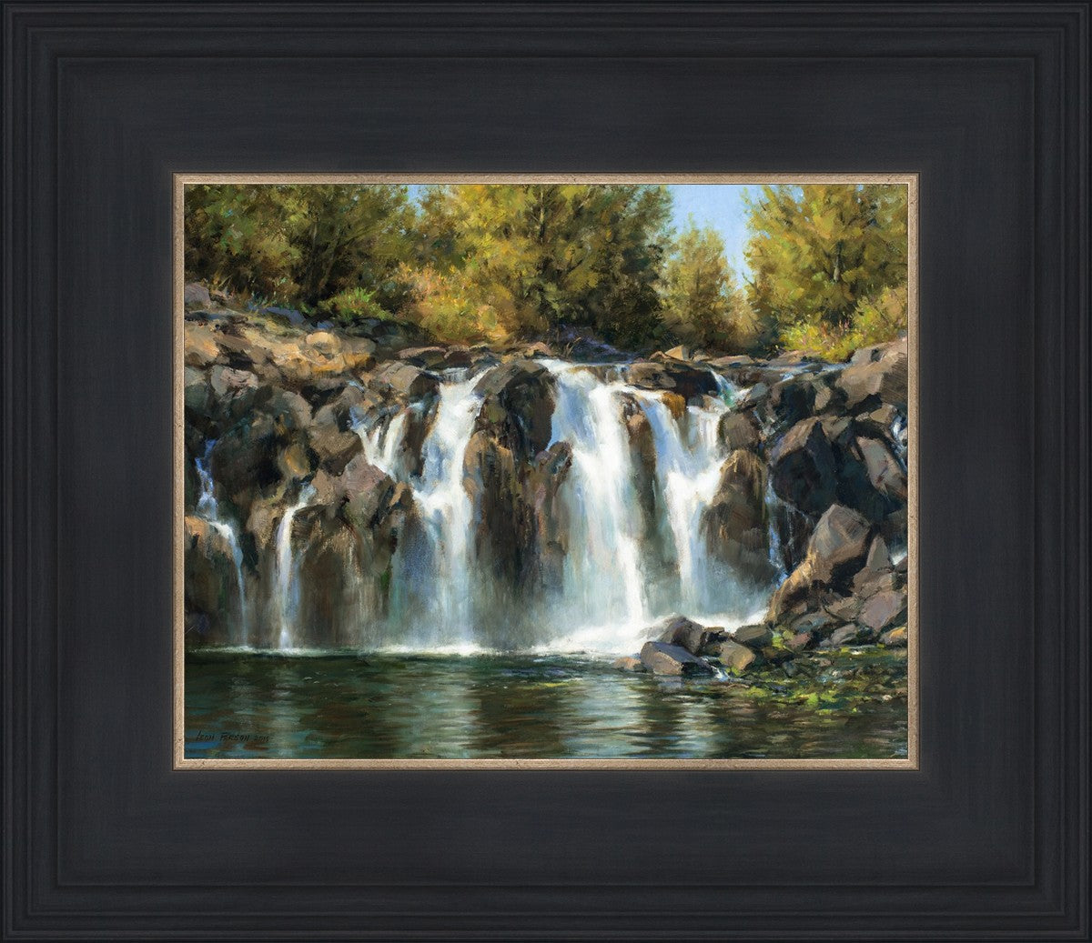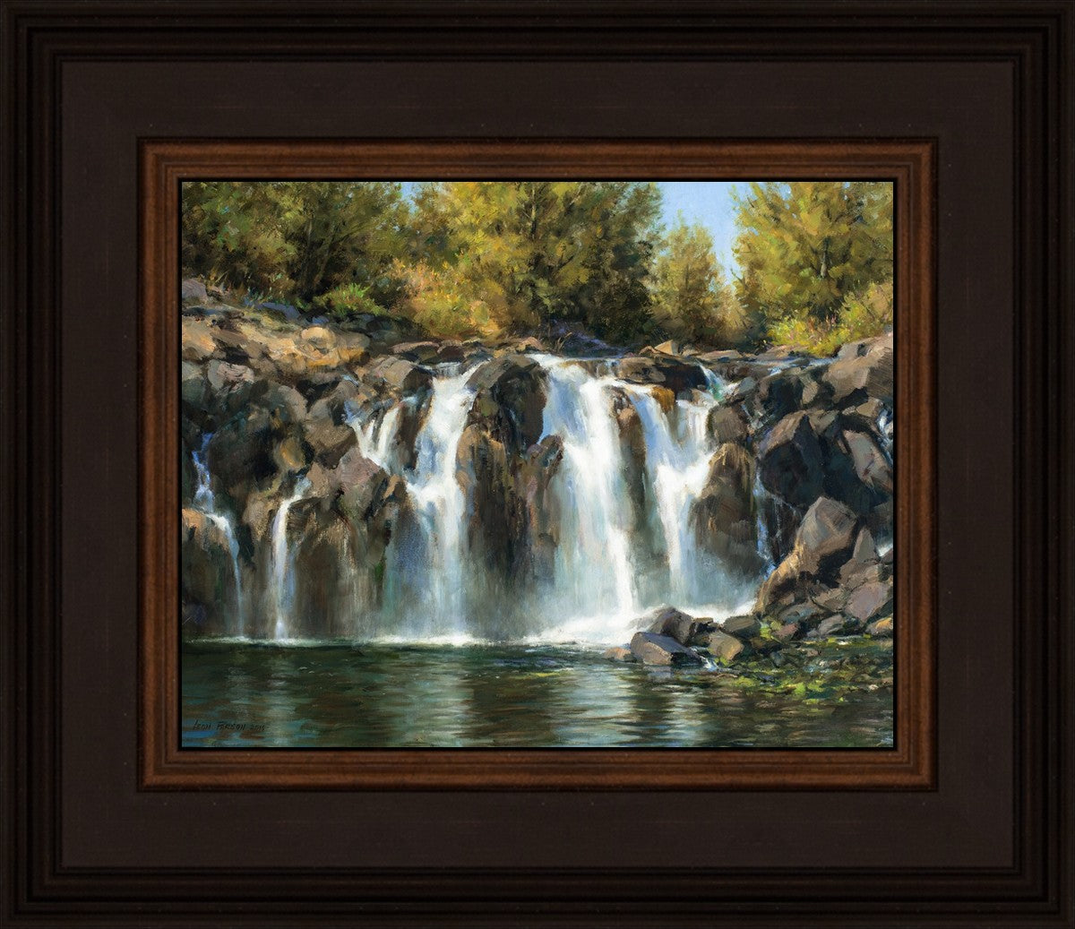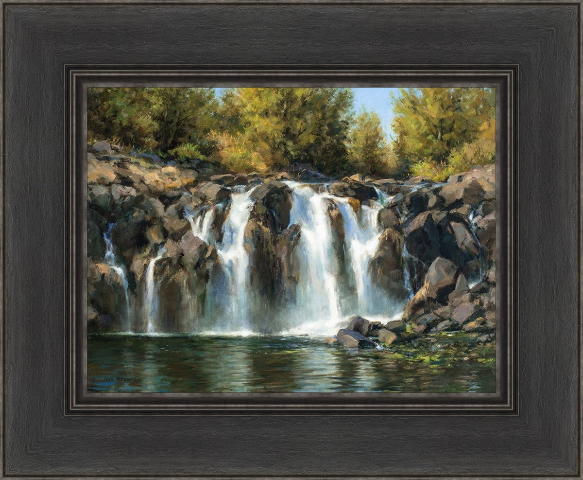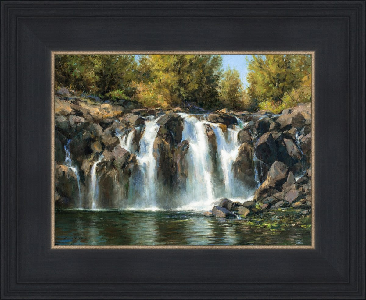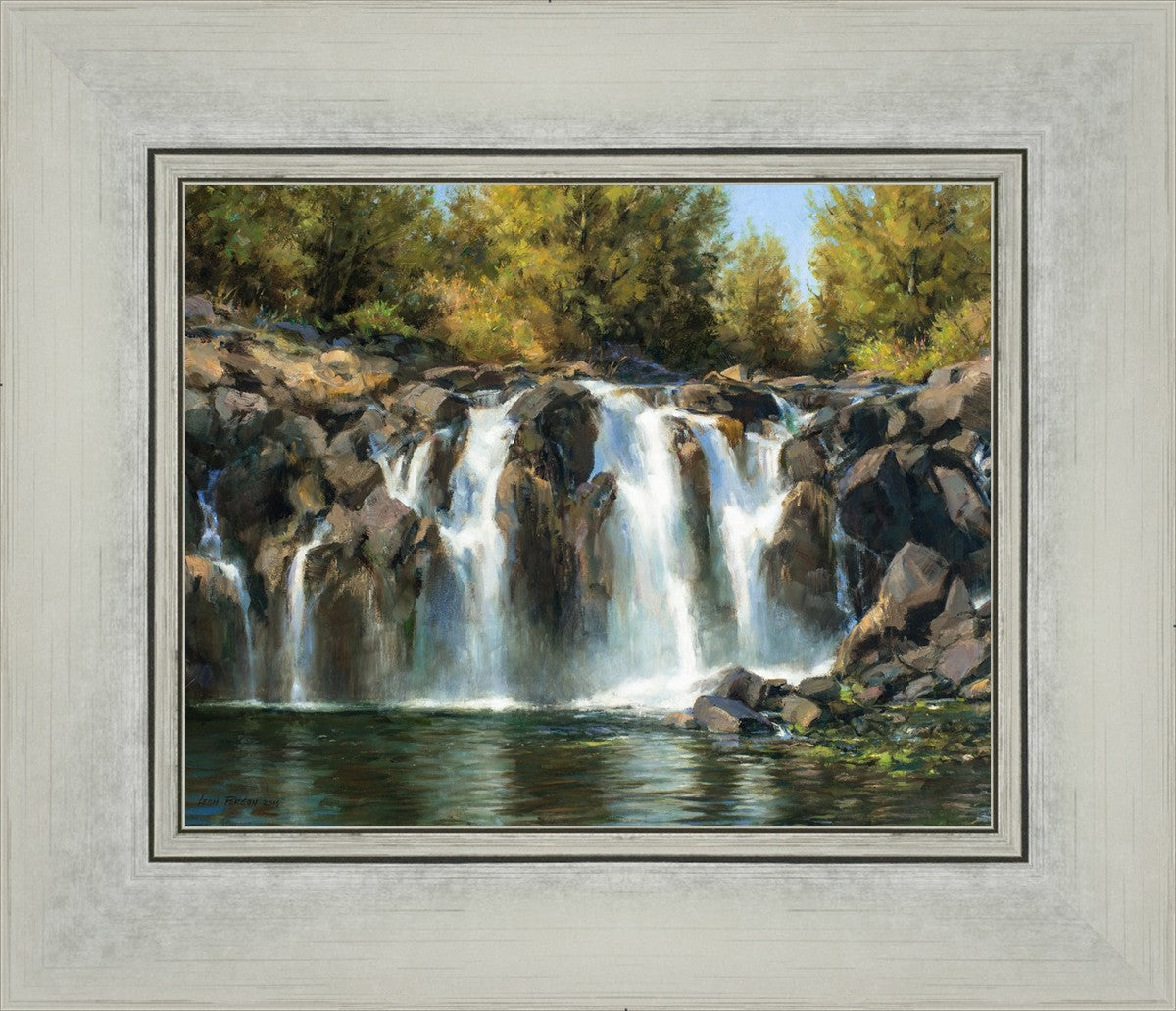 Waterfalls to me are both paradoxical and magical at the same time. I love the mesmerizing continuous, movement as if alive – yet it truth it is falling, pounding water. The waterfall is called Monkey Rock and is found just north of Teton Idaho and flows from there into the Teton River. This painting was started as a demo in my BYUI landscape class using a 9”x12” plein air painting as a basis then finished later at home in my studio.