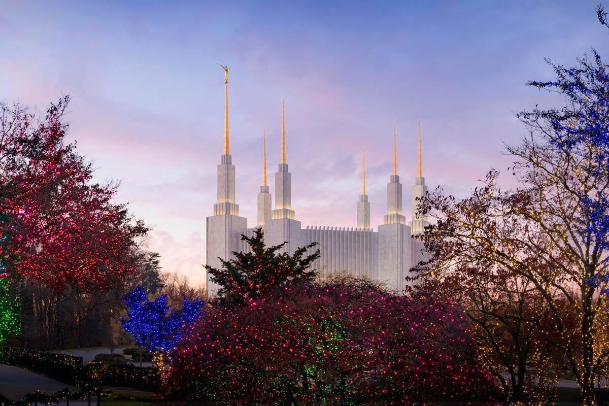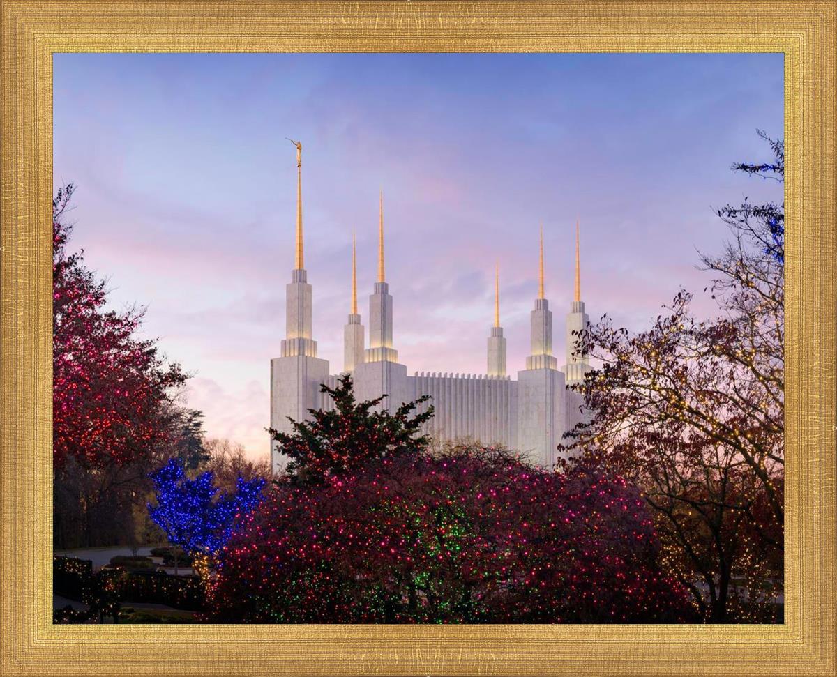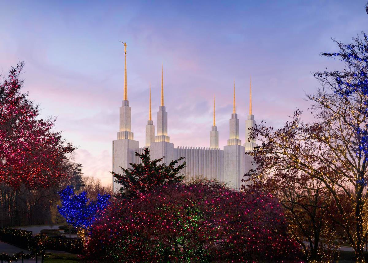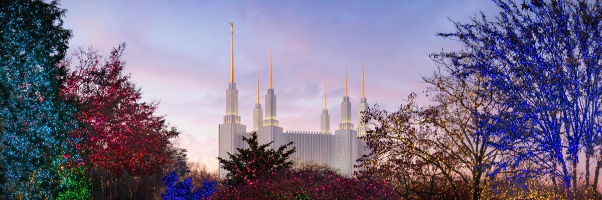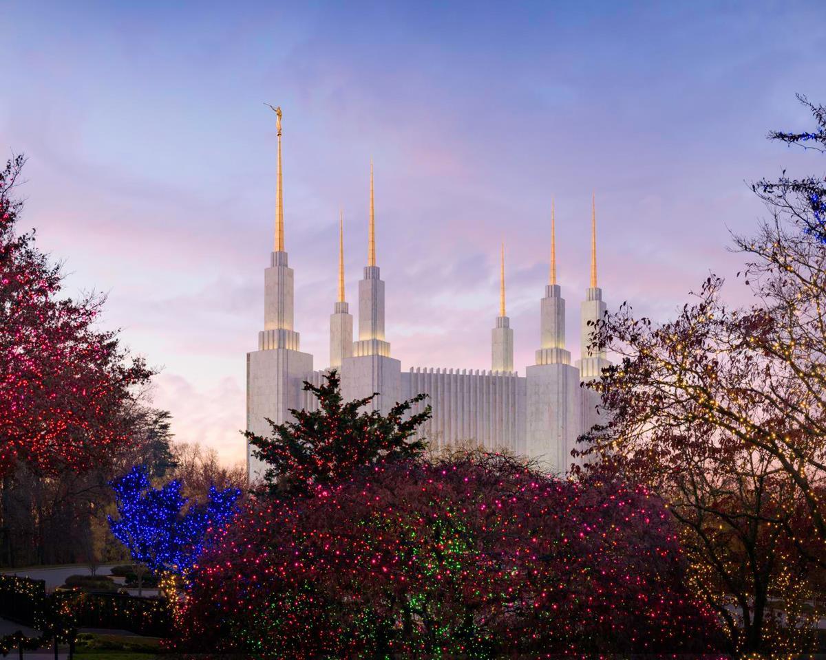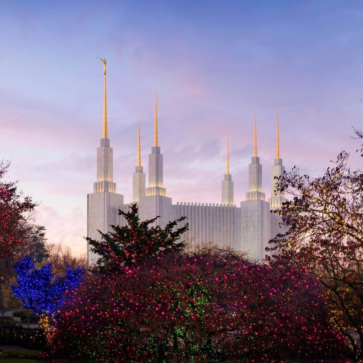 Morning sunrise with the Christmas lights at the Washington DC Temple.