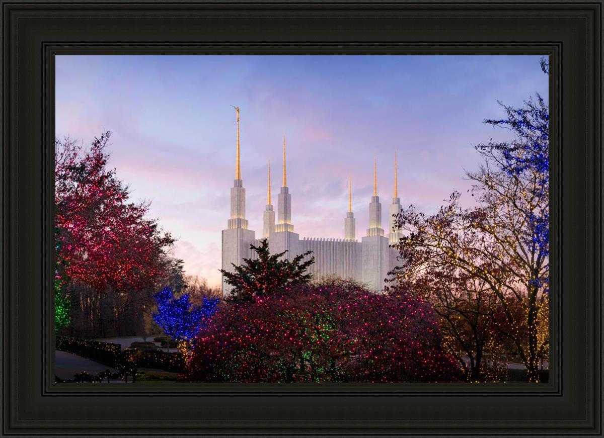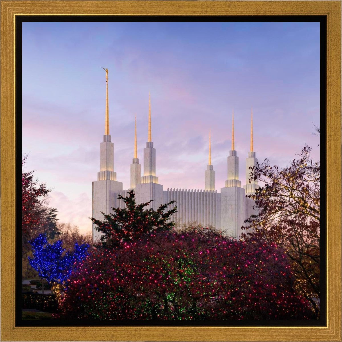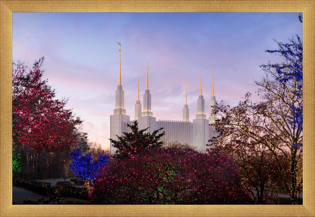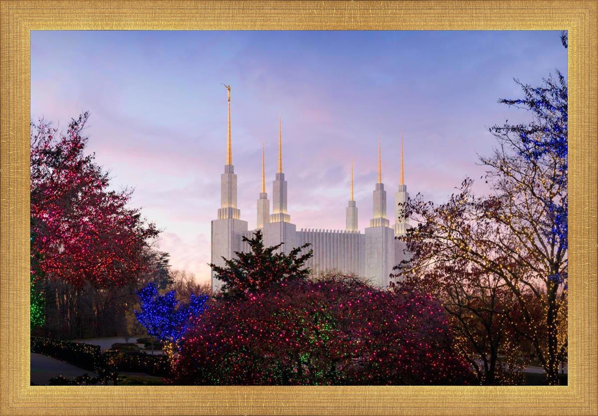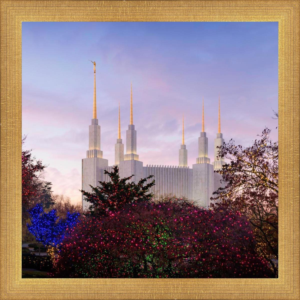 Morning sunrise with the Christmas lights at the Washington DC Temple.