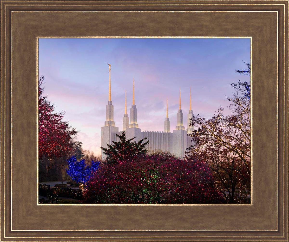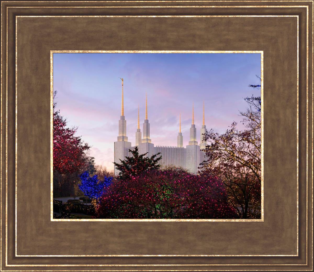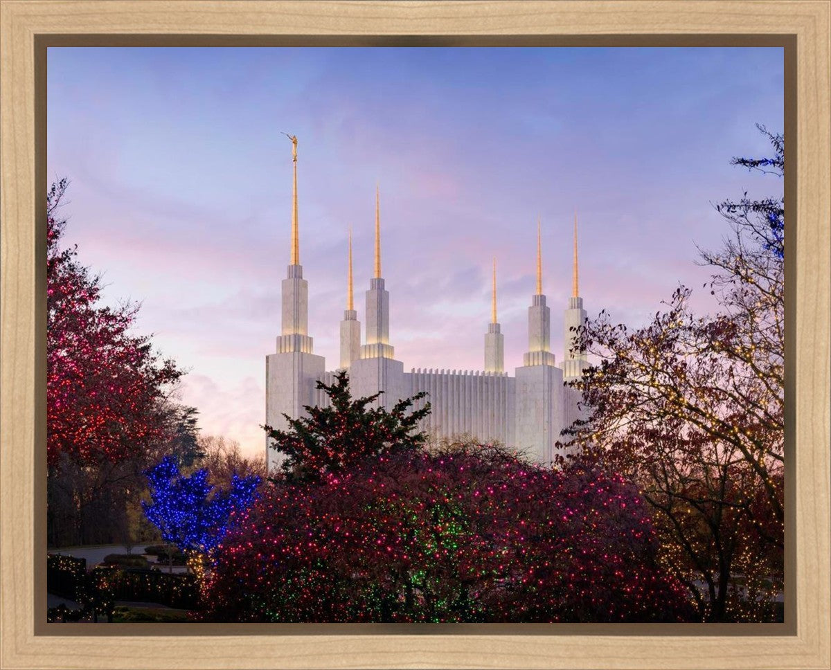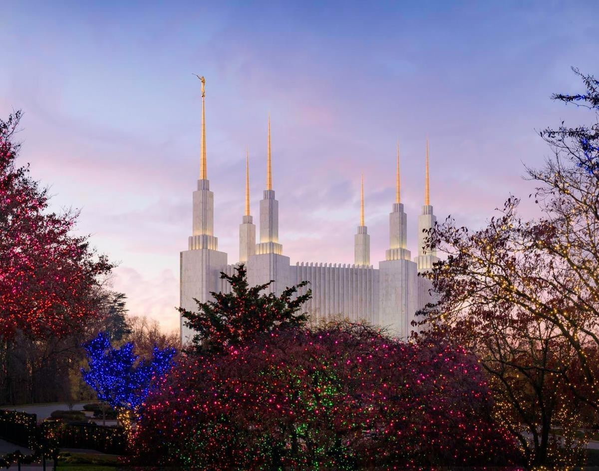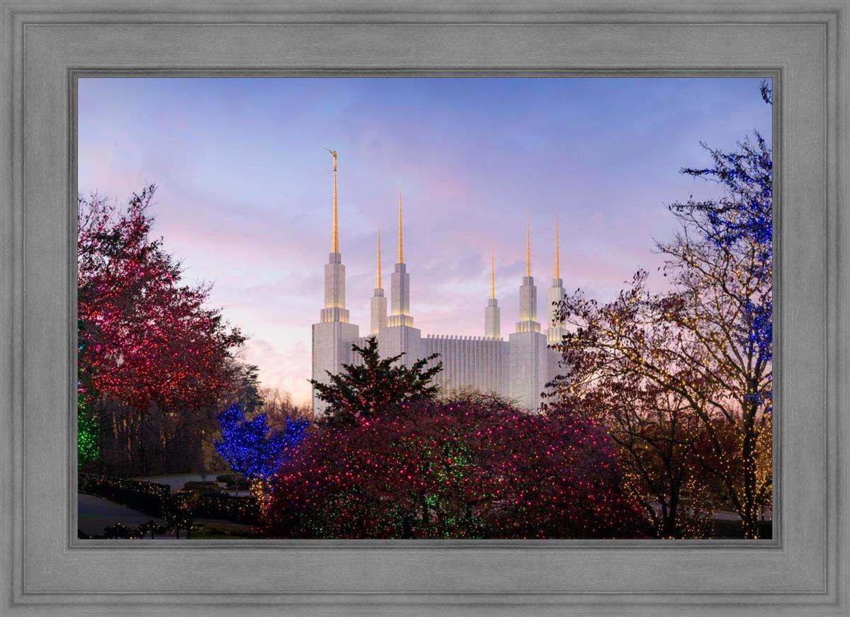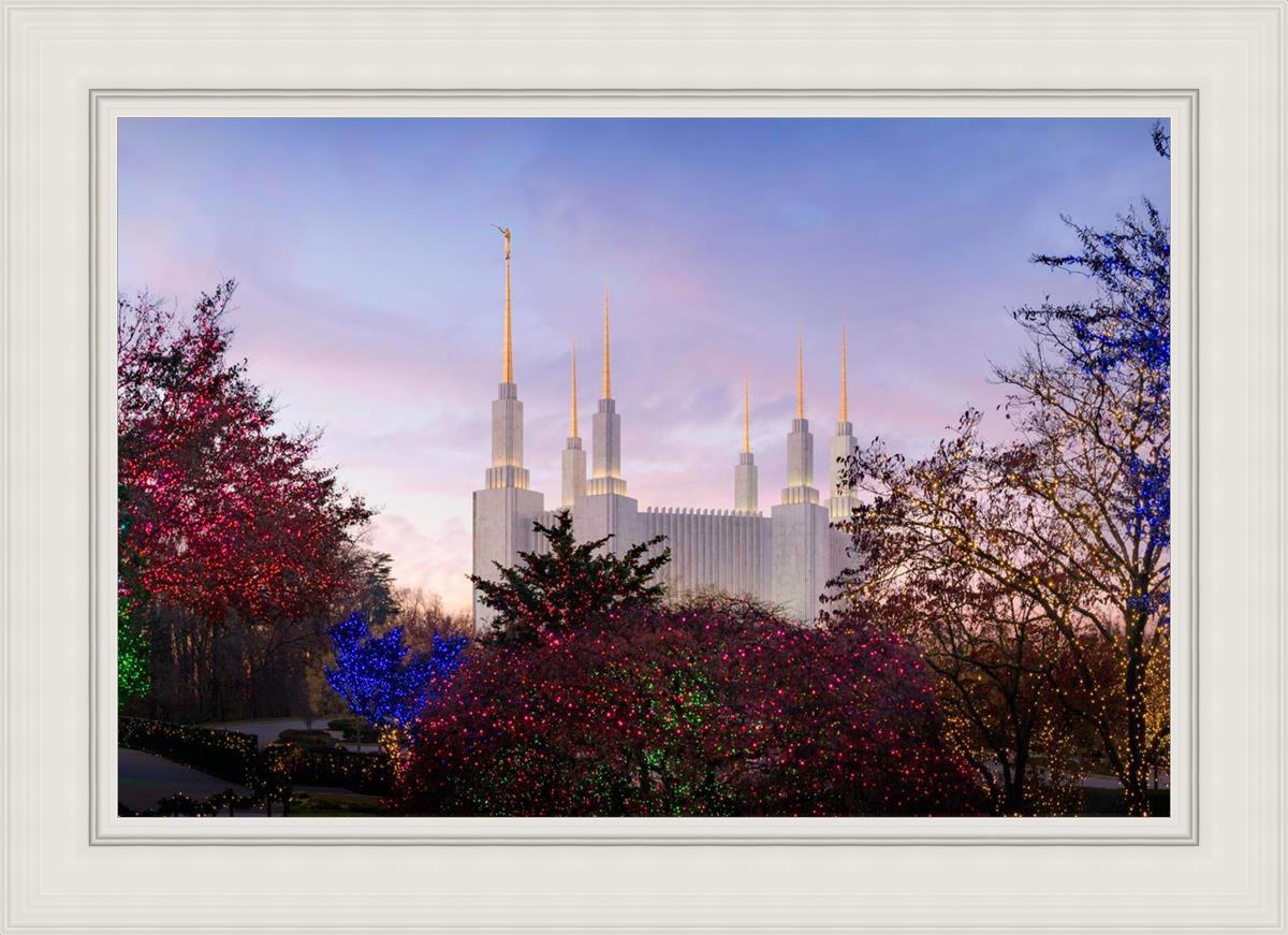 Morning sunrise with the Christmas lights at the Washington DC Temple.
