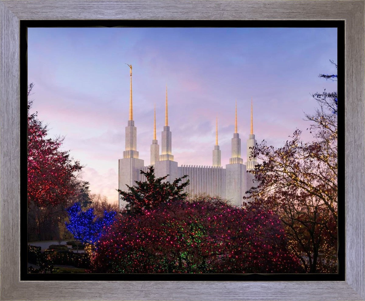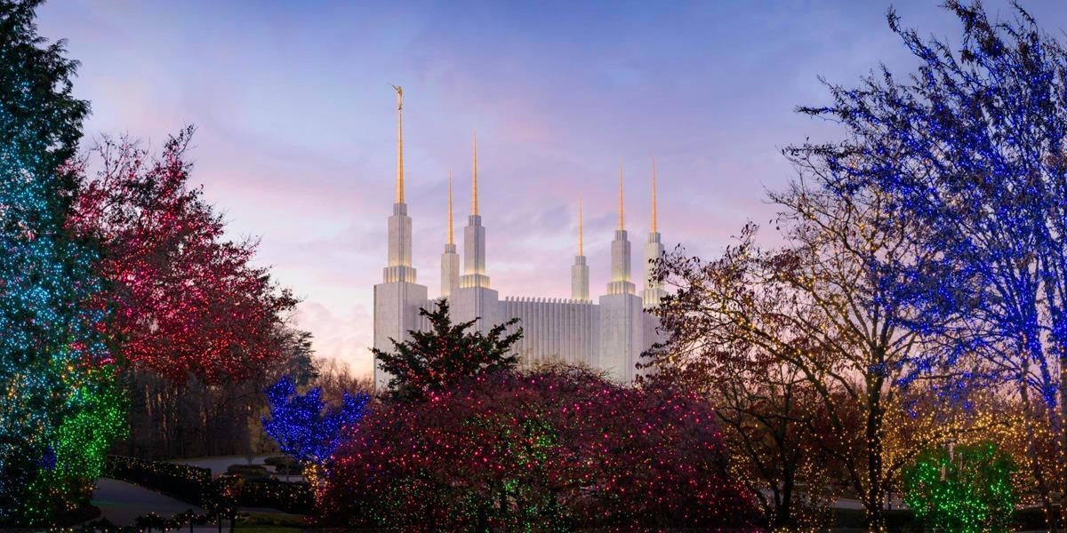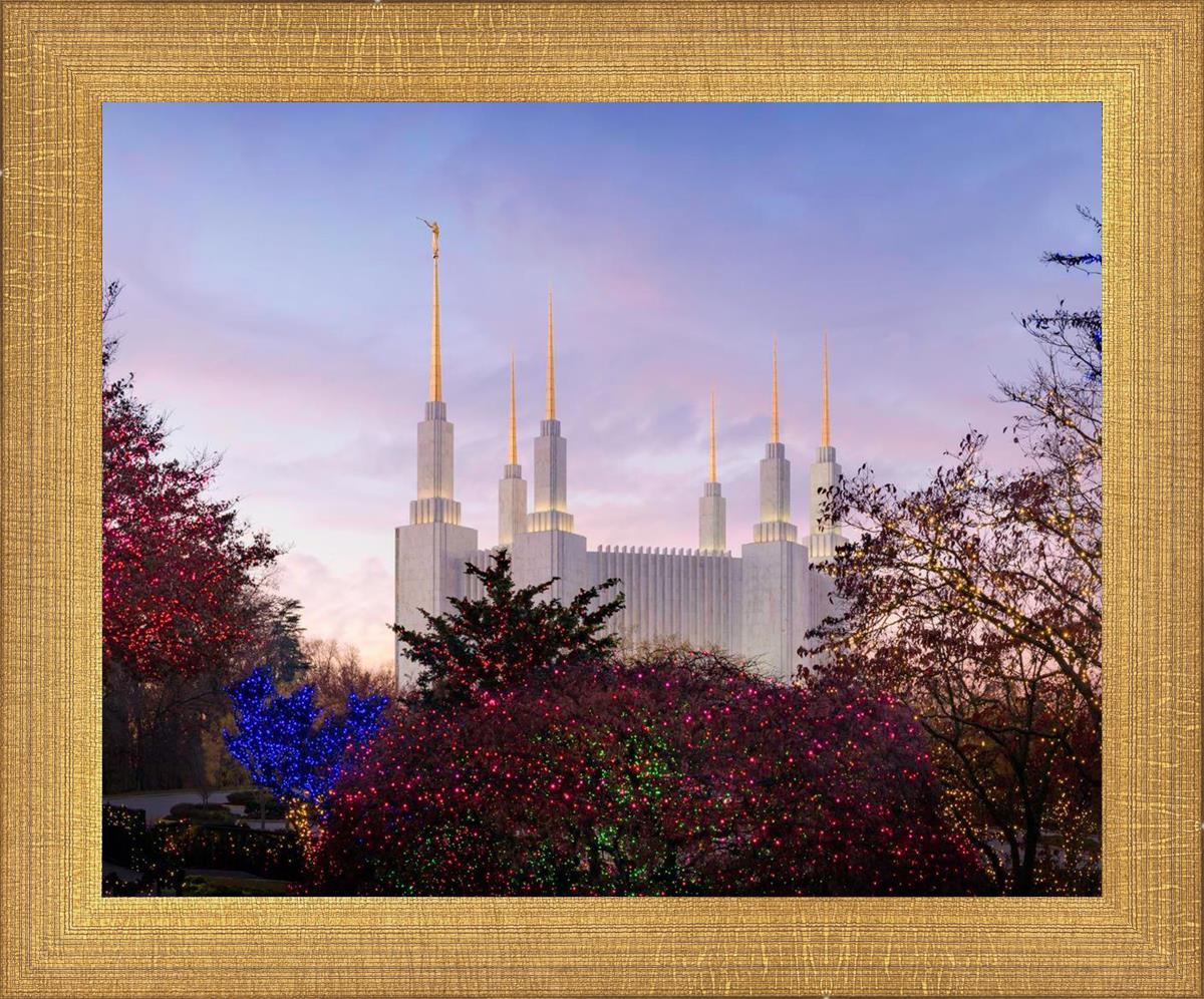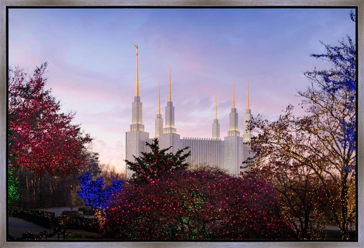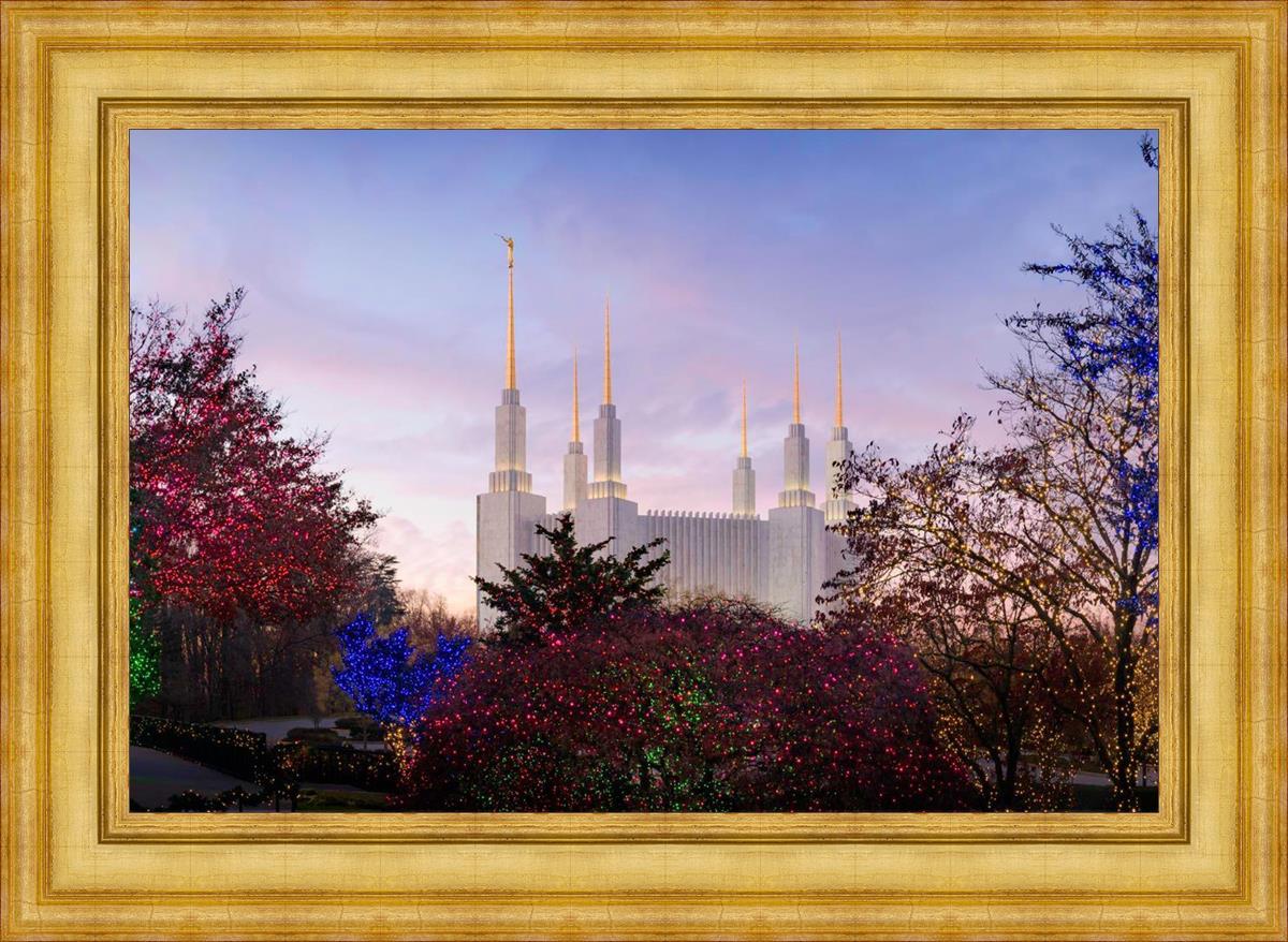 Morning sunrise with the Christmas lights at the Washington DC Temple.
