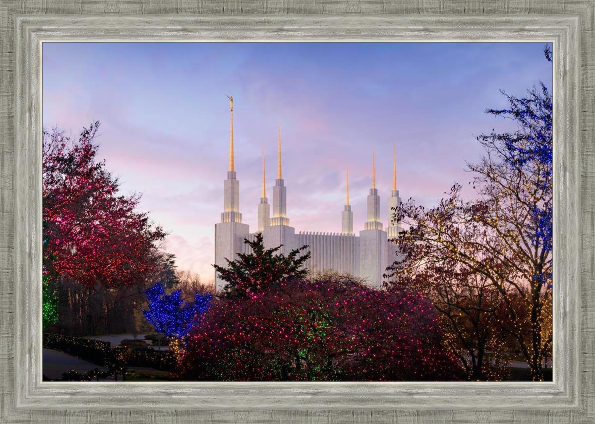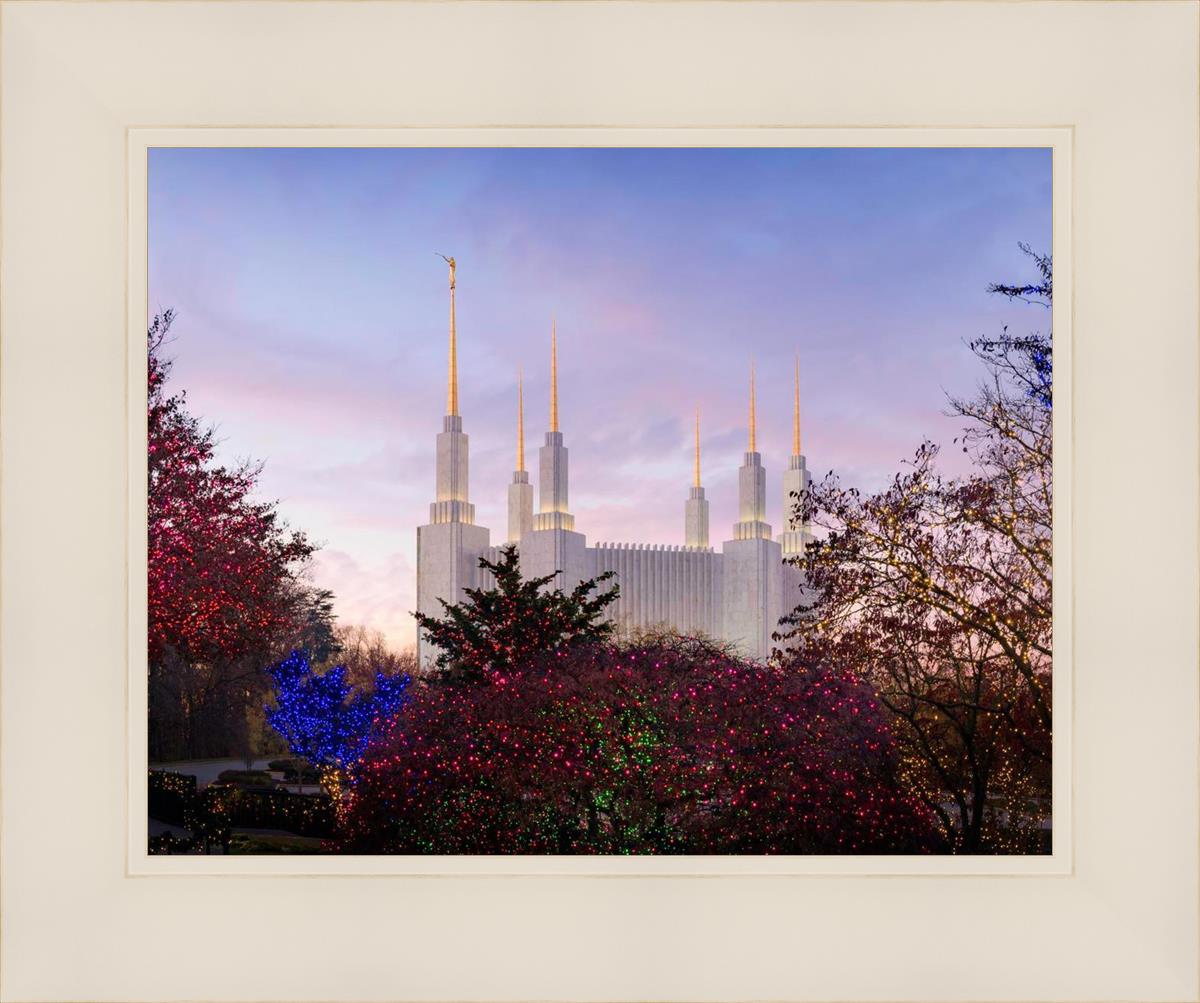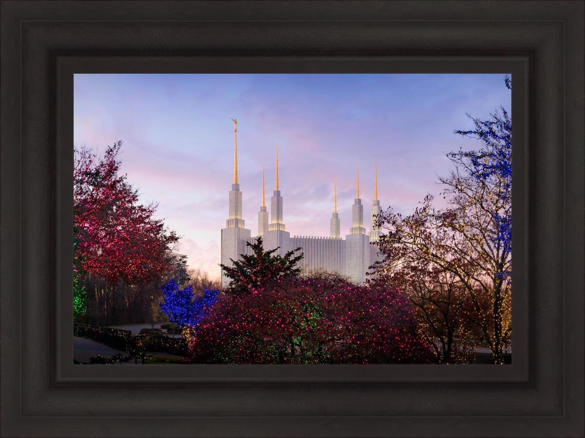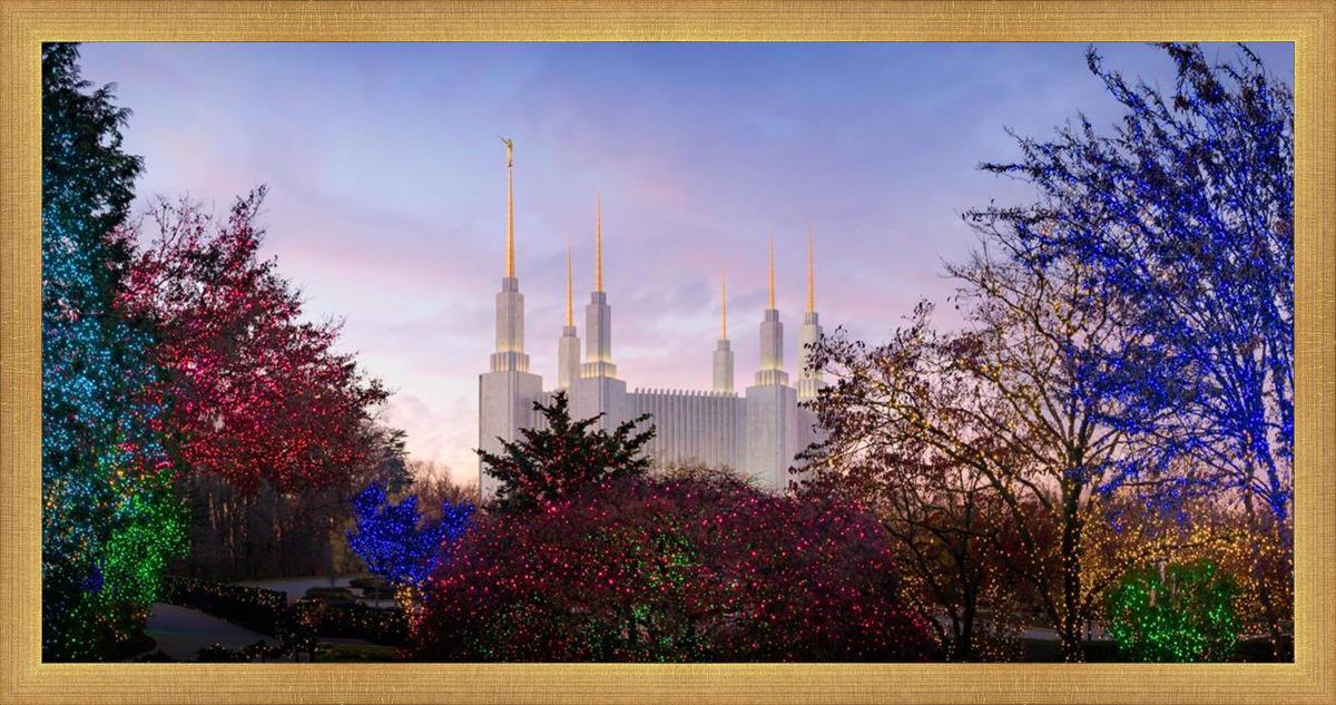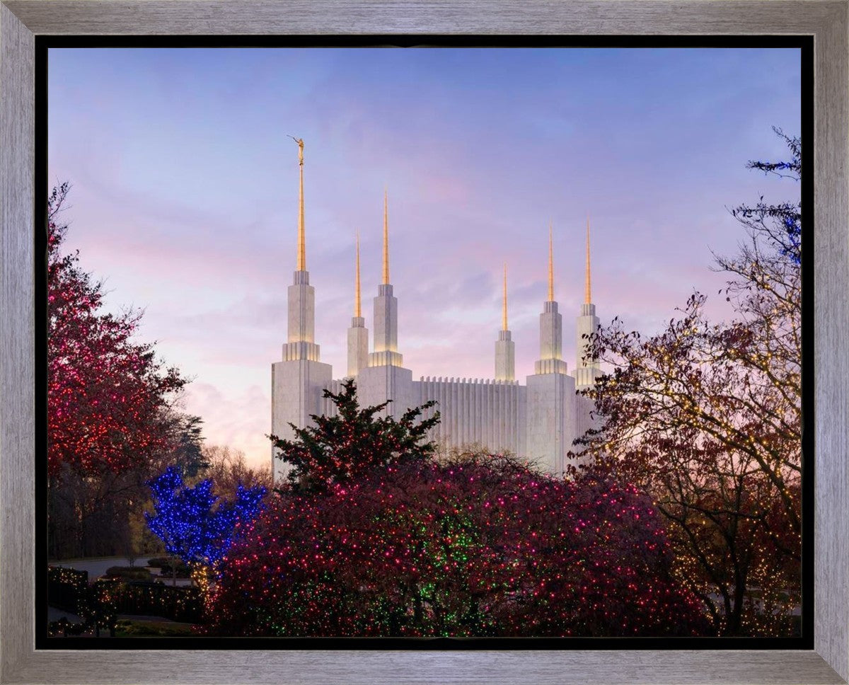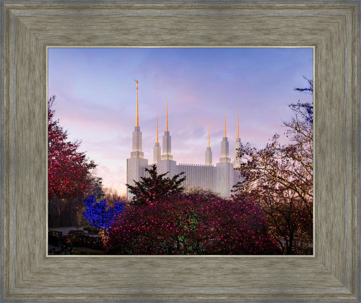 Morning sunrise with the Christmas lights at the Washington DC Temple.
