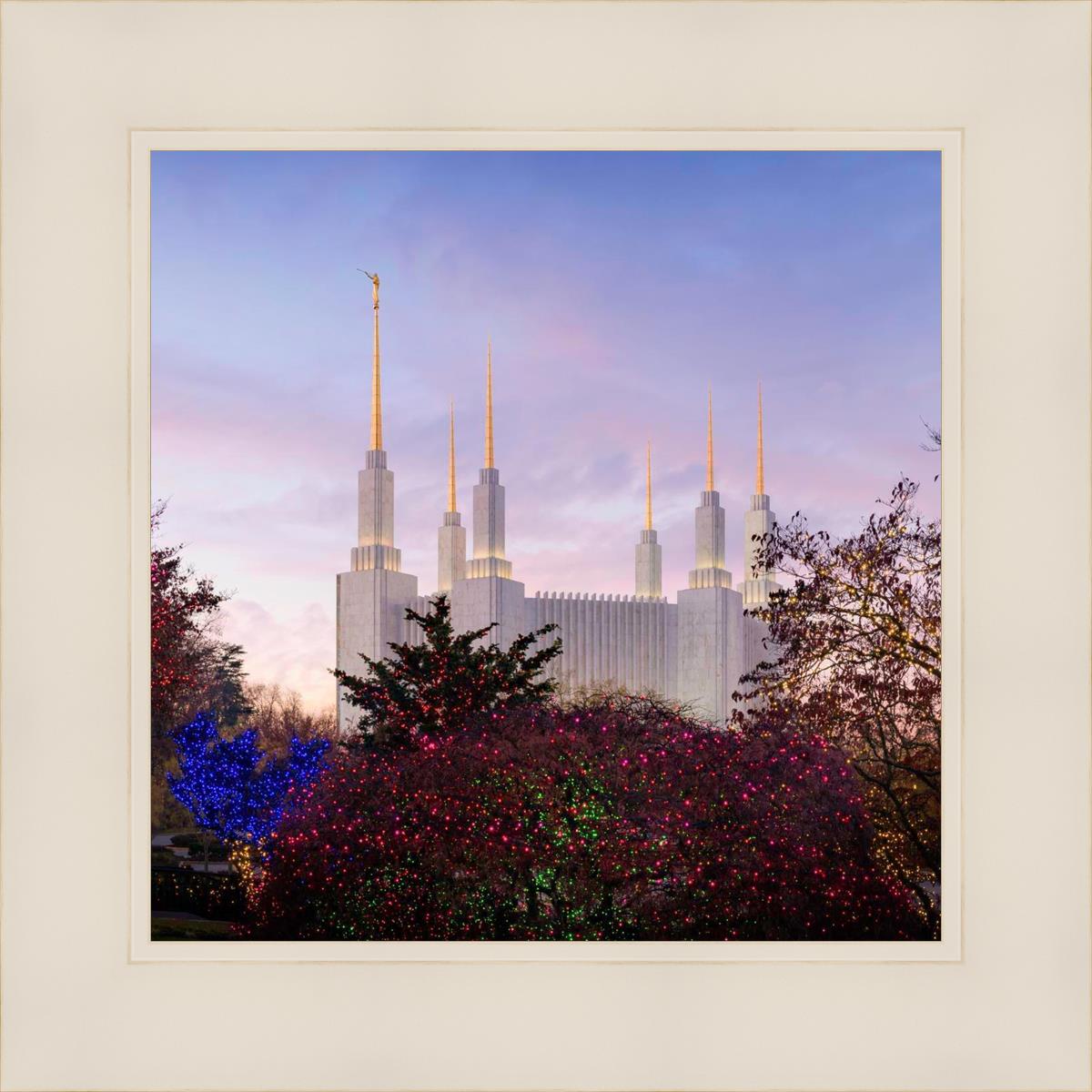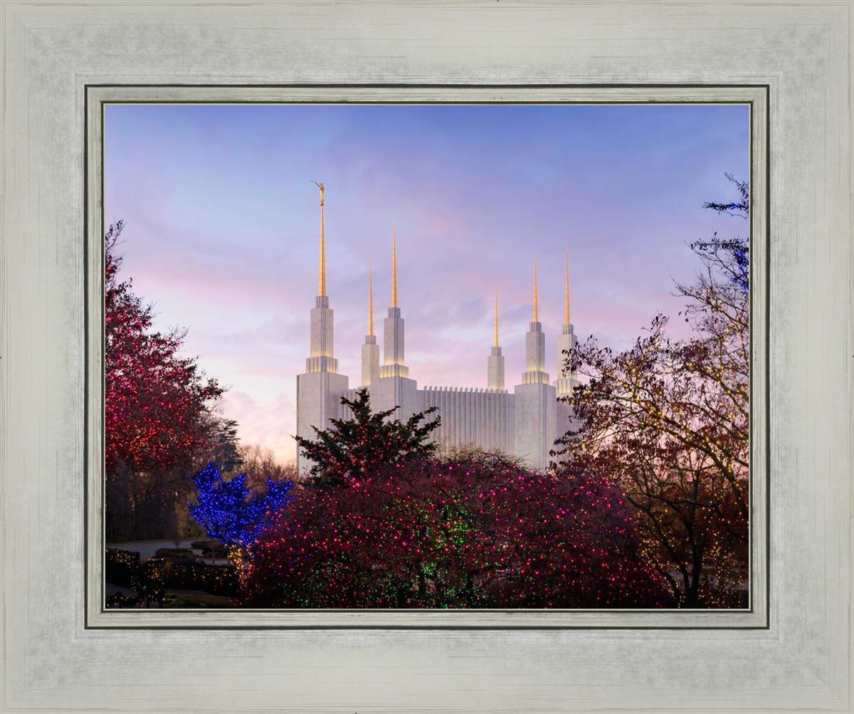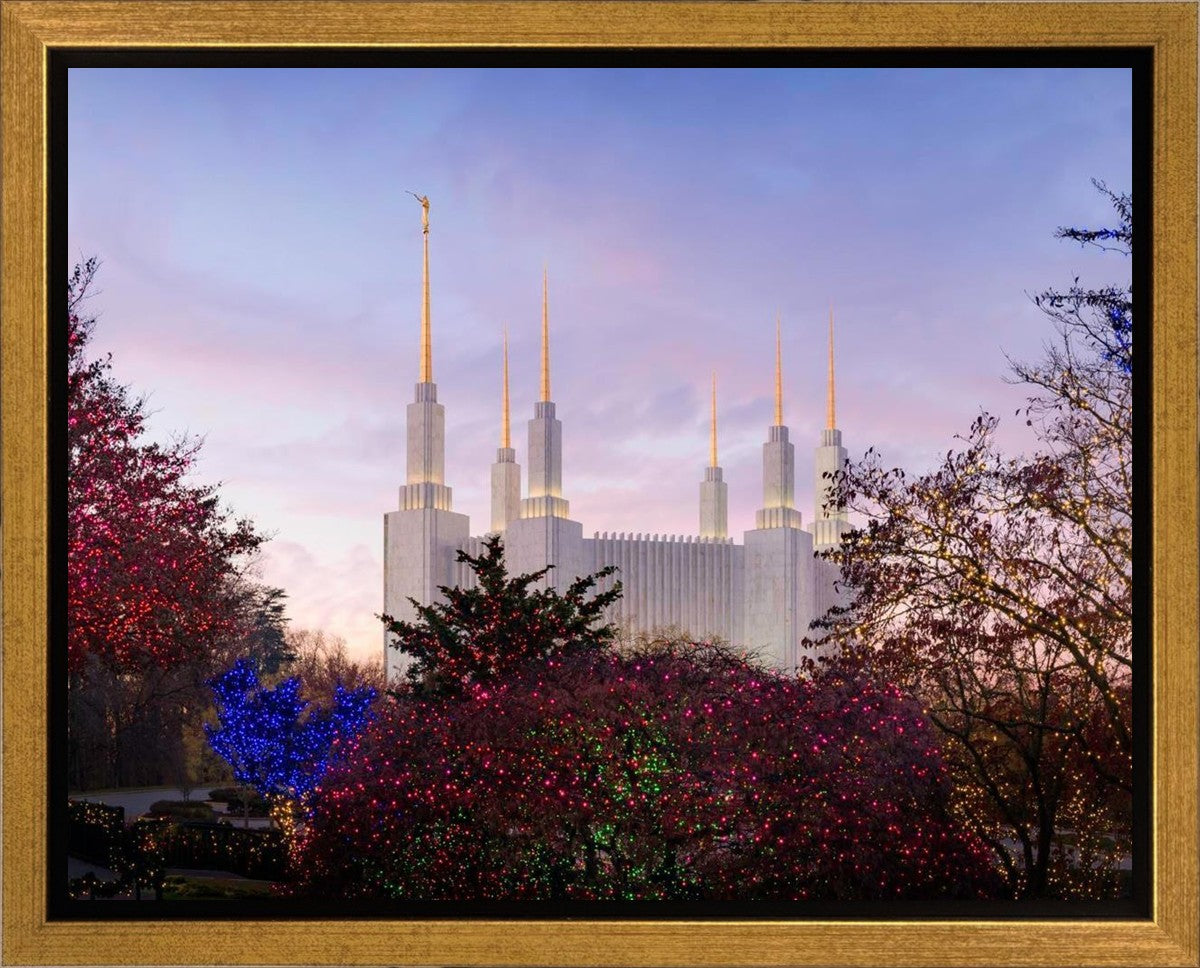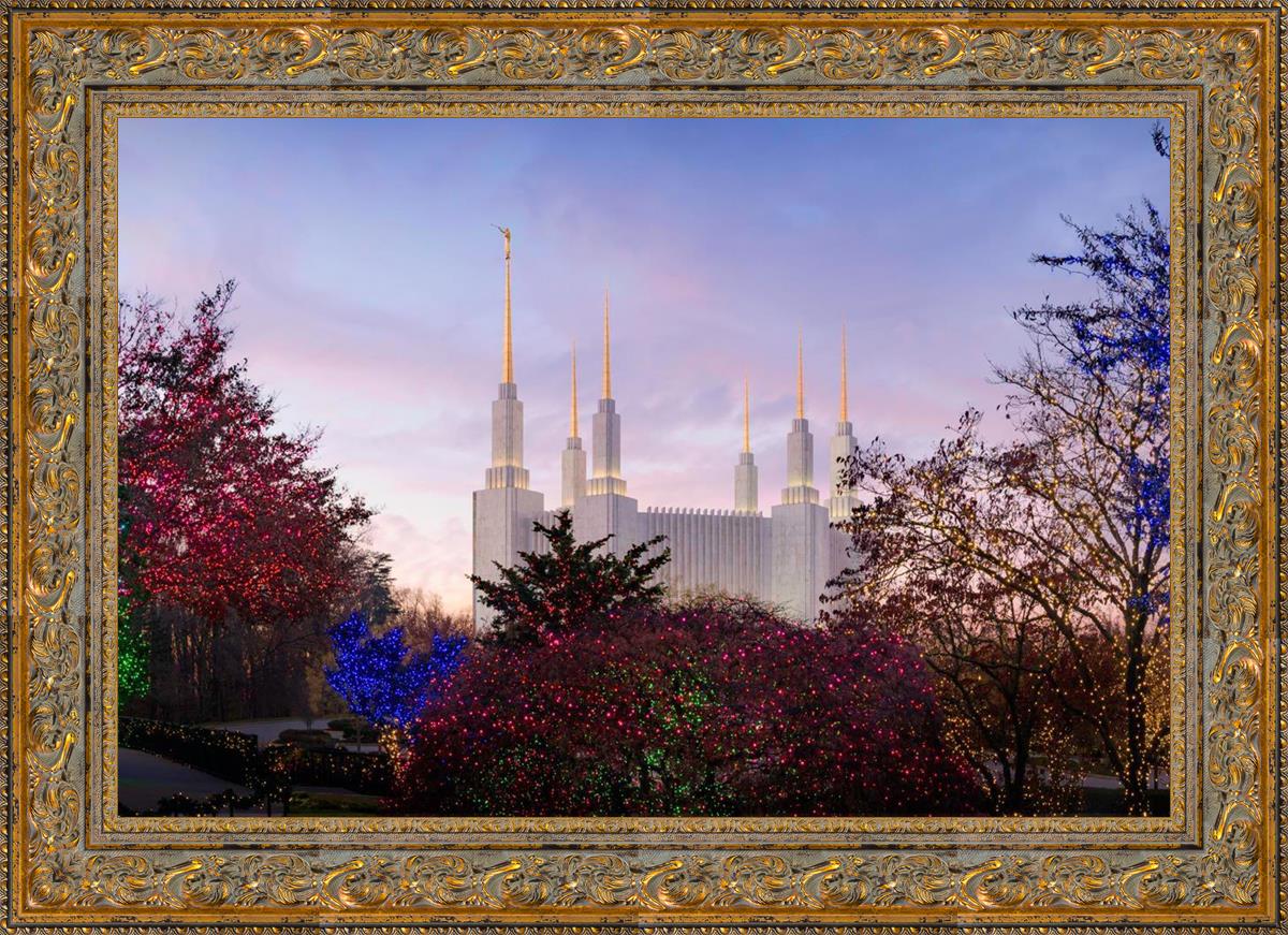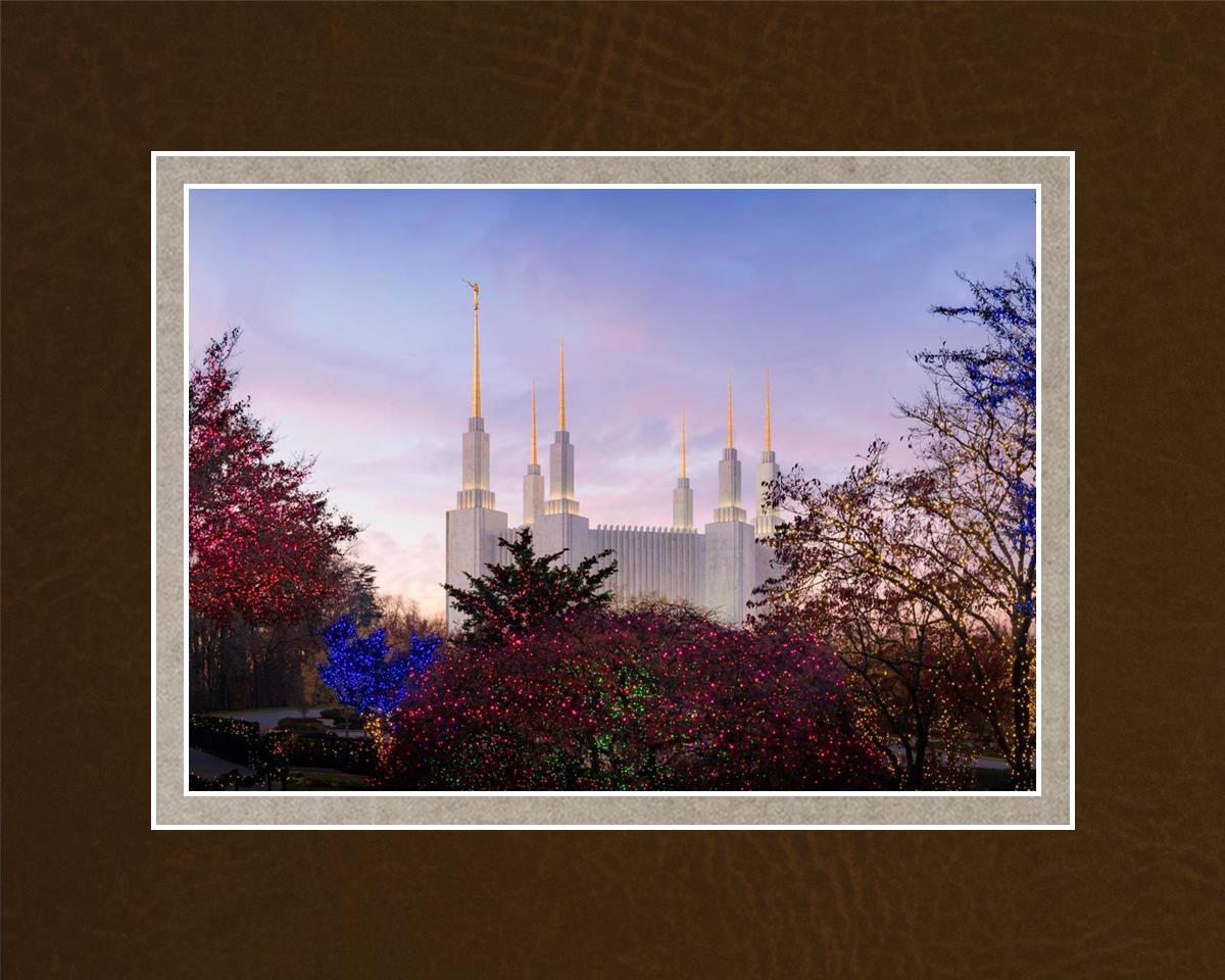 Morning sunrise with the Christmas lights at the Washington DC Temple.