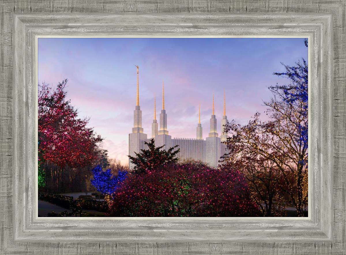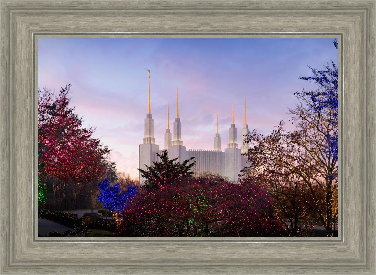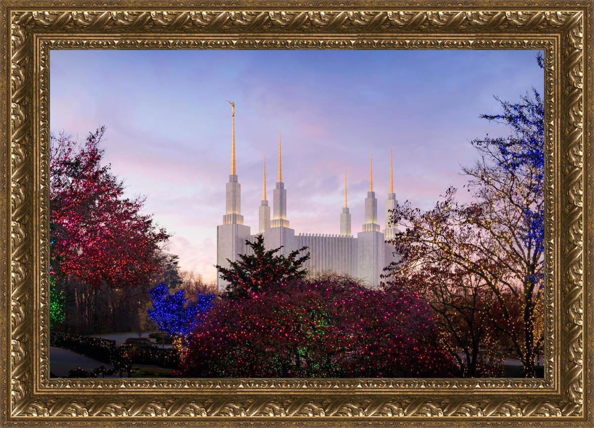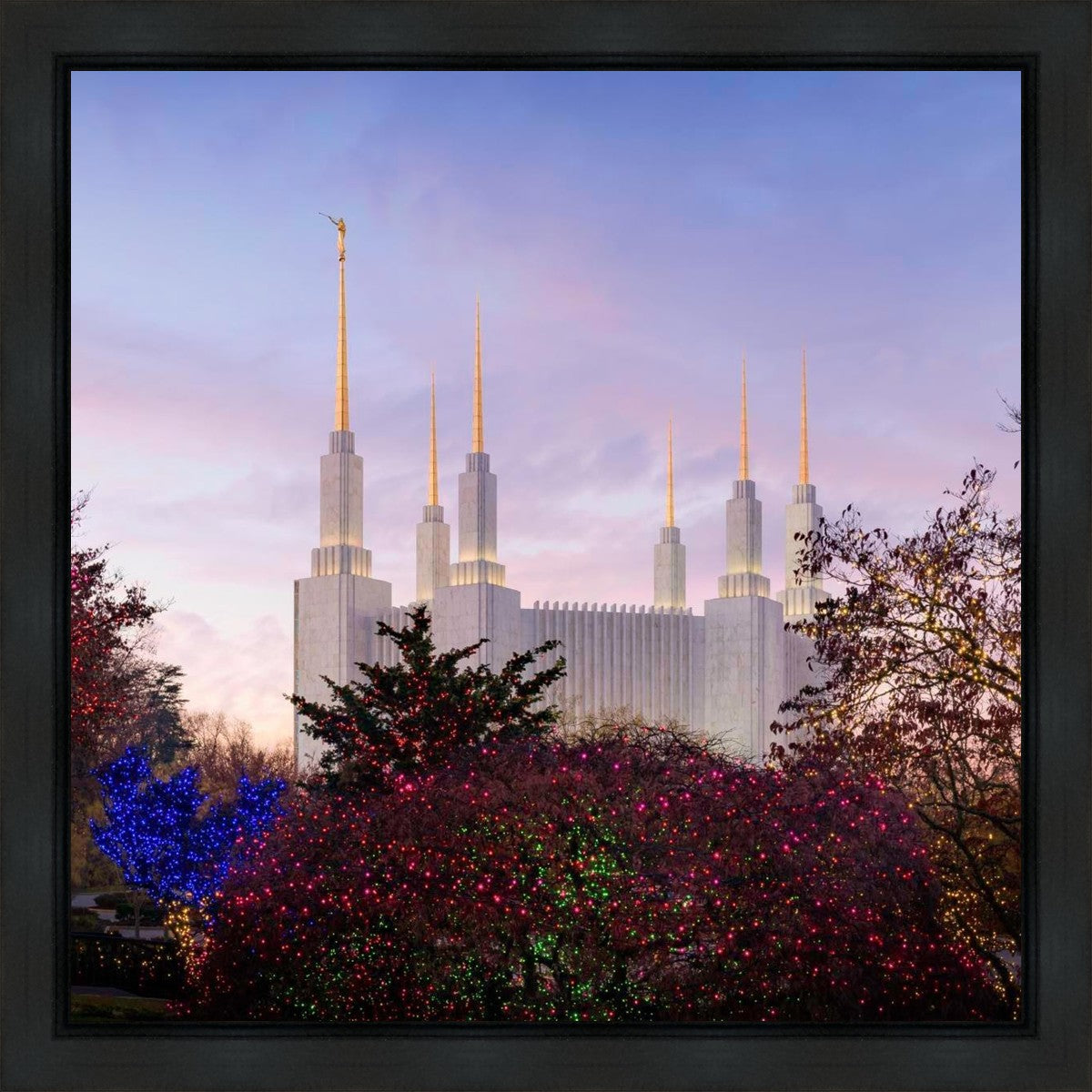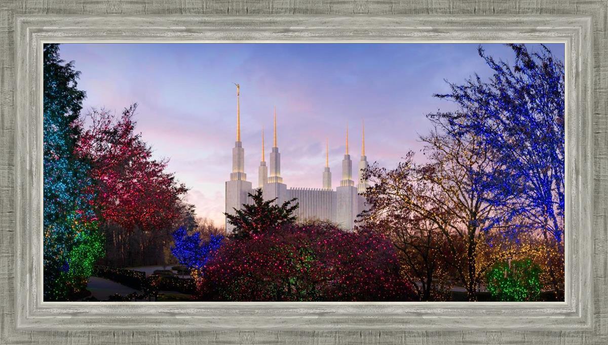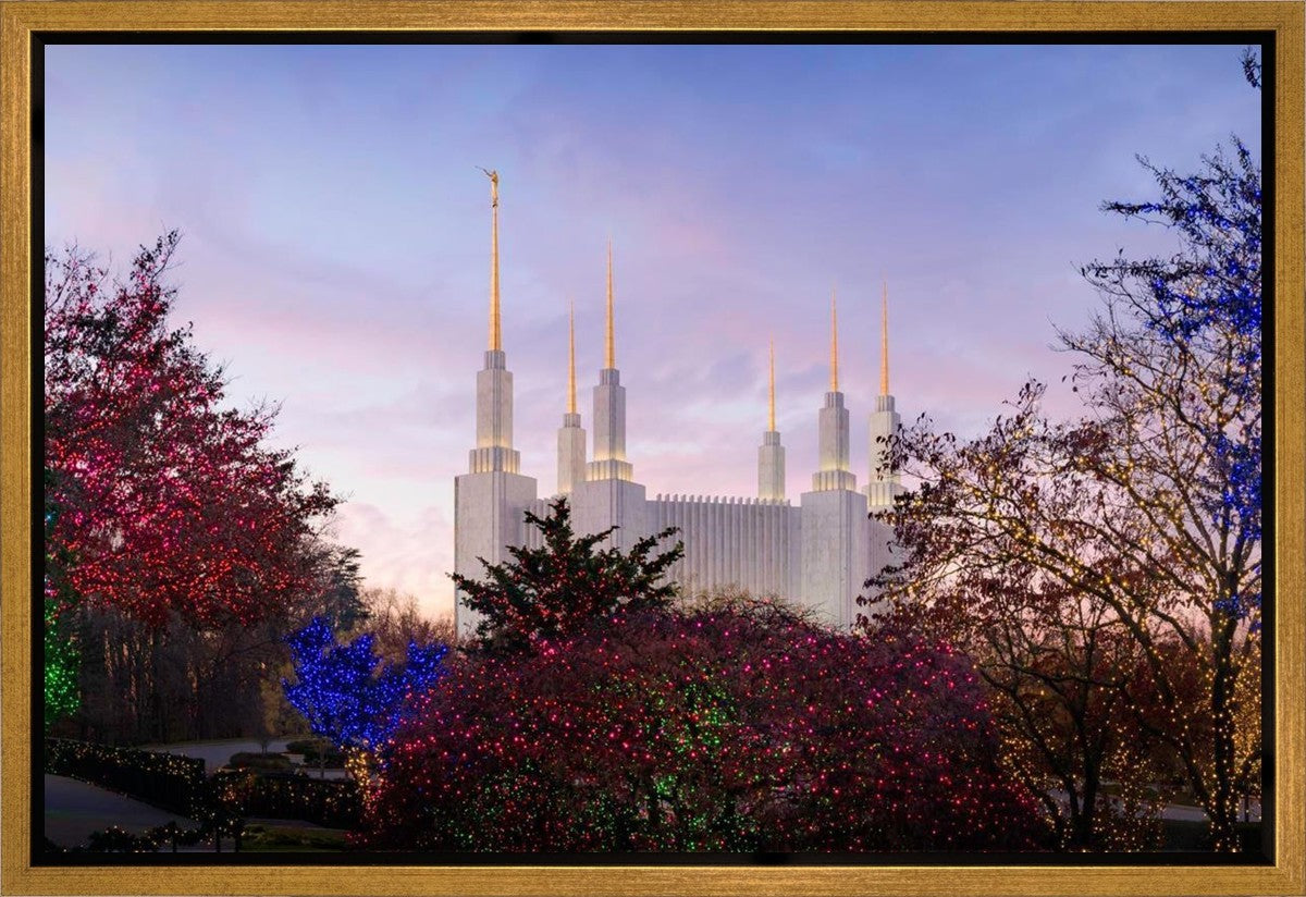 Morning sunrise with the Christmas lights at the Washington DC Temple.