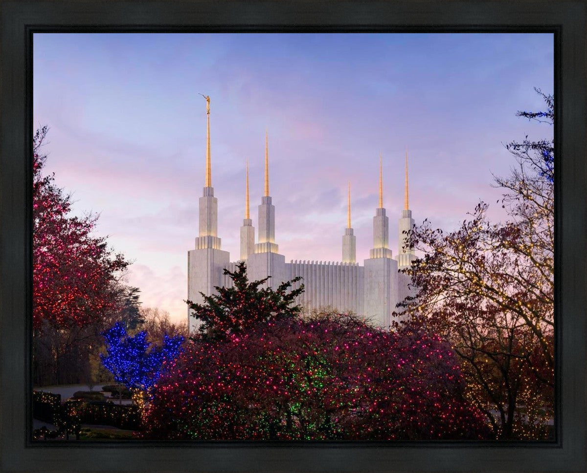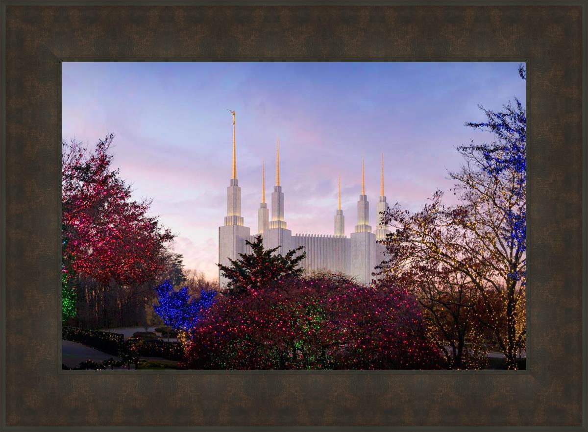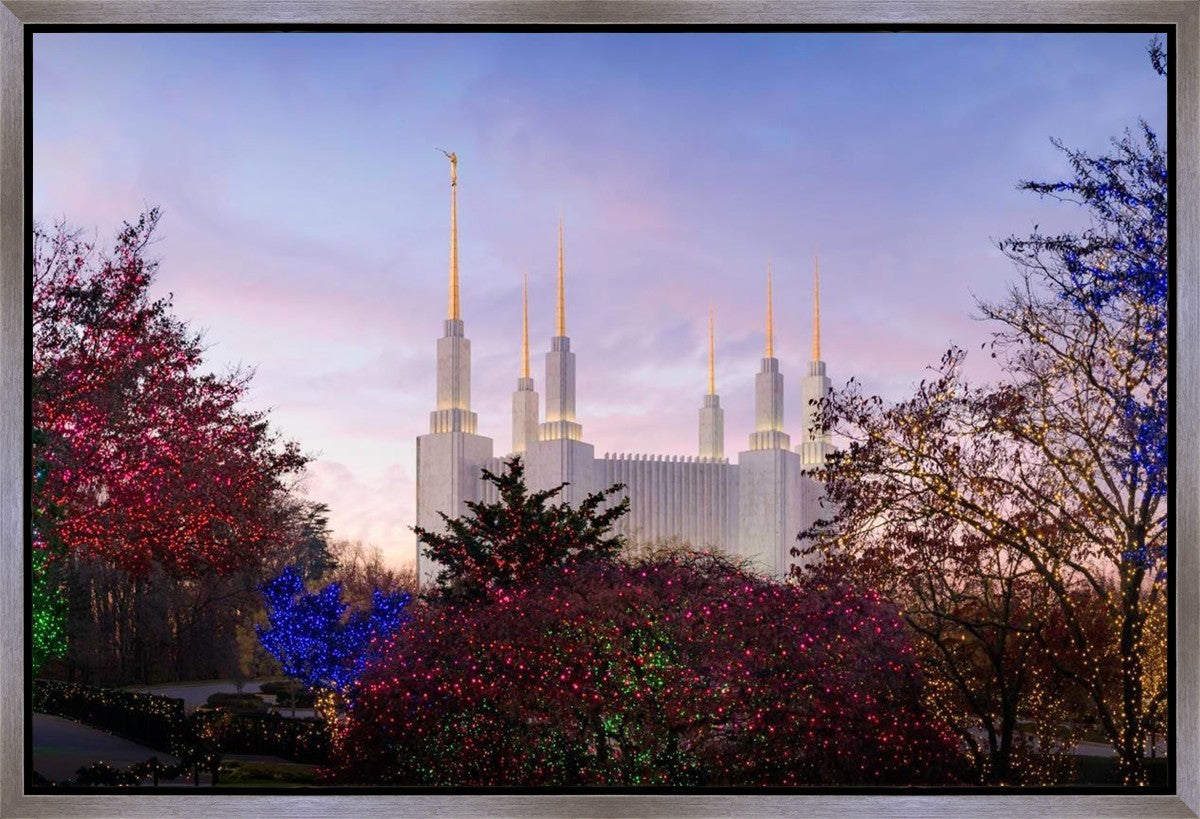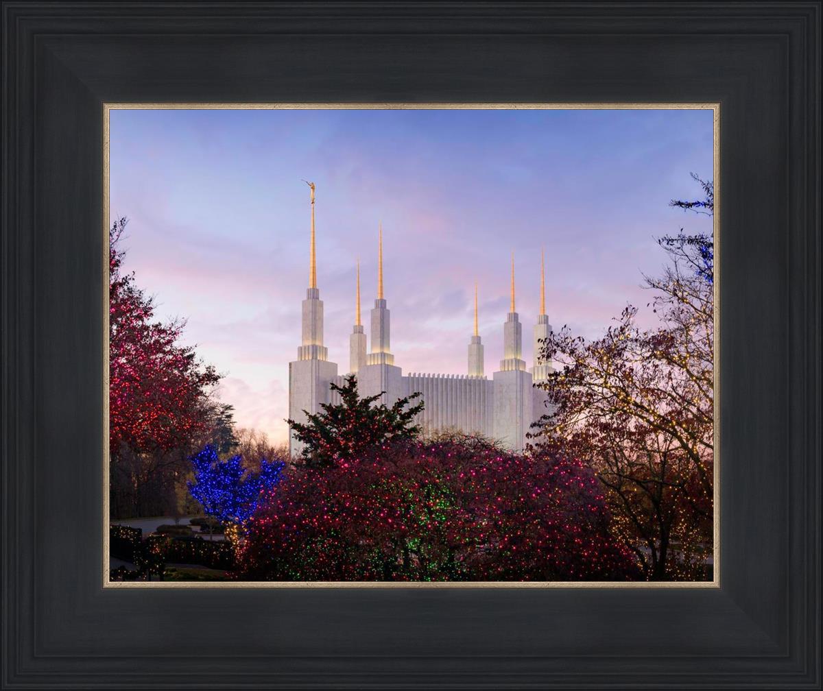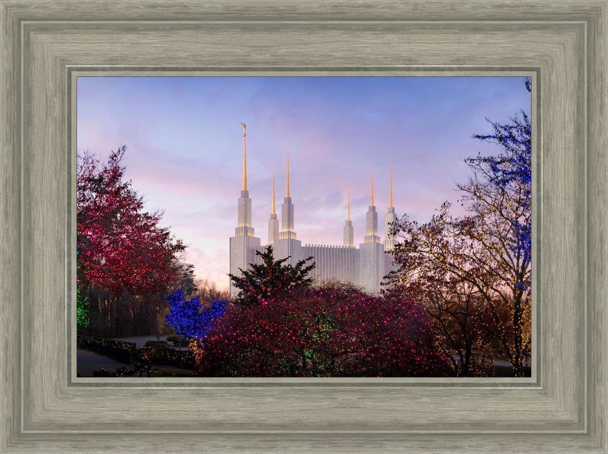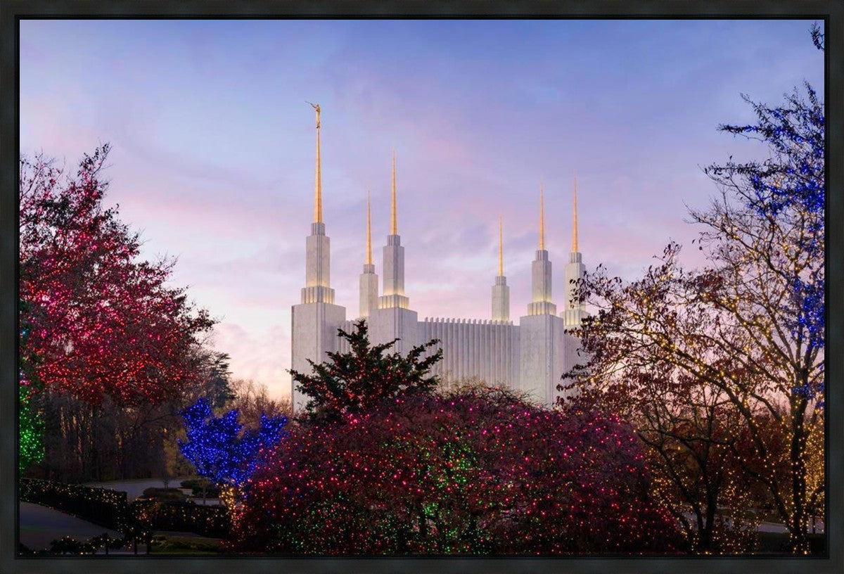 Morning sunrise with the Christmas lights at the Washington DC Temple.