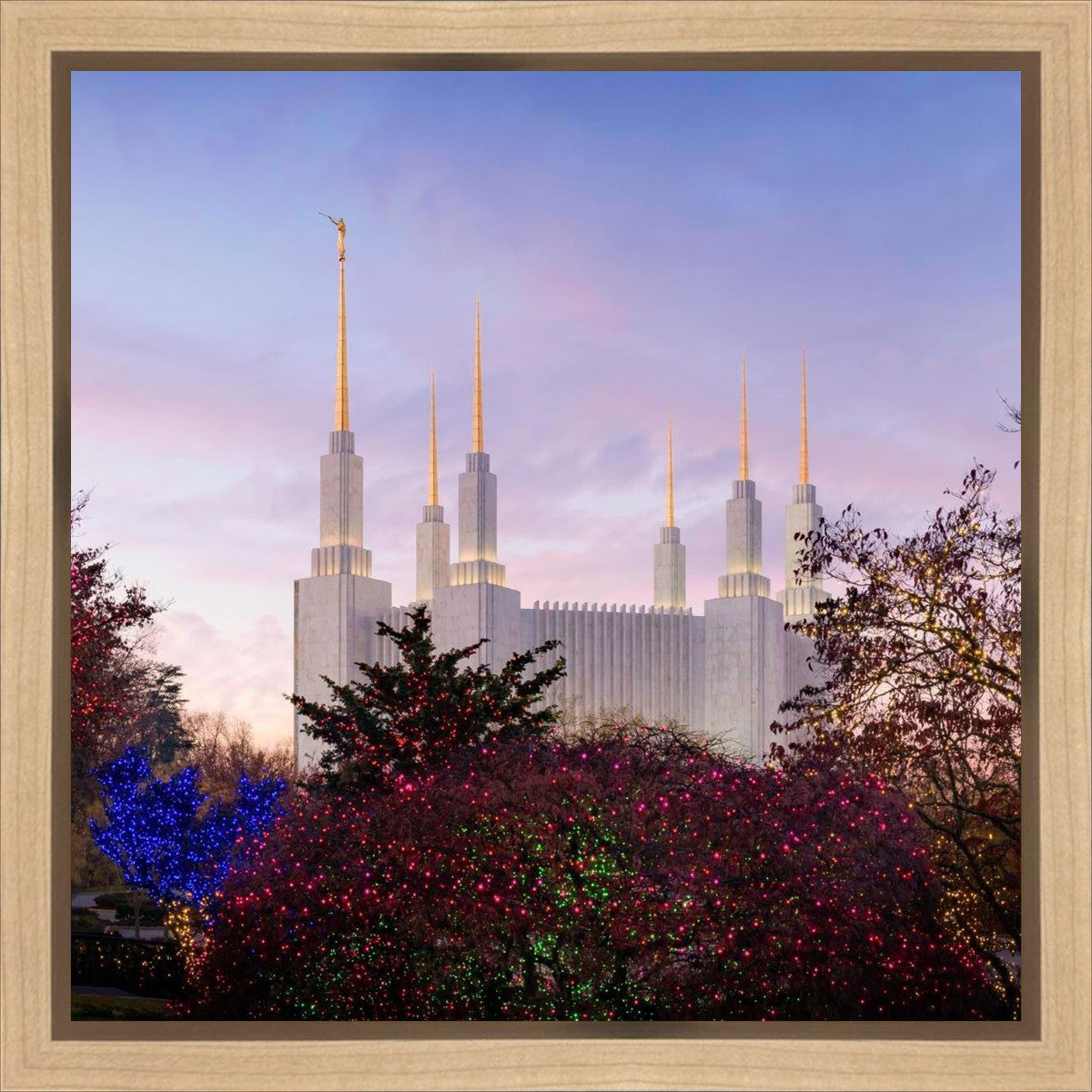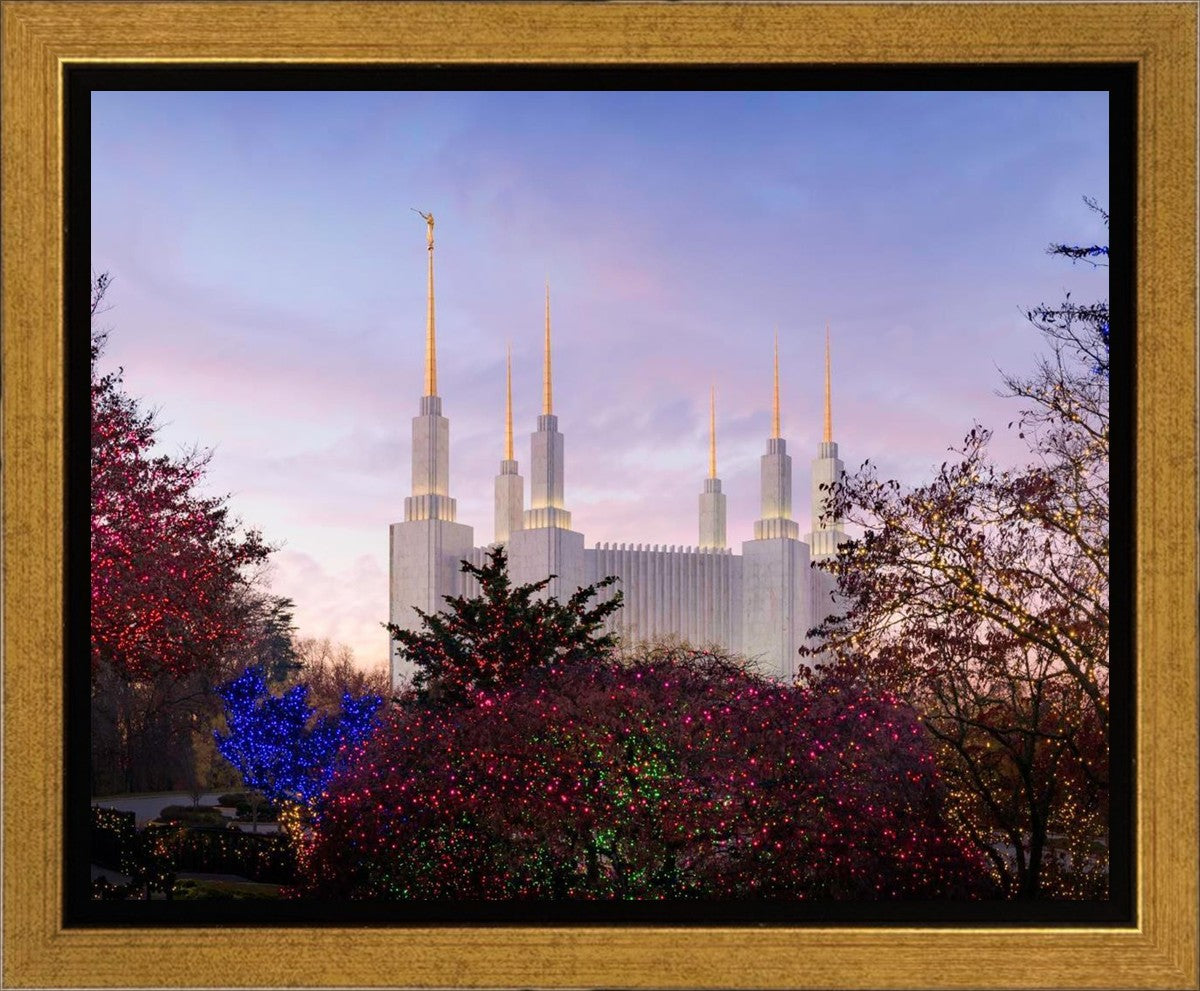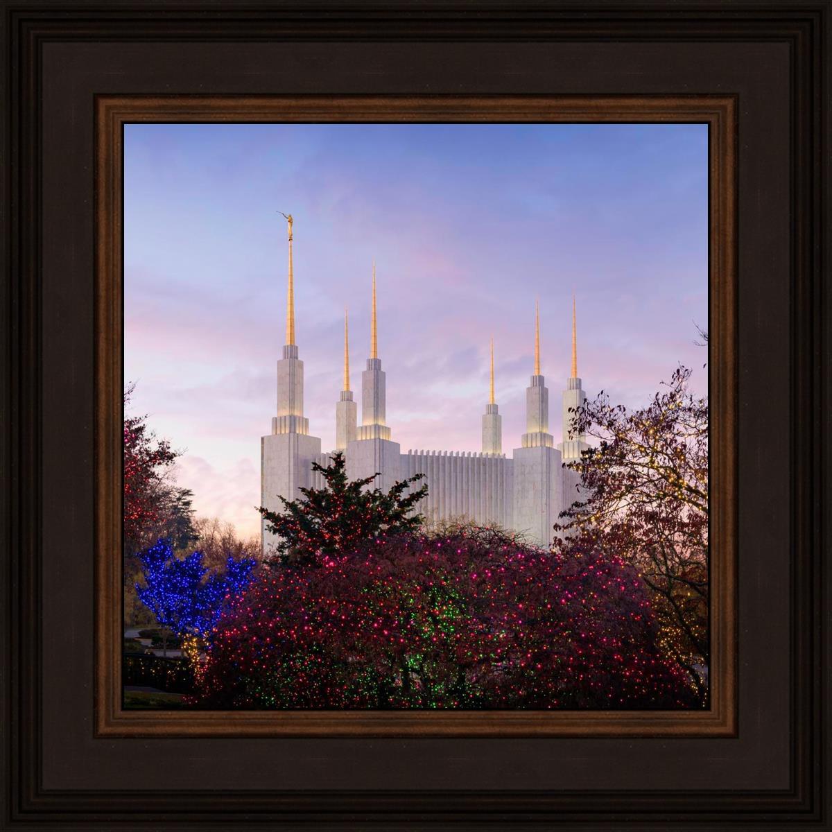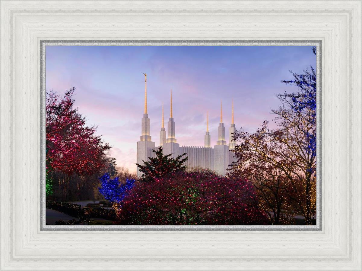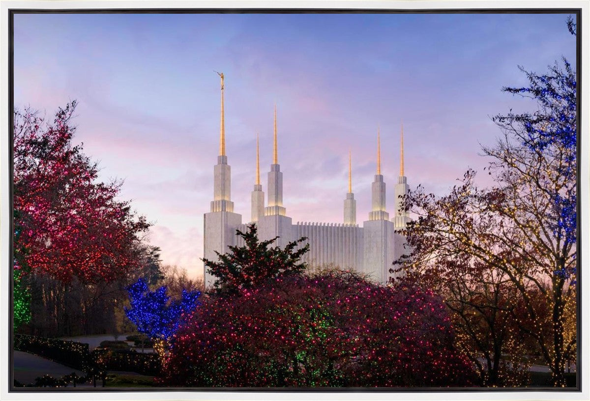Morning sunrise with the Christmas lights at the Washington DC Temple.