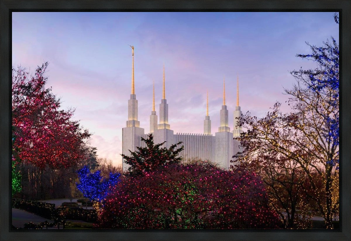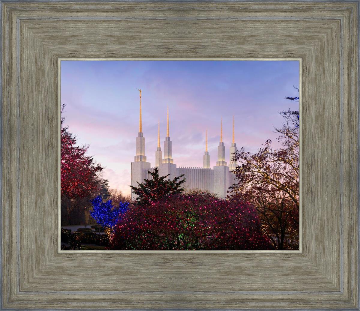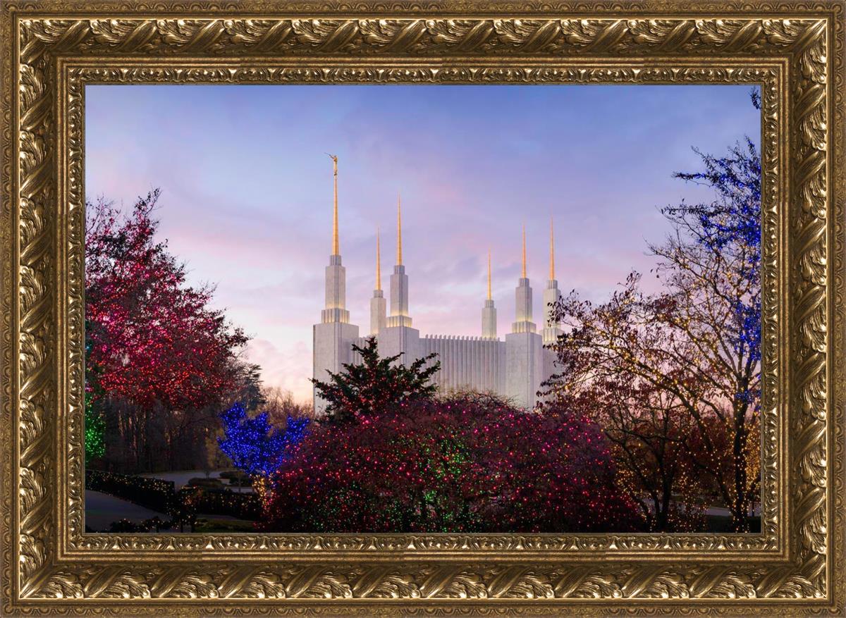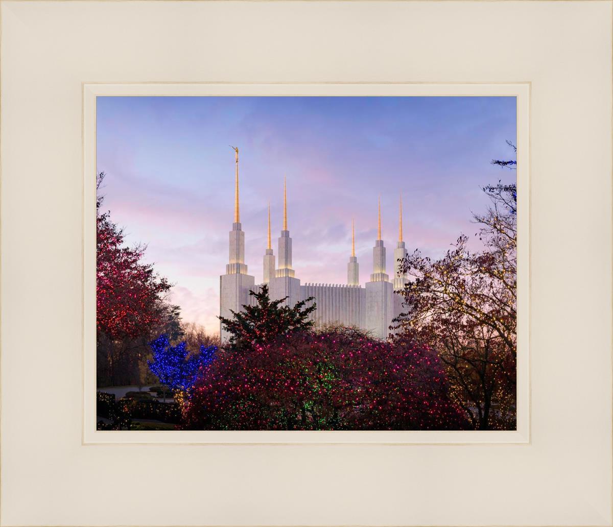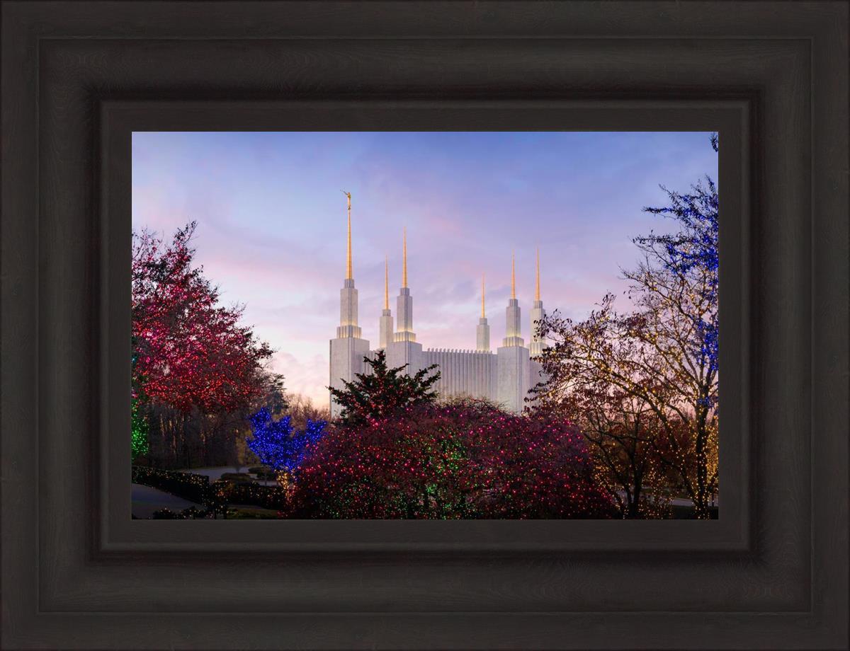 Morning sunrise with the Christmas lights at the Washington DC Temple.