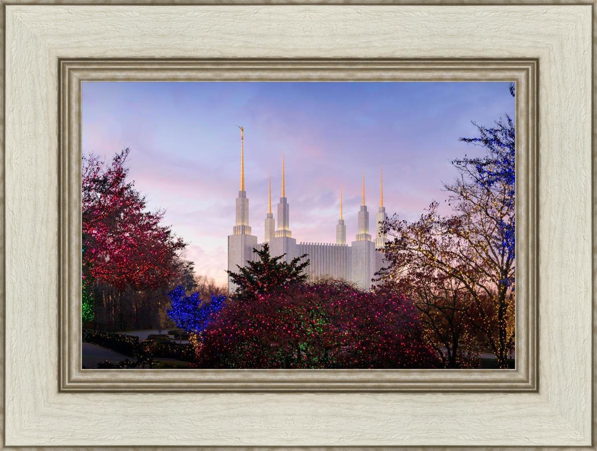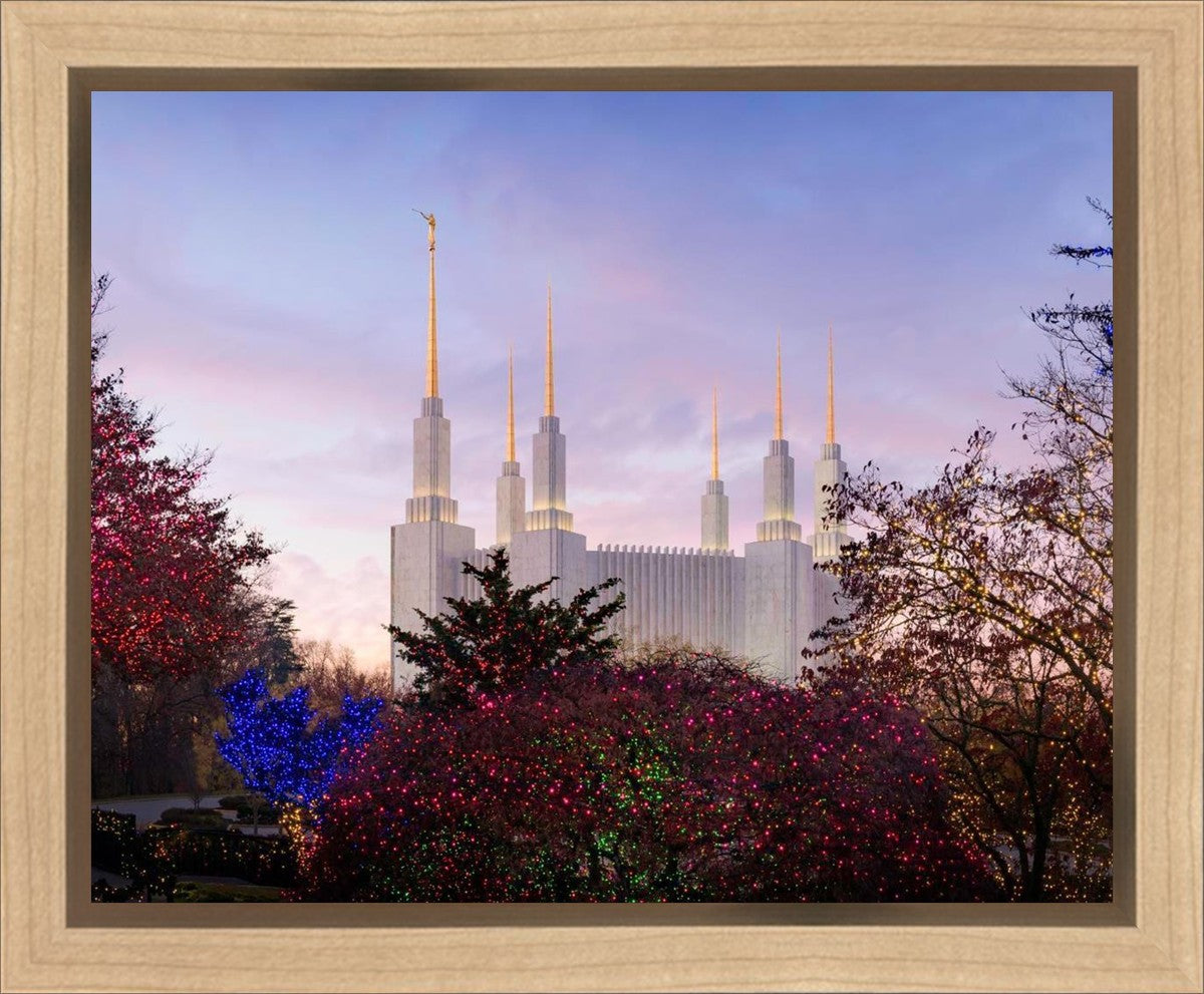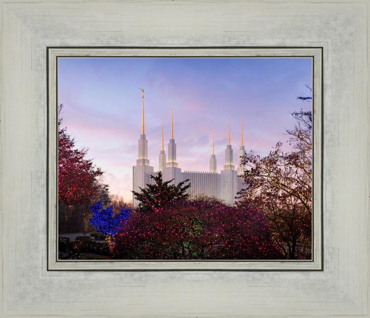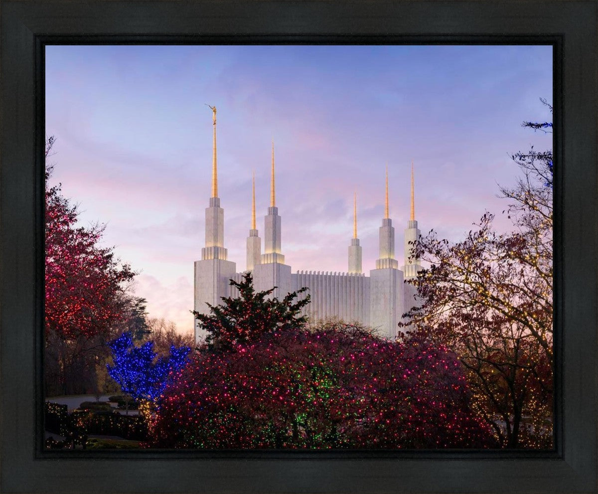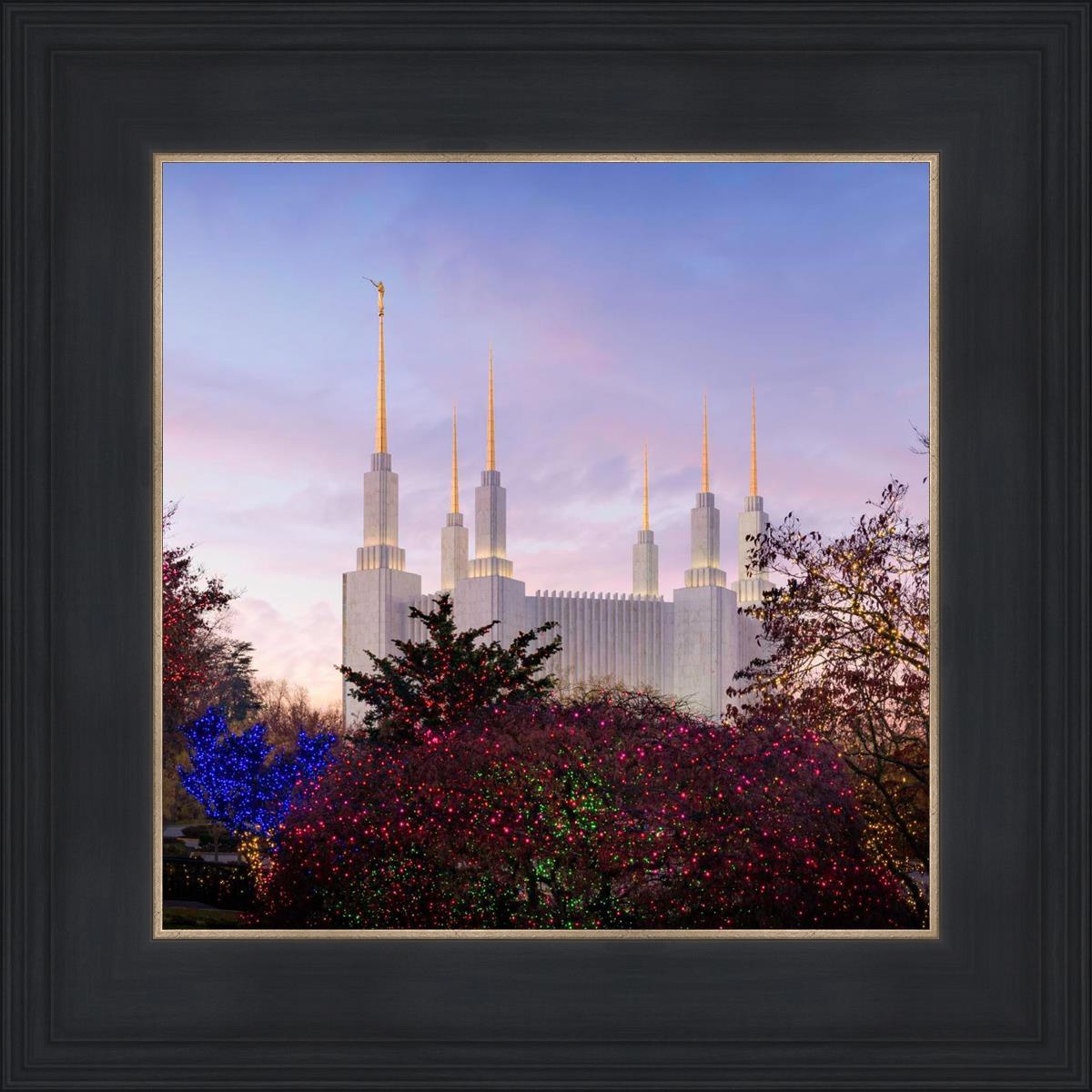 Morning sunrise with the Christmas lights at the Washington DC Temple.