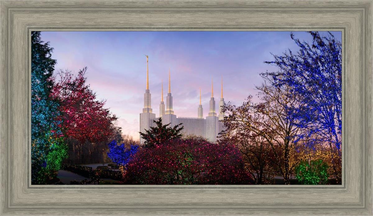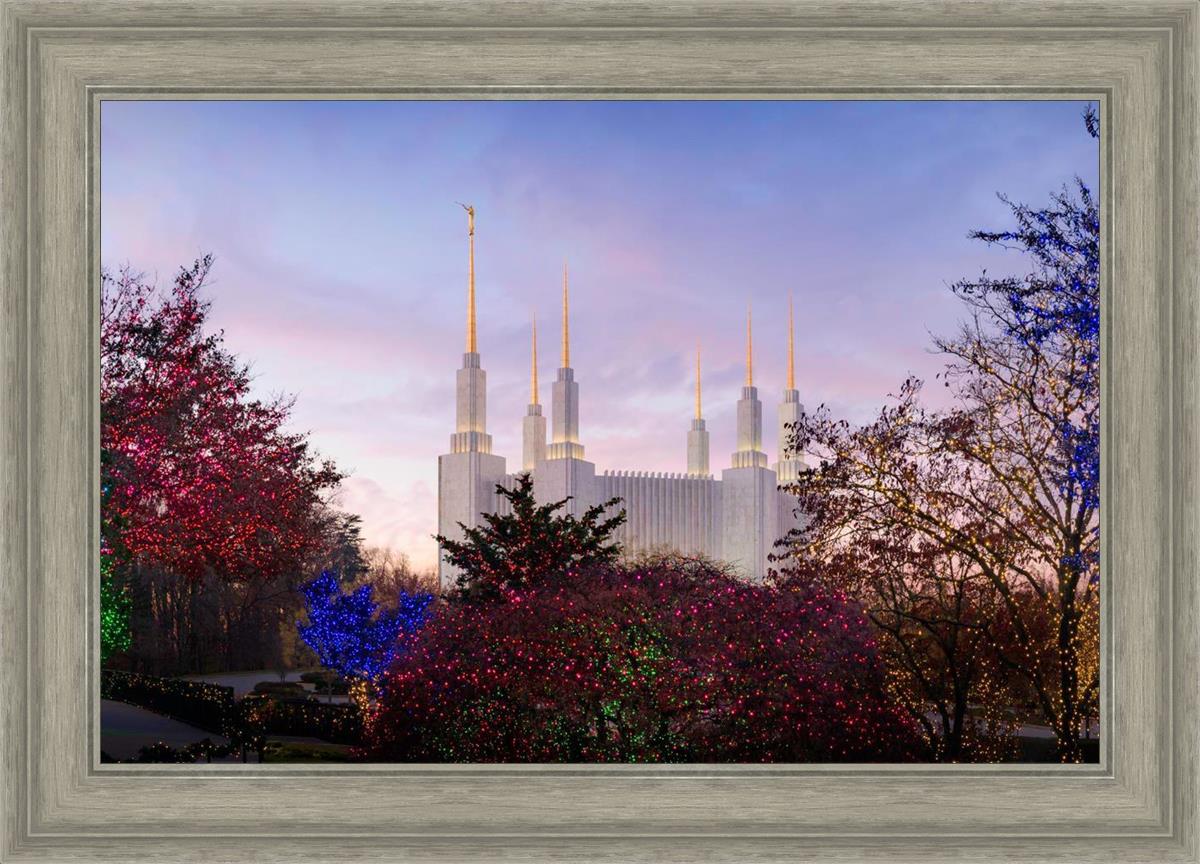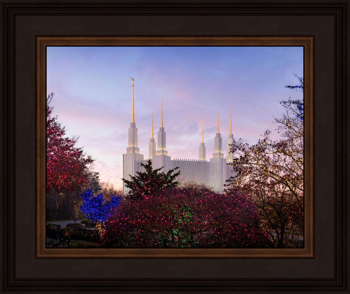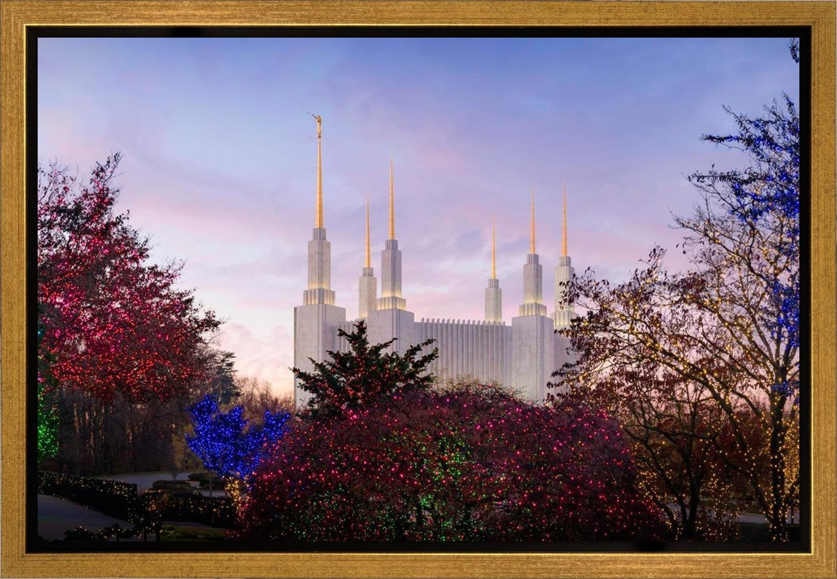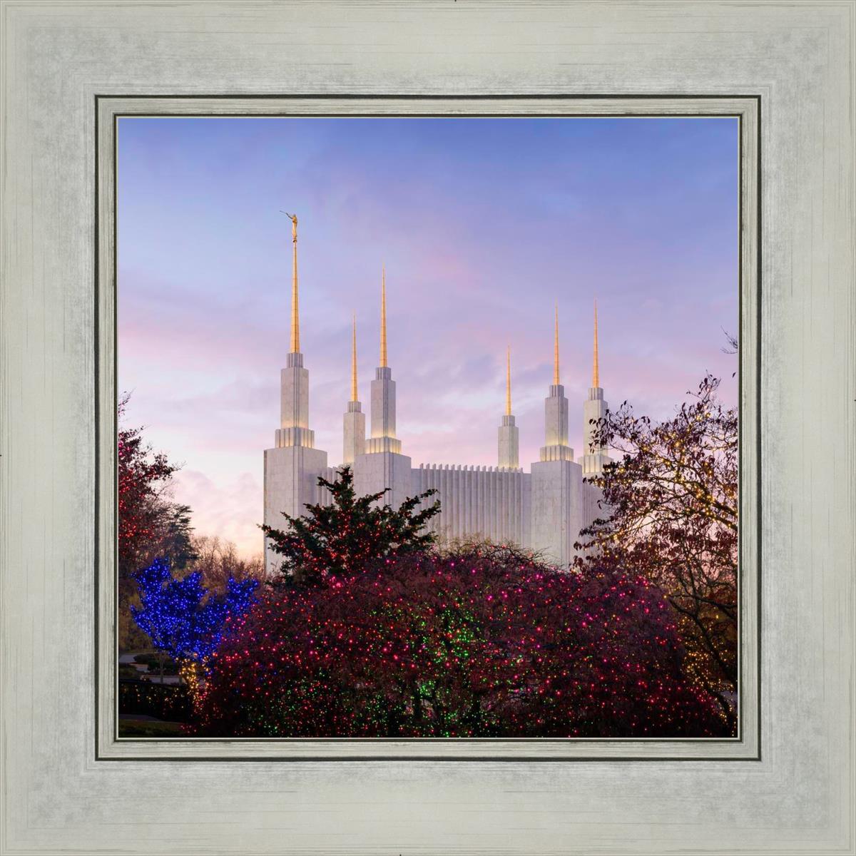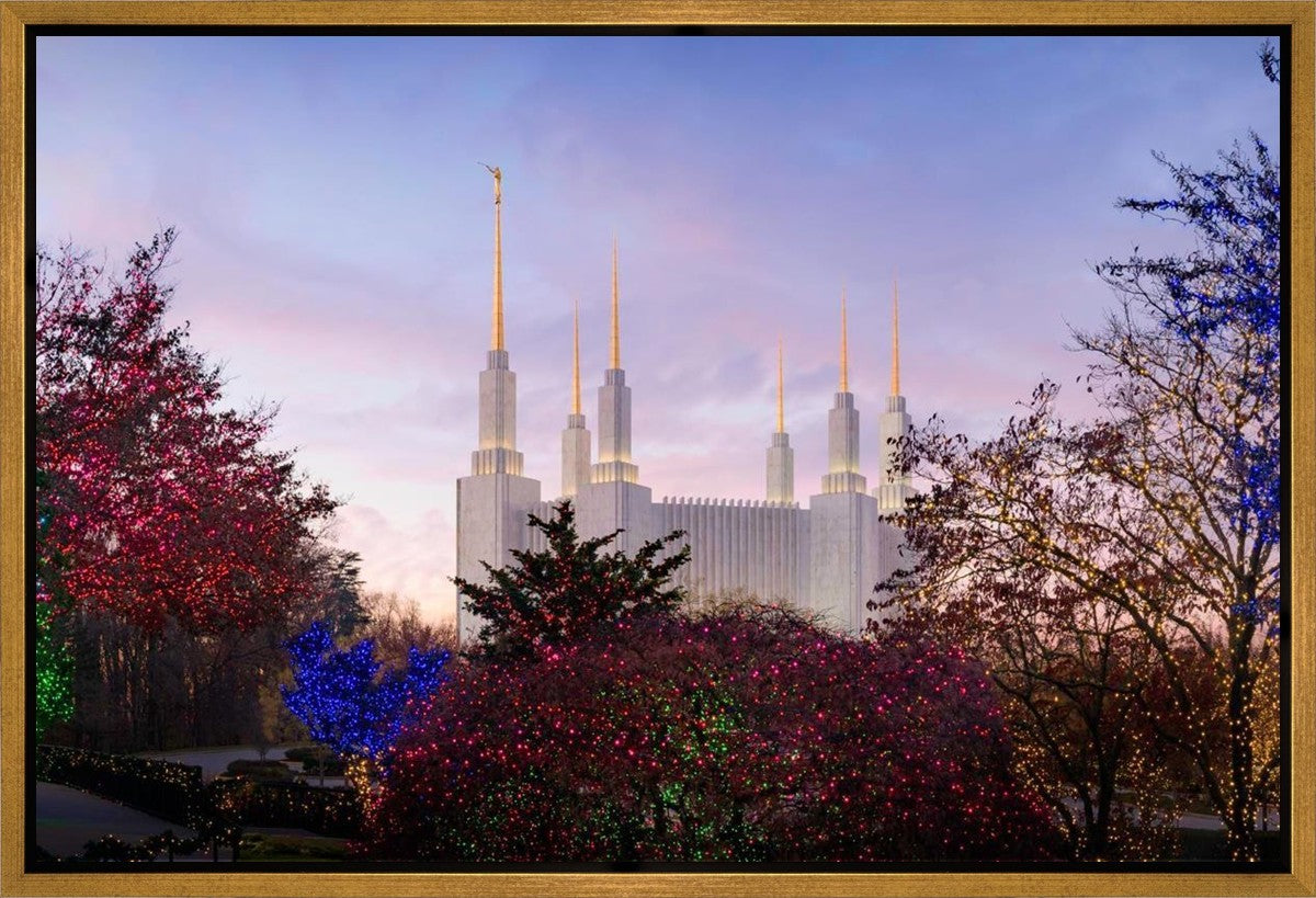 Morning sunrise with the Christmas lights at the Washington DC Temple.