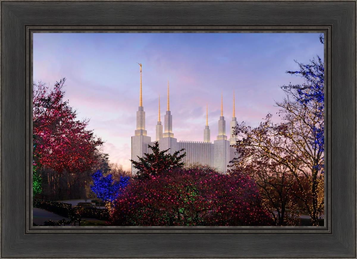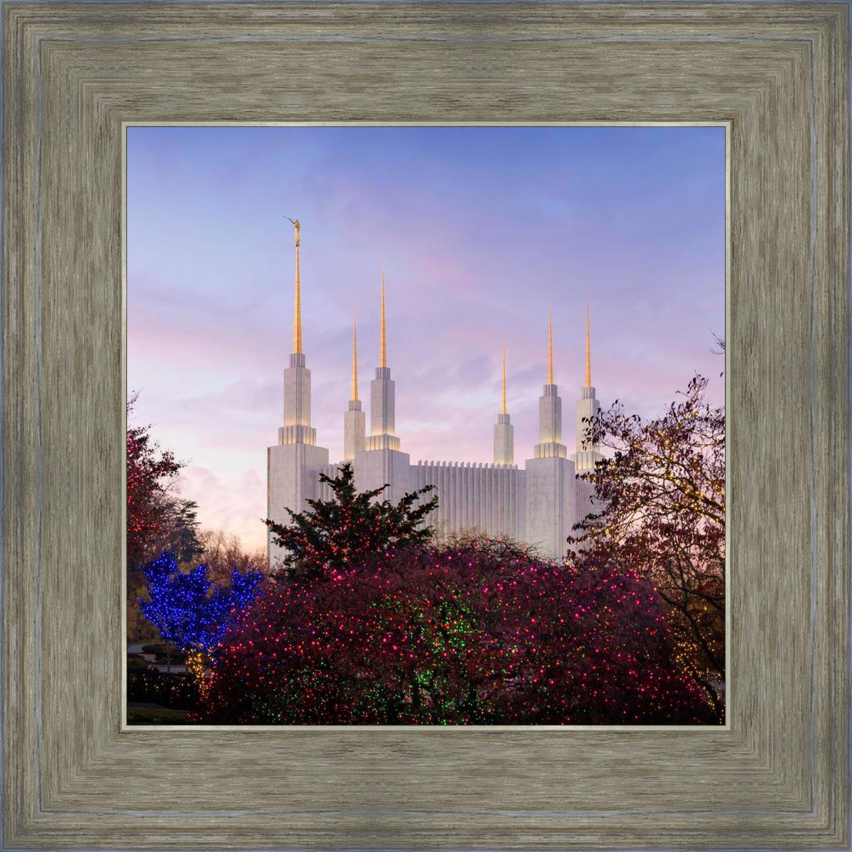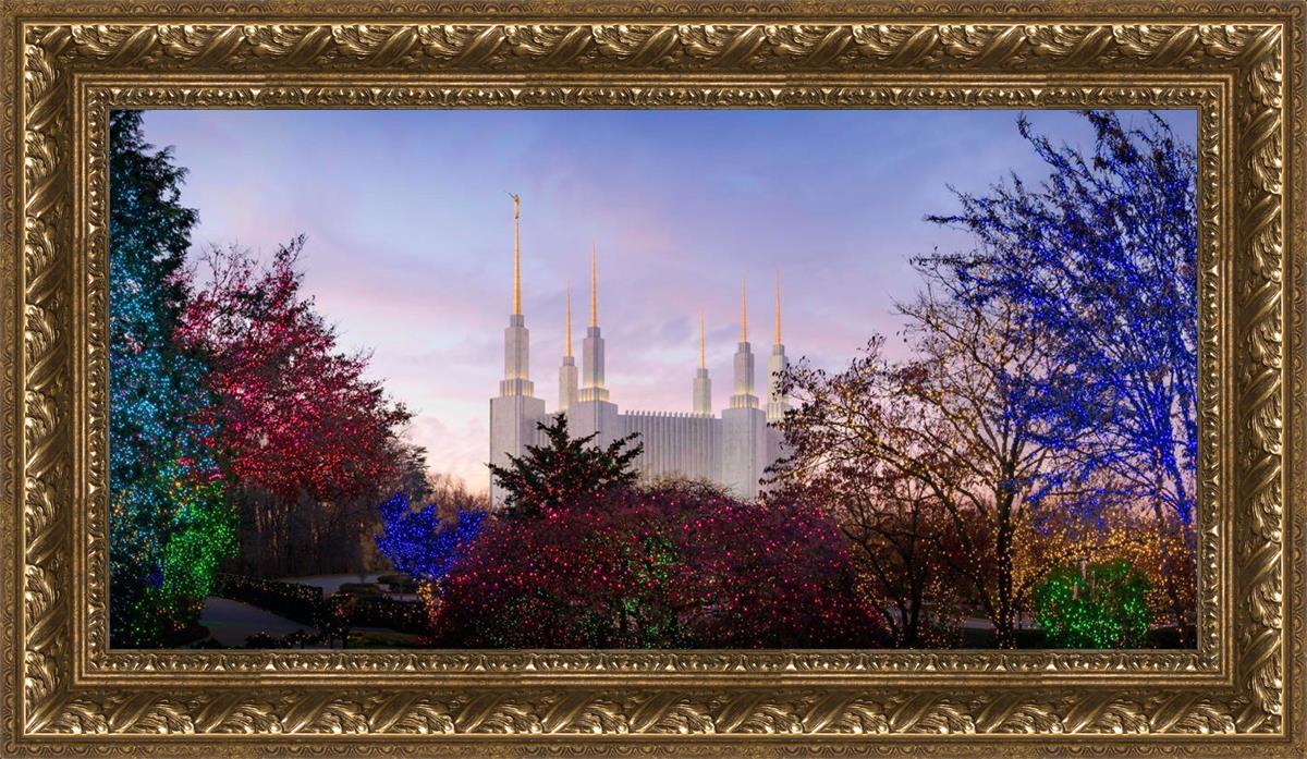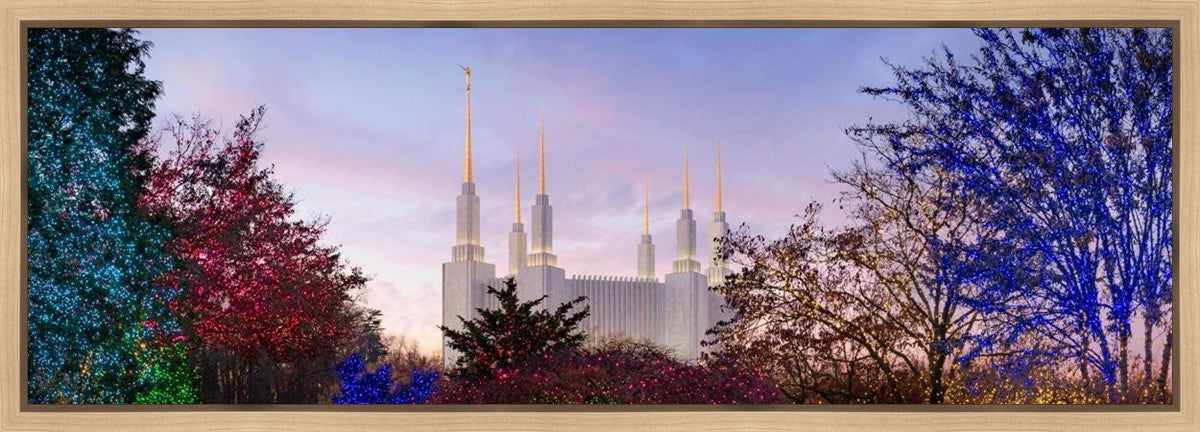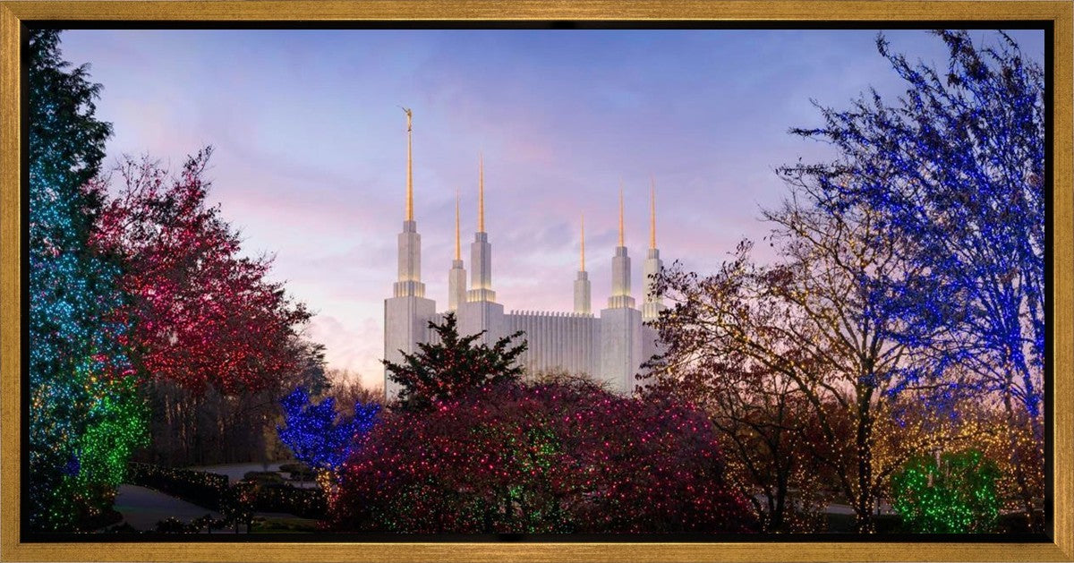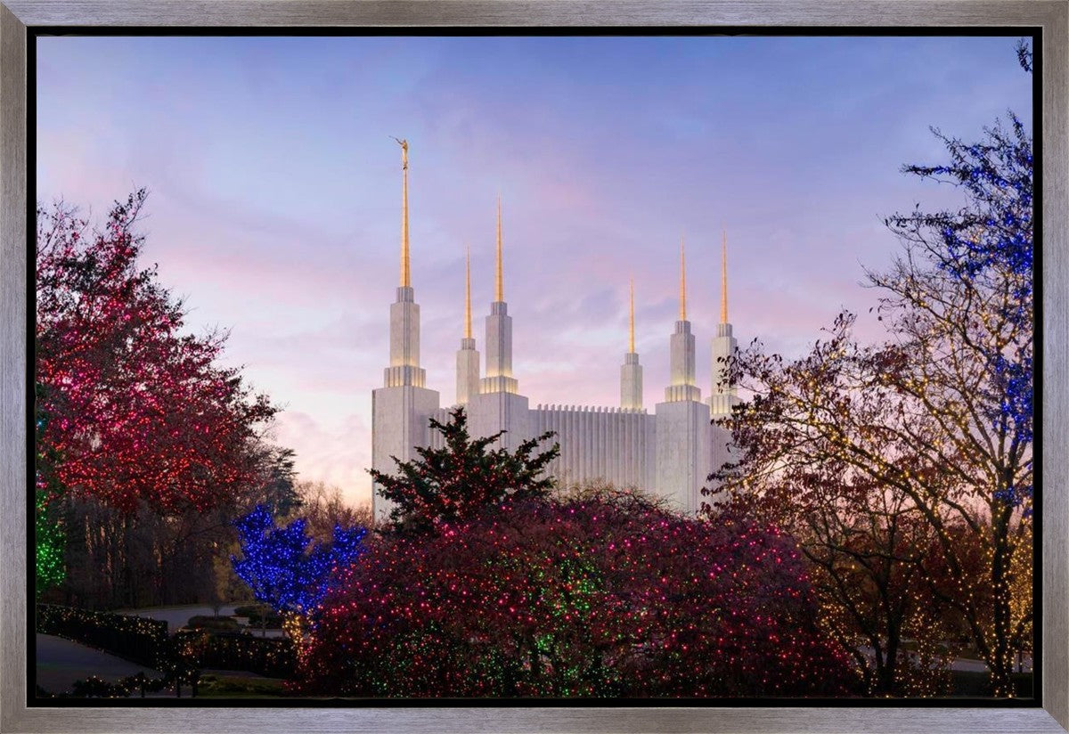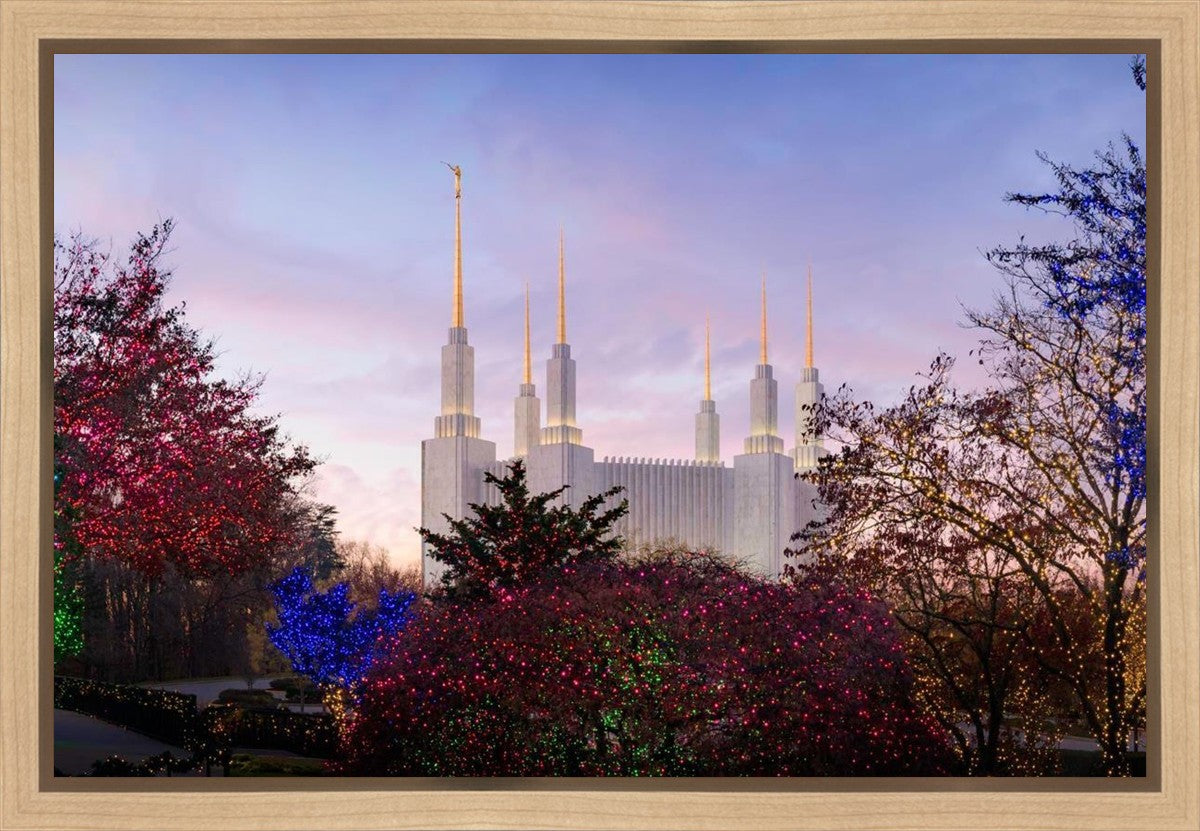 Morning sunrise with the Christmas lights at the Washington DC Temple.