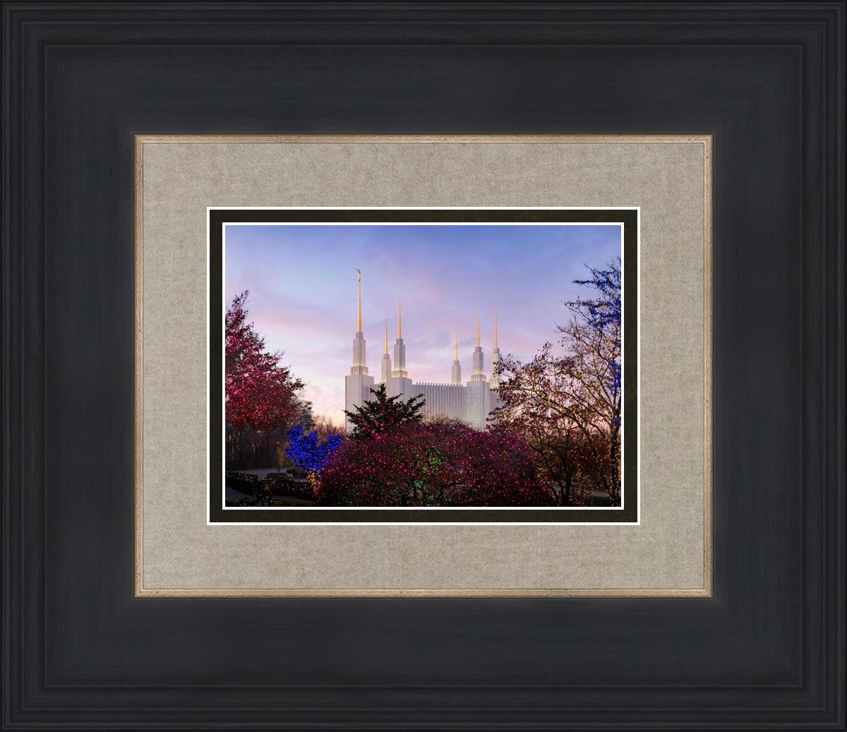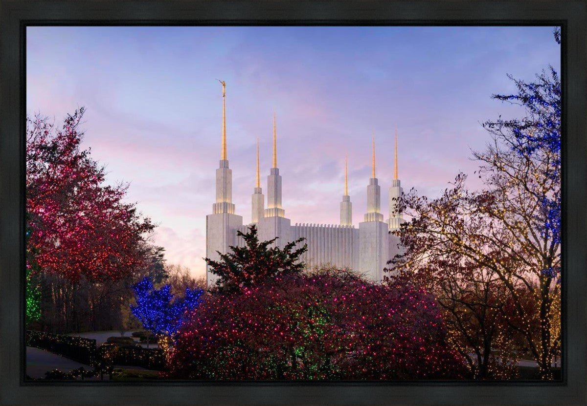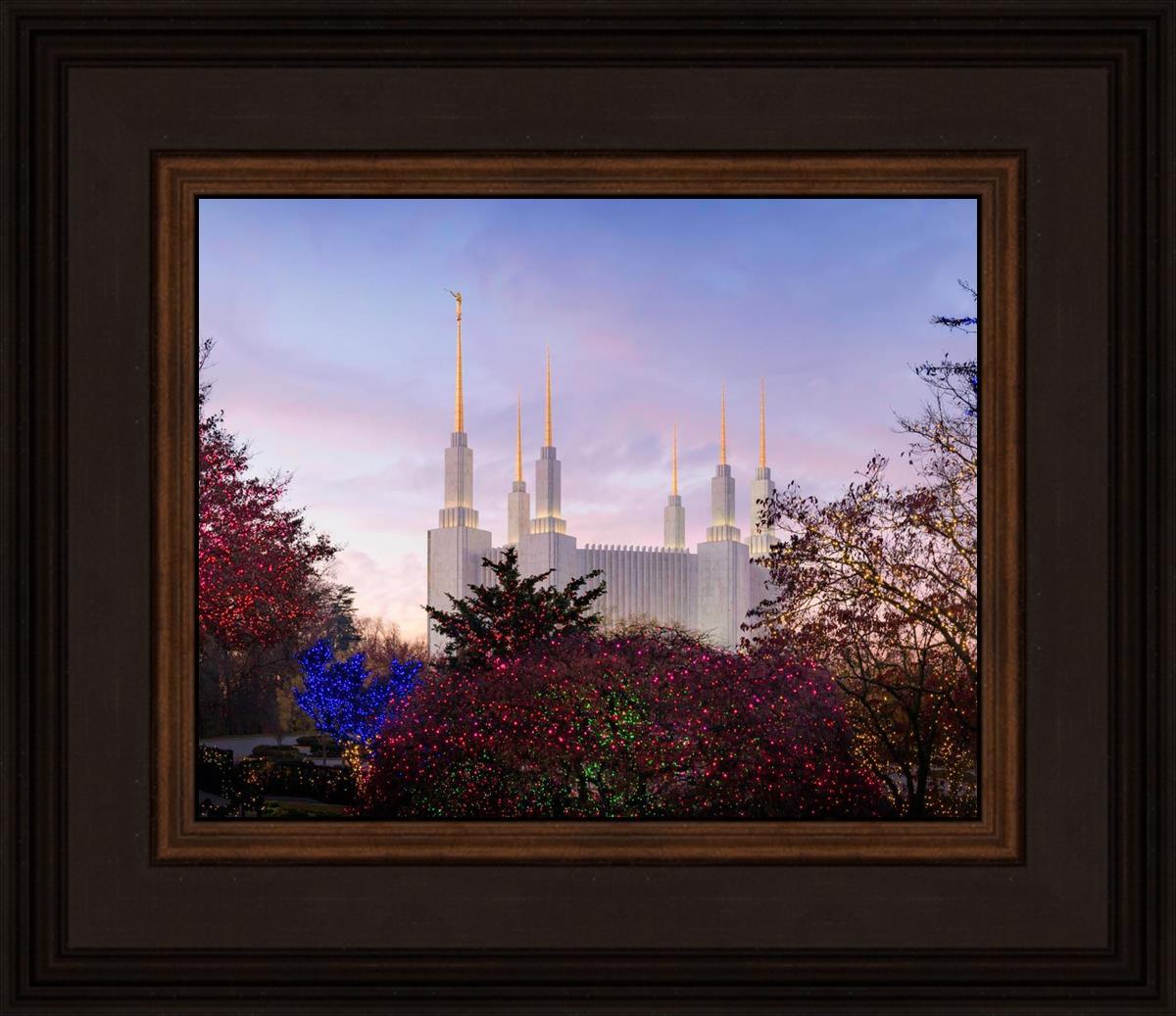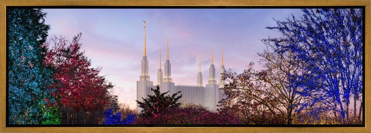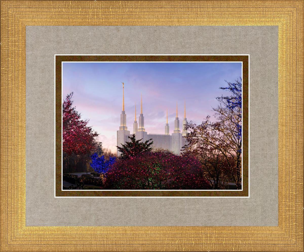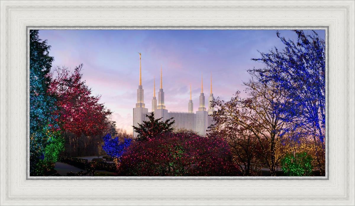 Morning sunrise with the Christmas lights at the Washington DC Temple.