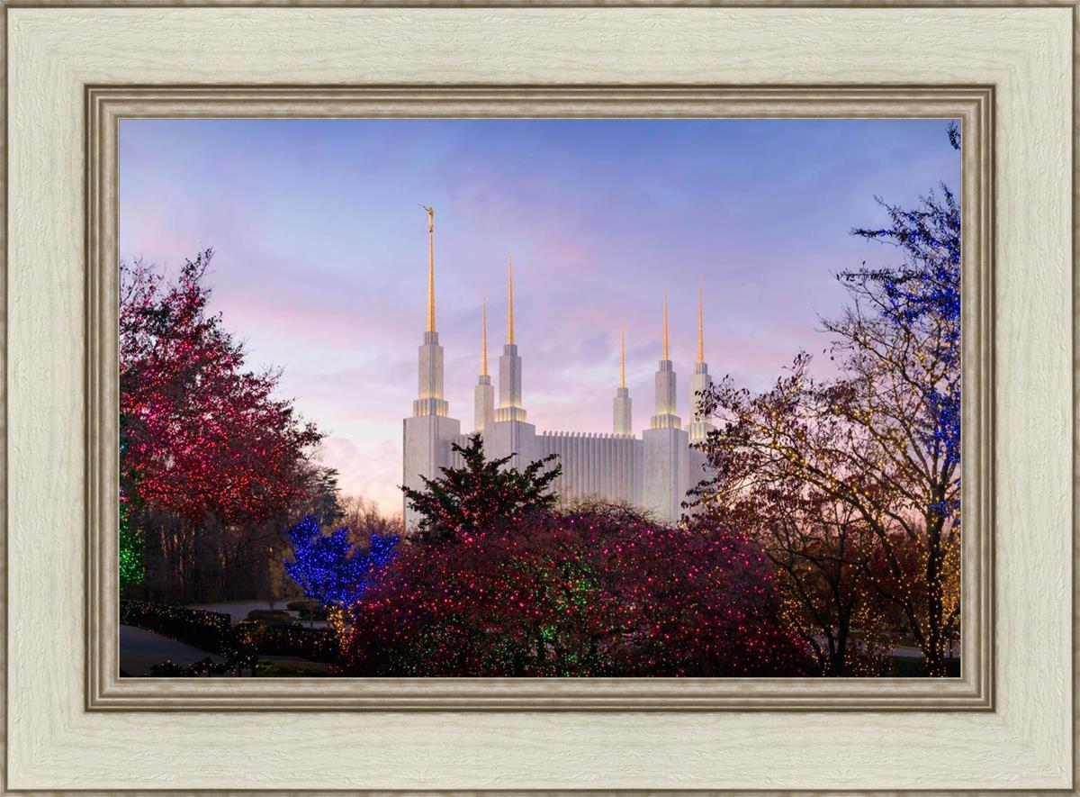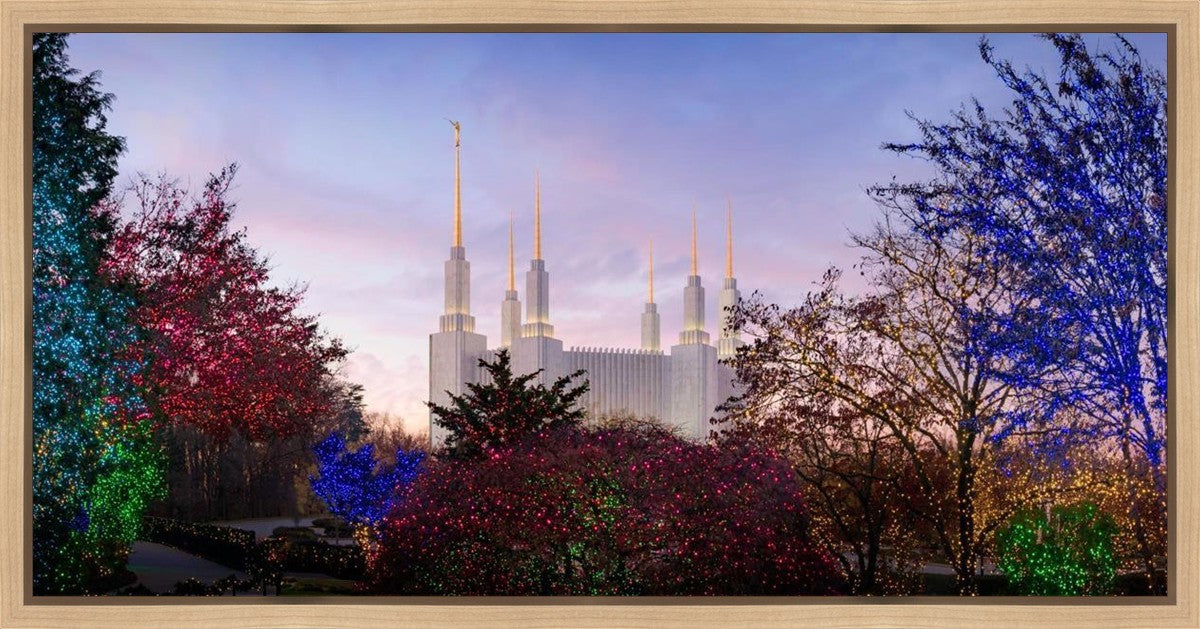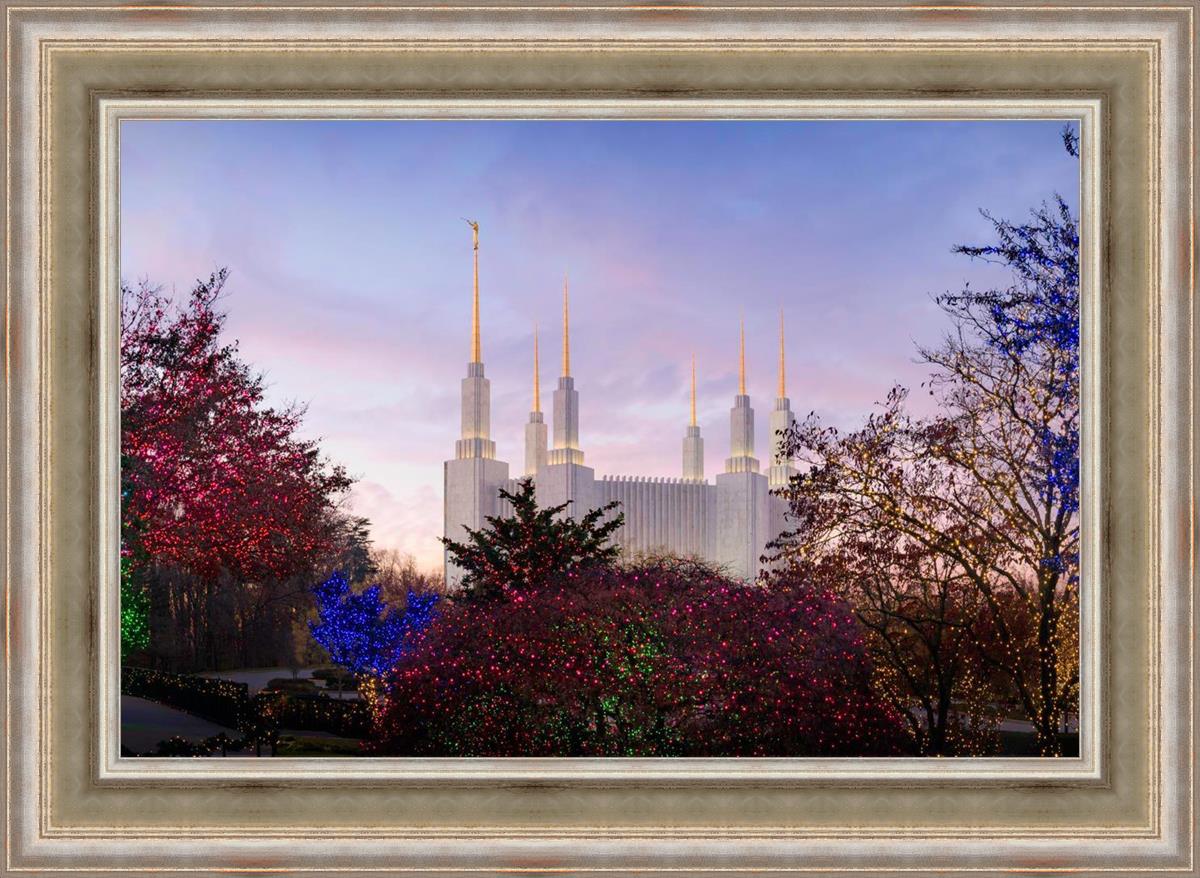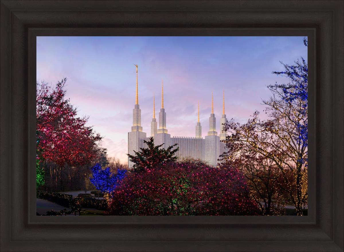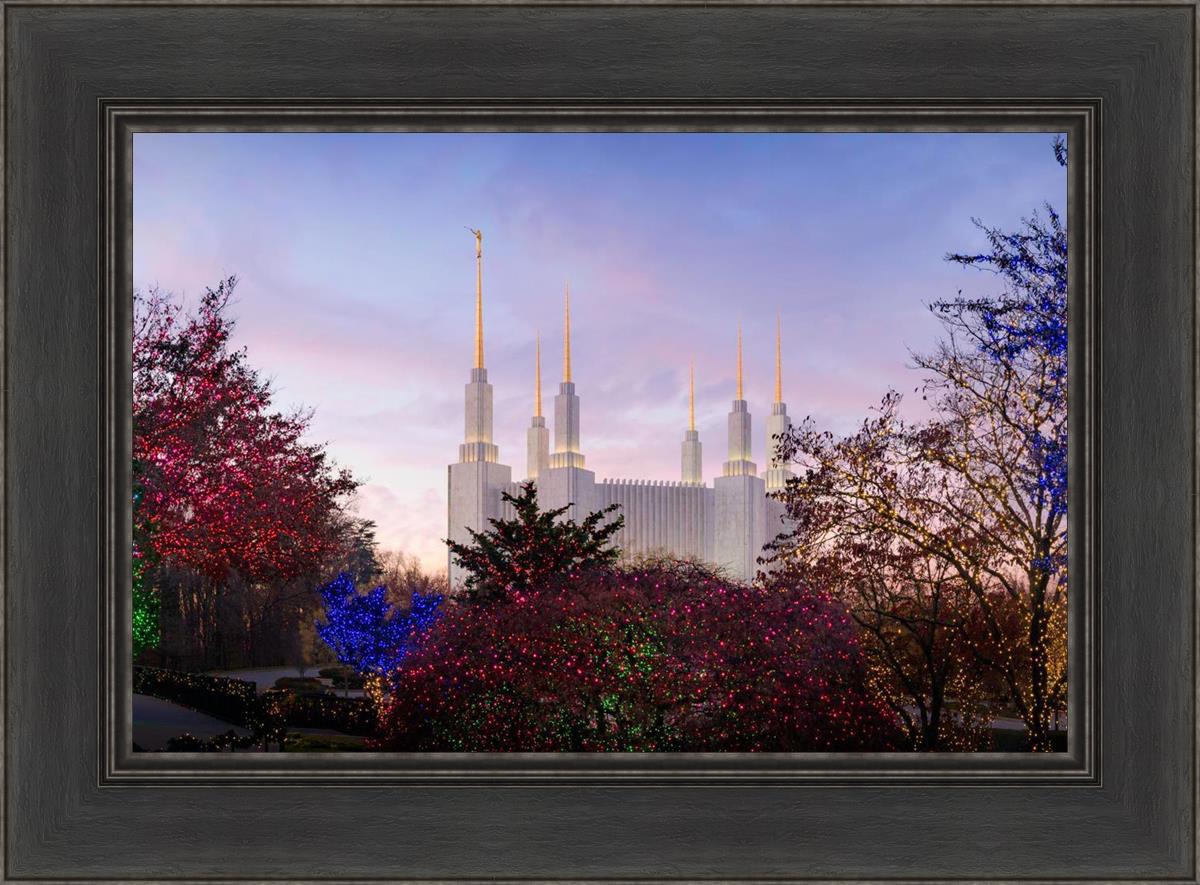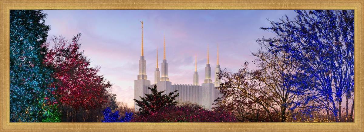 Morning sunrise with the Christmas lights at the Washington DC Temple.