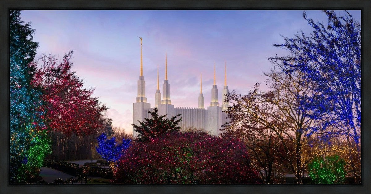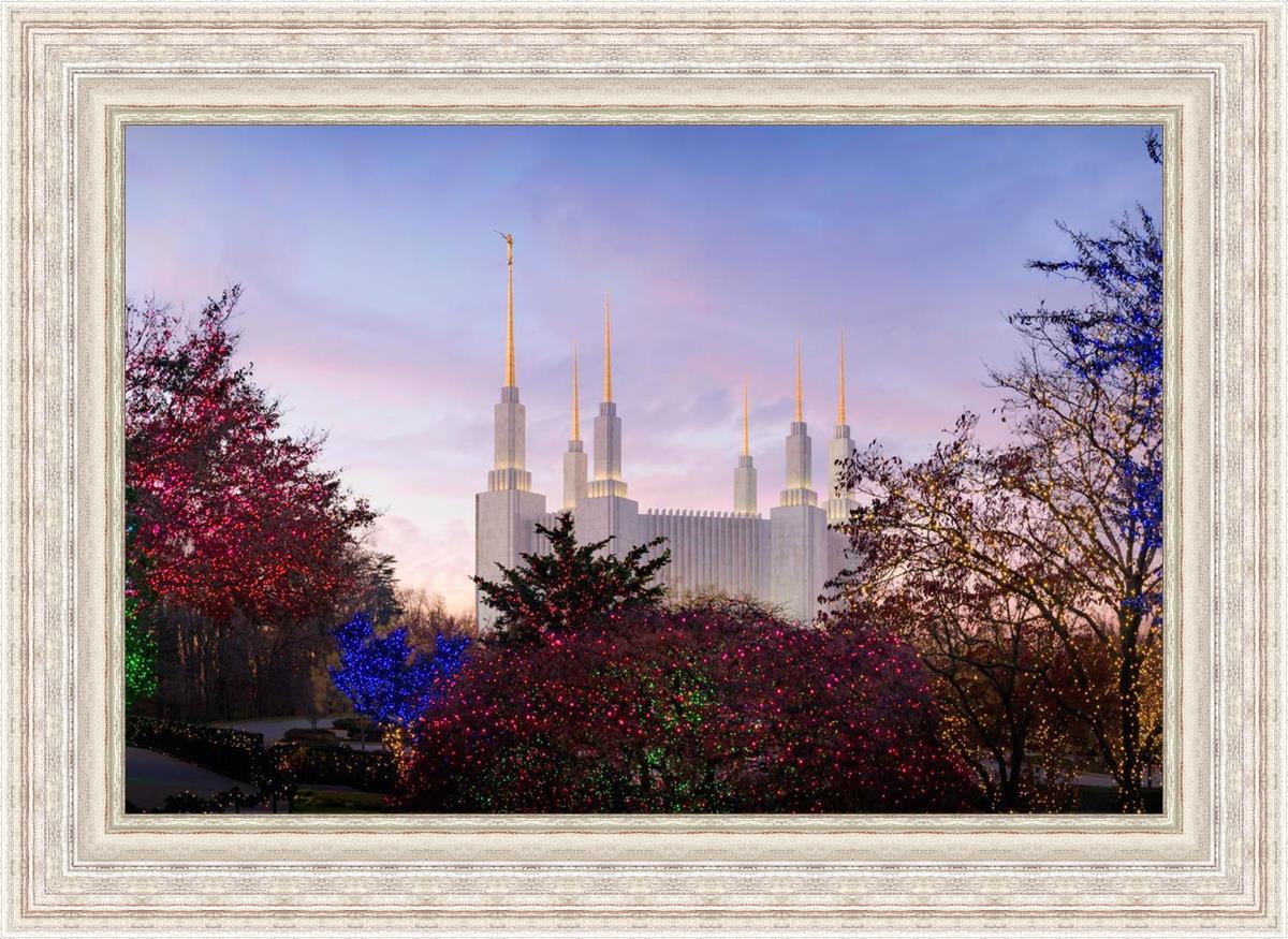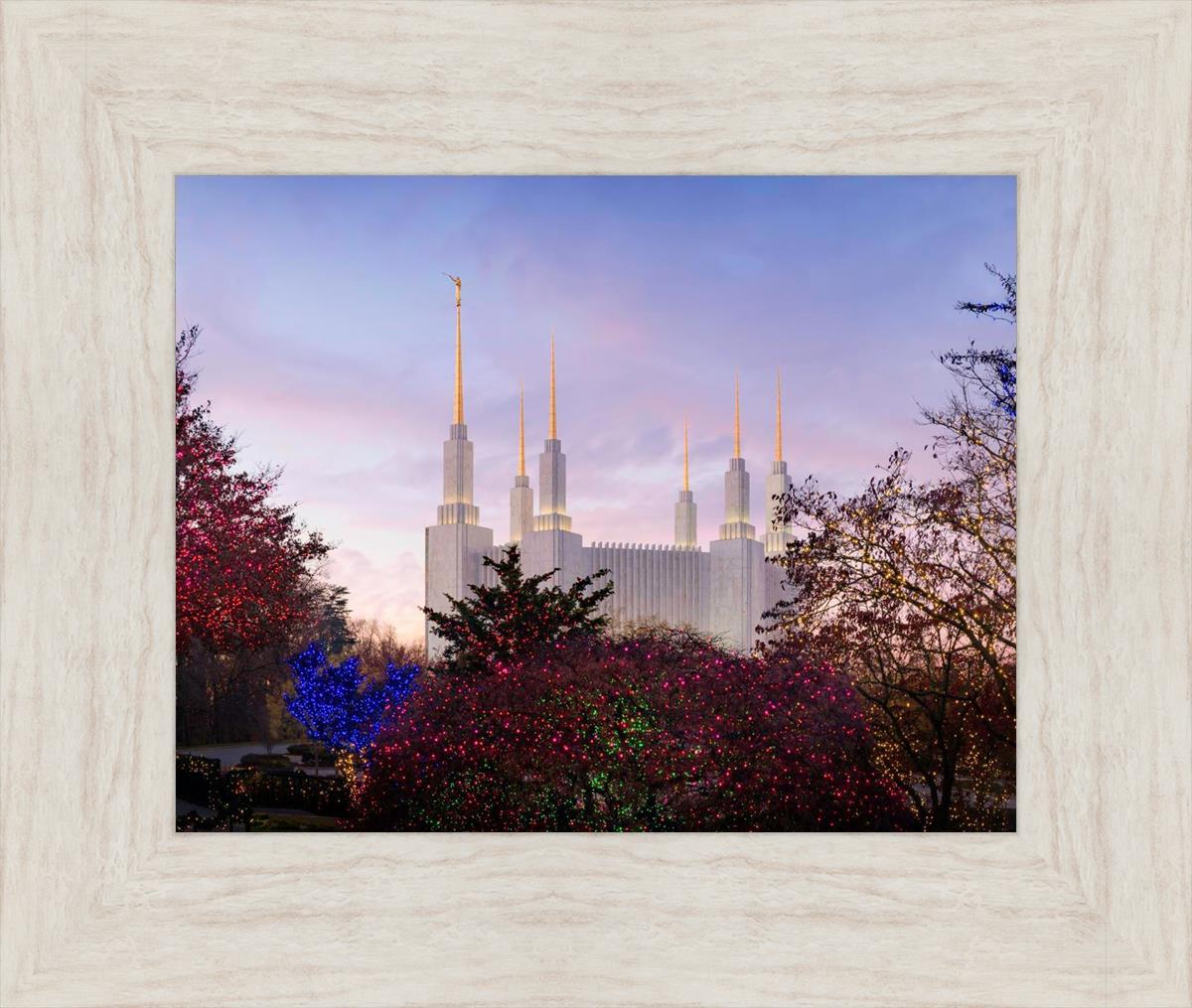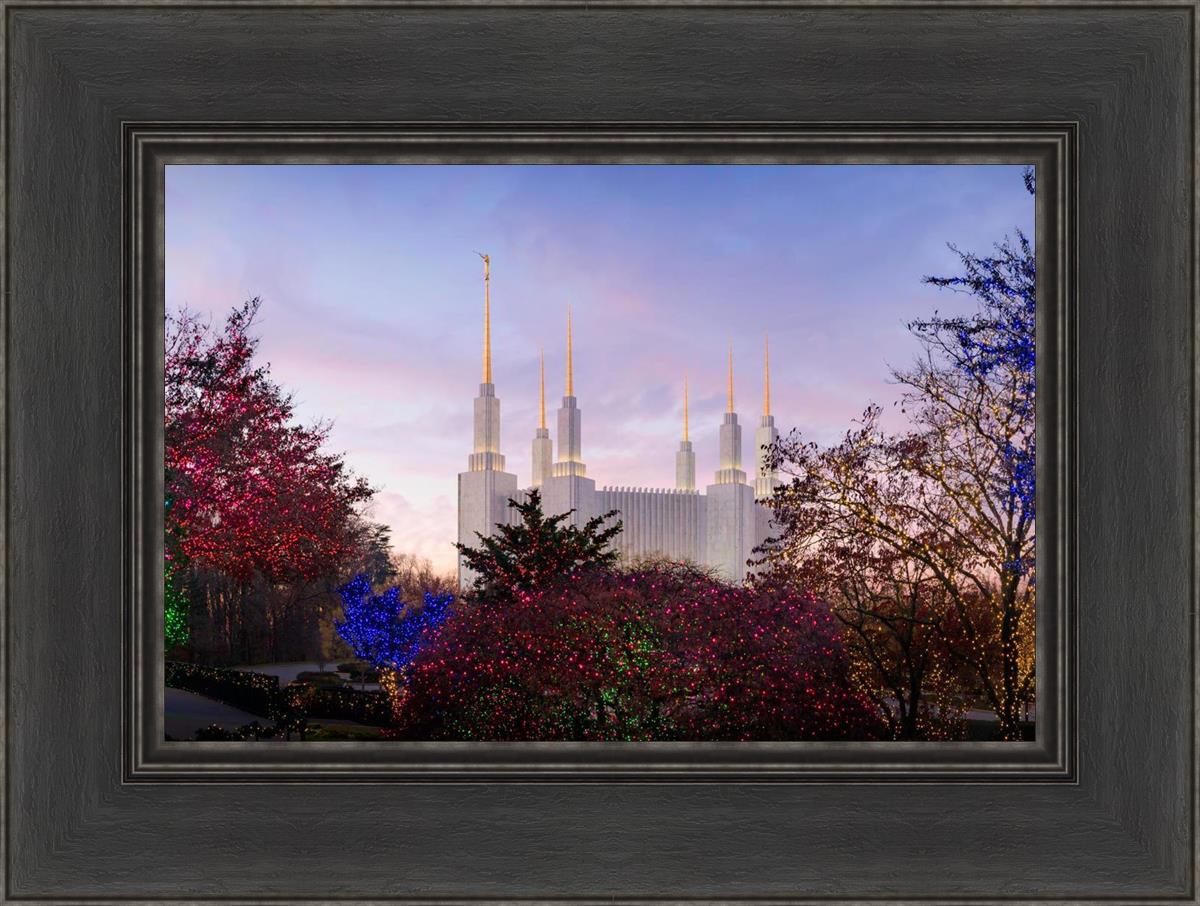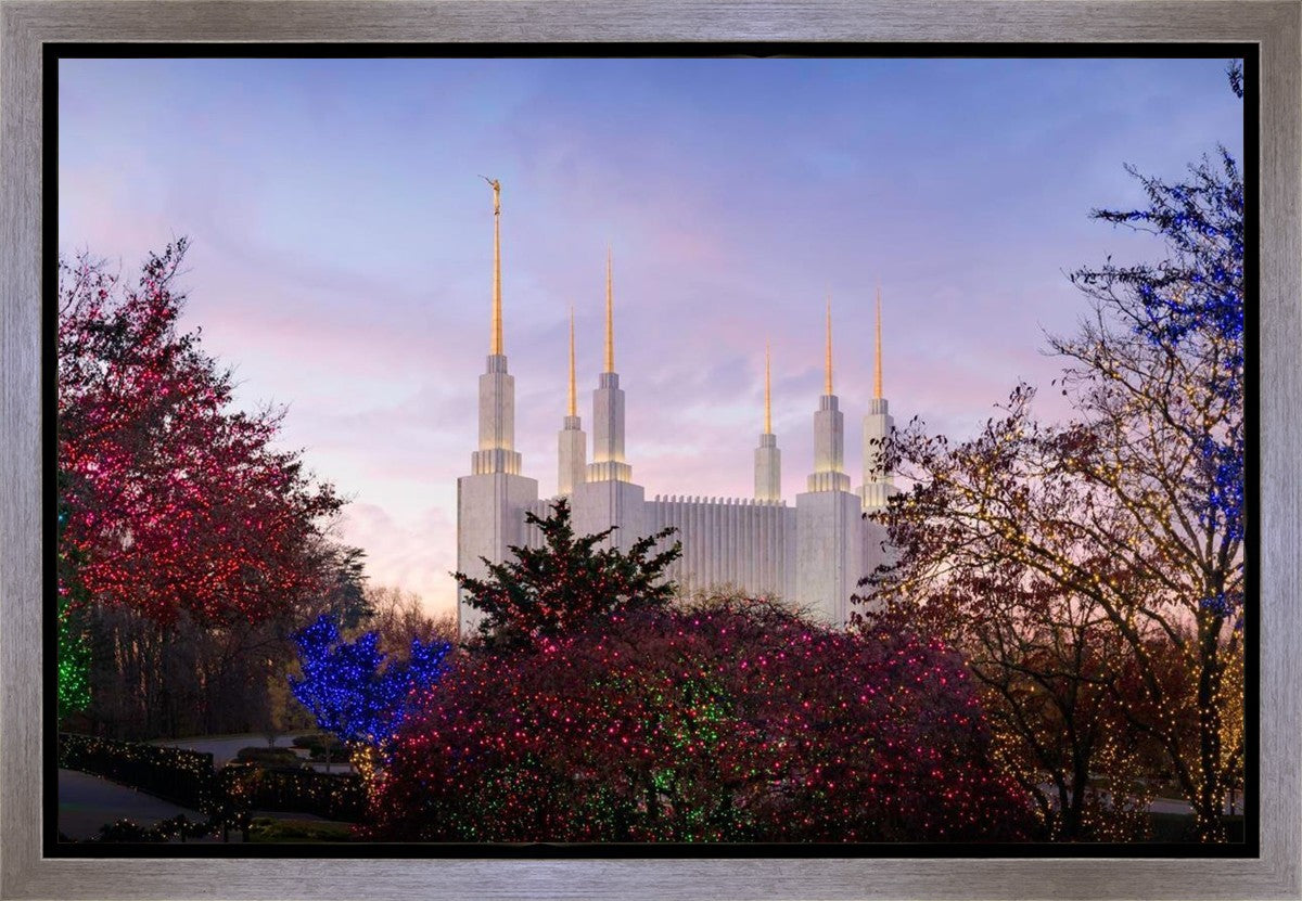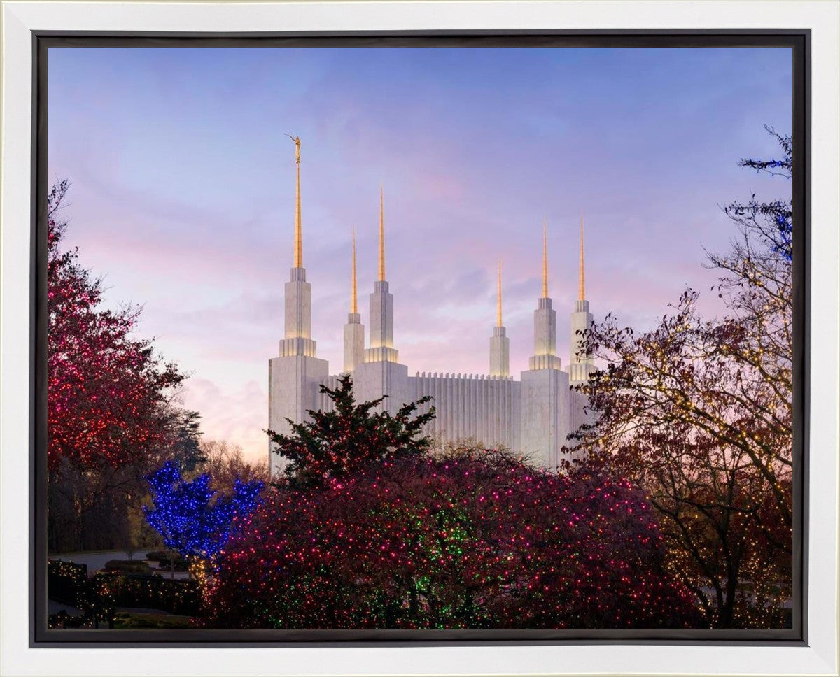 Morning sunrise with the Christmas lights at the Washington DC Temple.