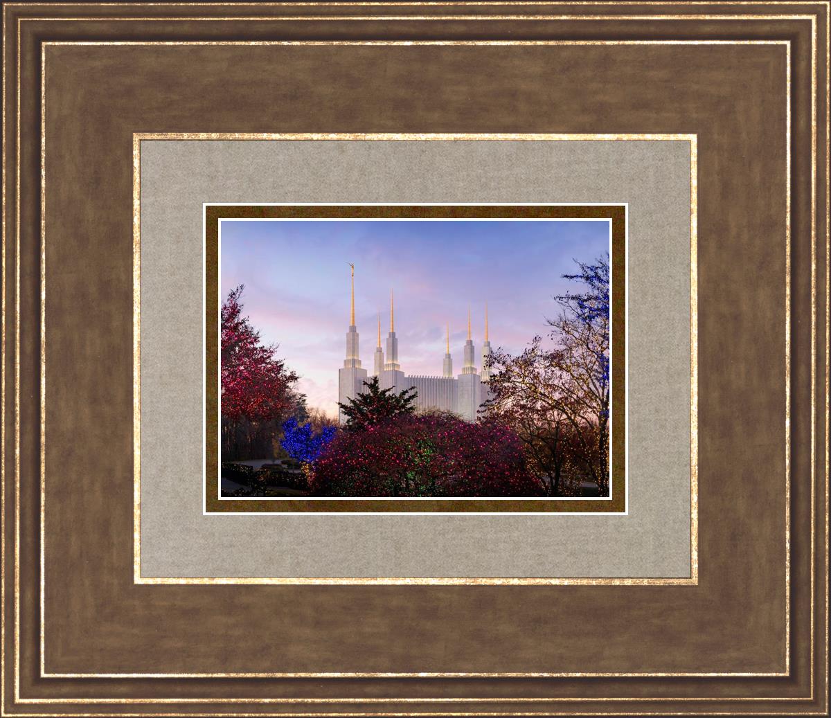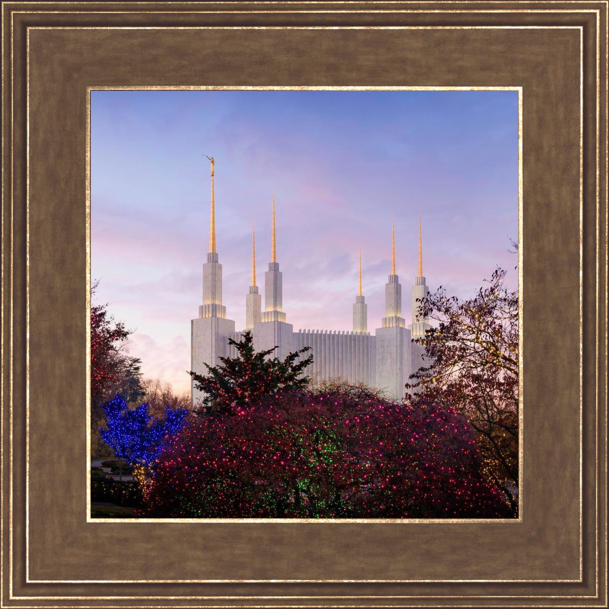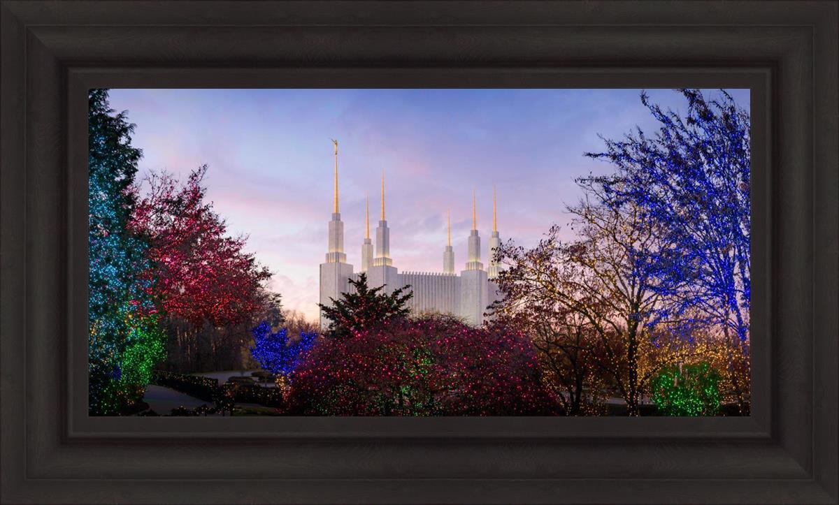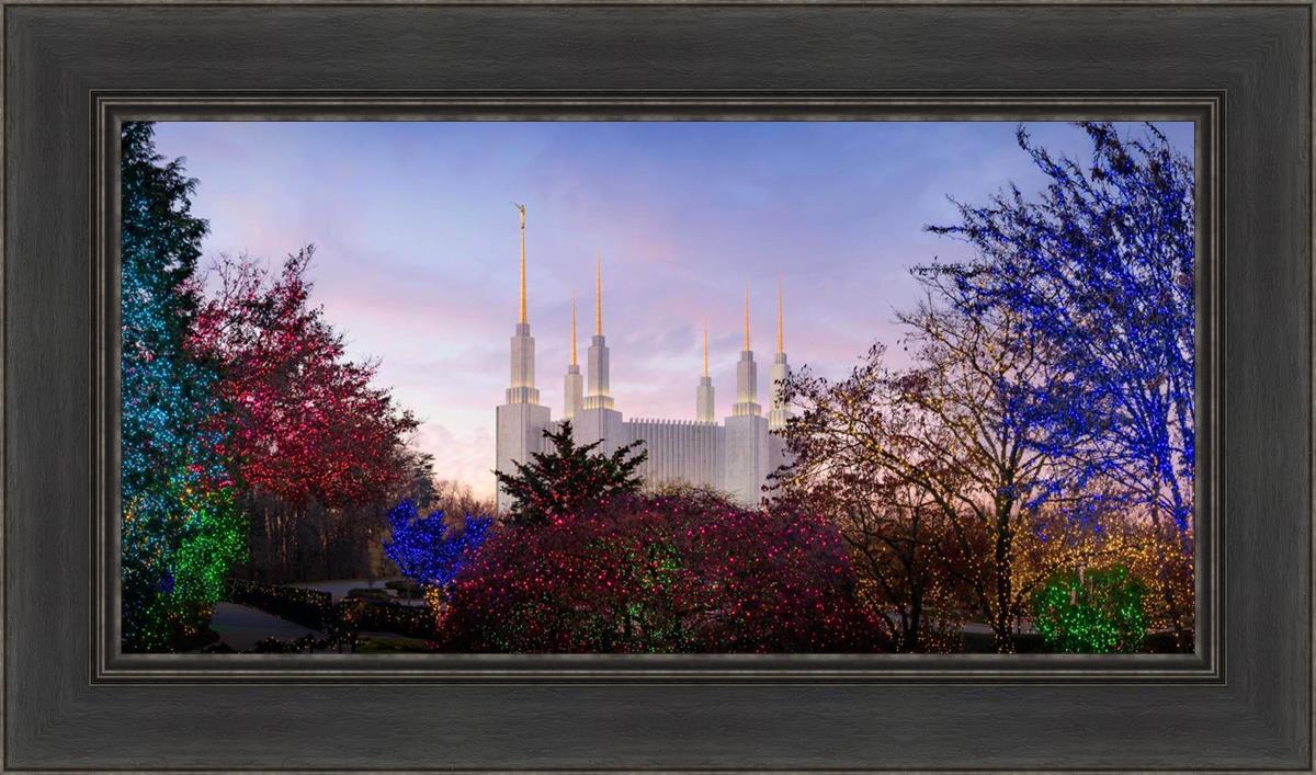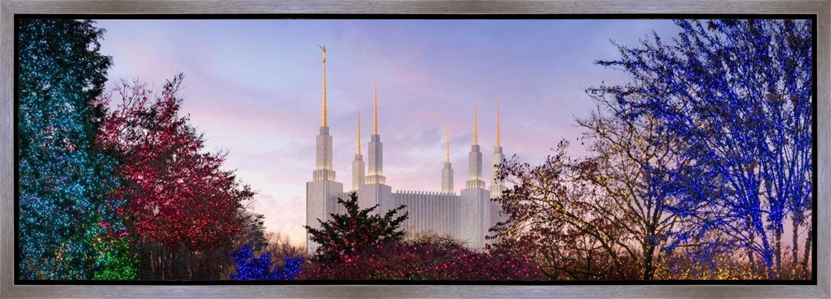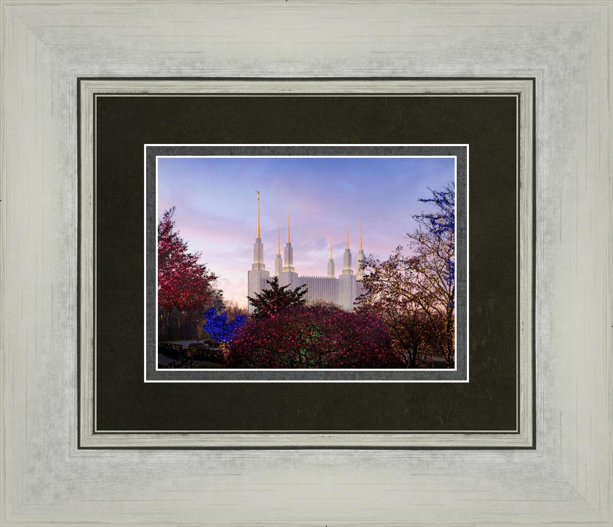 Morning sunrise with the Christmas lights at the Washington DC Temple.