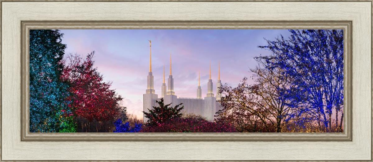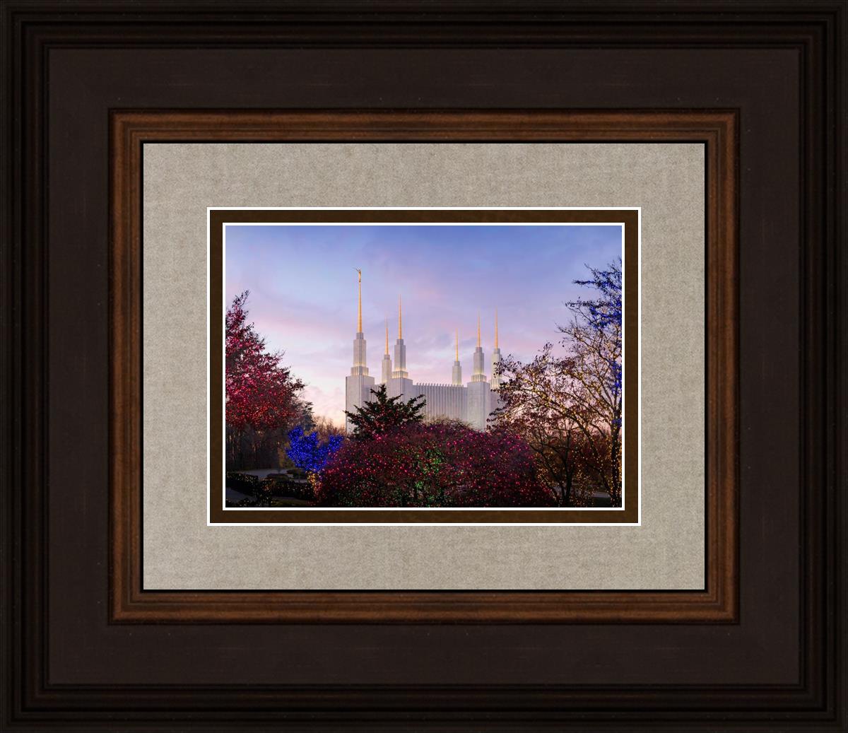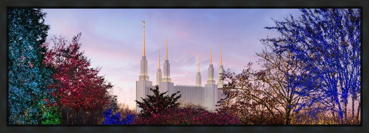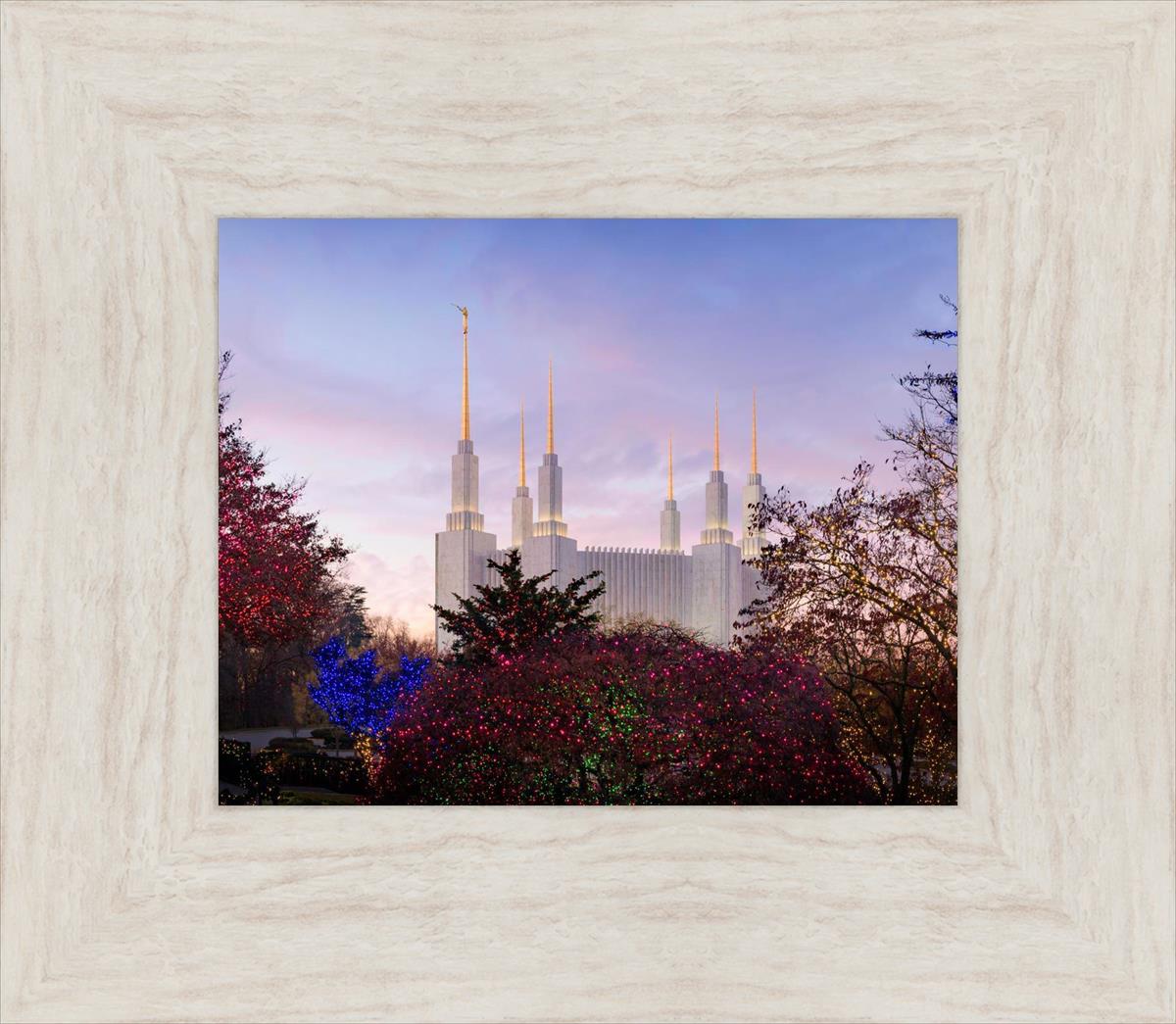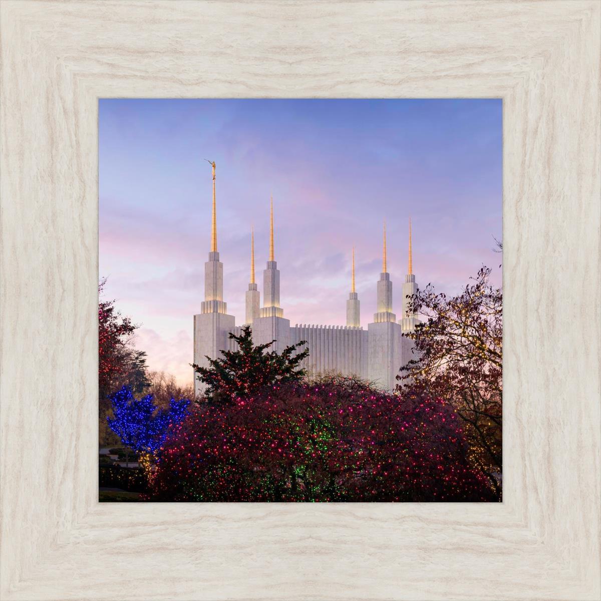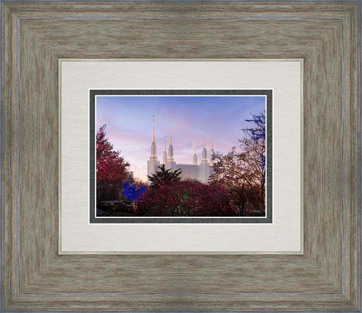 Morning sunrise with the Christmas lights at the Washington DC Temple.