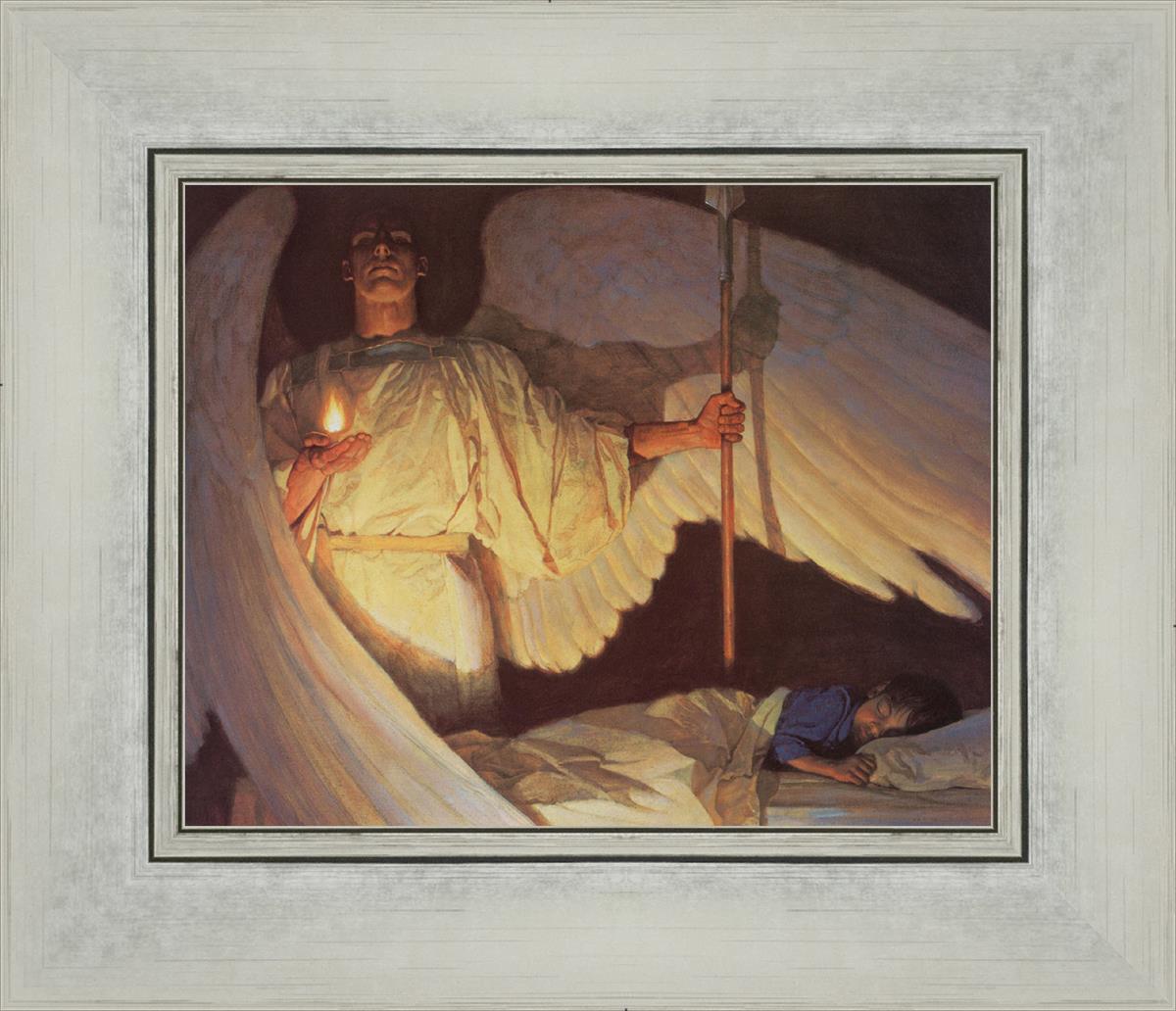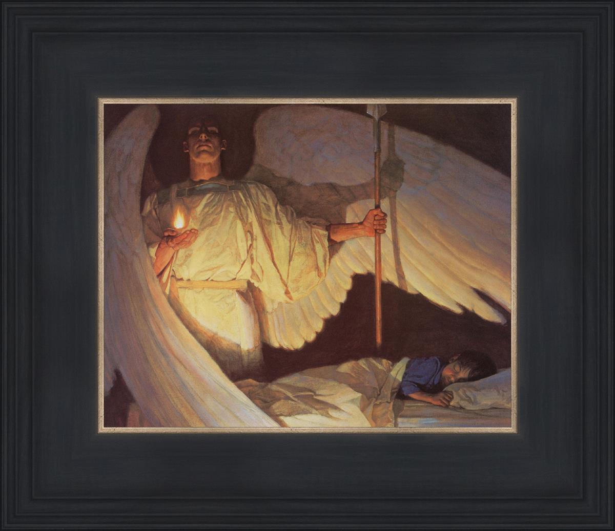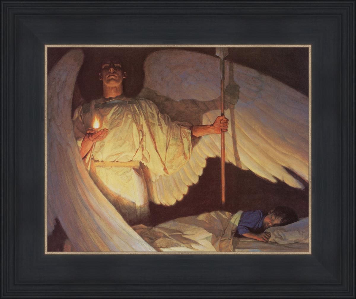 "Watchers in the Night" by Thomas Blackshear depicts a vigilant angel guarding over a sleeping child. The flame above the angel's hand signifies the presence of the Holy Spirit, offering comfort and assurance.