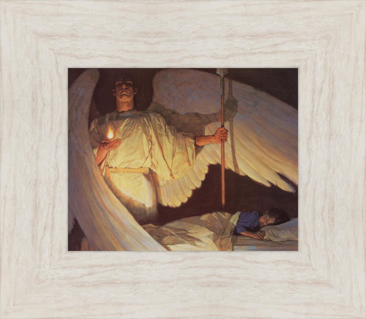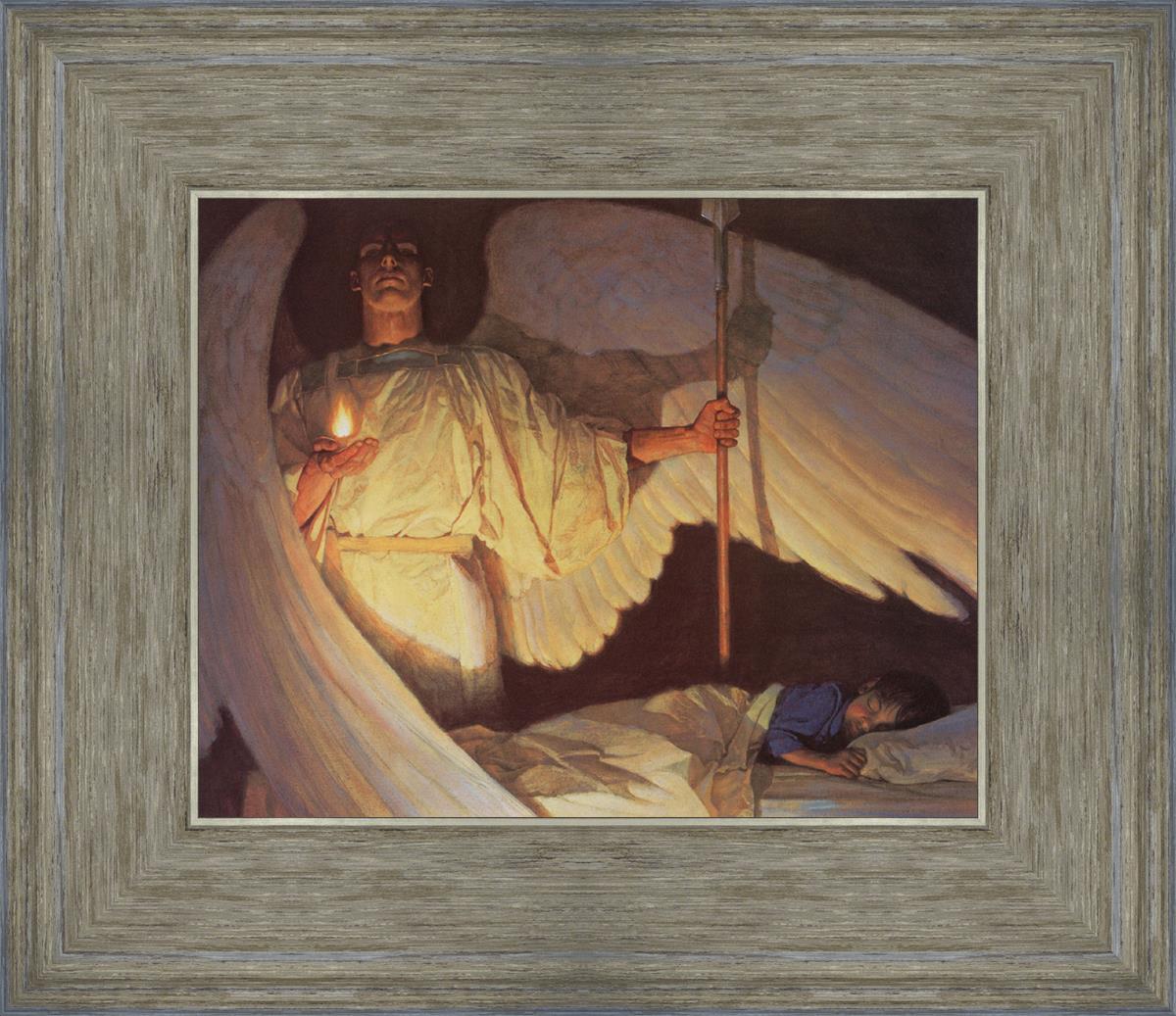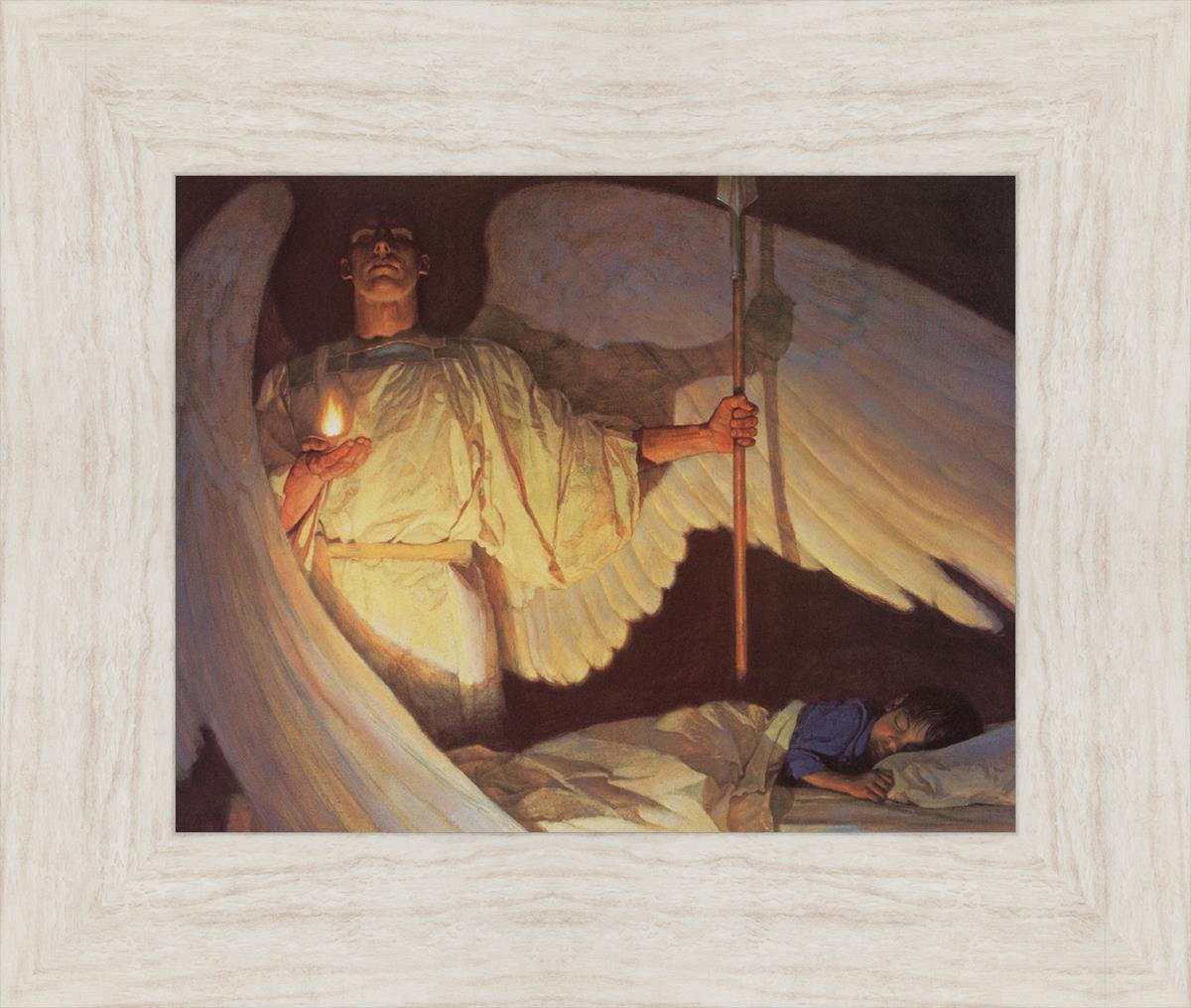 "Watchers in the Night" by Thomas Blackshear depicts a vigilant angel guarding over a sleeping child. The flame above the angel's hand signifies the presence of the Holy Spirit, offering comfort and assurance.