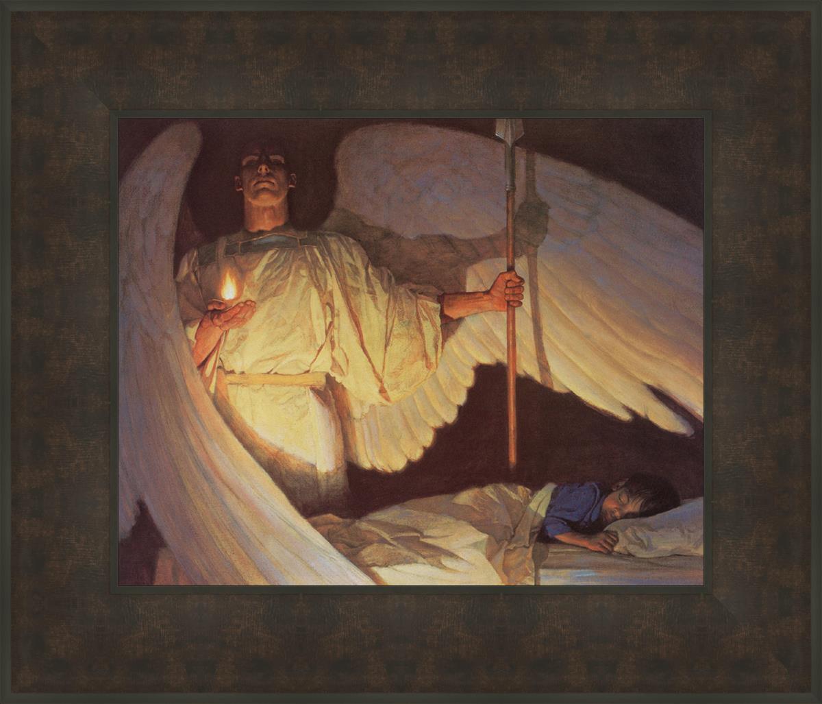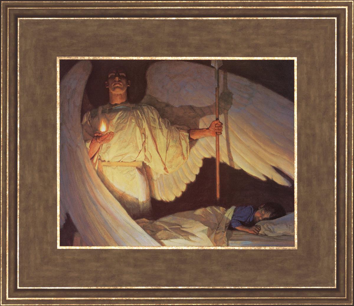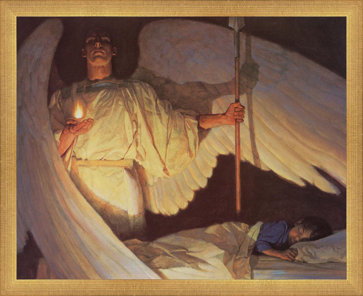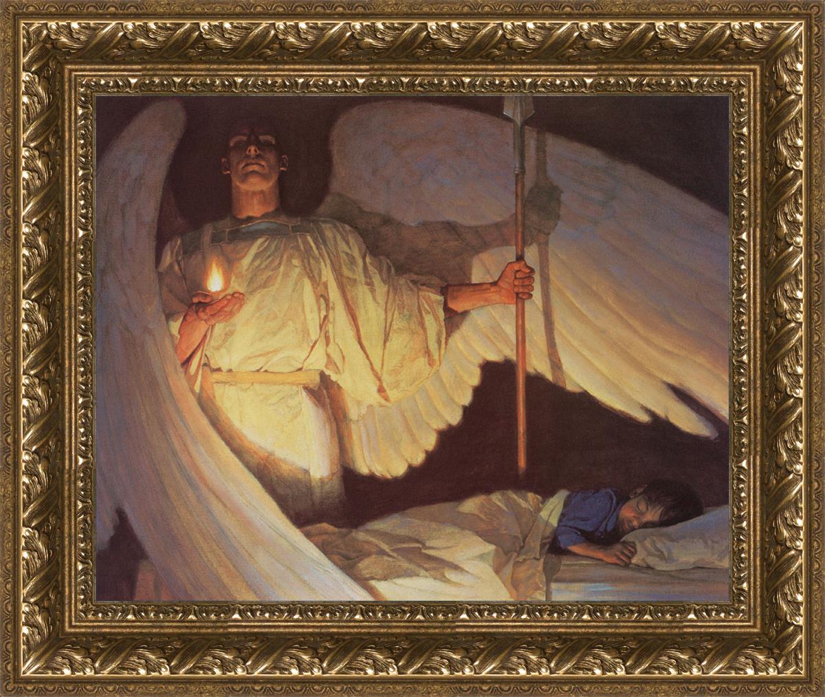 A powerful angel provides protection and cover for a sleeping and unaware child. The flame above the angel's right hand announces the presence of the Holy Spirit.