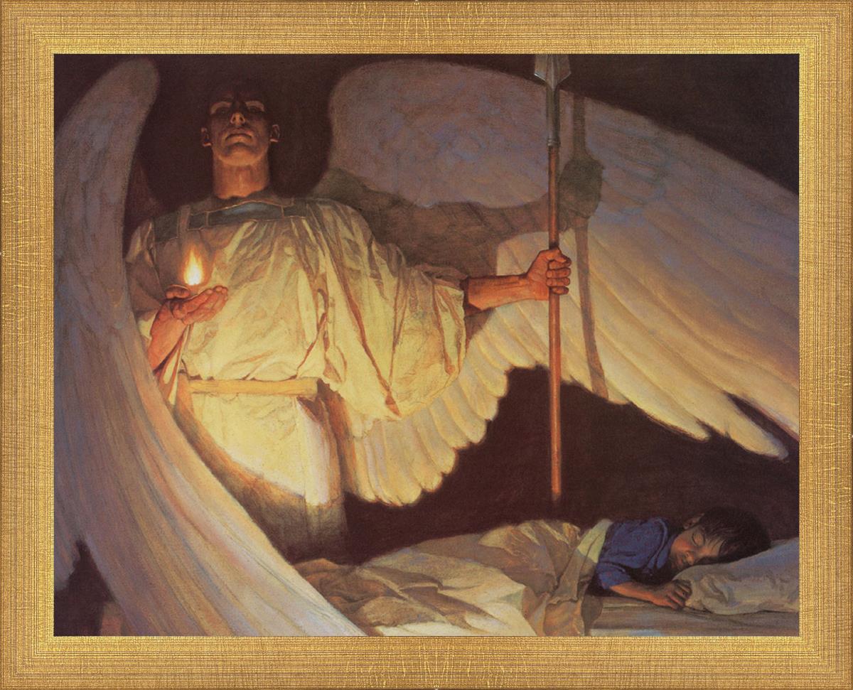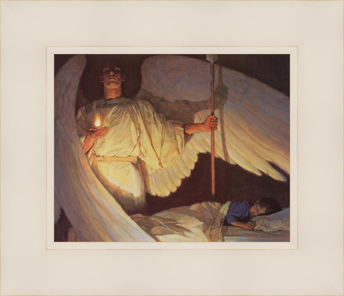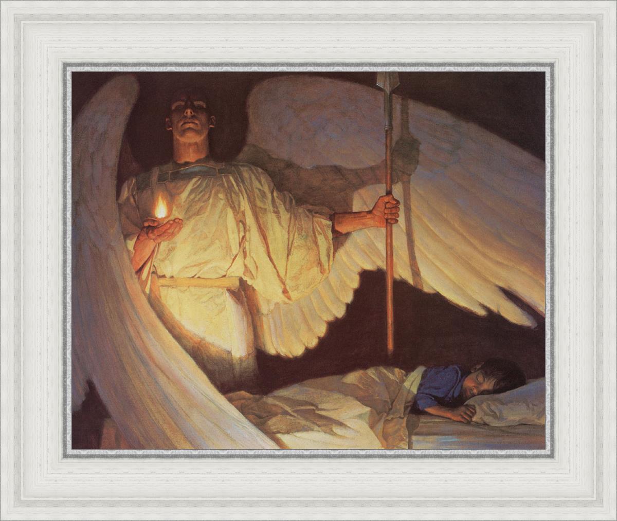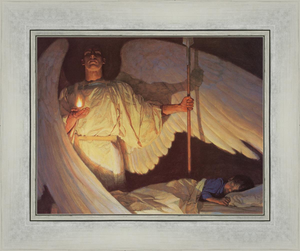A powerful angel provides protection and cover for a sleeping and unaware child. The flame above the angel's right hand announces the presence of the Holy Spirit.
