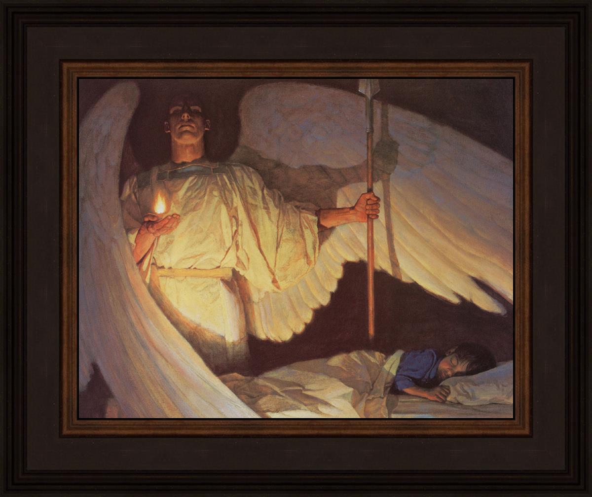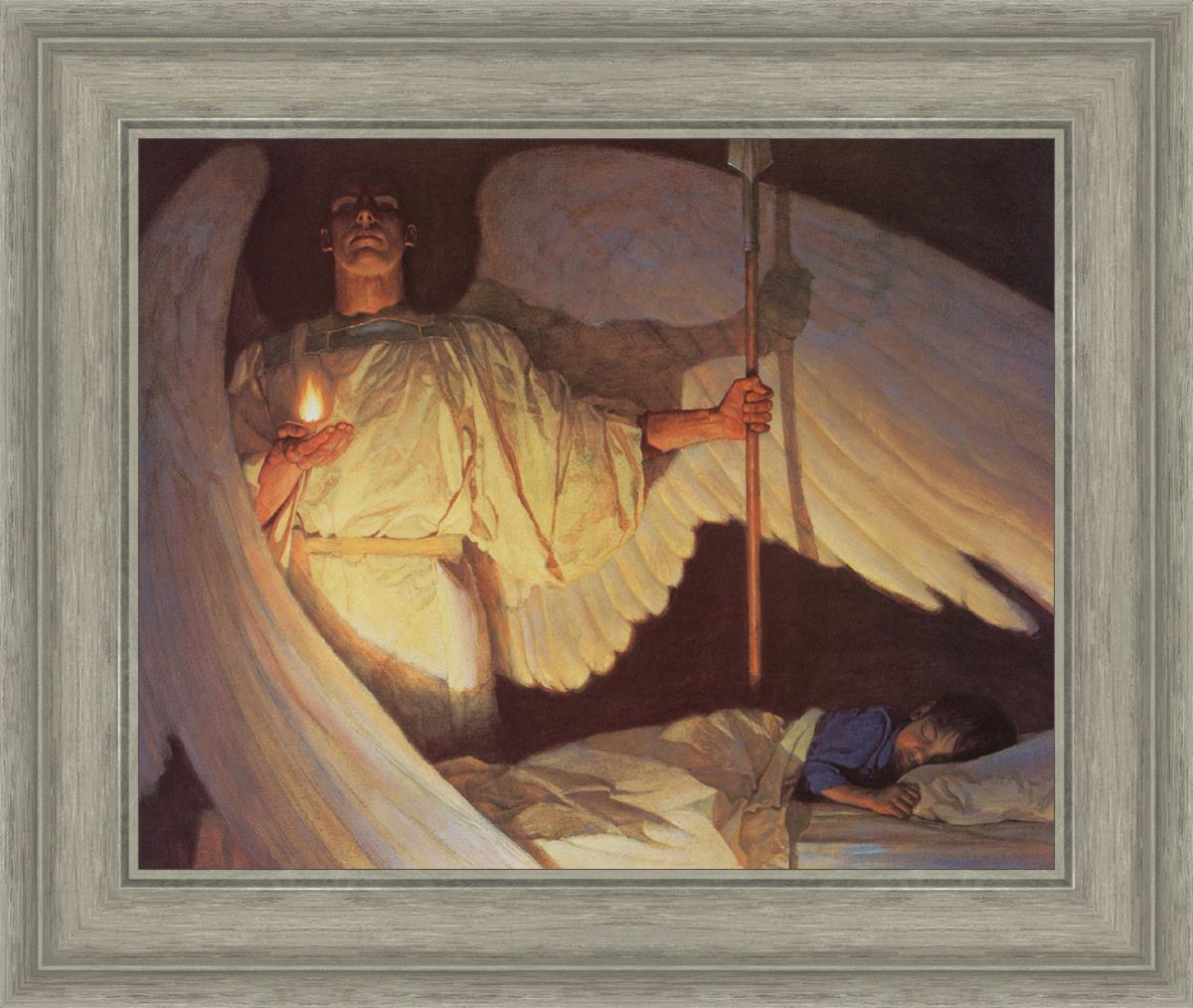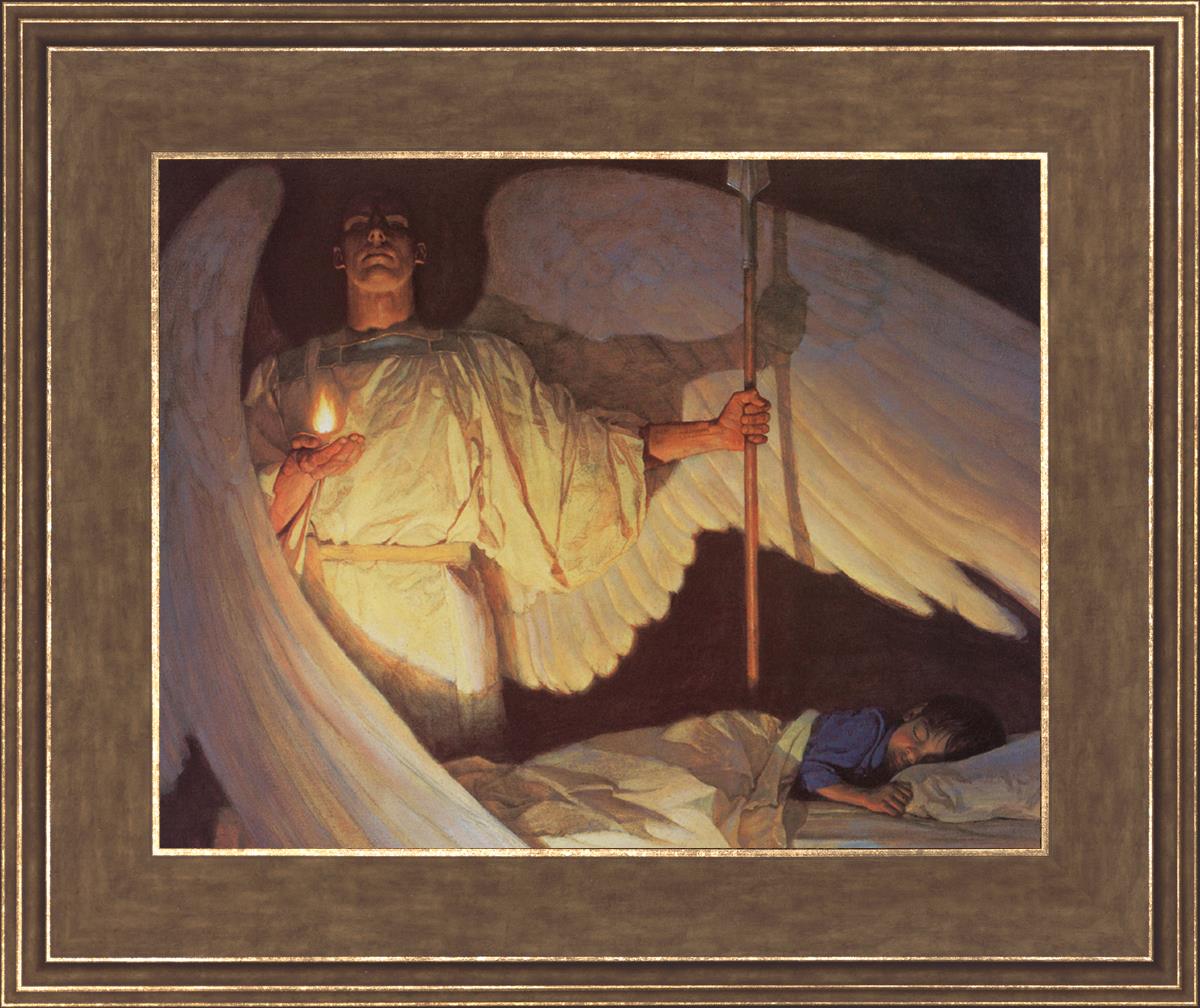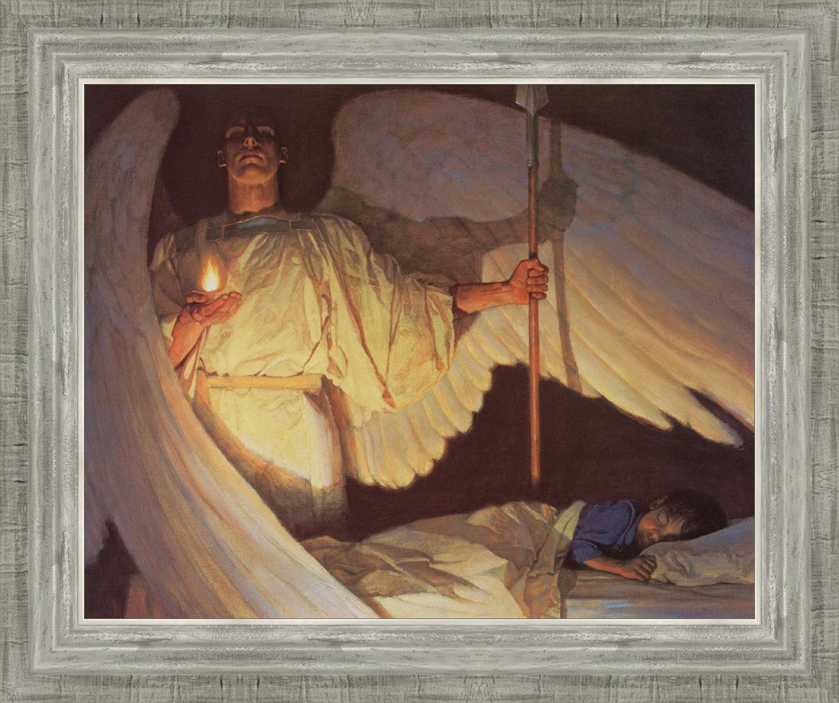 A powerful angel provides protection and cover for a sleeping and unaware child. The flame above the angel's right hand announces the presence of the Holy Spirit.
