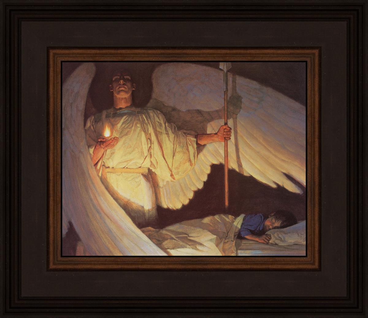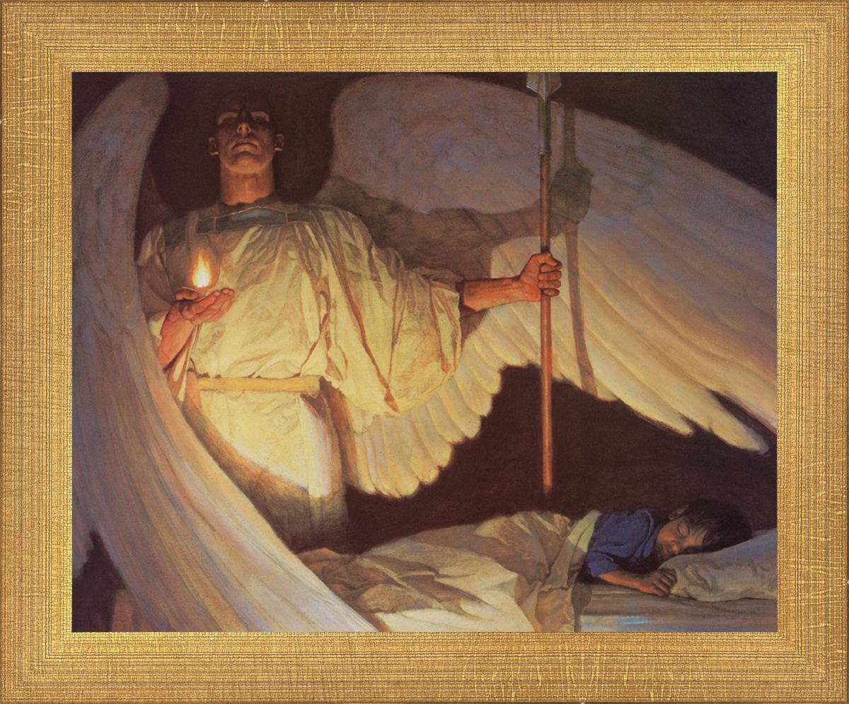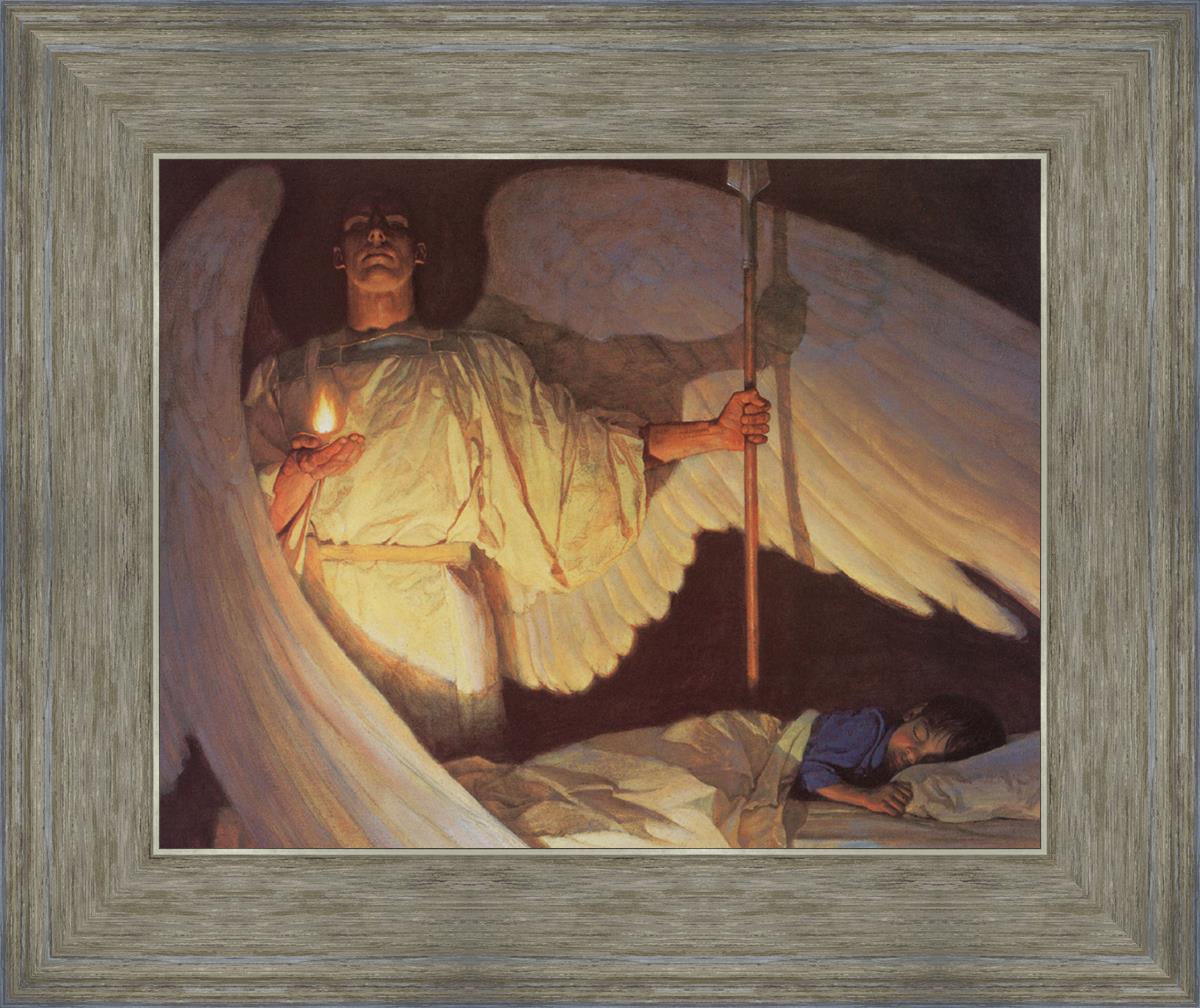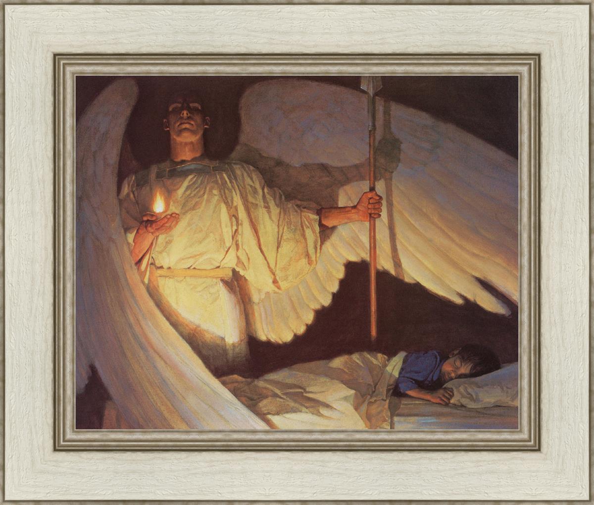A powerful angel provides protection and cover for a sleeping and unaware child. The flame above the angel's right hand announces the presence of the Holy Spirit.