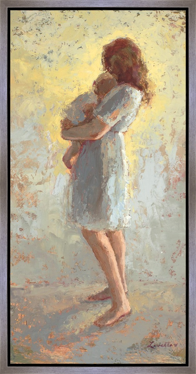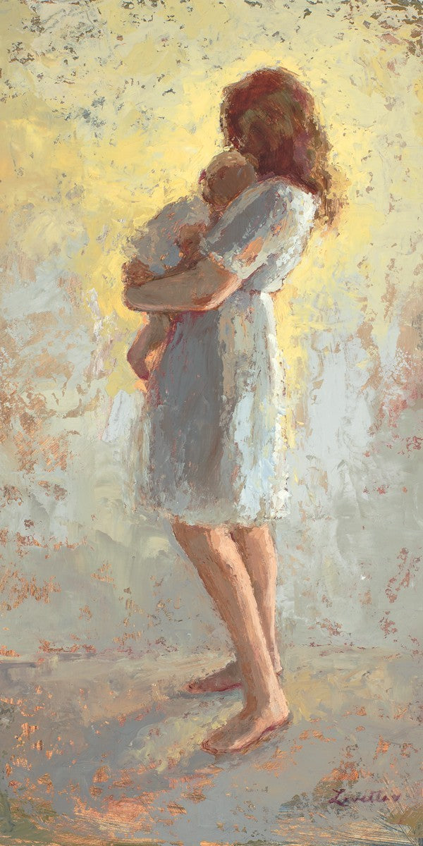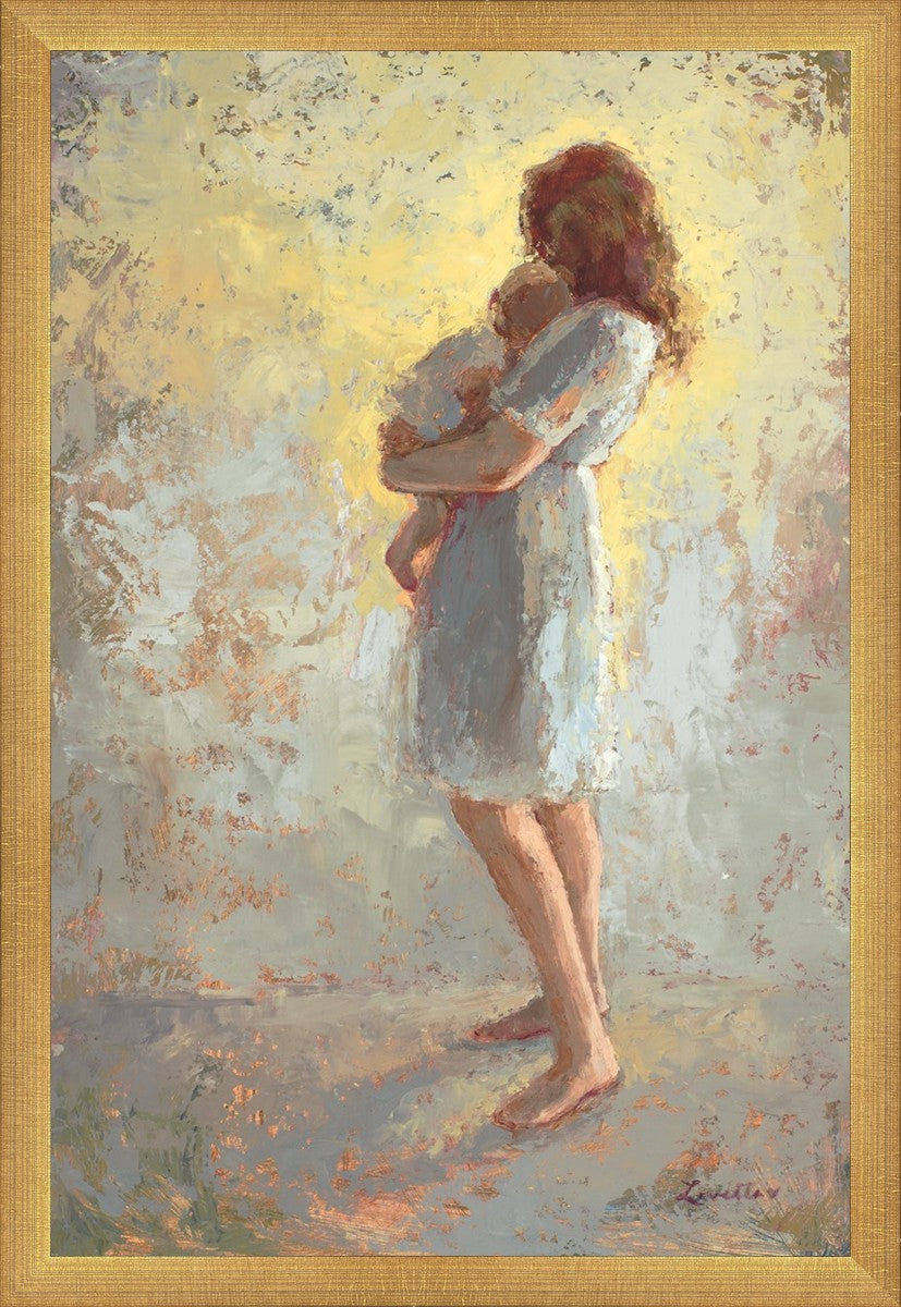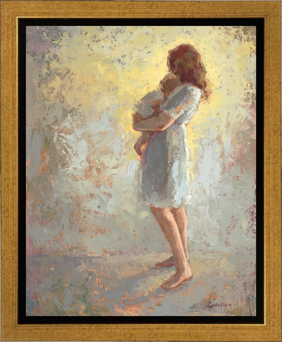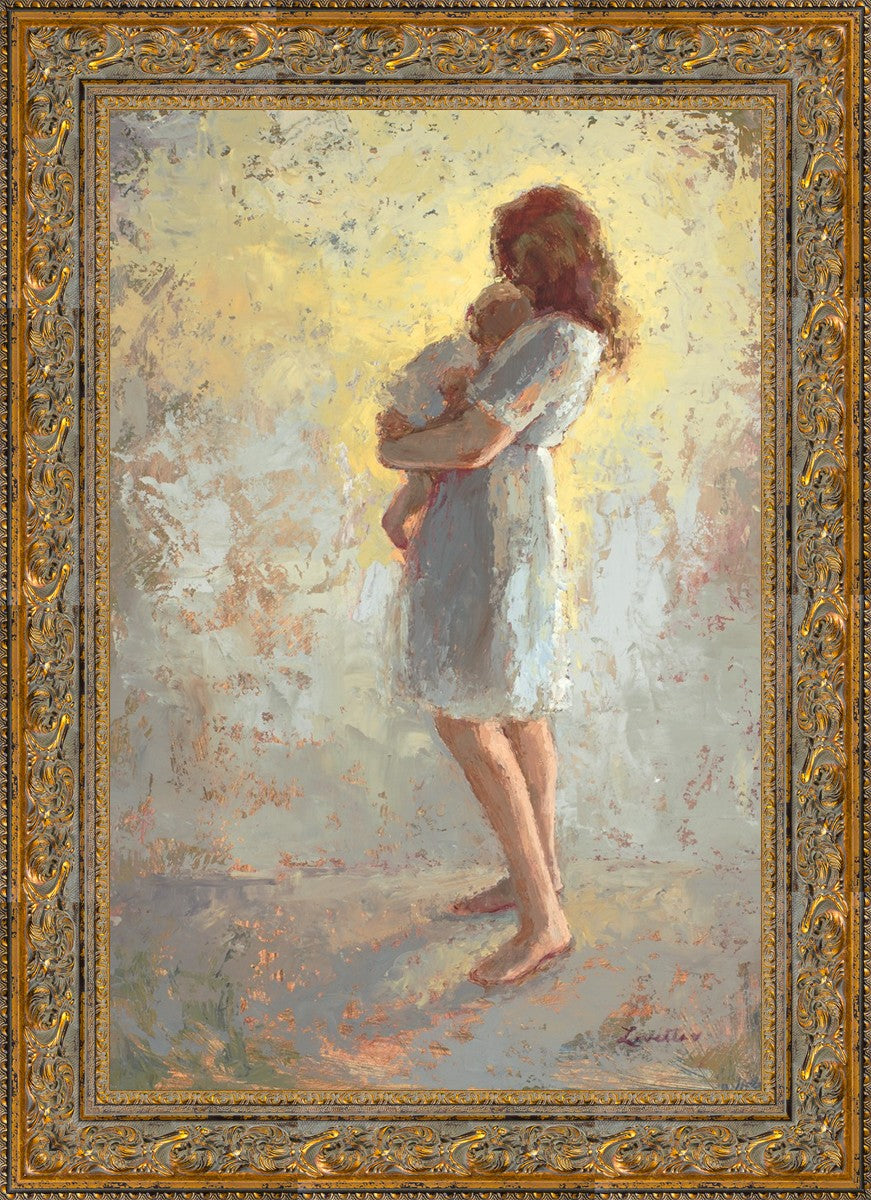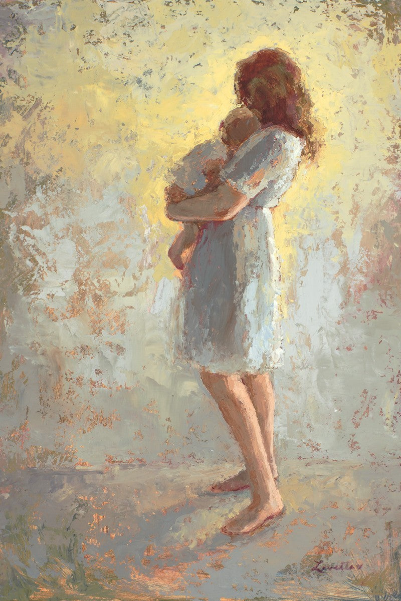 We Gather Sunshine by Lovetta Reyes Cairo beautifully portrays a mother tenderly holding her baby, radiating love and warmth. This touching painting captures the essence of motherhood, evoking feelings of joy, protection, and the precious bond between mother and child.