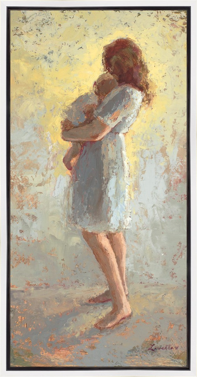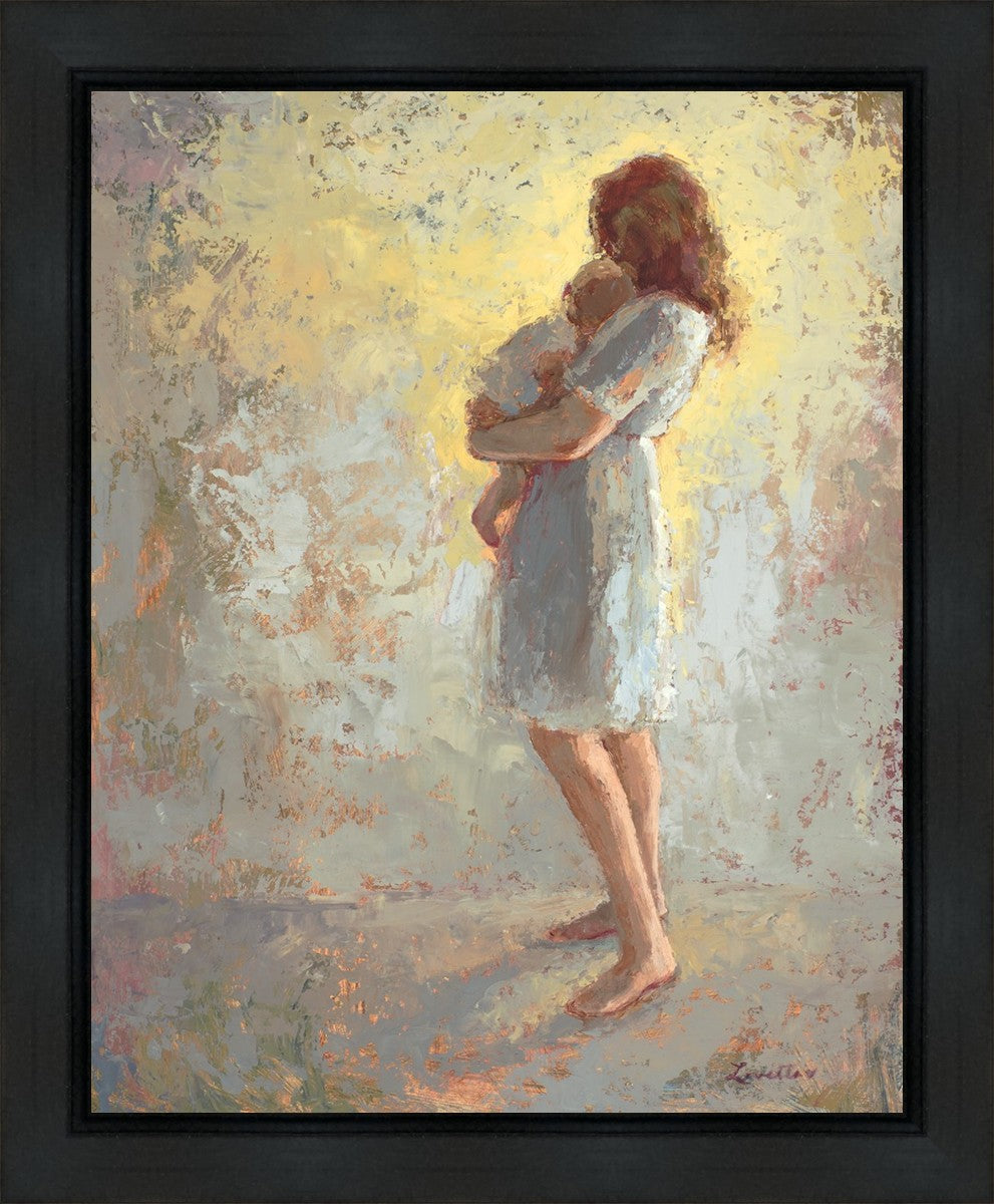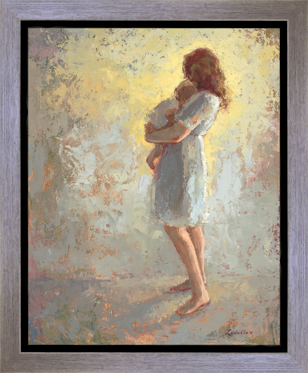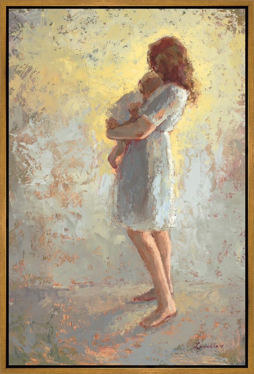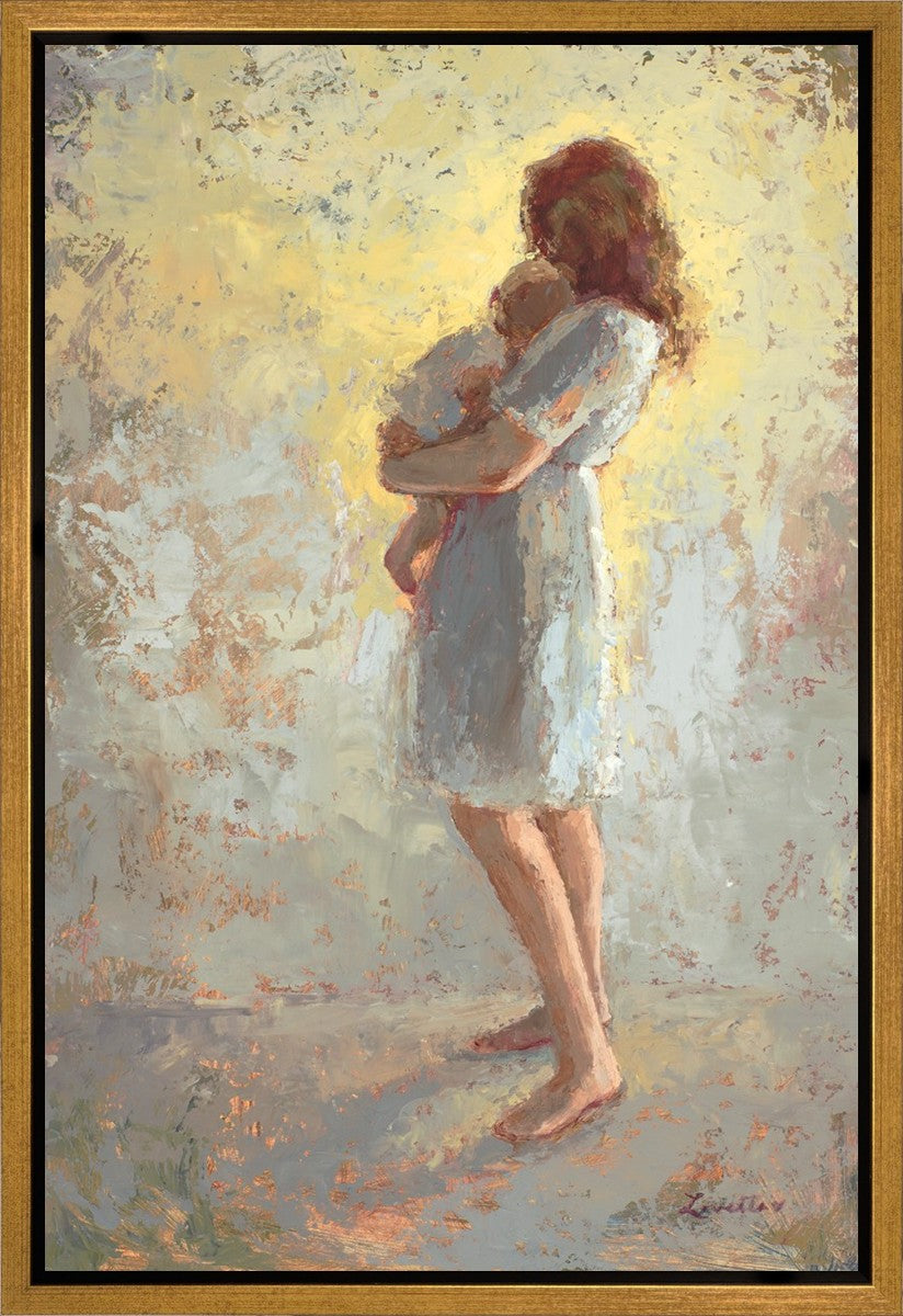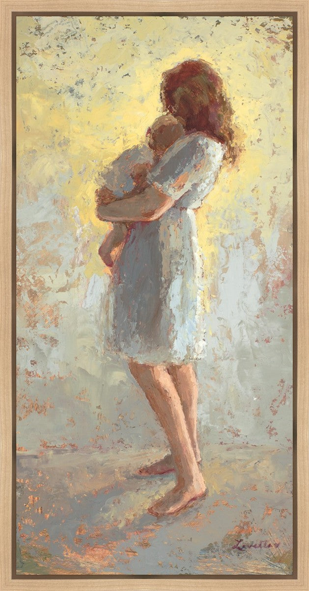 We Gather Sunshine by Lovetta Reyes Cairo beautifully portrays a mother tenderly holding her baby, radiating love and warmth. This touching painting captures the essence of motherhood, evoking feelings of joy, protection, and the precious bond between mother and child.