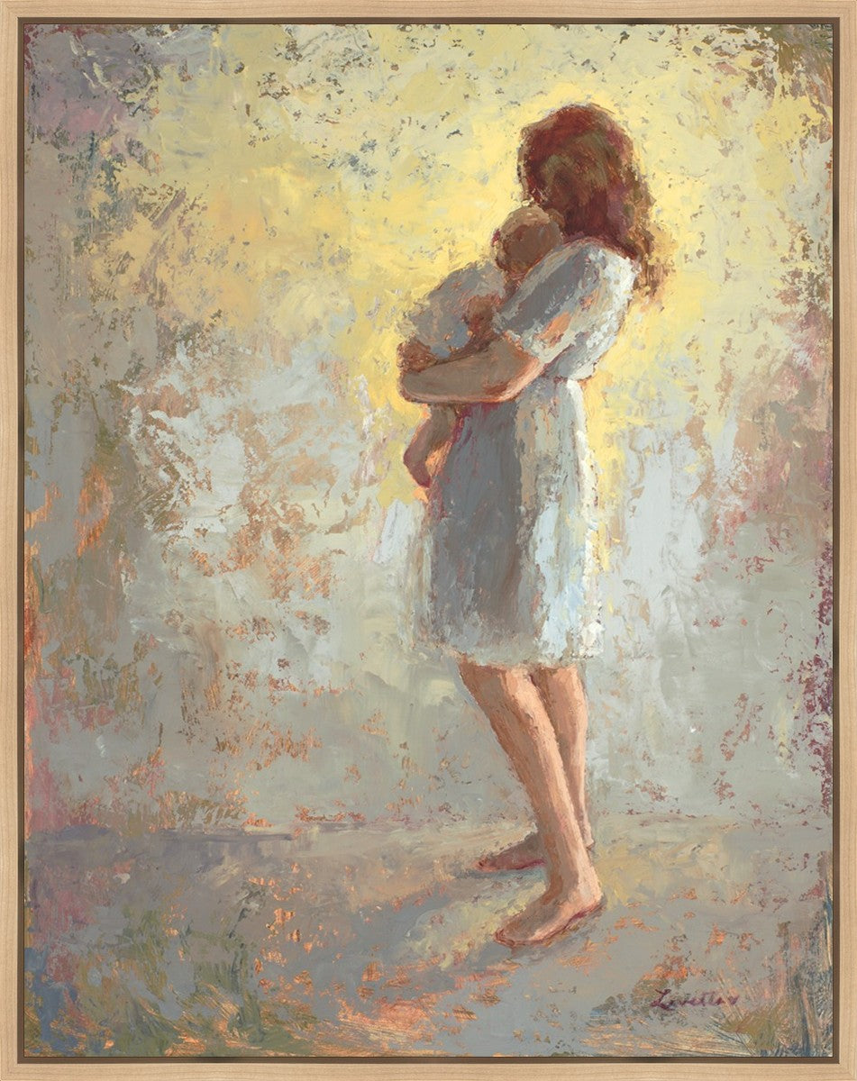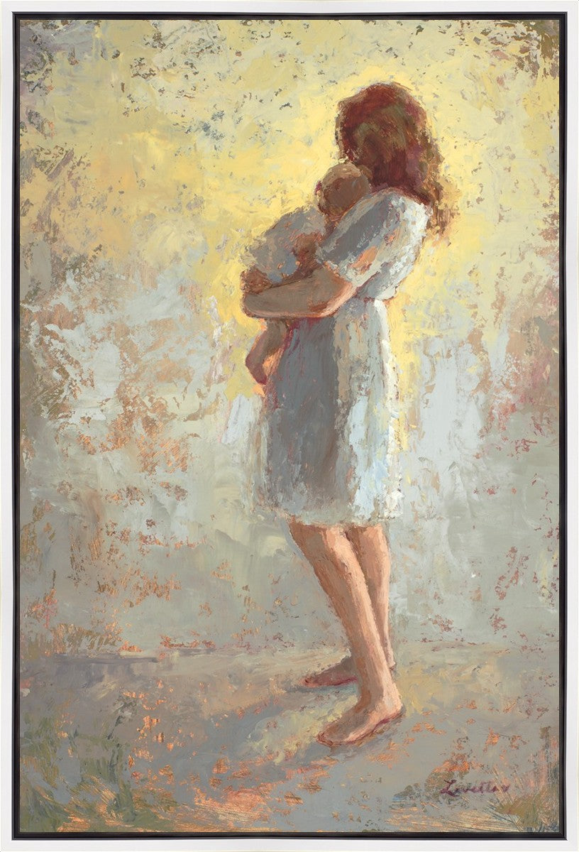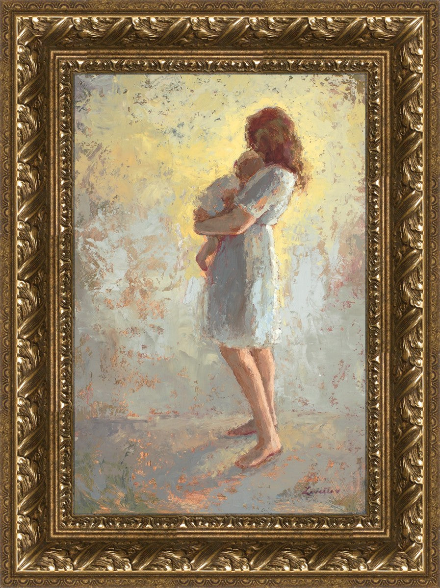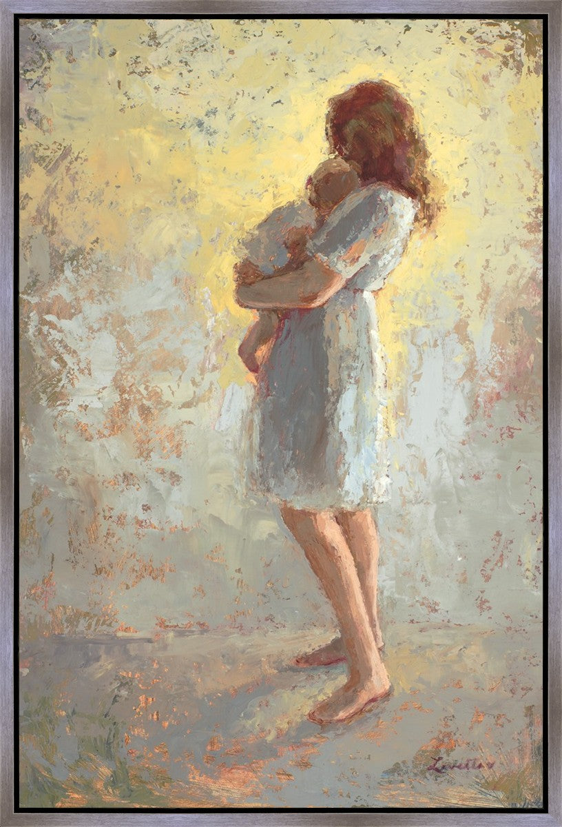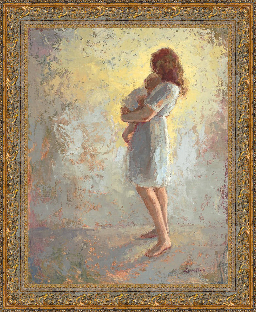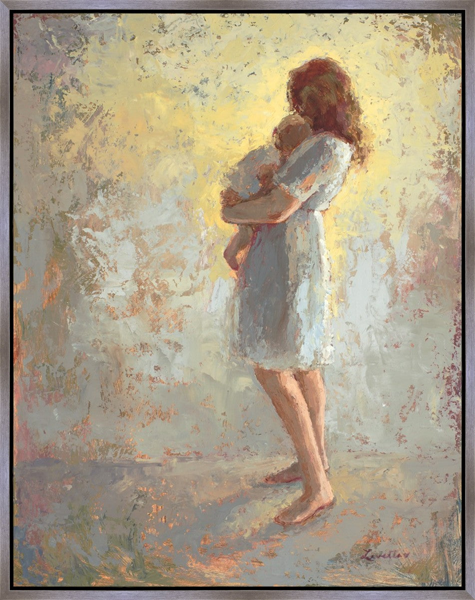 We Gather Sunshine by Lovetta Reyes Cairo beautifully portrays a mother tenderly holding her baby, radiating love and warmth. This touching painting captures the essence of motherhood, evoking feelings of joy, protection, and the precious bond between mother and child.