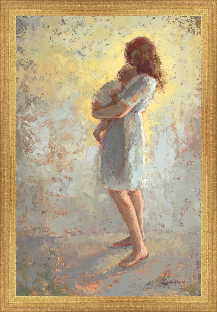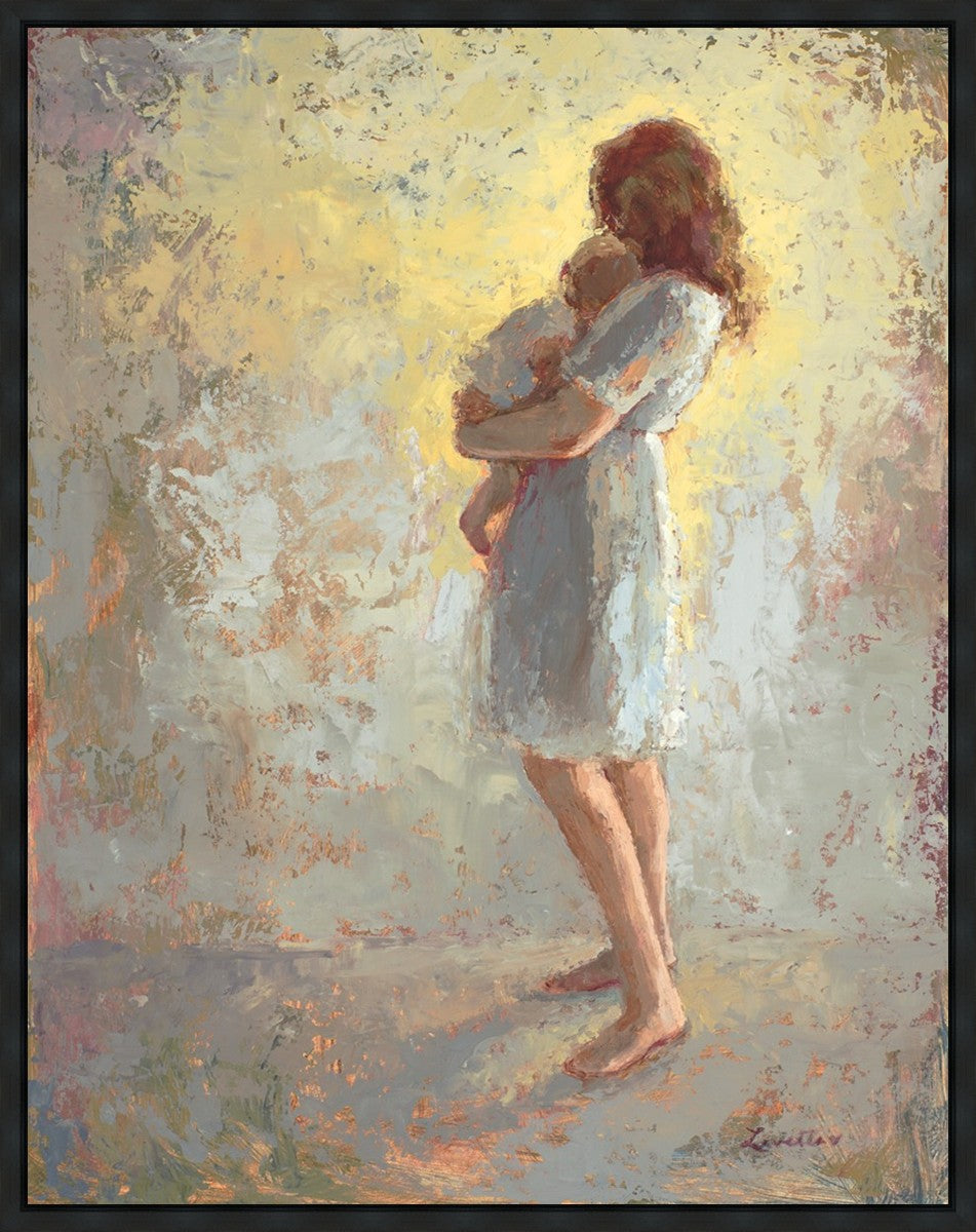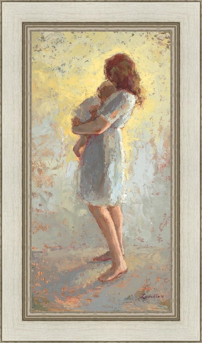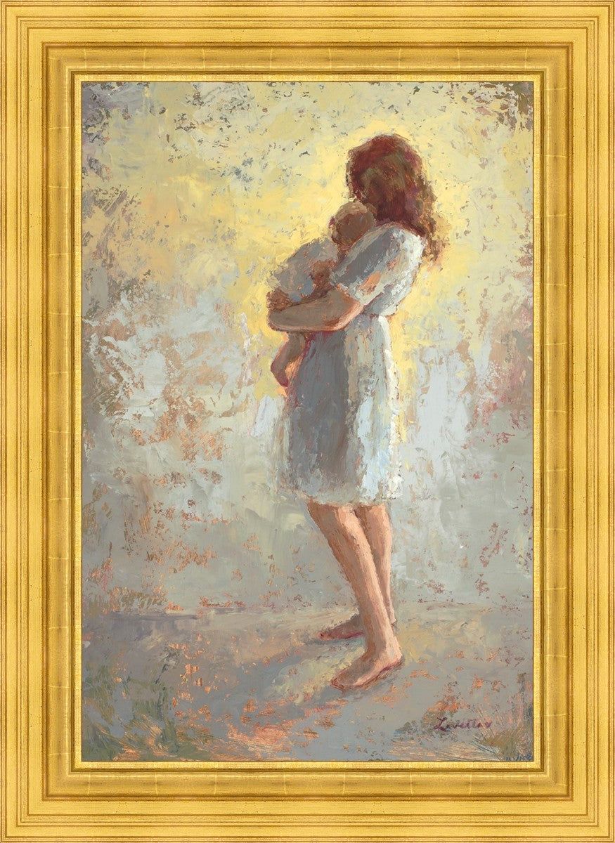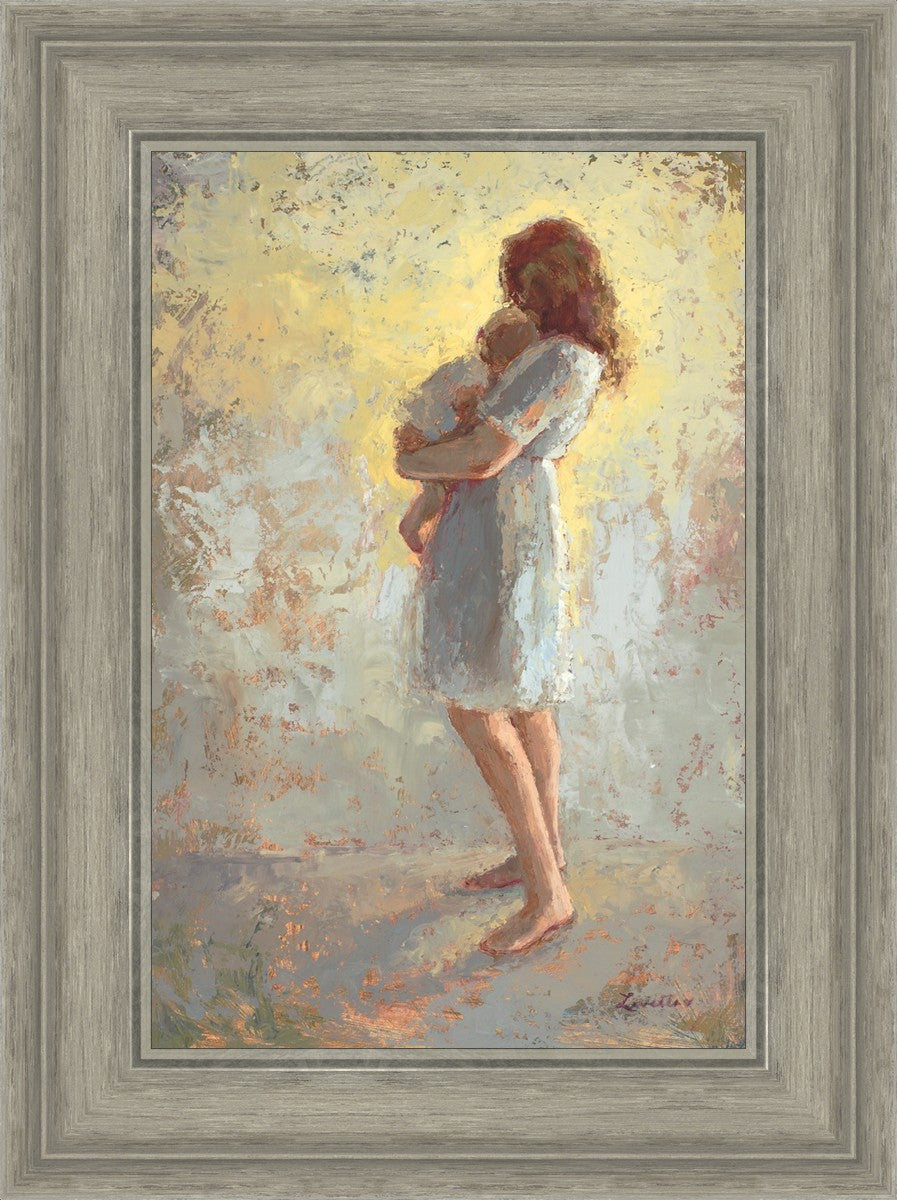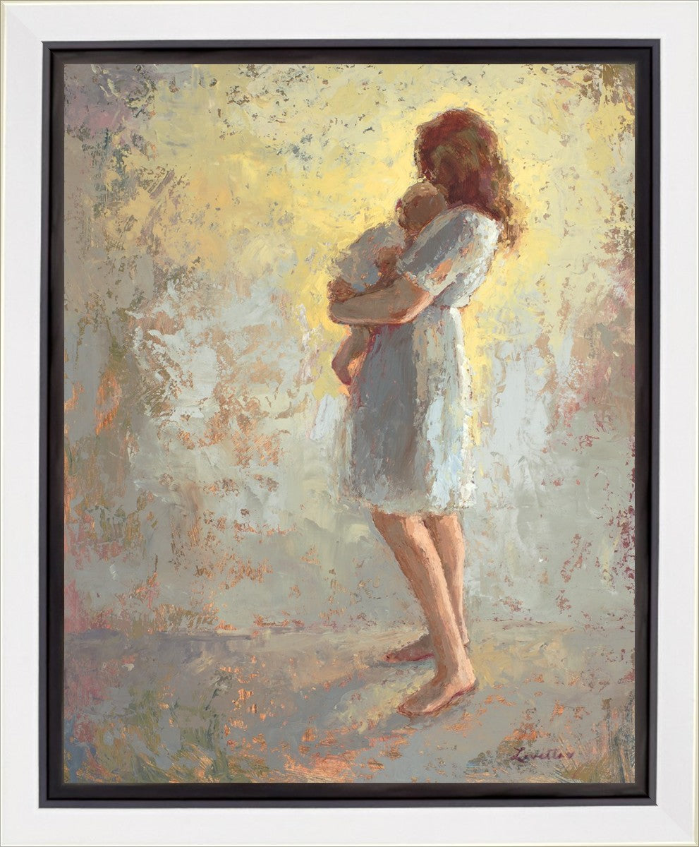 We Gather Sunshine by Lovetta Reyes Cairo beautifully portrays a mother tenderly holding her baby, radiating love and warmth. This touching painting captures the essence of motherhood, evoking feelings of joy, protection, and the precious bond between mother and child.