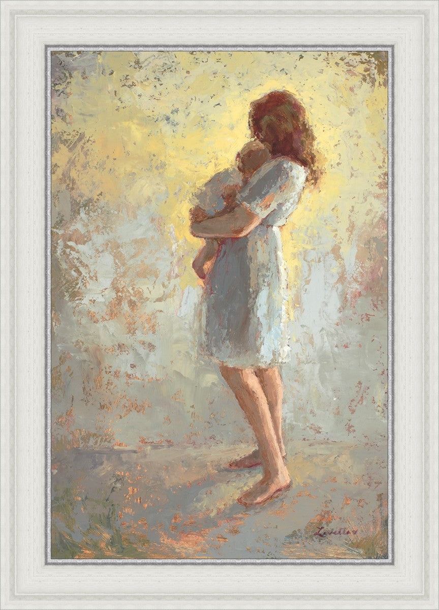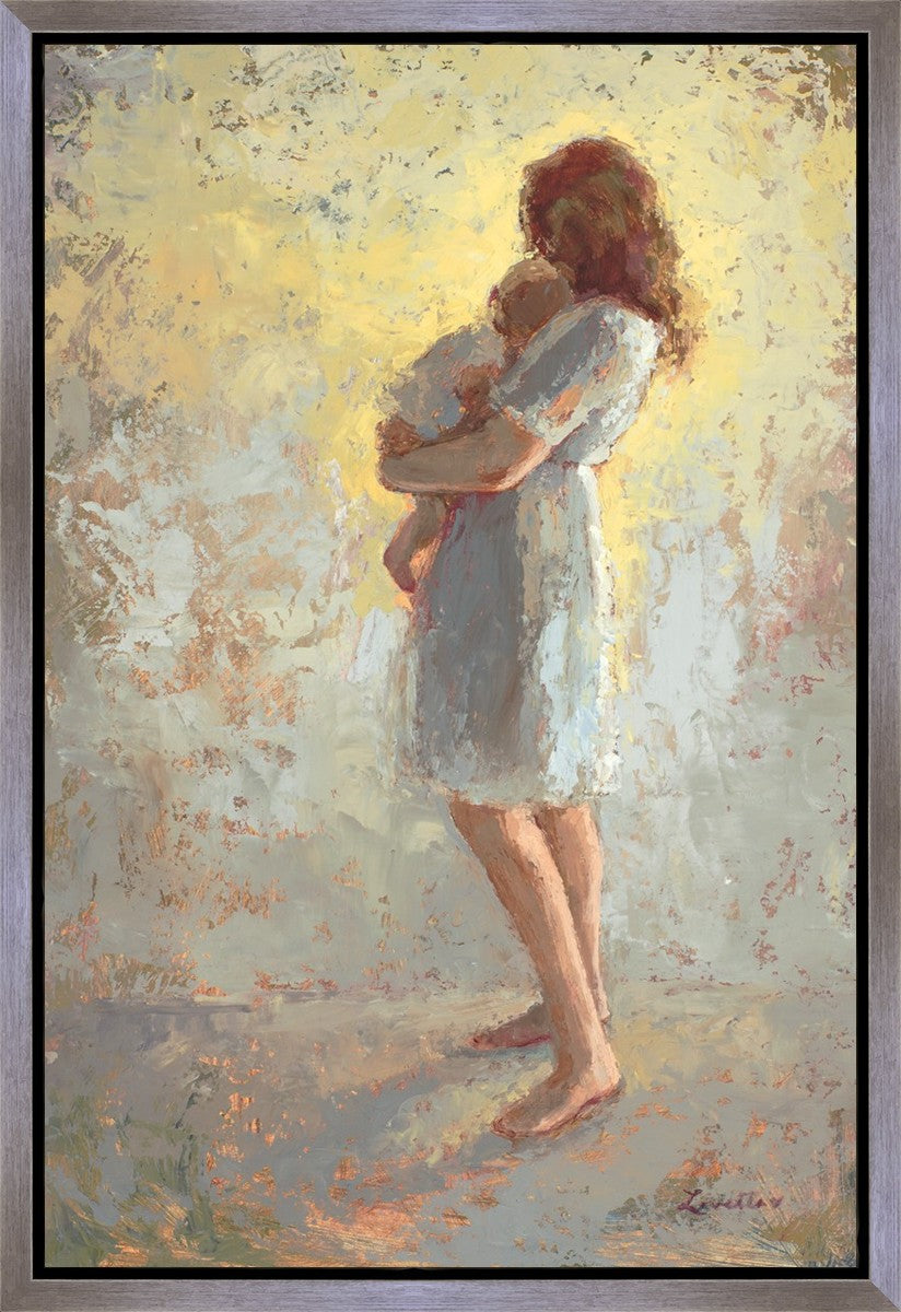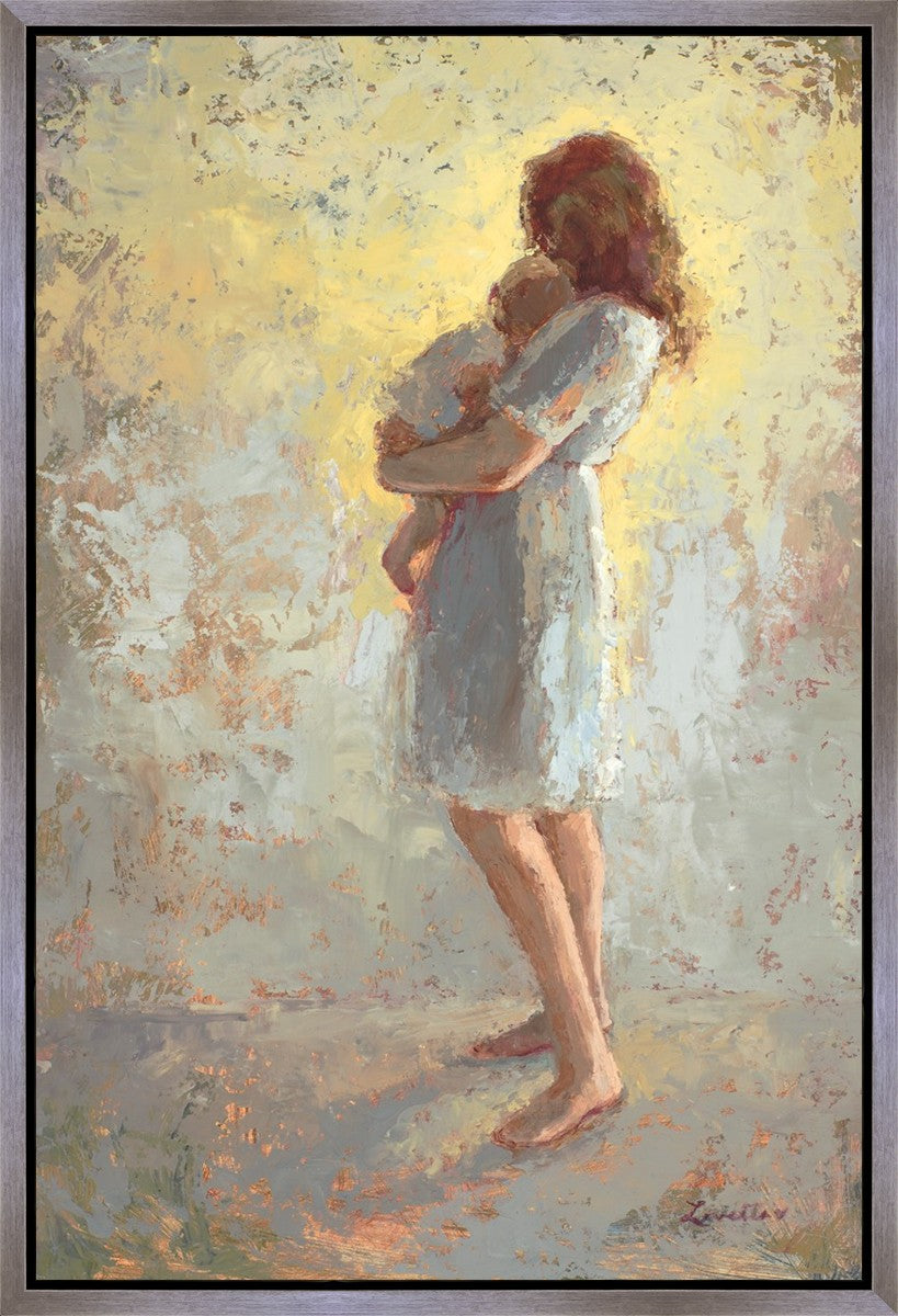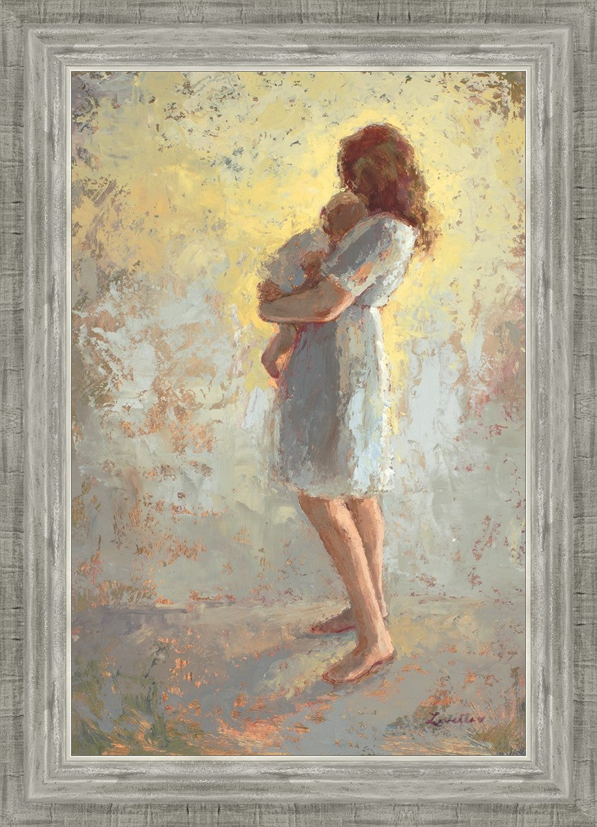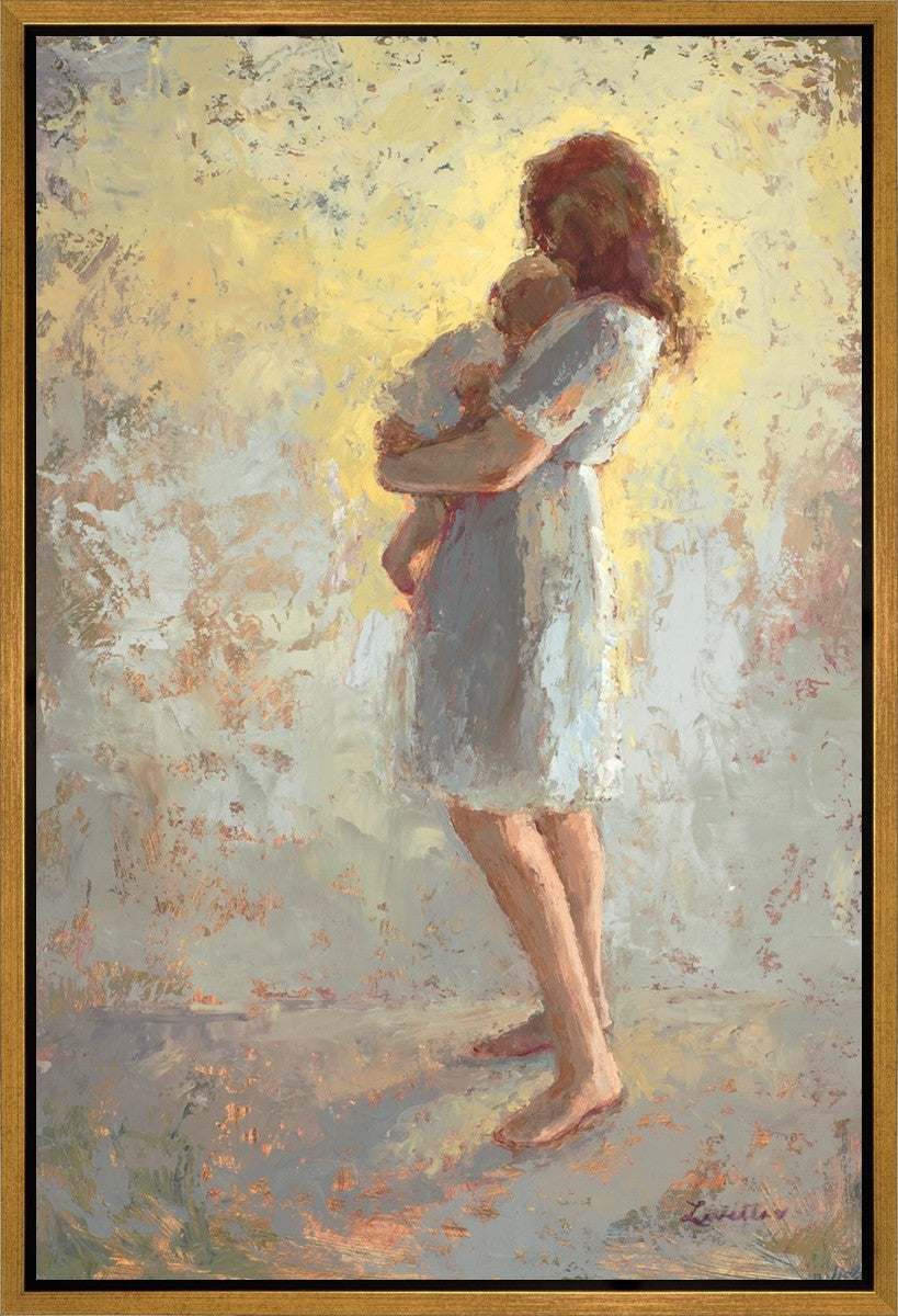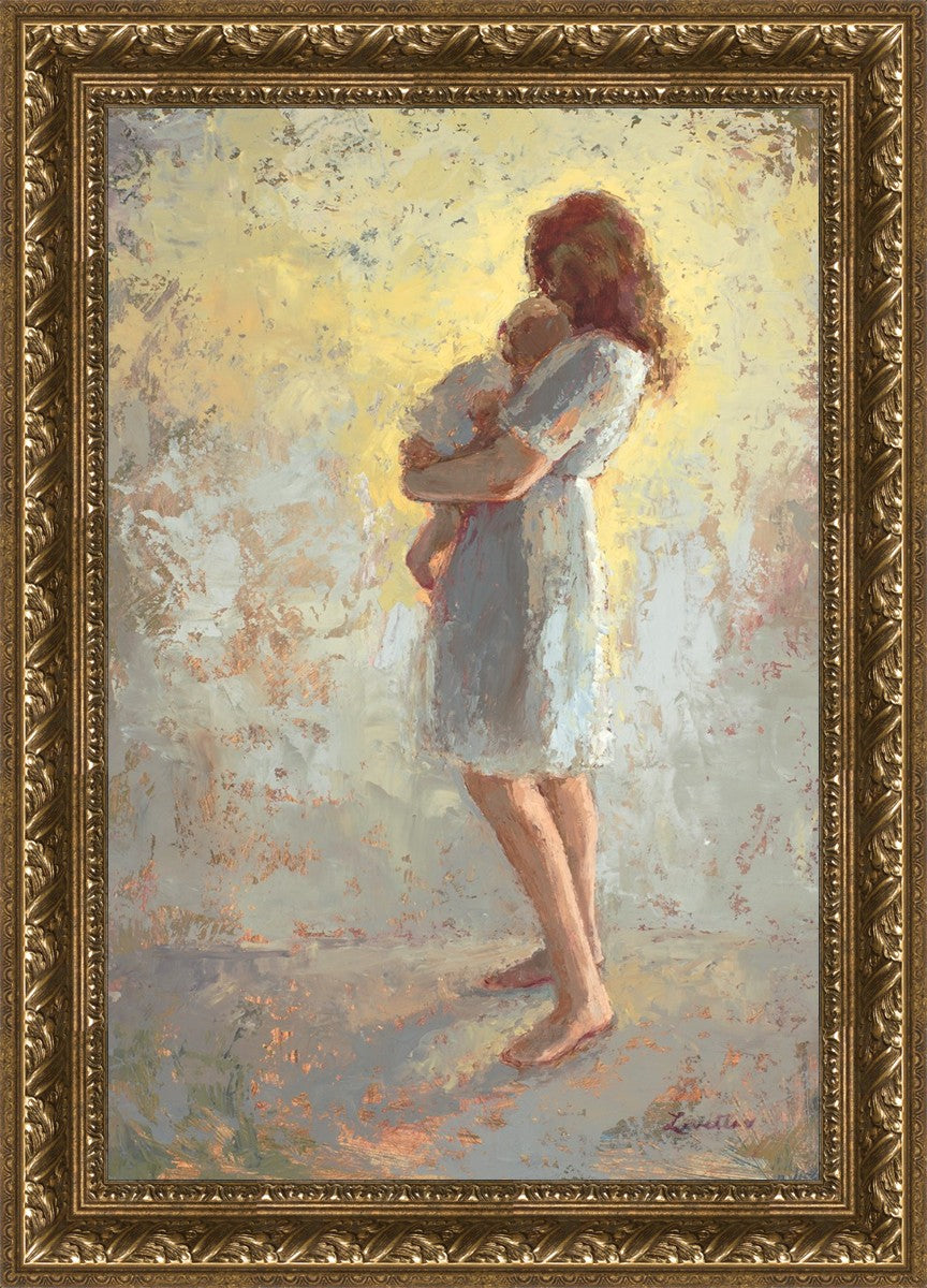 We Gather Sunshine by Lovetta Reyes Cairo beautifully portrays a mother tenderly holding her baby, radiating love and warmth. This touching painting captures the essence of motherhood, evoking feelings of joy, protection, and the precious bond between mother and child.