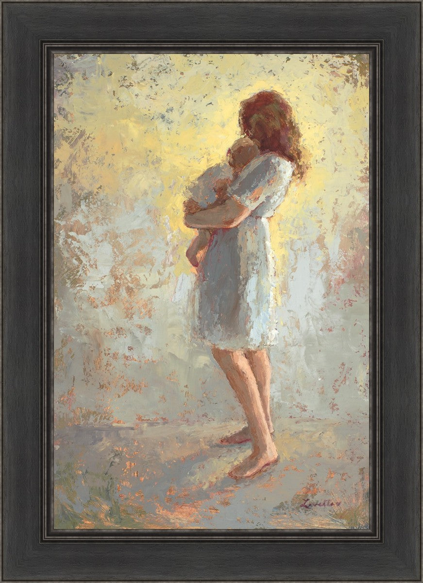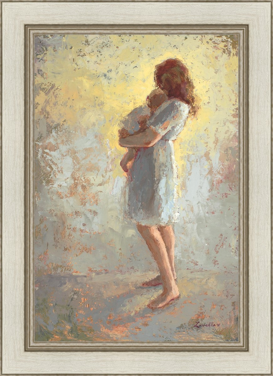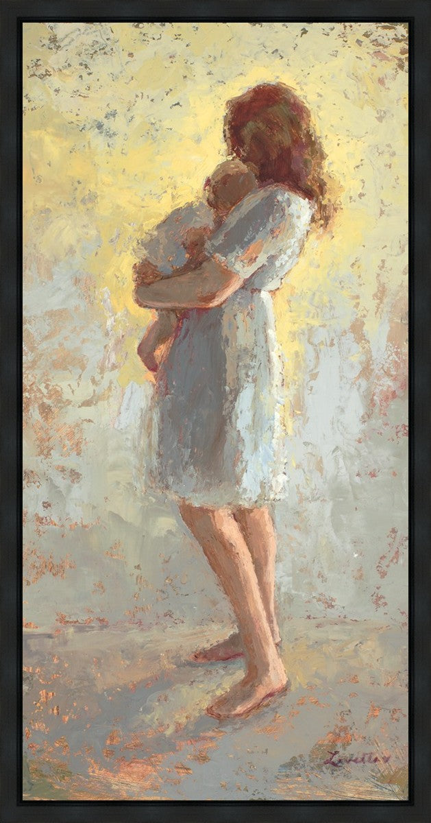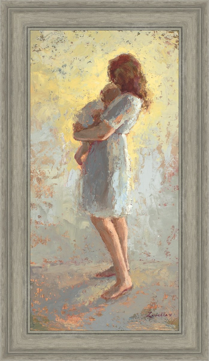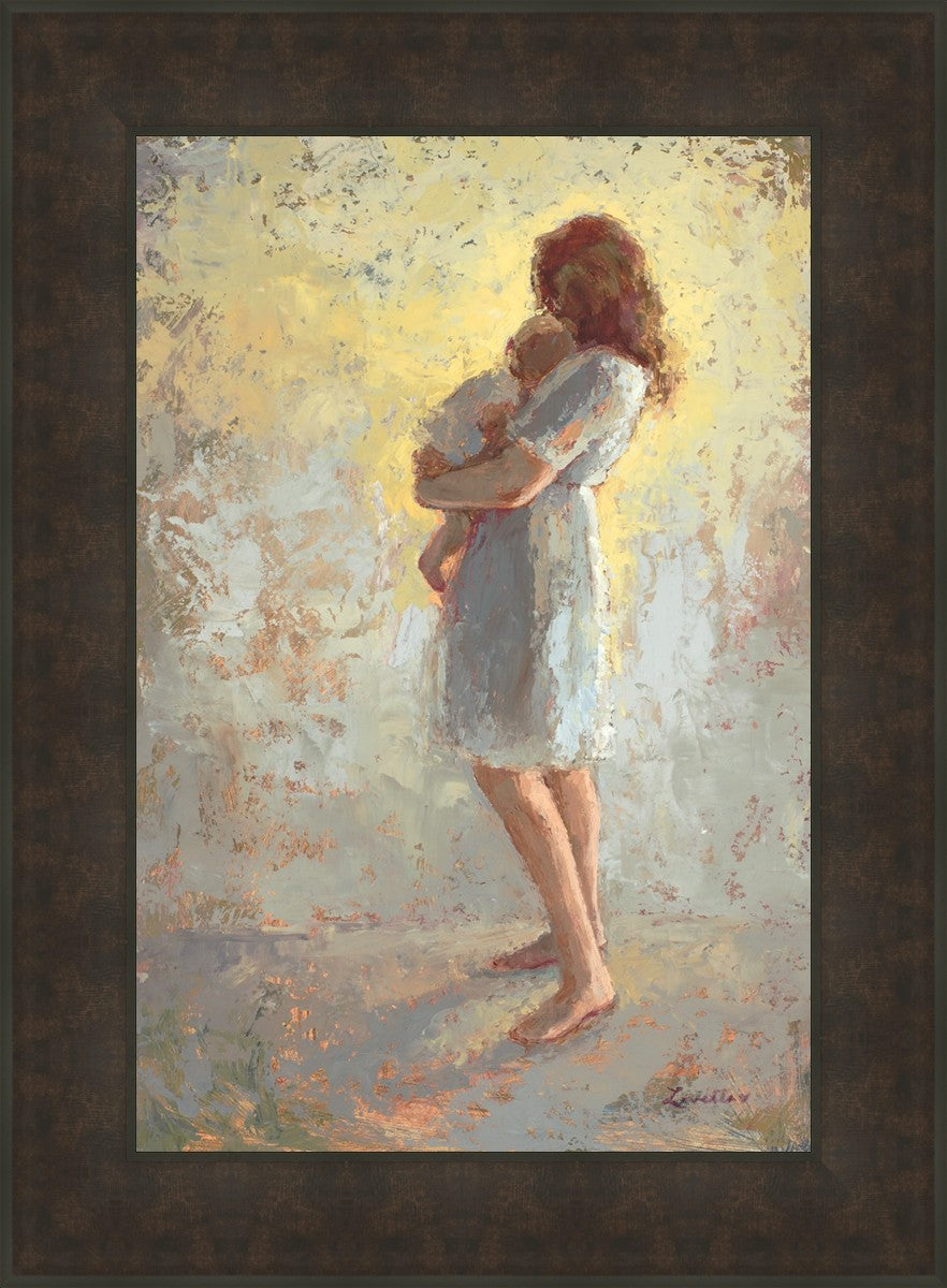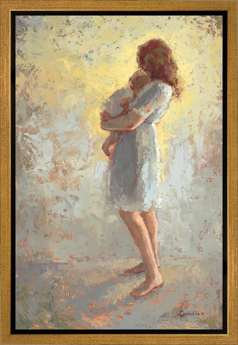 We Gather Sunshine by Lovetta Reyes Cairo beautifully portrays a mother tenderly holding her baby, radiating love and warmth. This touching painting captures the essence of motherhood, evoking feelings of joy, protection, and the precious bond between mother and child.