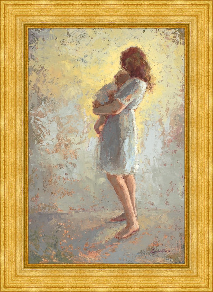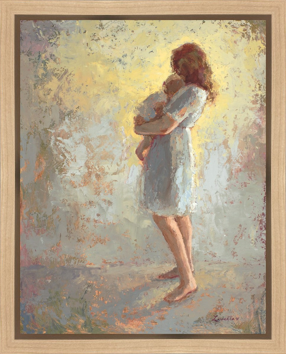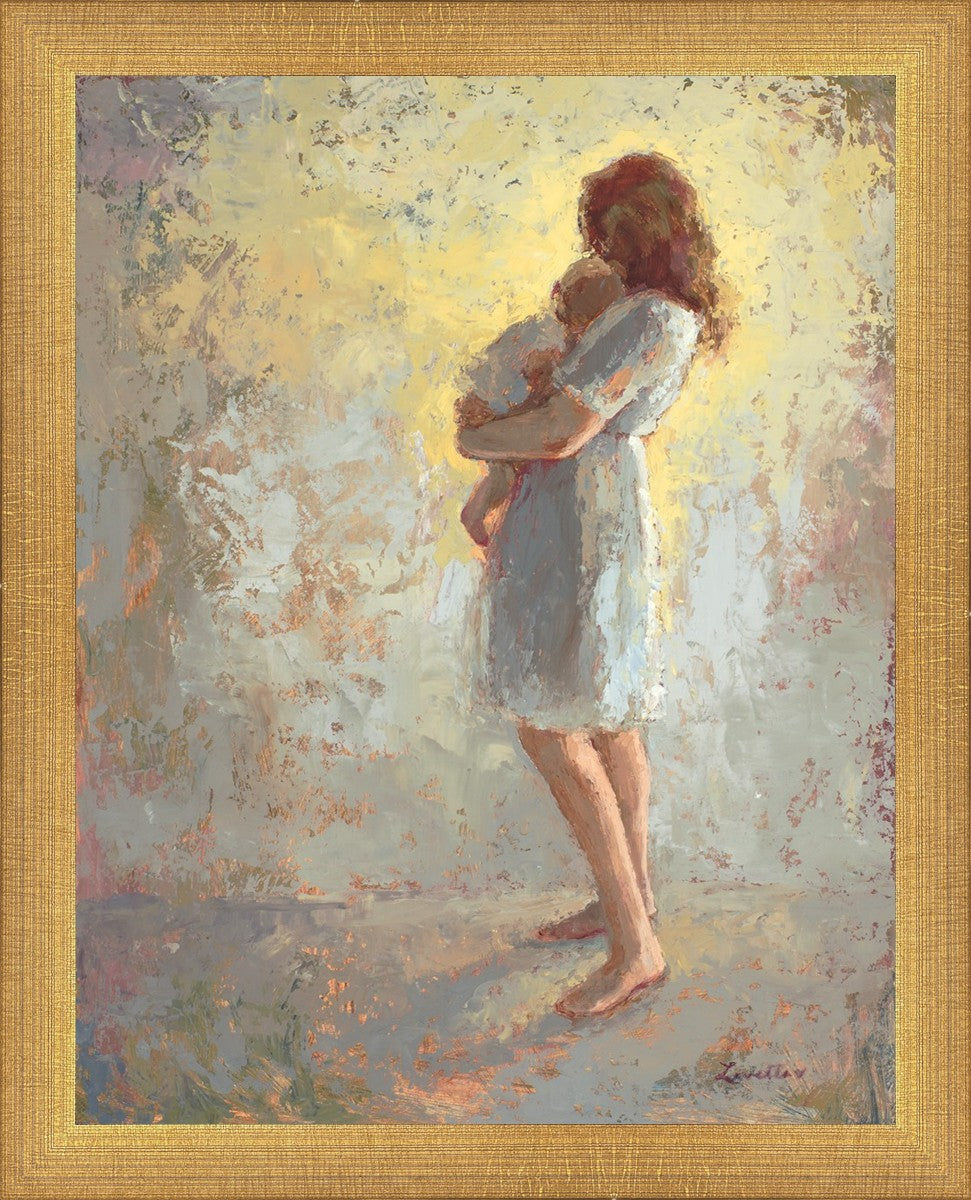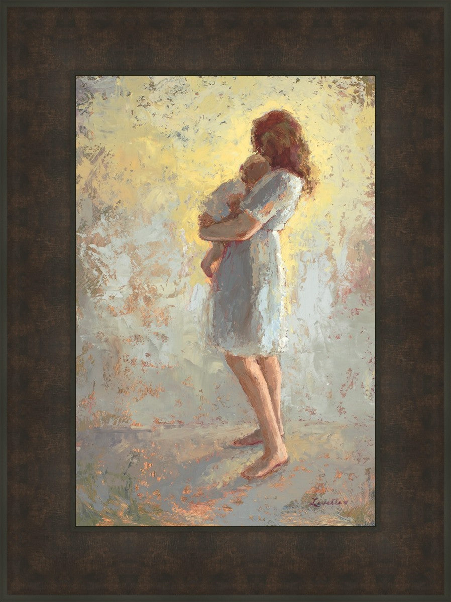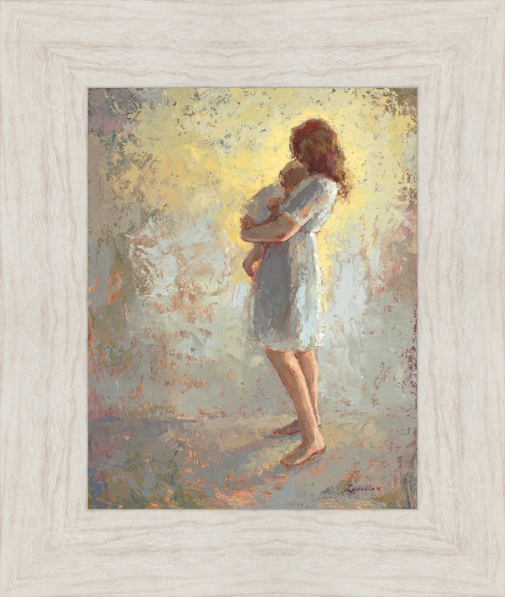 We Gather Sunshine by Lovetta Reyes Cairo beautifully portrays a mother tenderly holding her baby, radiating love and warmth. This touching painting captures the essence of motherhood, evoking feelings of joy, protection, and the precious bond between mother and child.