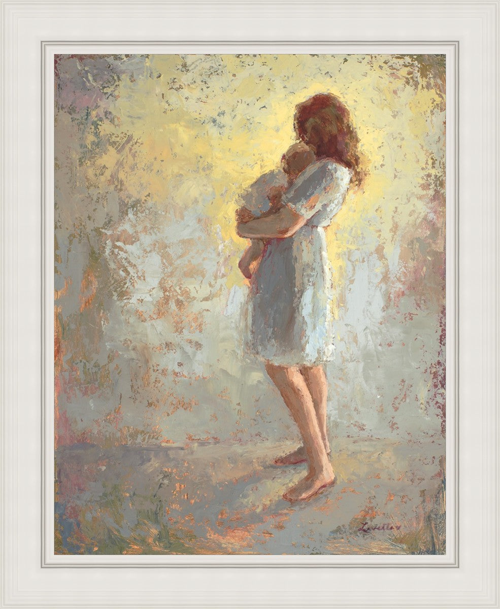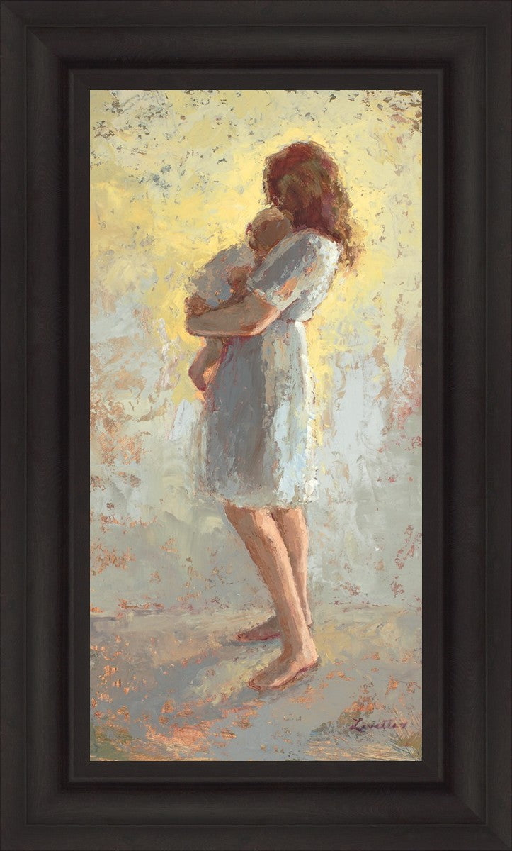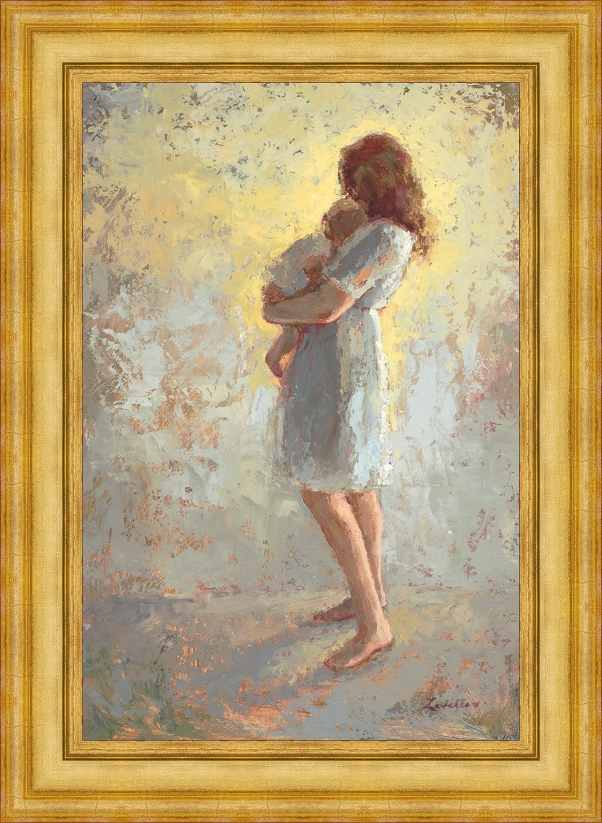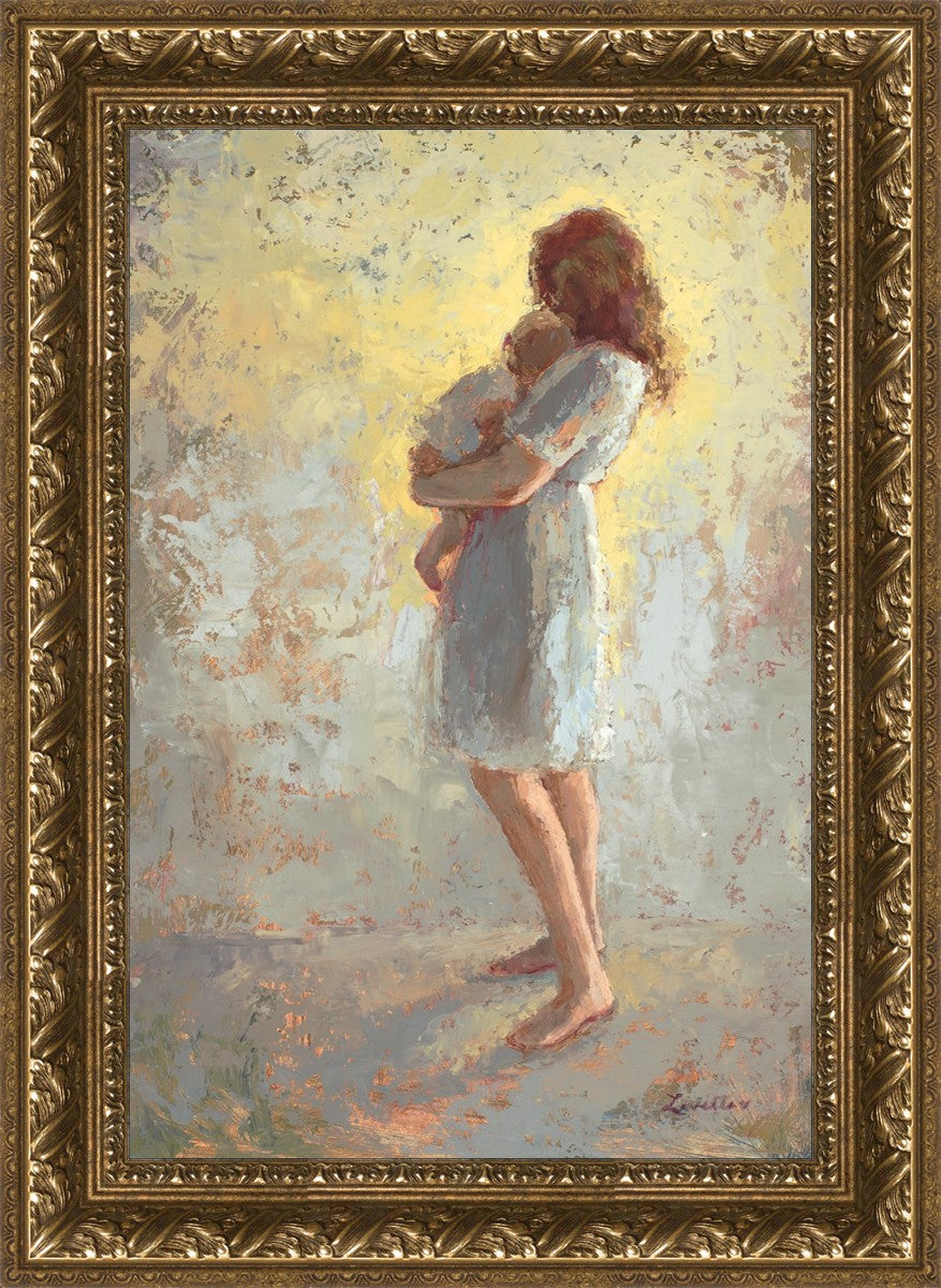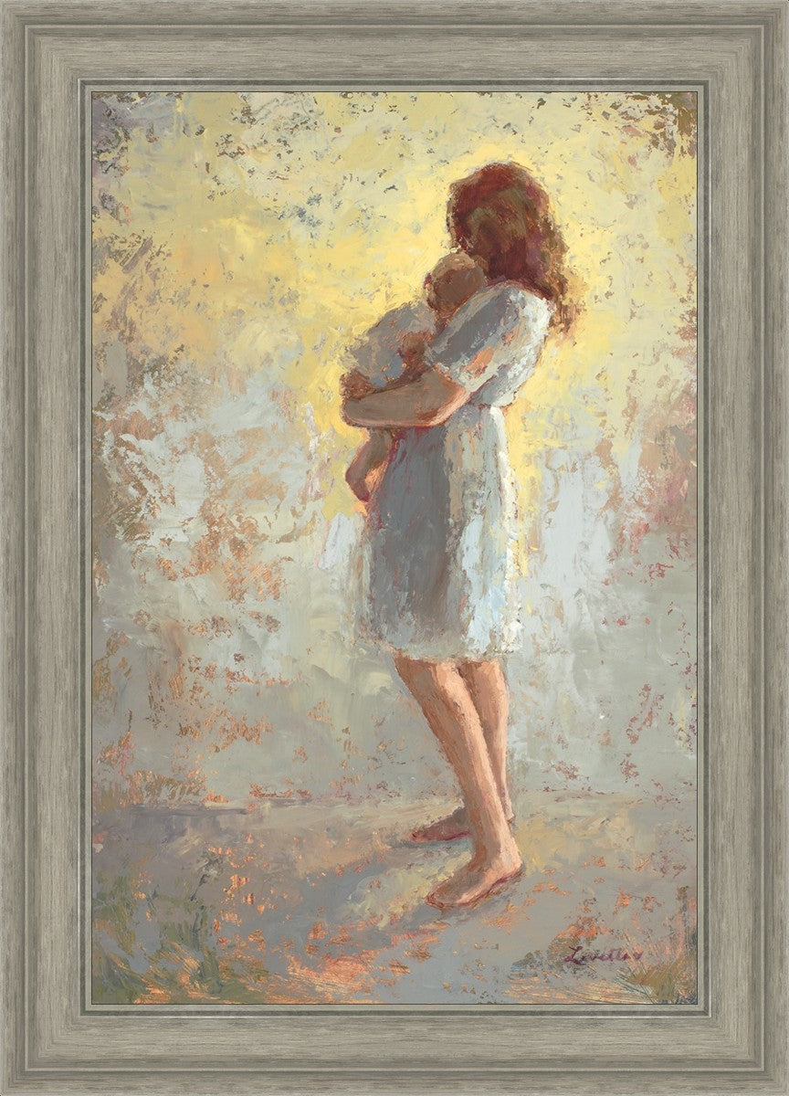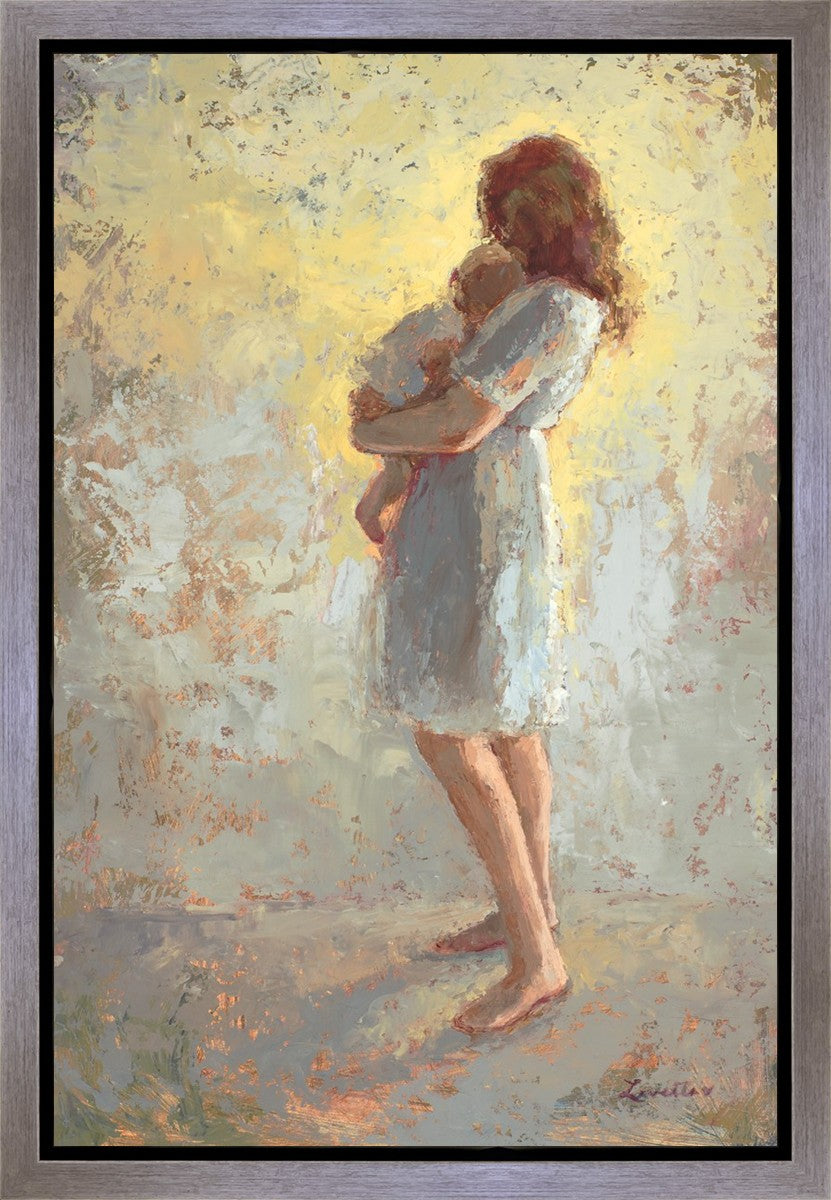 We Gather Sunshine by Lovetta Reyes Cairo beautifully portrays a mother tenderly holding her baby, radiating love and warmth. This touching painting captures the essence of motherhood, evoking feelings of joy, protection, and the precious bond between mother and child.
