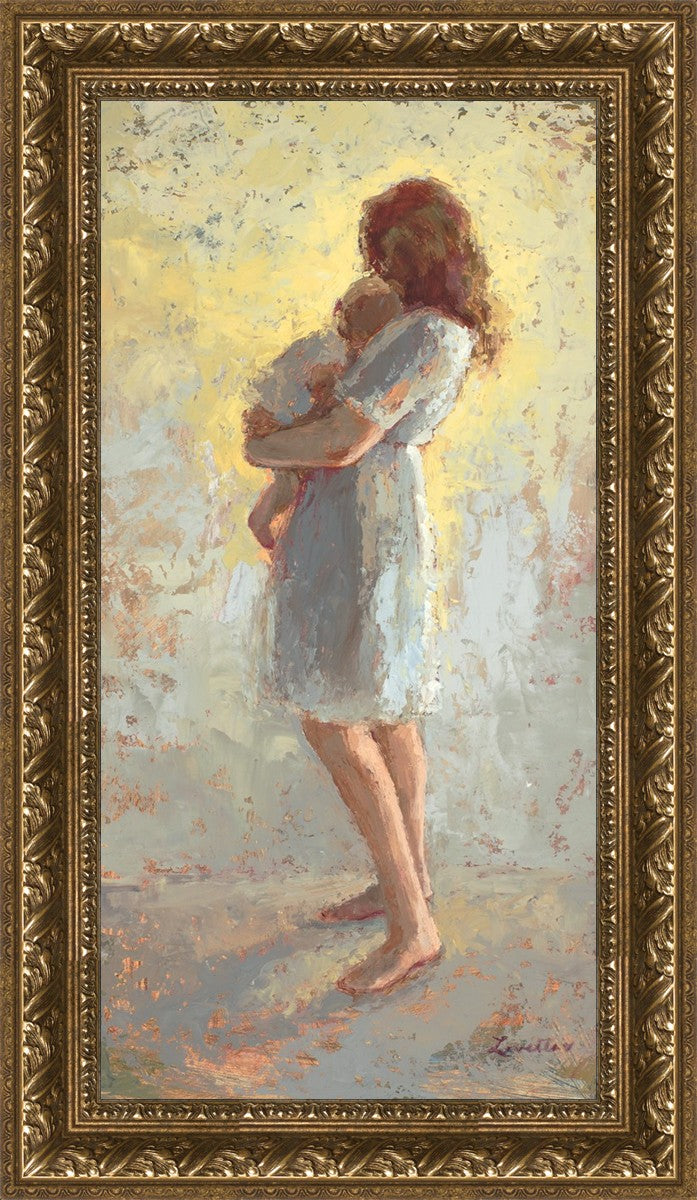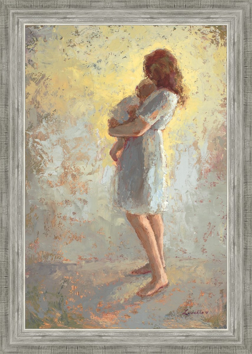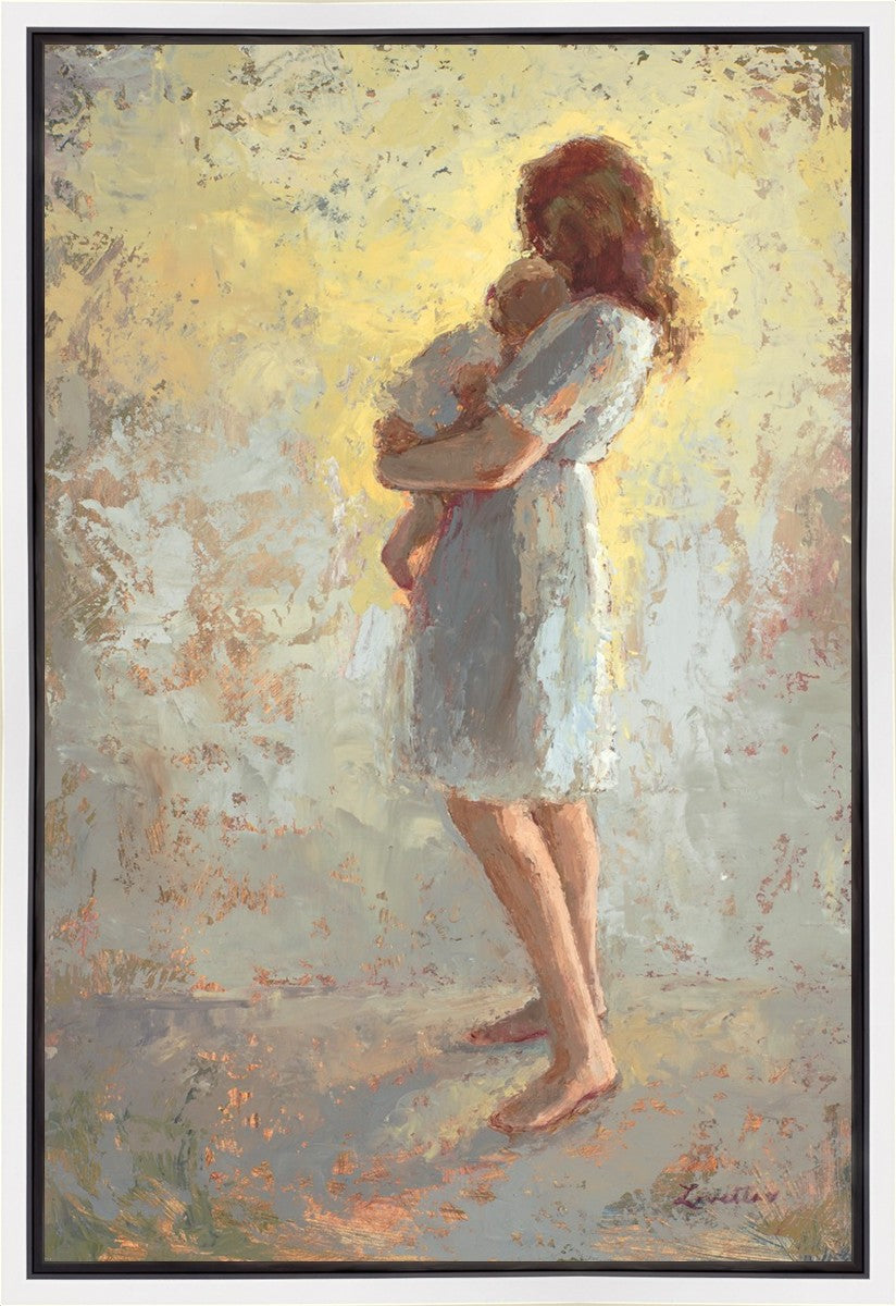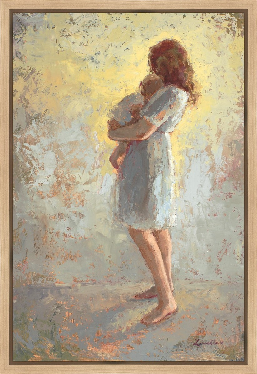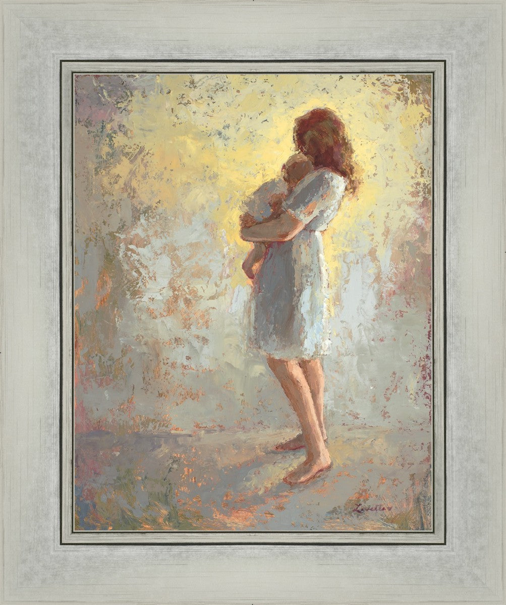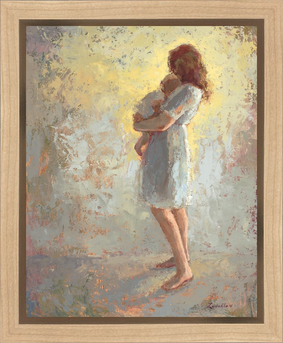 We Gather Sunshine by Lovetta Reyes Cairo beautifully portrays a mother tenderly holding her baby, radiating love and warmth. This touching painting captures the essence of motherhood, evoking feelings of joy, protection, and the precious bond between mother and child.