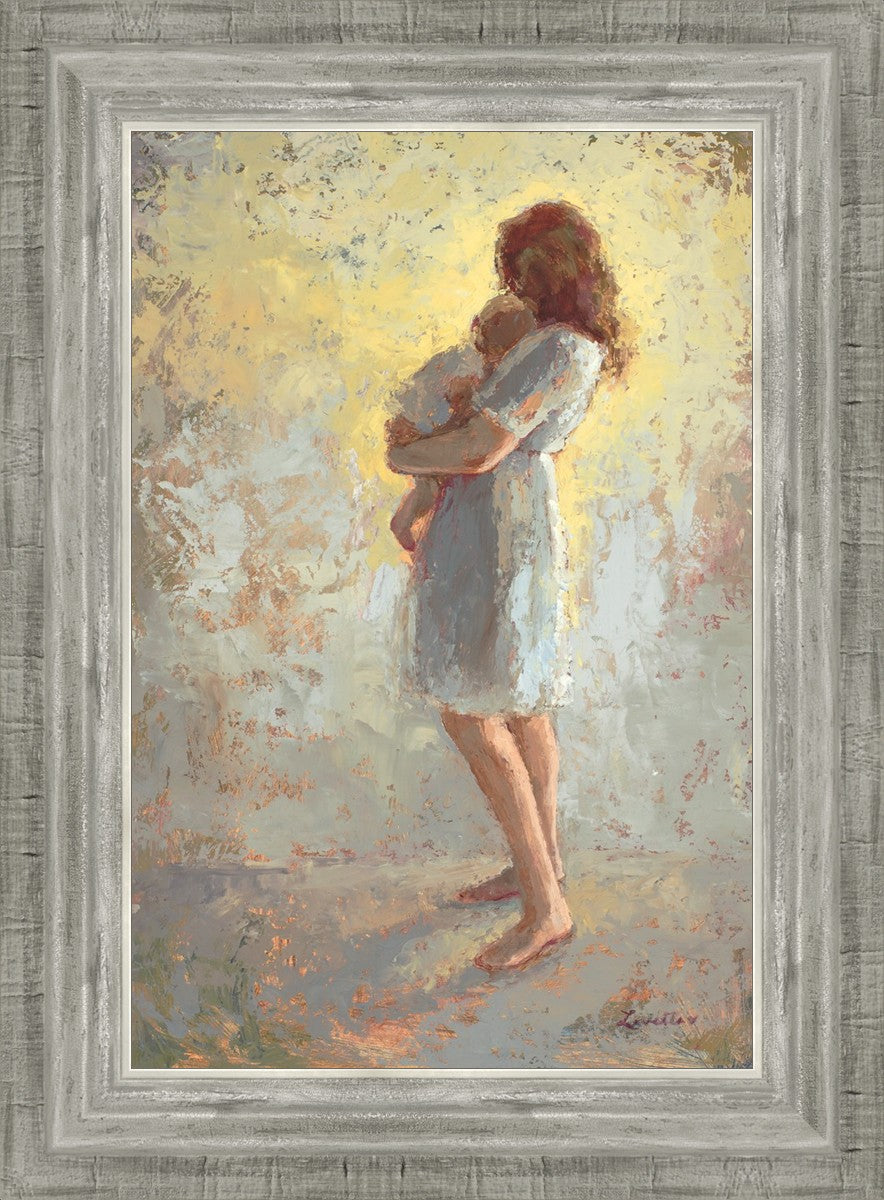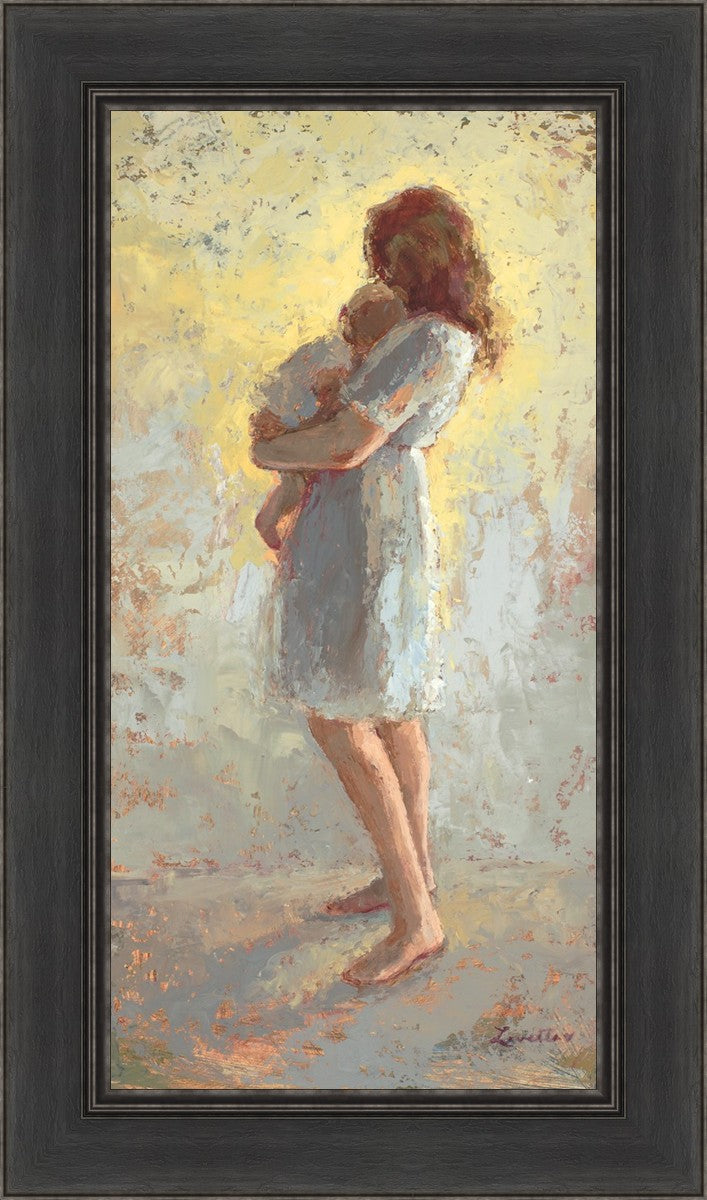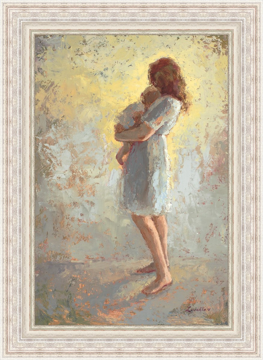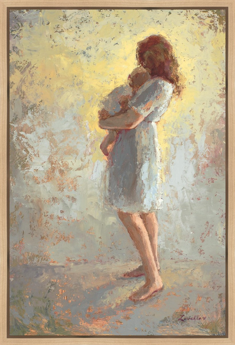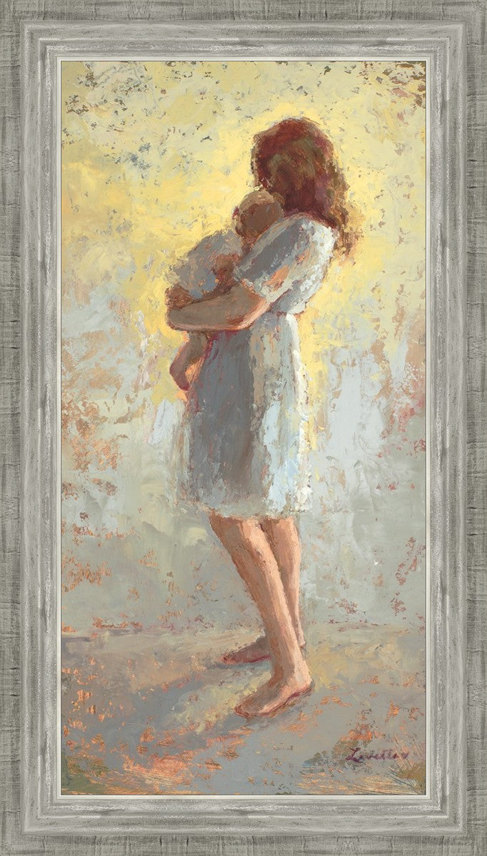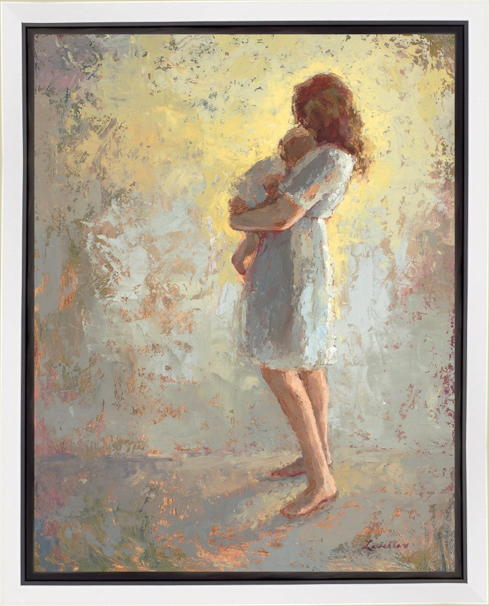 We Gather Sunshine by Lovetta Reyes Cairo beautifully portrays a mother tenderly holding her baby, radiating love and warmth. This touching painting captures the essence of motherhood, evoking feelings of joy, protection, and the precious bond between mother and child.