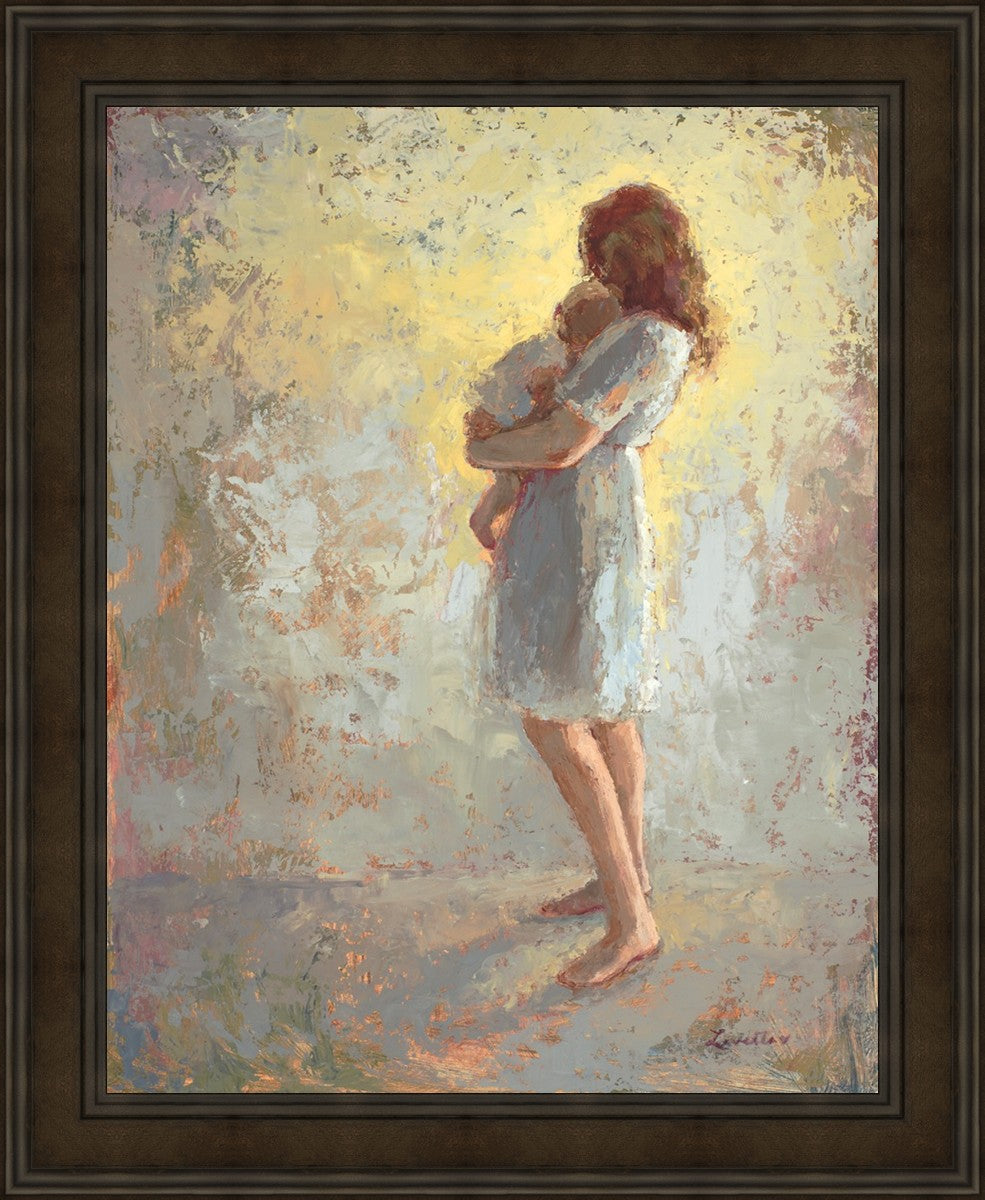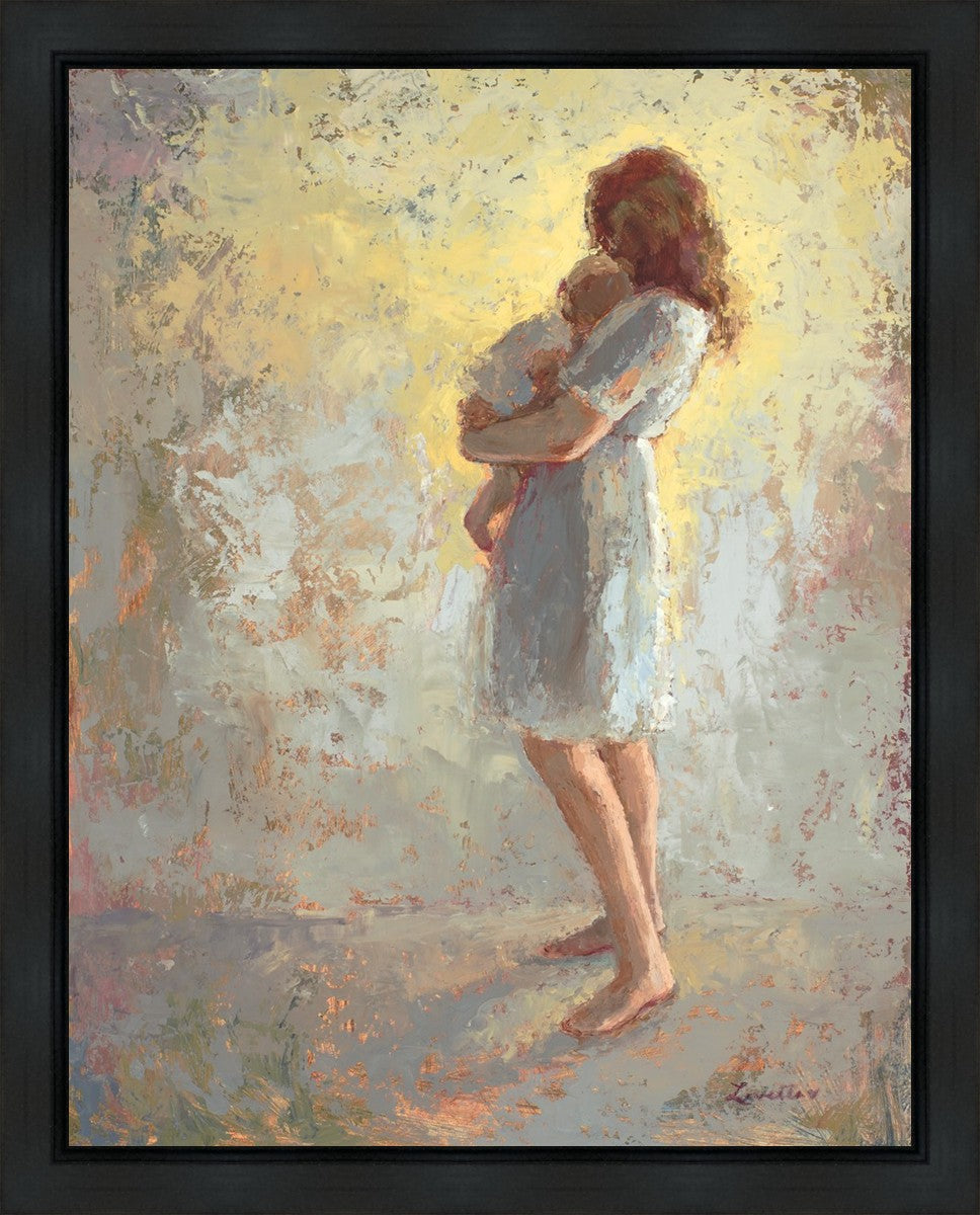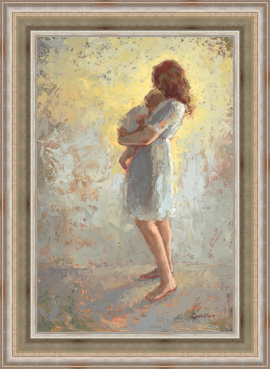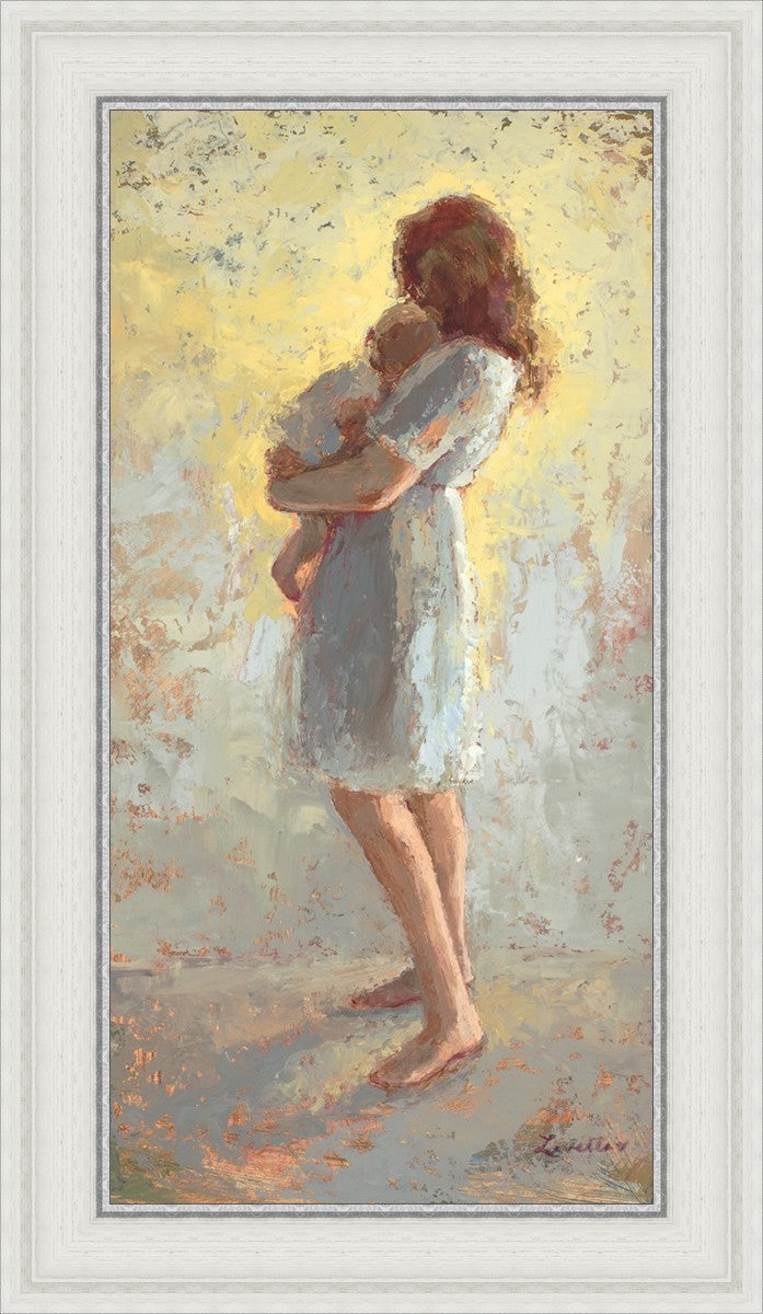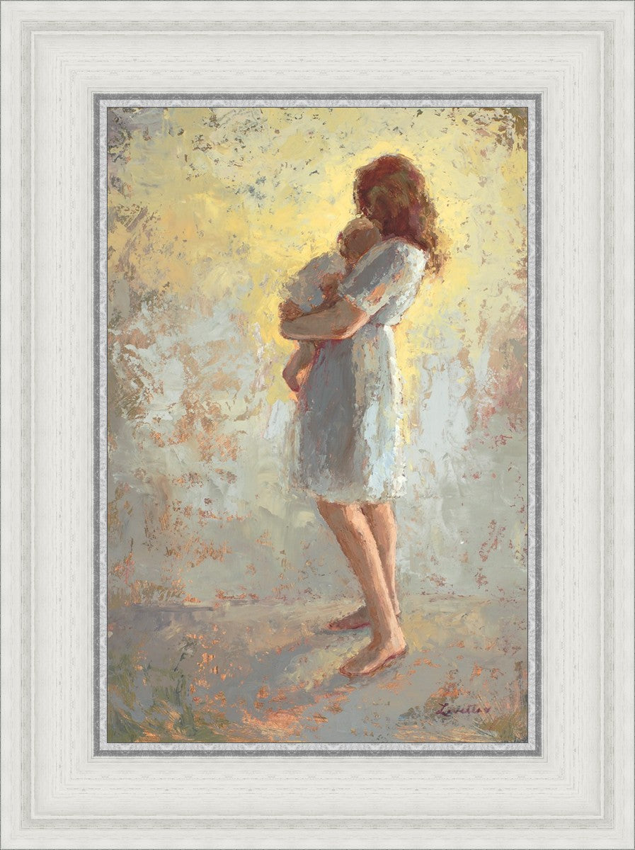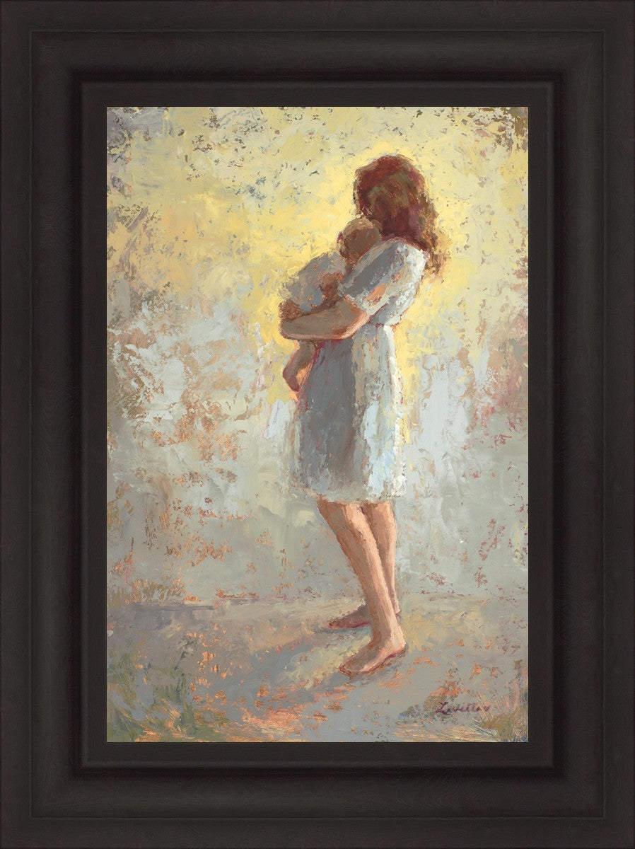 We Gather Sunshine by Lovetta Reyes Cairo beautifully portrays a mother tenderly holding her baby, radiating love and warmth. This touching painting captures the essence of motherhood, evoking feelings of joy, protection, and the precious bond between mother and child.