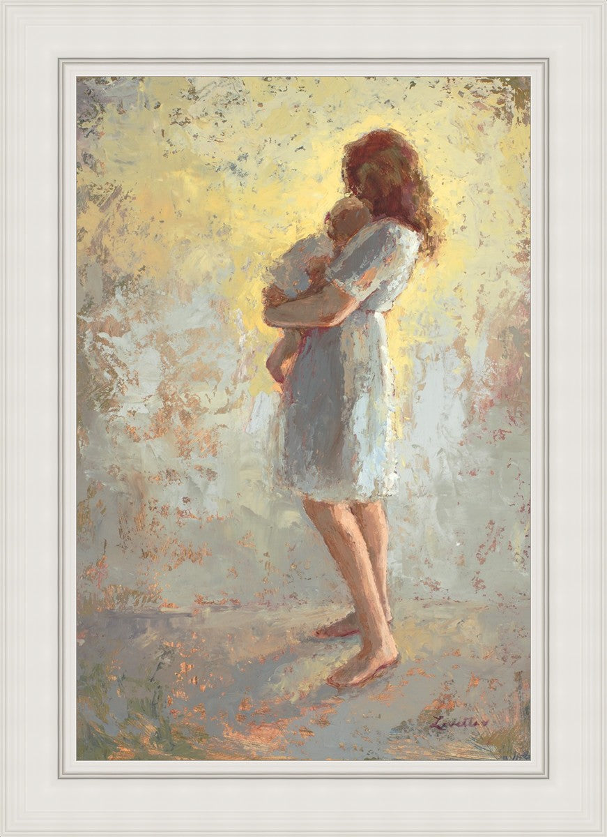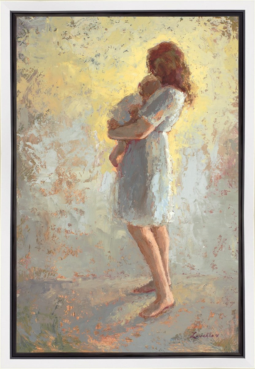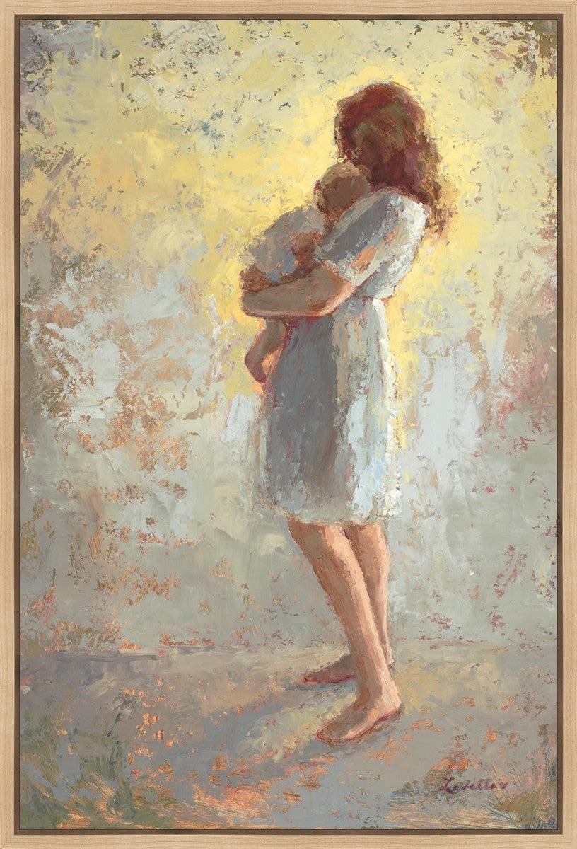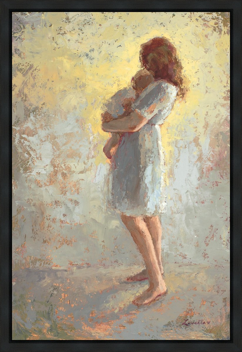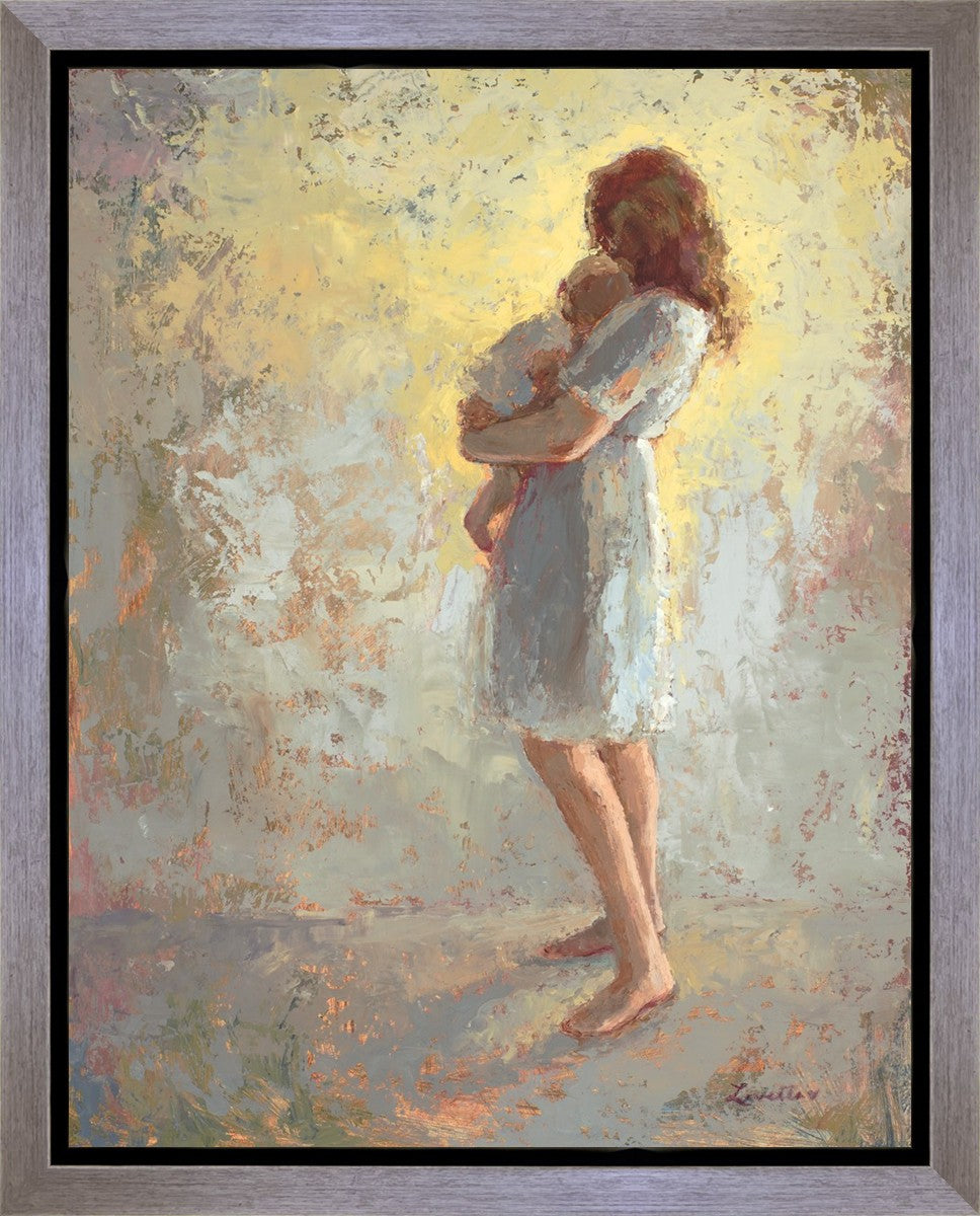 We Gather Sunshine by Lovetta Reyes Cairo beautifully portrays a mother tenderly holding her baby, radiating love and warmth. This touching painting captures the essence of motherhood, evoking feelings of joy, protection, and the precious bond between mother and child.