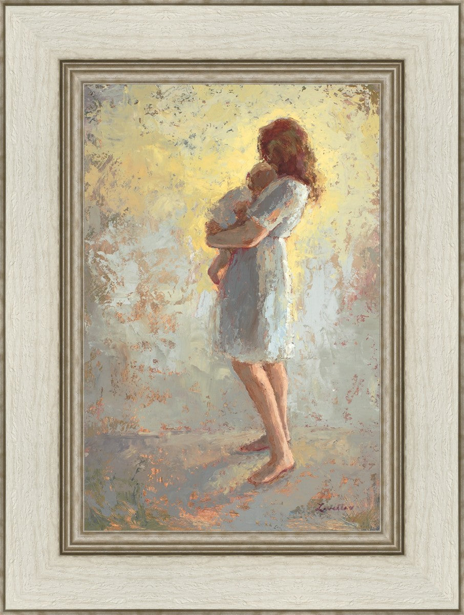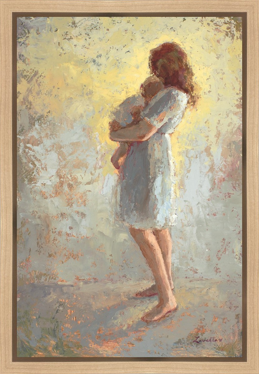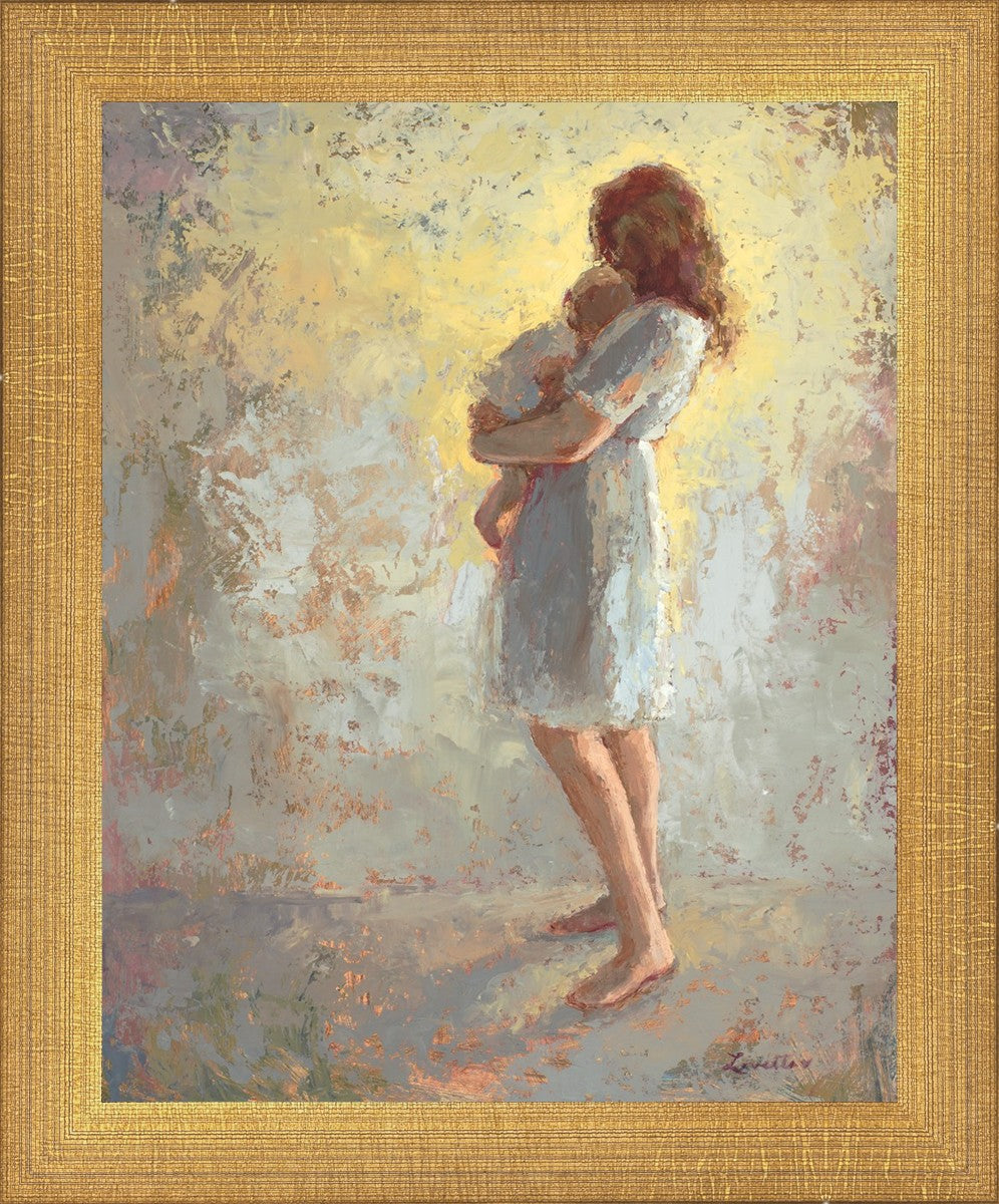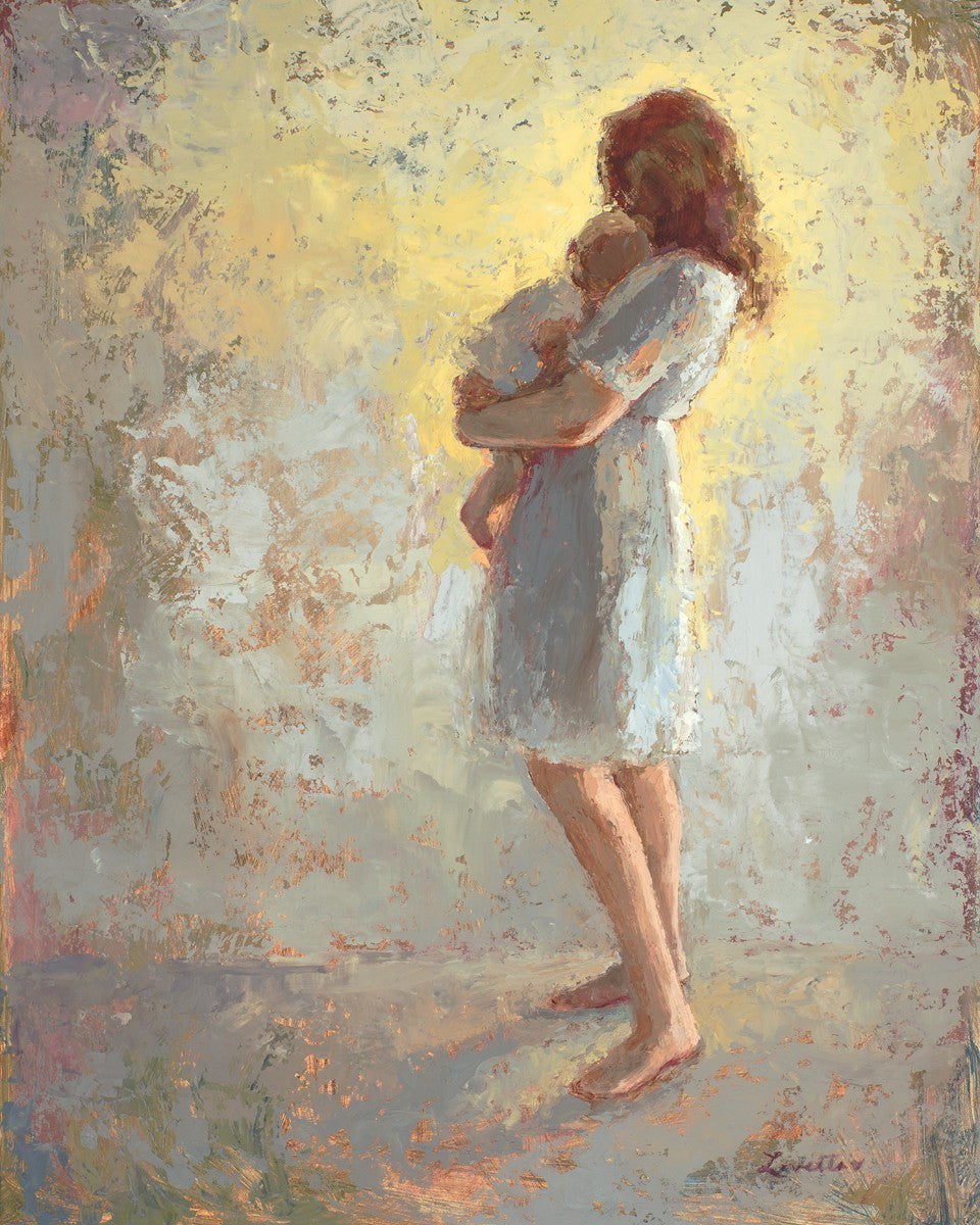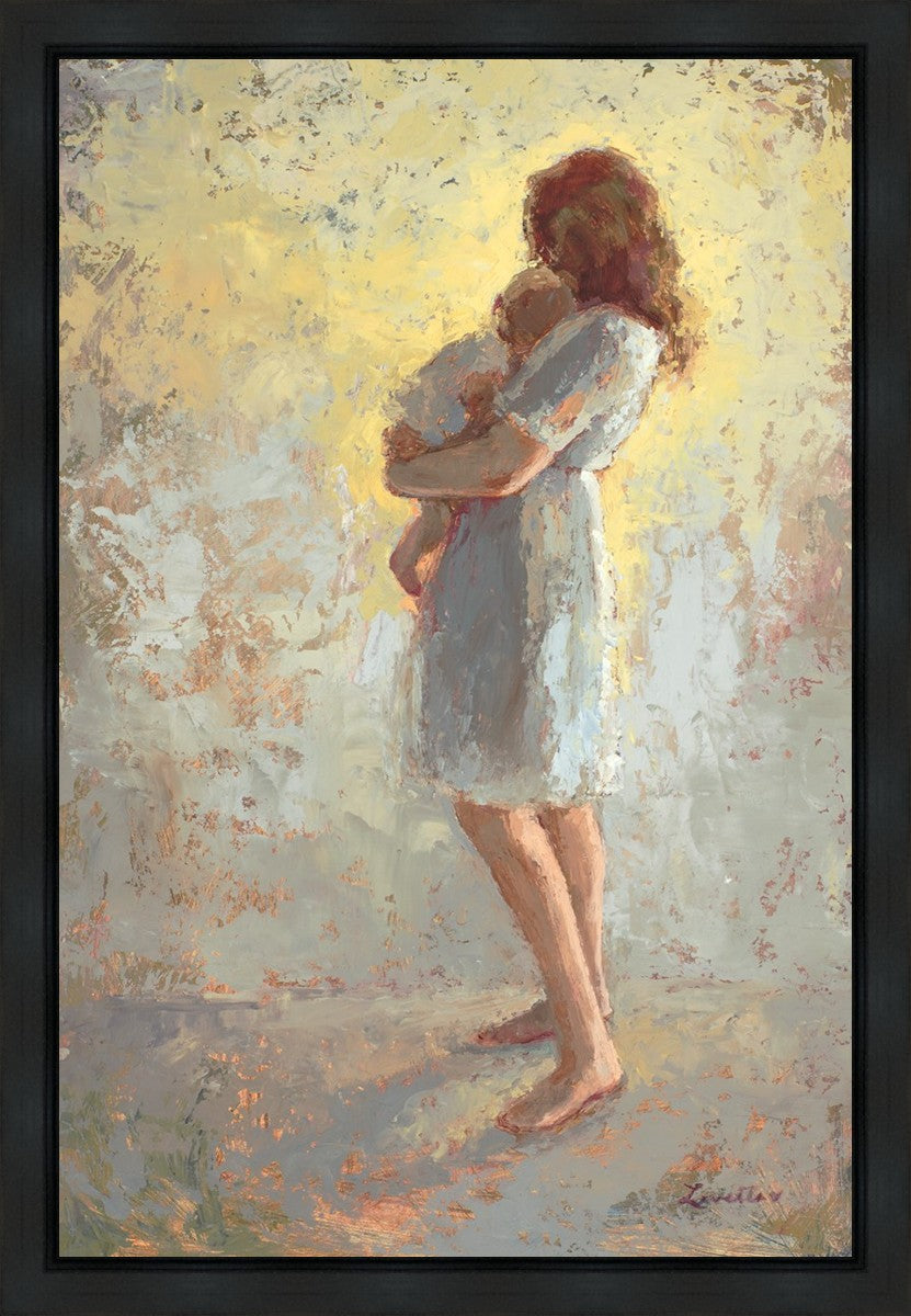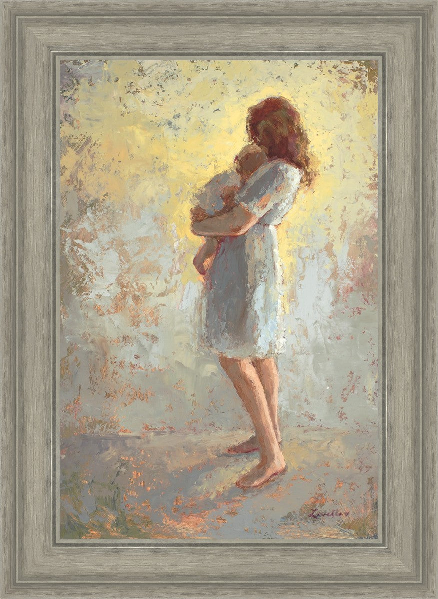 We Gather Sunshine by Lovetta Reyes Cairo beautifully portrays a mother tenderly holding her baby, radiating love and warmth. This touching painting captures the essence of motherhood, evoking feelings of joy, protection, and the precious bond between mother and child.