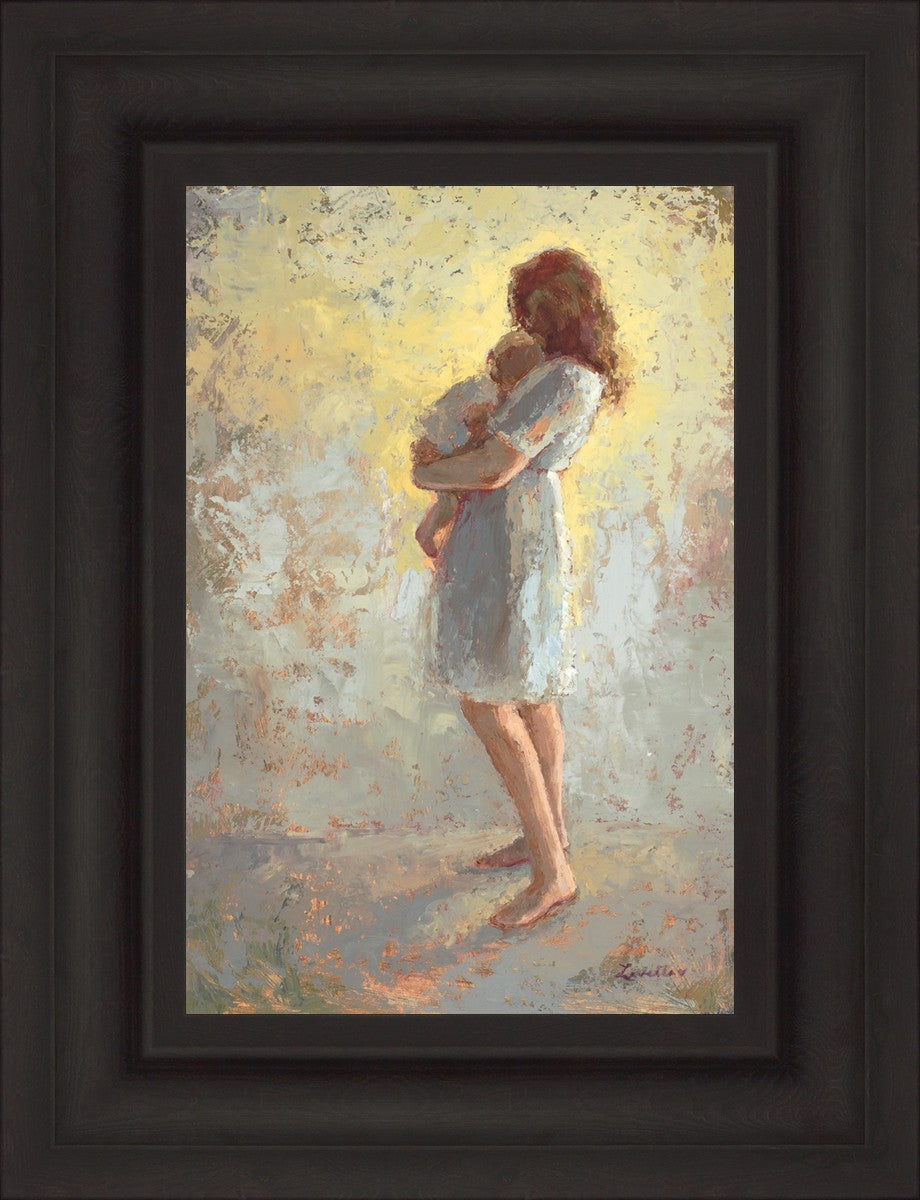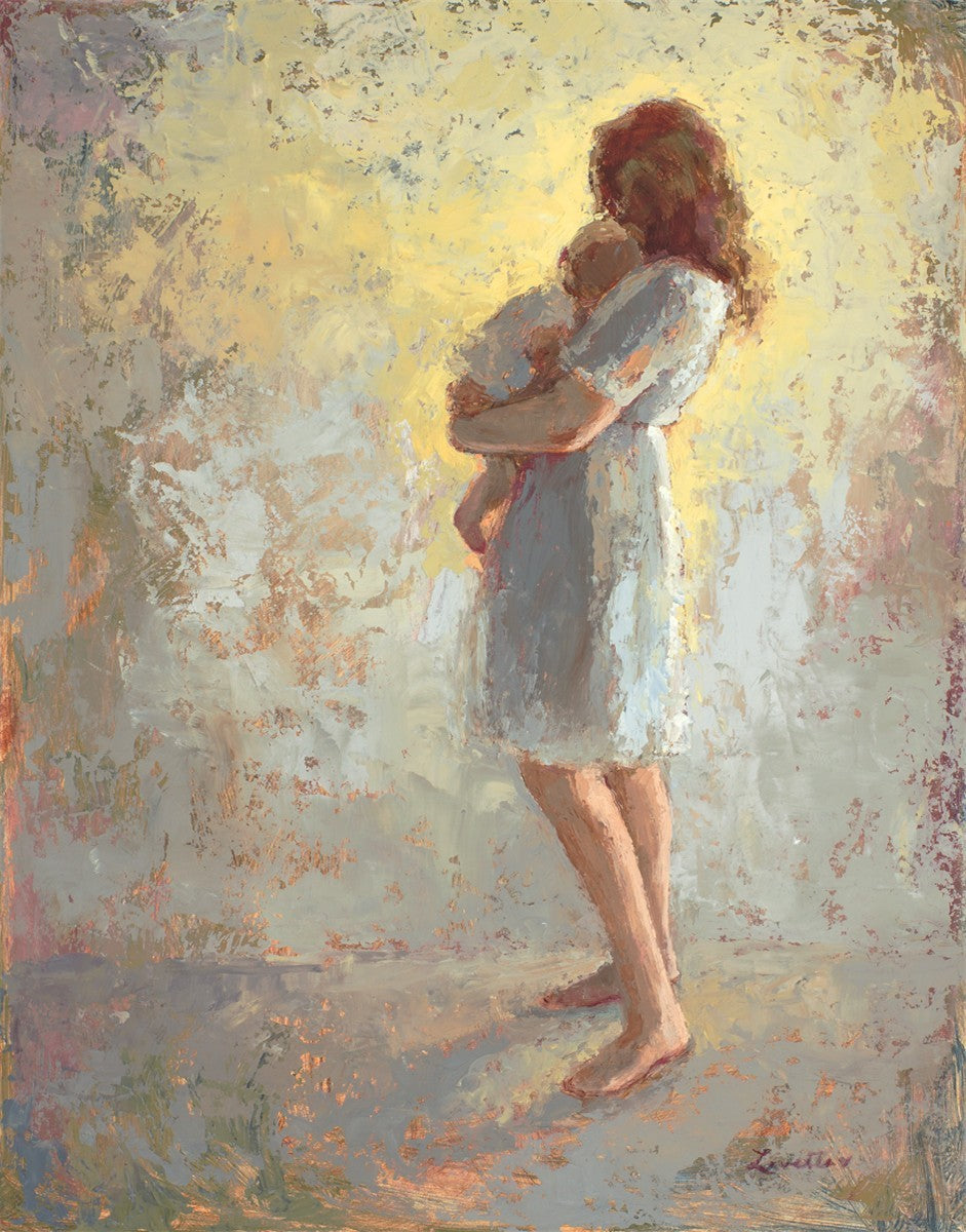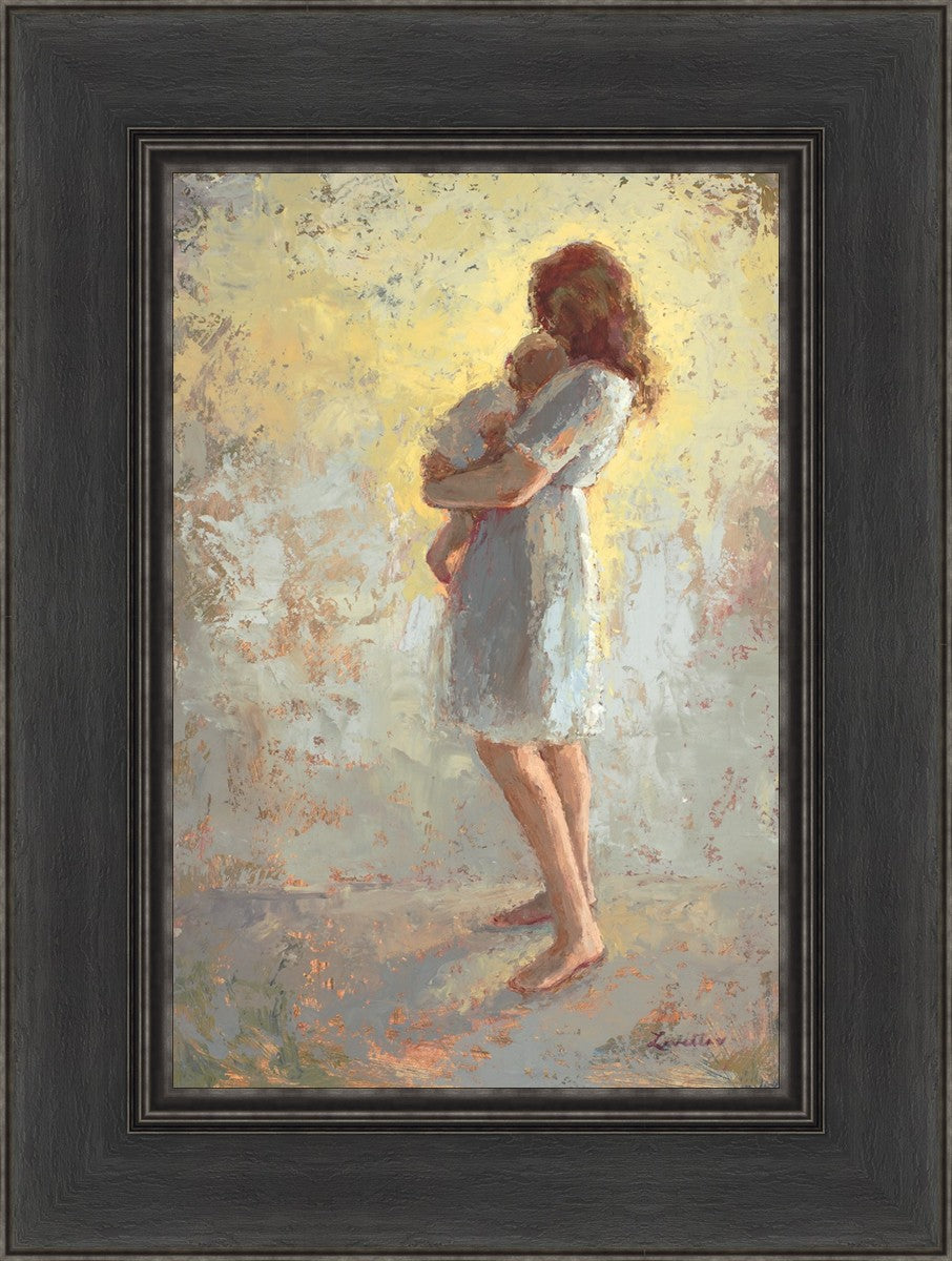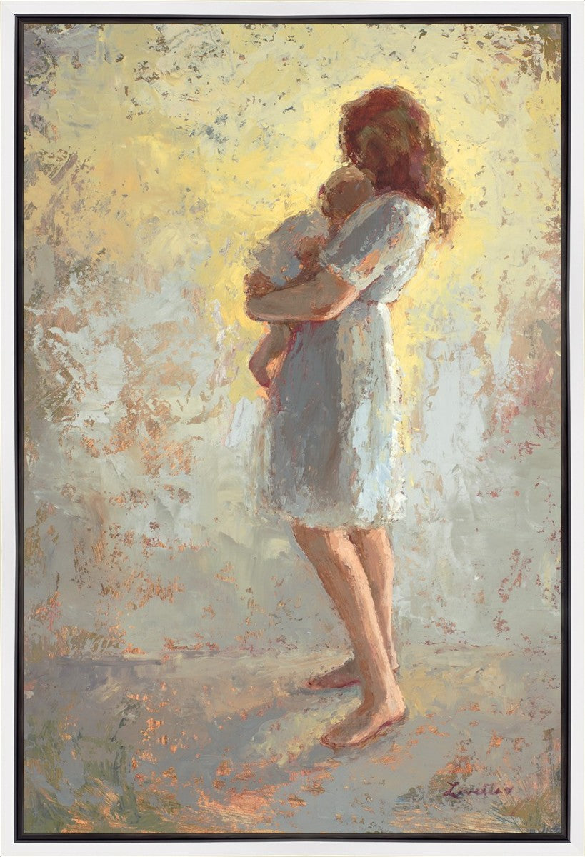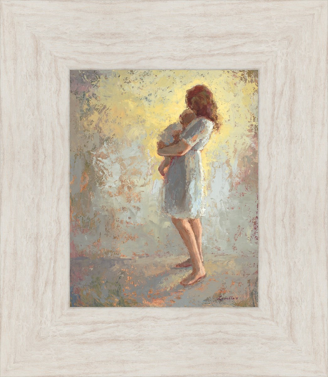 We Gather Sunshine by Lovetta Reyes Cairo beautifully portrays a mother tenderly holding her baby, radiating love and warmth. This touching painting captures the essence of motherhood, evoking feelings of joy, protection, and the precious bond between mother and child.
