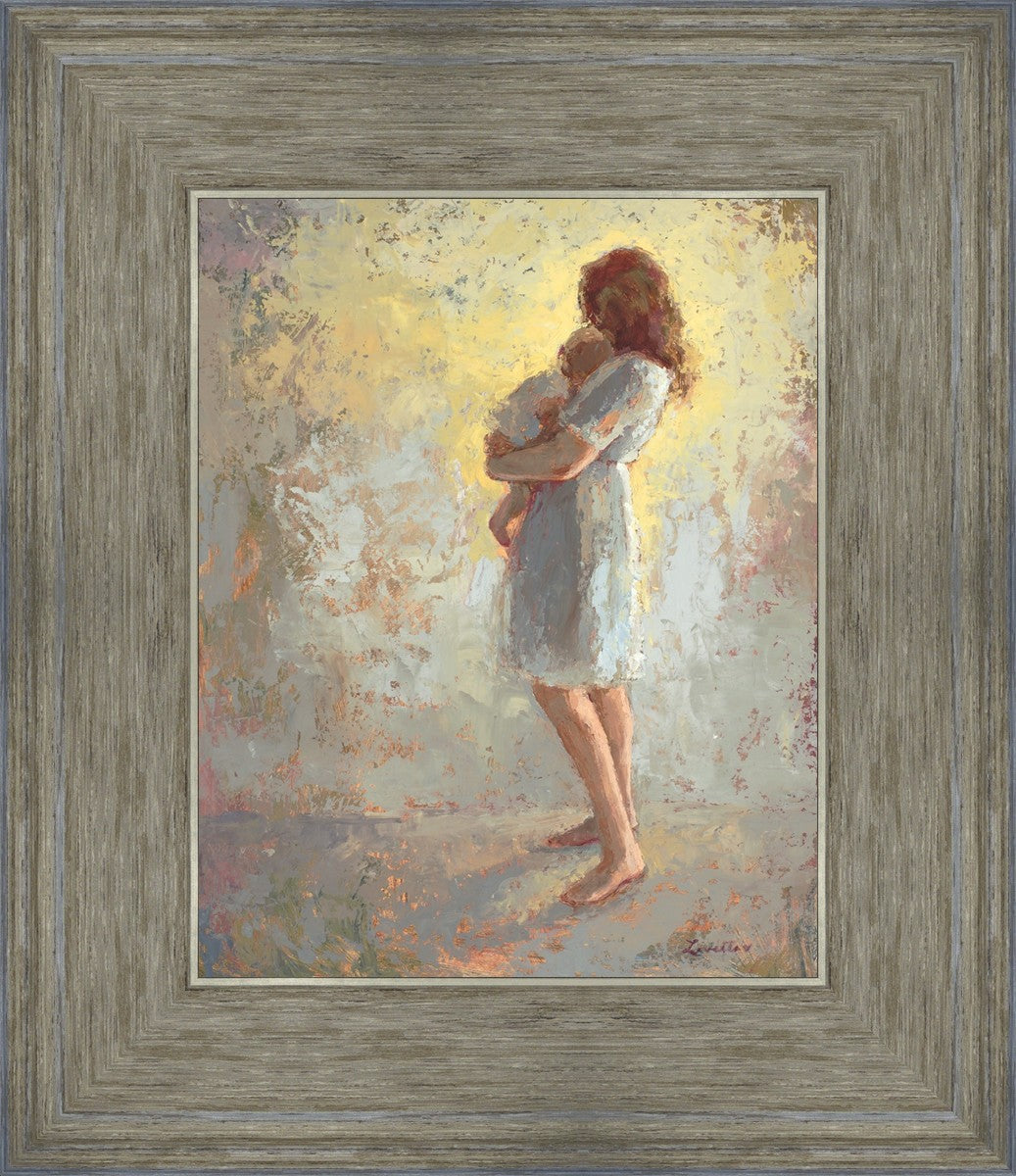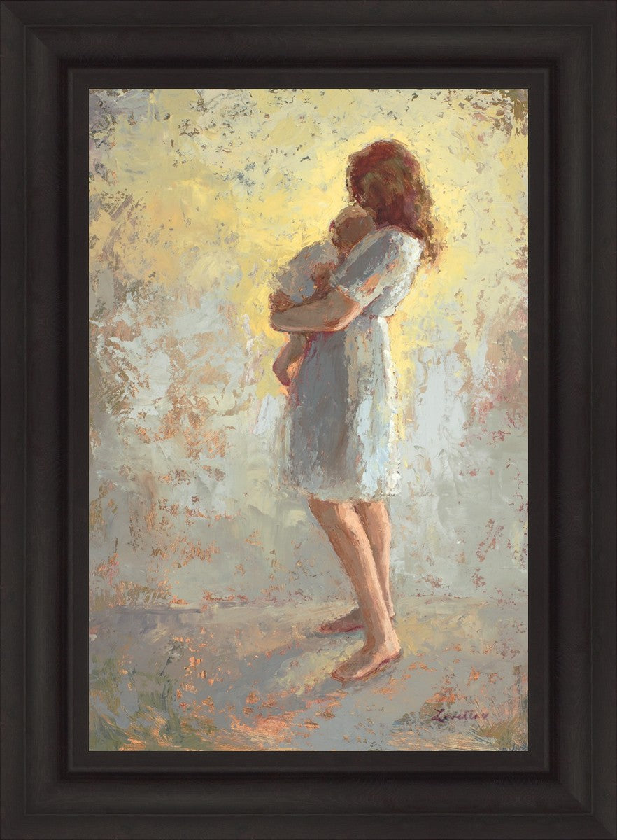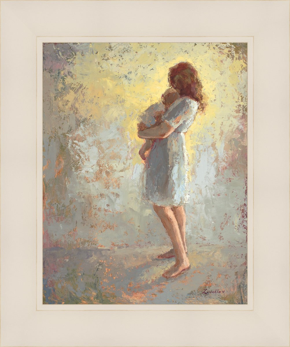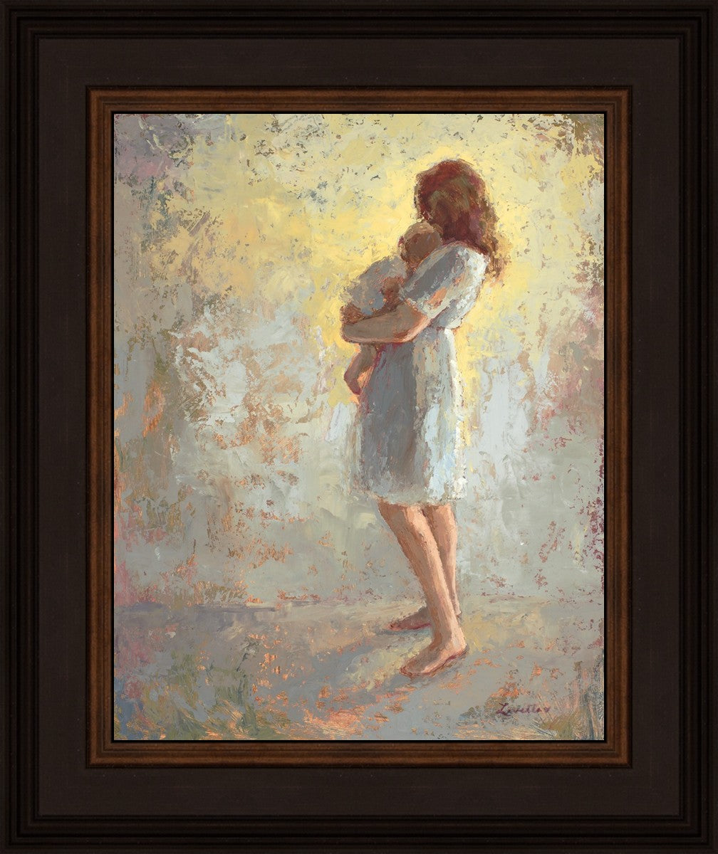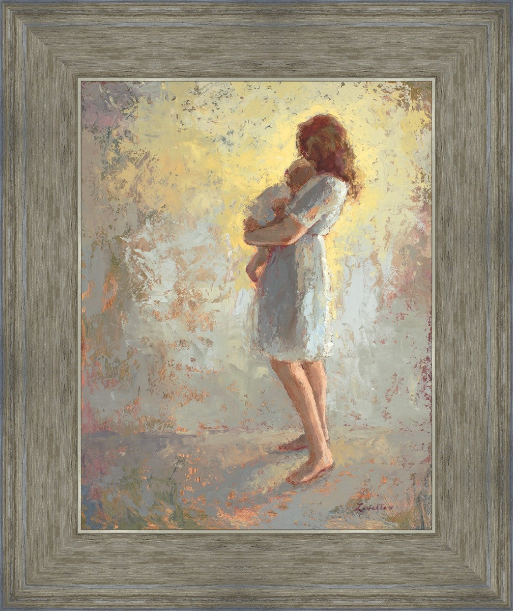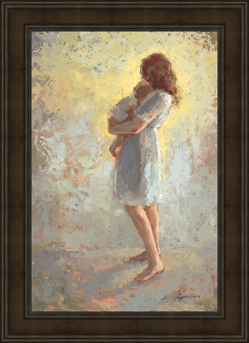 We Gather Sunshine by Lovetta Reyes Cairo beautifully portrays a mother tenderly holding her baby, radiating love and warmth. This touching painting captures the essence of motherhood, evoking feelings of joy, protection, and the precious bond between mother and child.