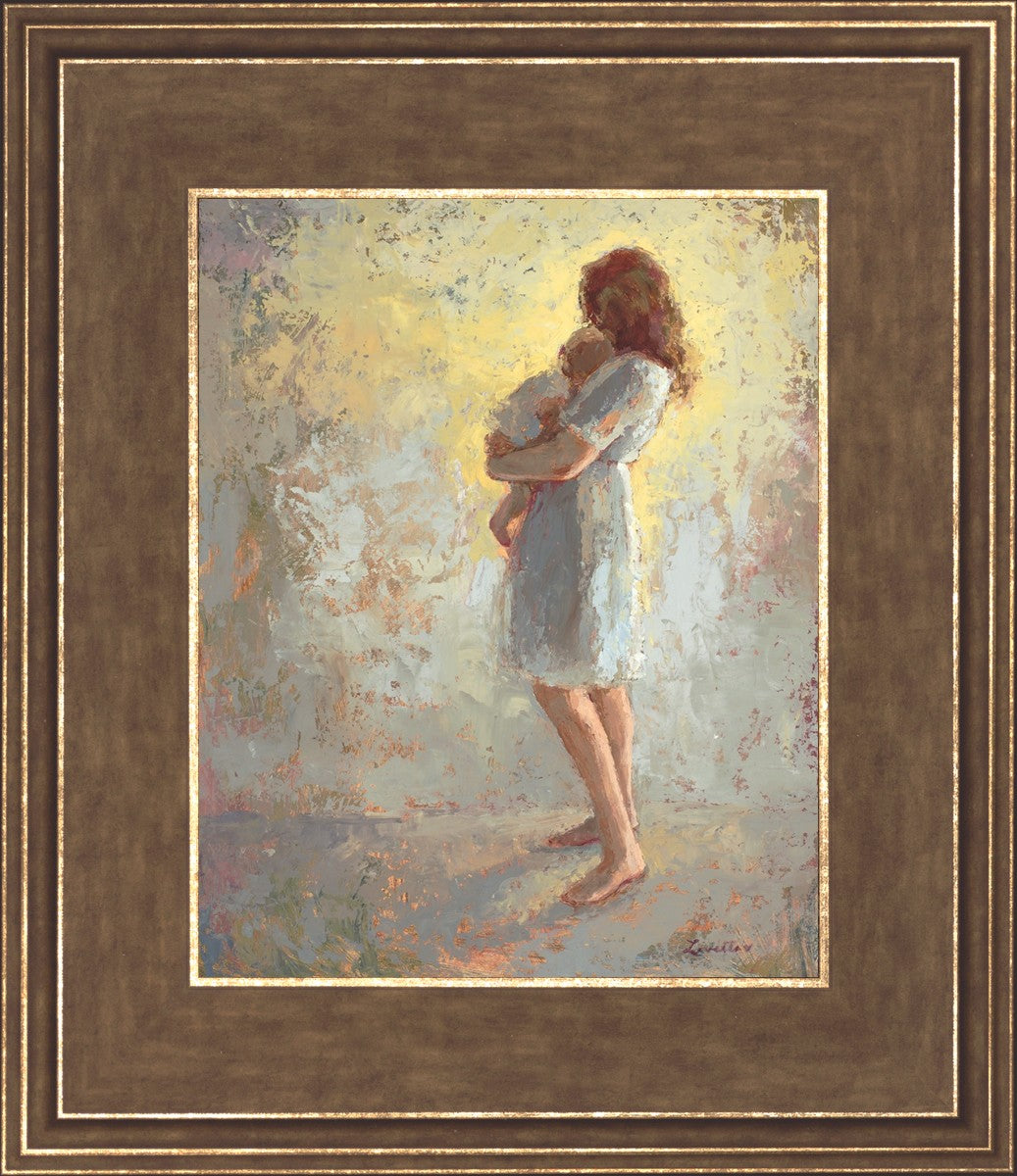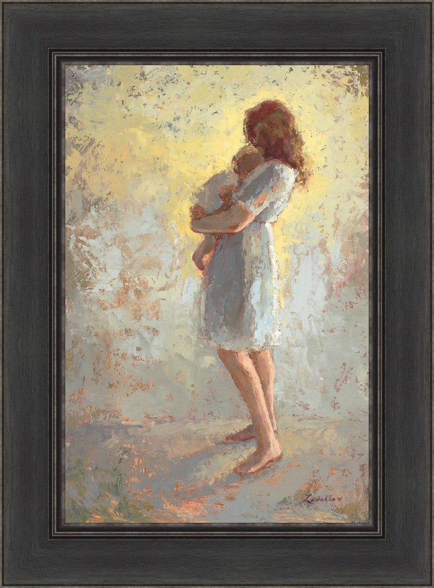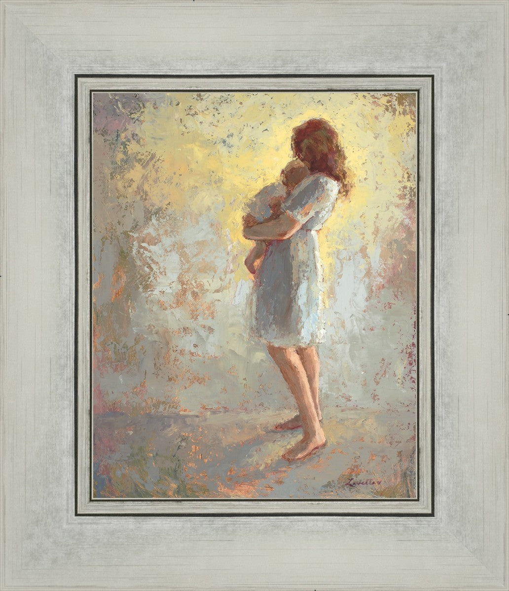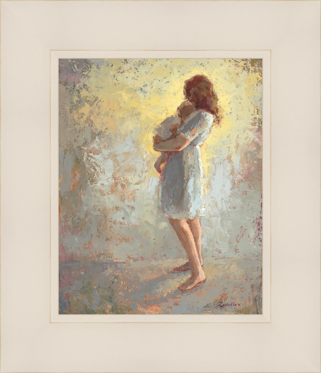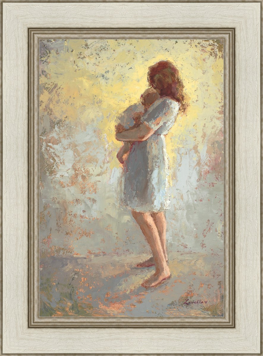 We Gather Sunshine by Lovetta Reyes Cairo beautifully portrays a mother tenderly holding her baby, radiating love and warmth. This touching painting captures the essence of motherhood, evoking feelings of joy, protection, and the precious bond between mother and child.