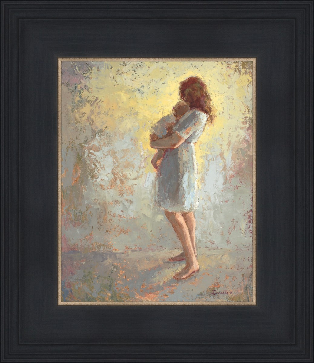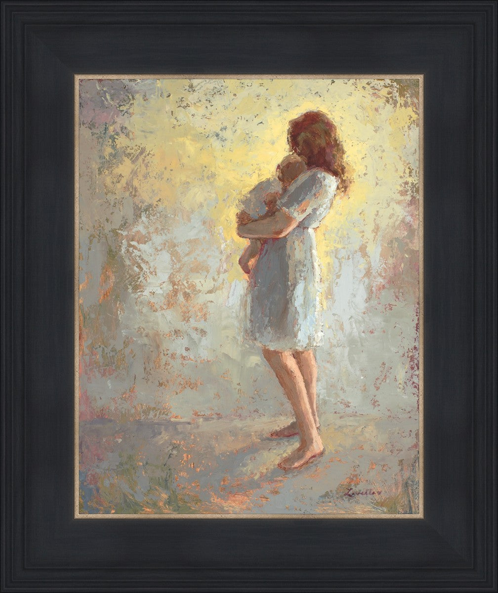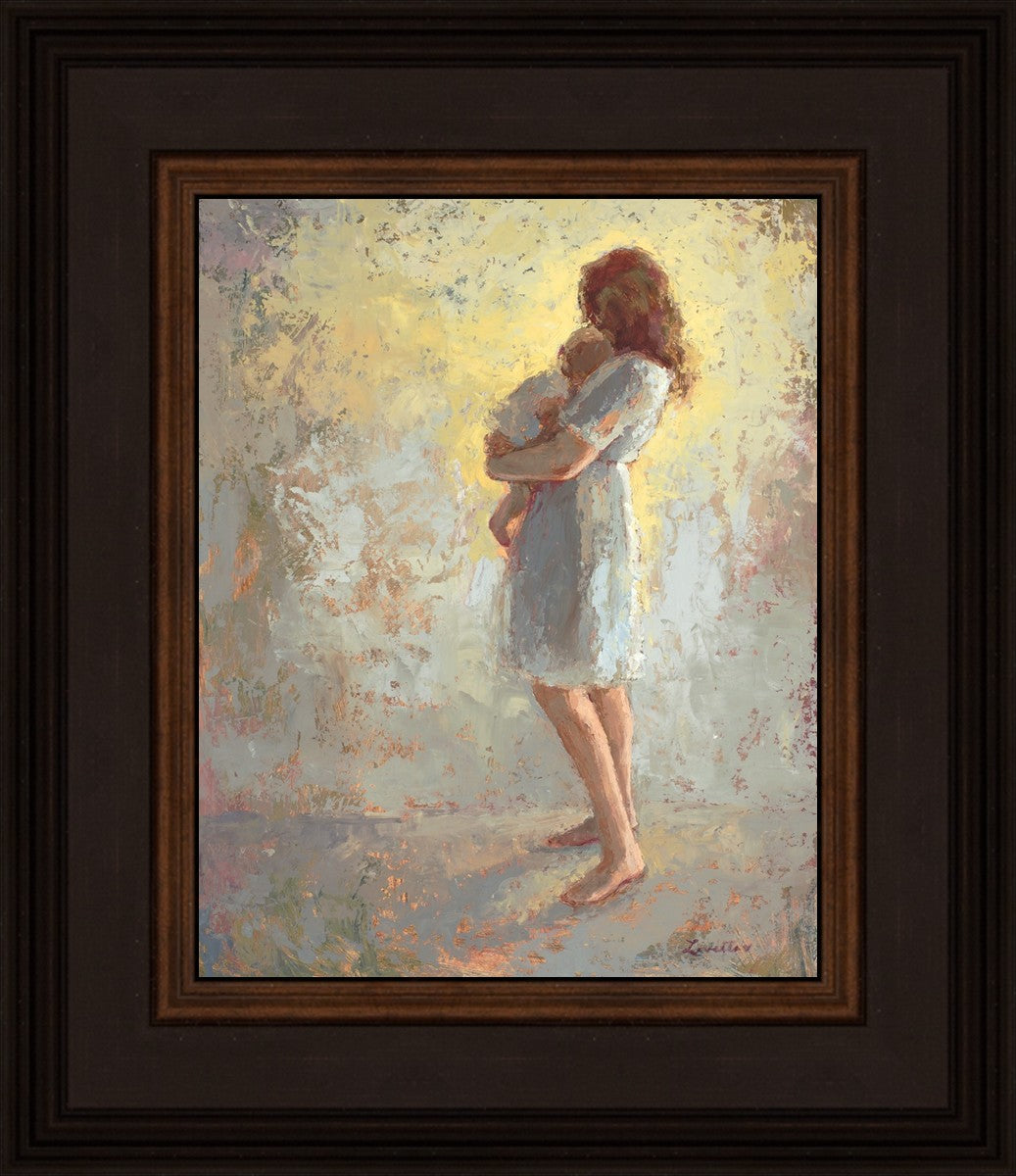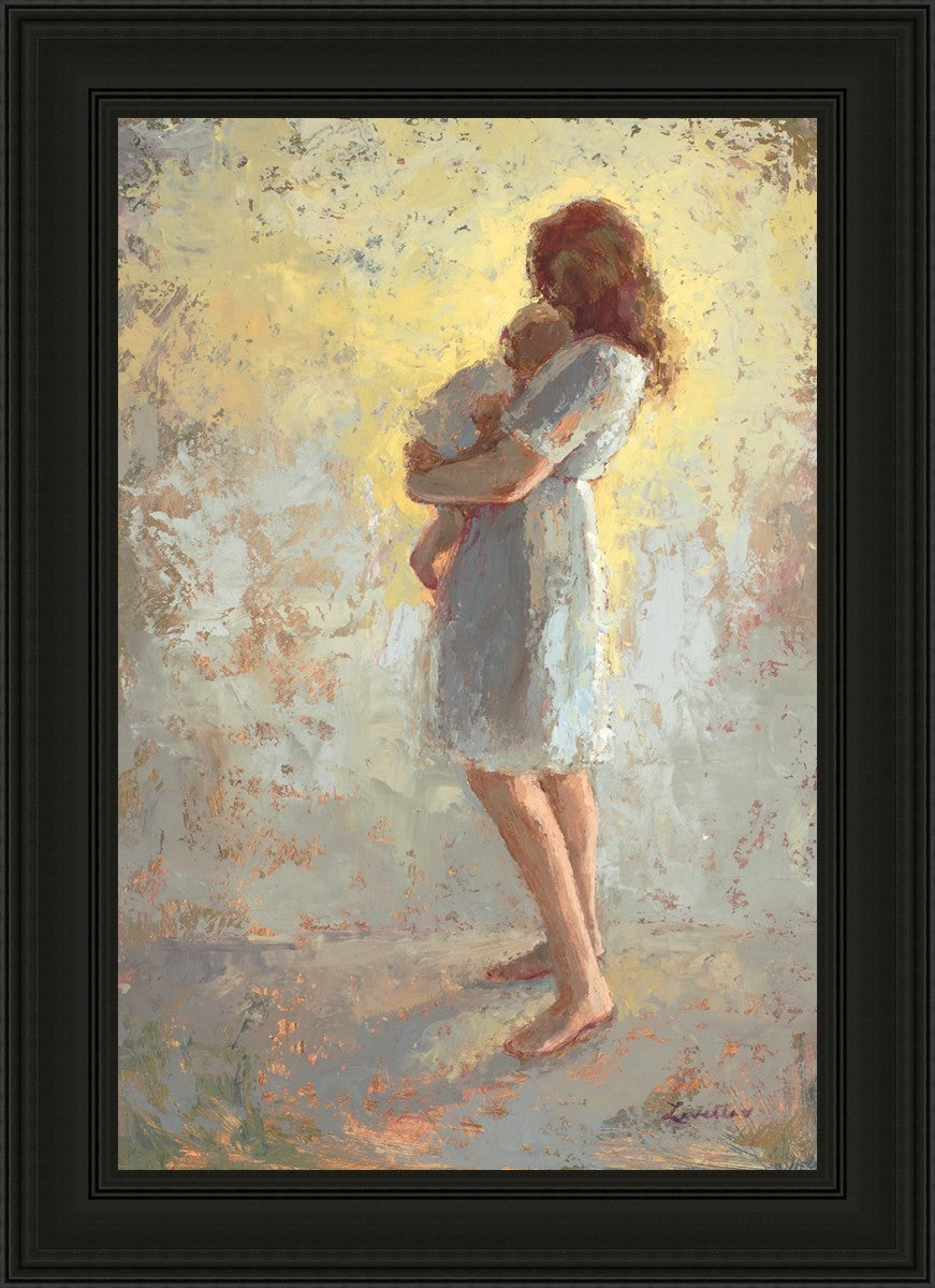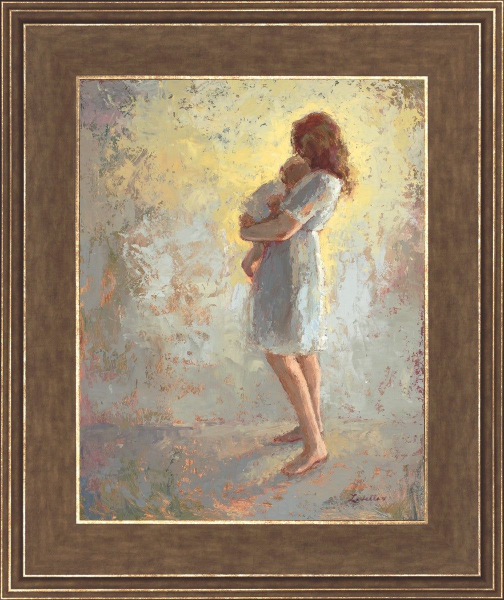 We Gather Sunshine by Lovetta Reyes Cairo beautifully portrays a mother tenderly holding her baby, radiating love and warmth. This touching painting captures the essence of motherhood, evoking feelings of joy, protection, and the precious bond between mother and child.