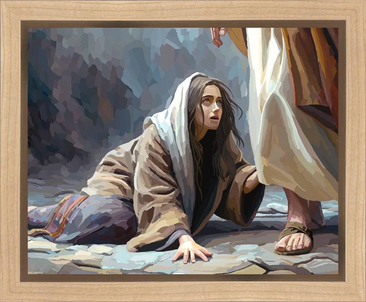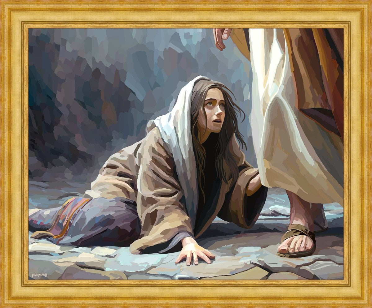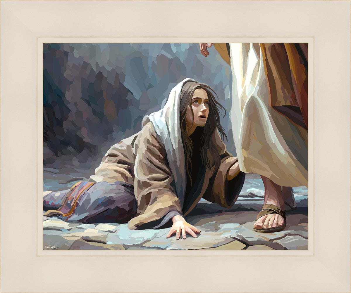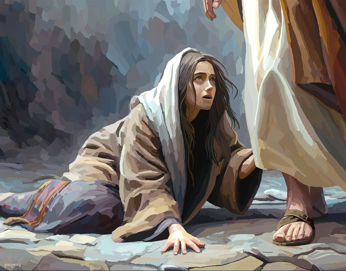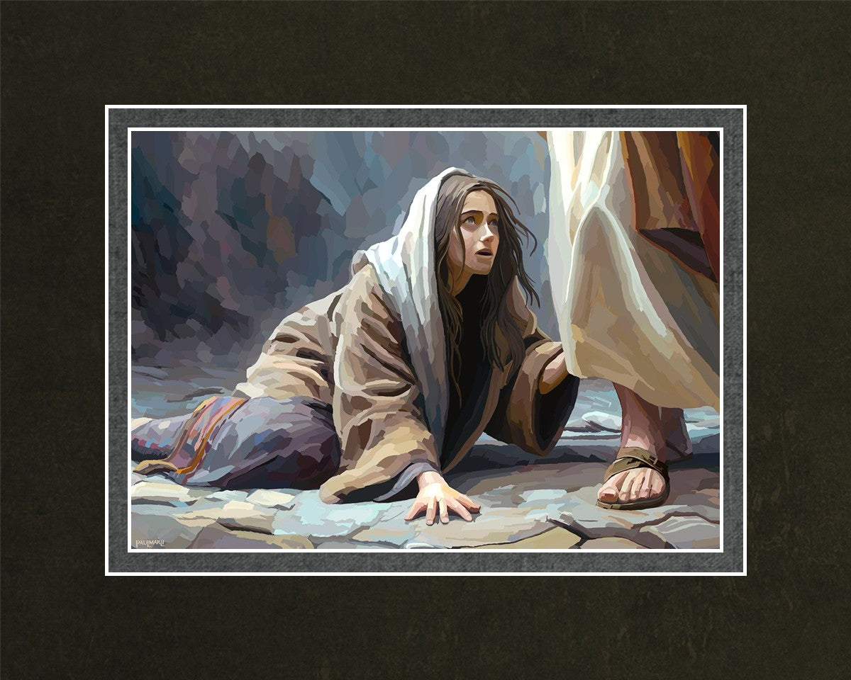 This scene found in the Bible is the woman with the issue of blood who suffered with her ailment for 12 years. Although the story portrayed a large crowd, I wanted to emphasize the one-on-one aspect of this story. Any “run-ins” with the Savior are personal between us and Him. I hope to portray this in part with the image of just the woman and Jesus without any other person.