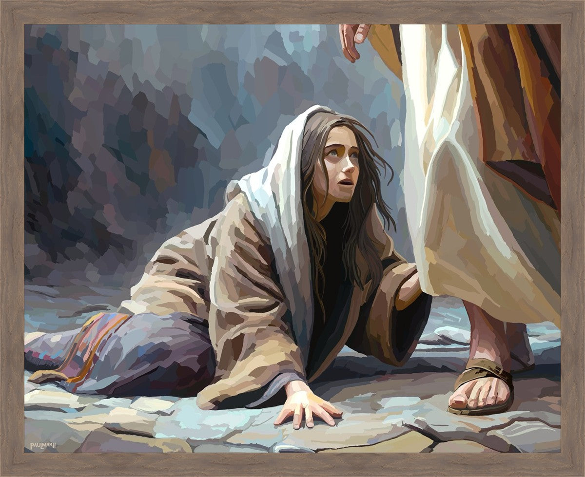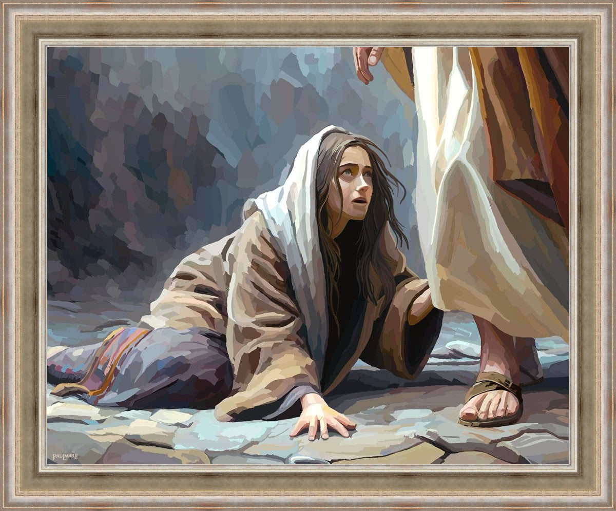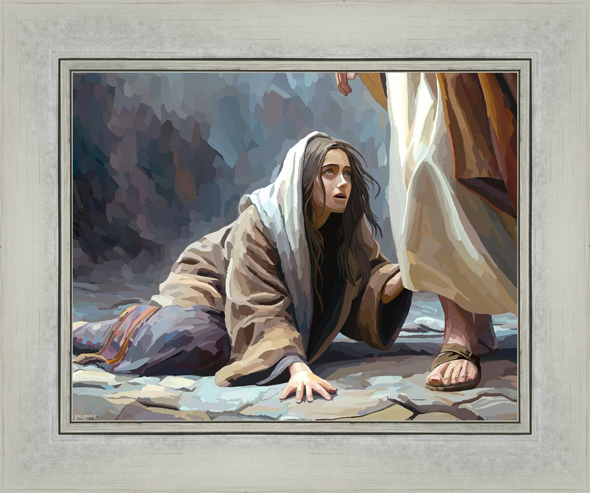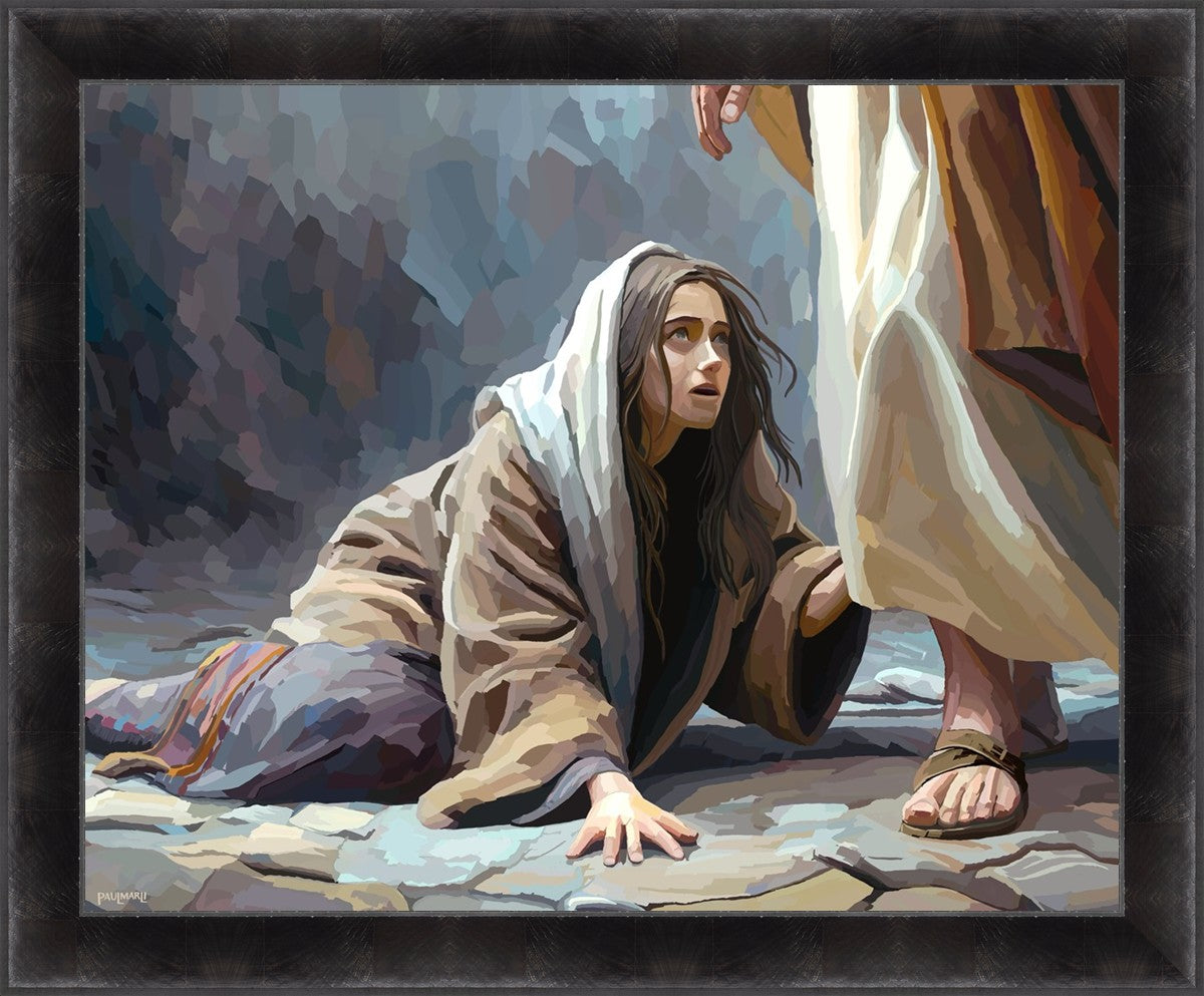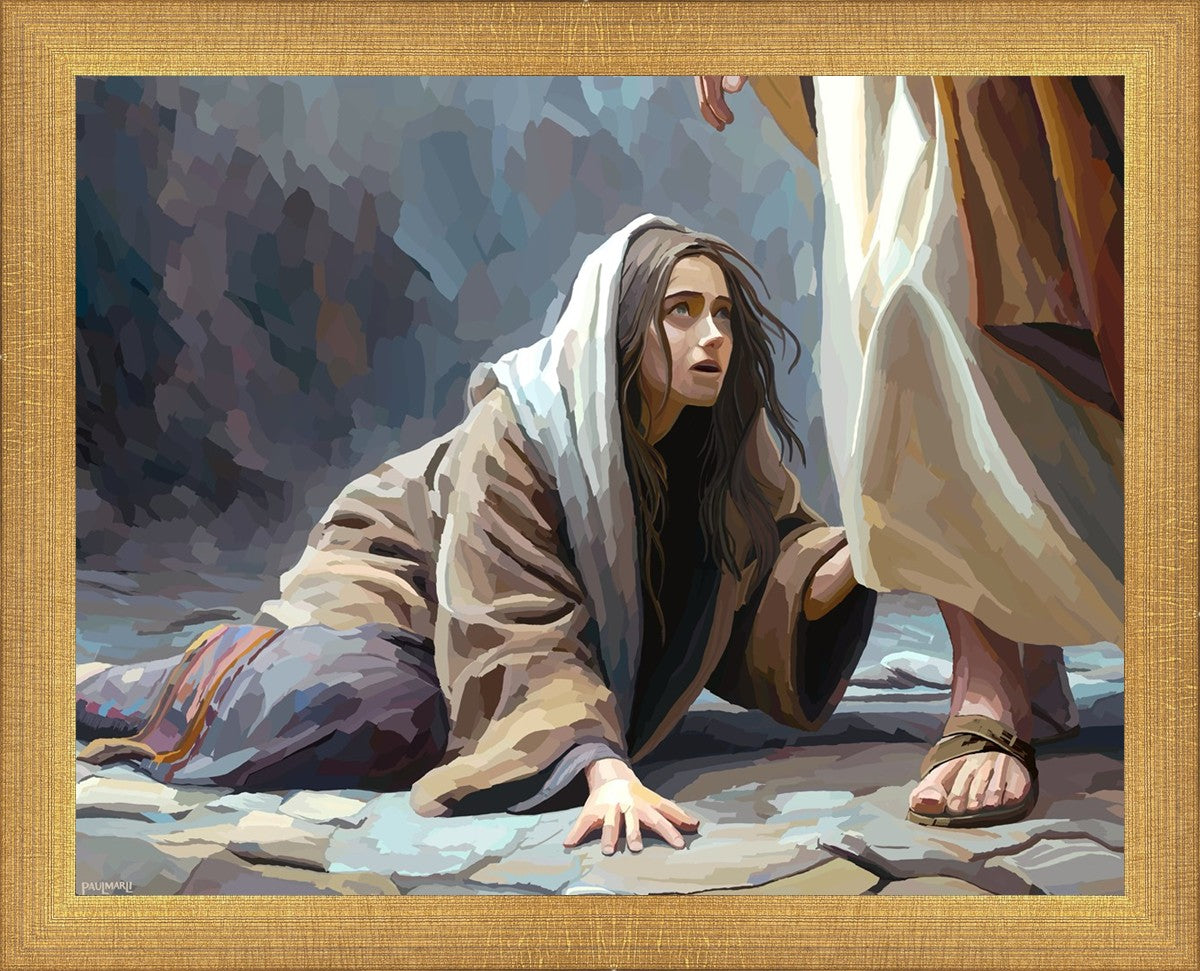 This scene found in the Bible is the woman with the issue of blood who suffered with her ailment for 12 years. Although the story portrayed a large crowd, I wanted to emphasize the one-on-one aspect of this story. Any “run-ins” with the Savior are personal between us and Him. I hope to portray this in part with the image of just the woman and Jesus without any other person.
