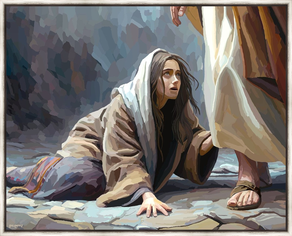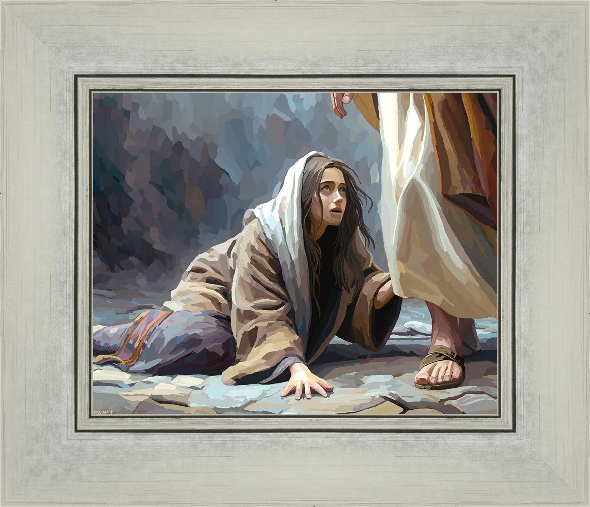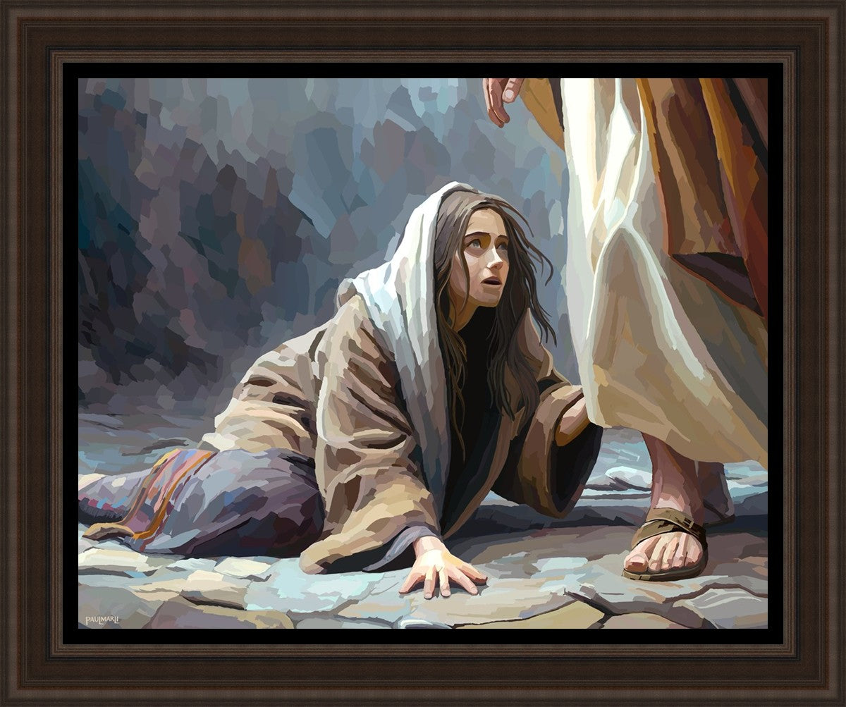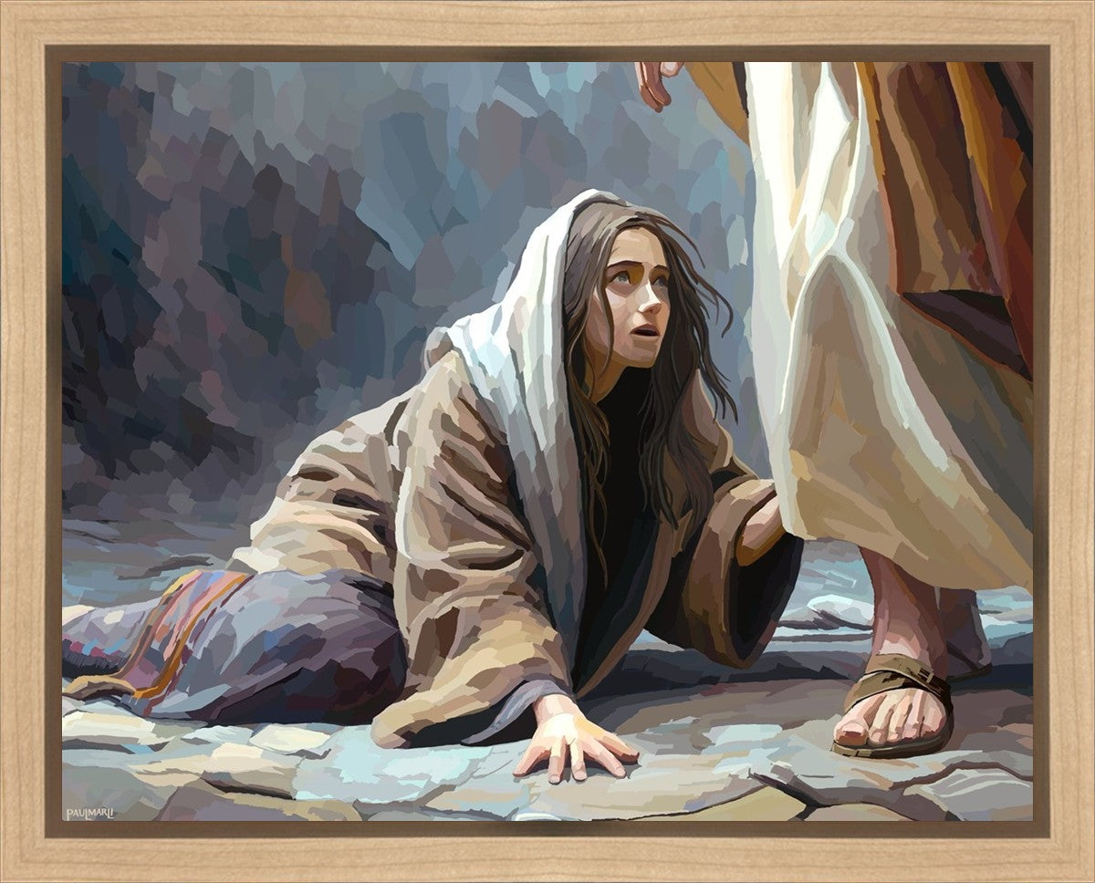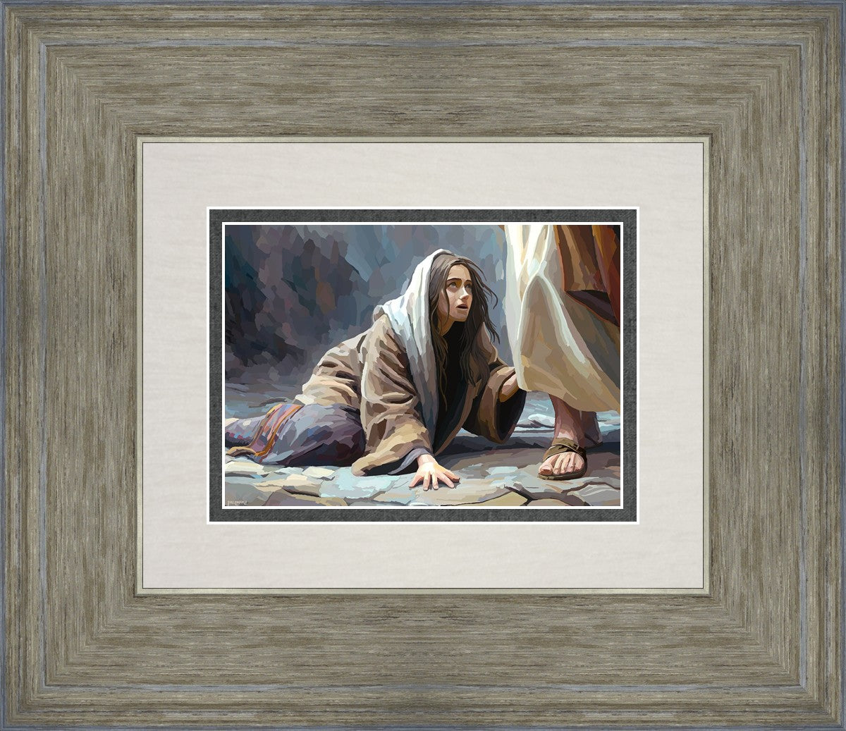 This scene found in the Bible is the woman with the issue of blood who suffered with her ailment for 12 years. Although the story portrayed a large crowd, I wanted to emphasize the one-on-one aspect of this story. Any “run-ins” with the Savior are personal between us and Him. I hope to portray this in part with the image of just the woman and Jesus without any other person.