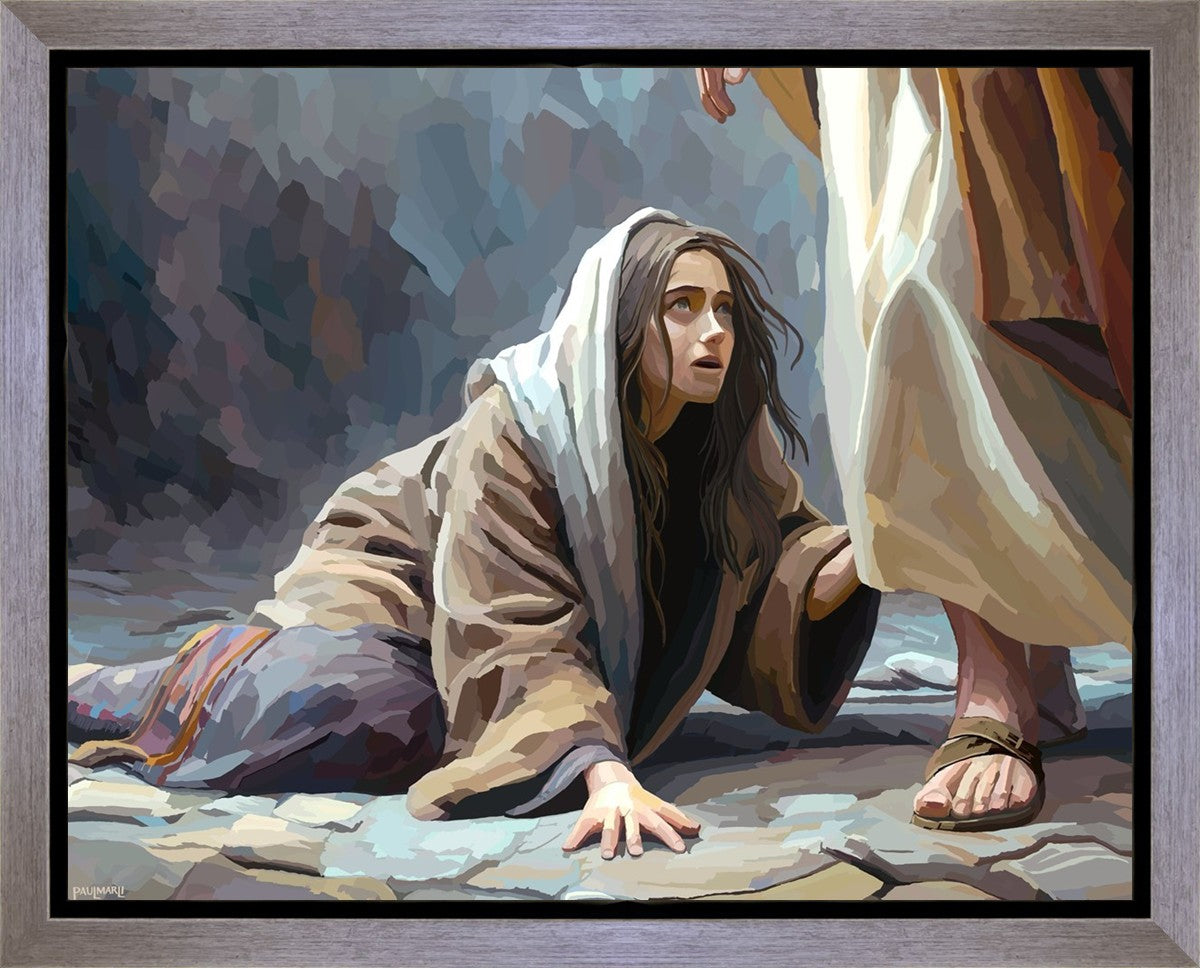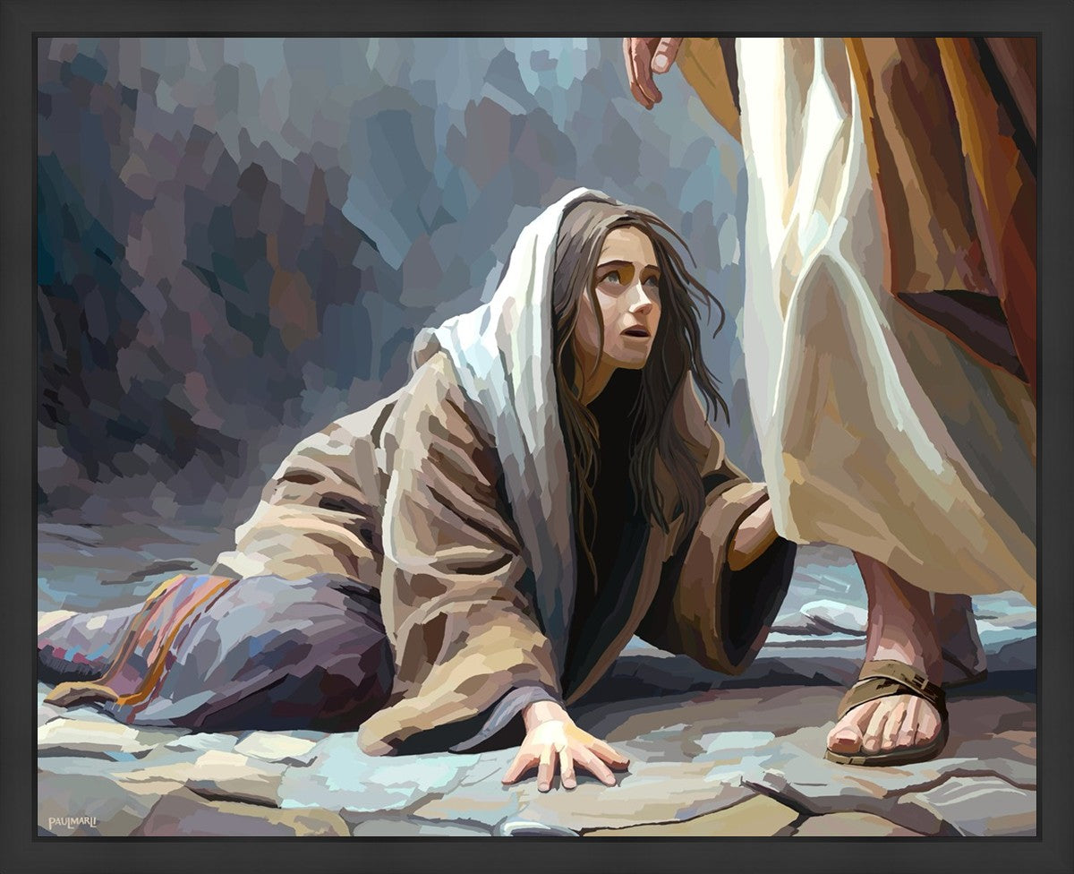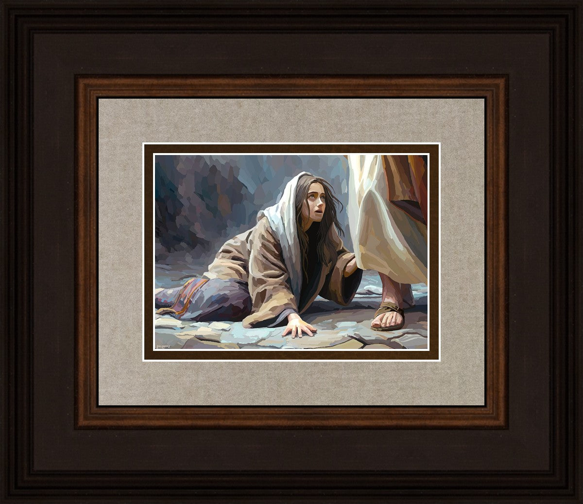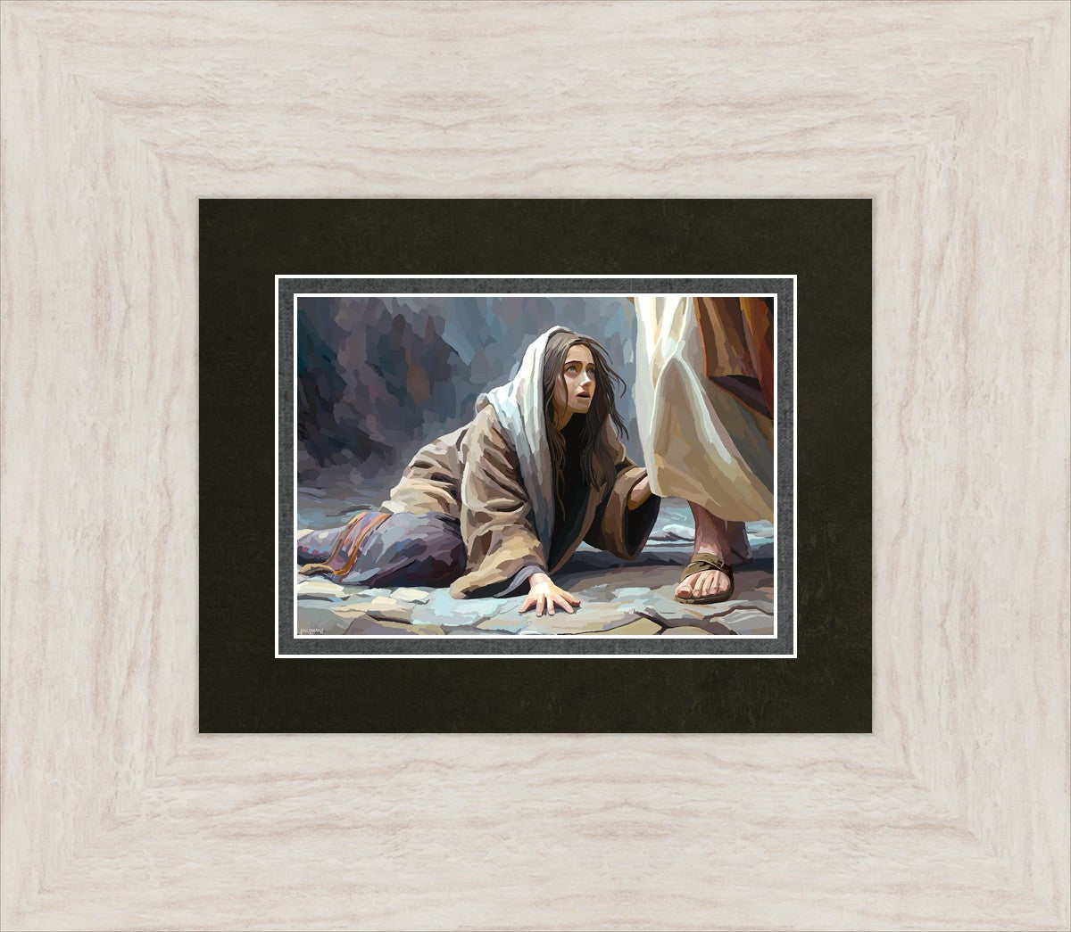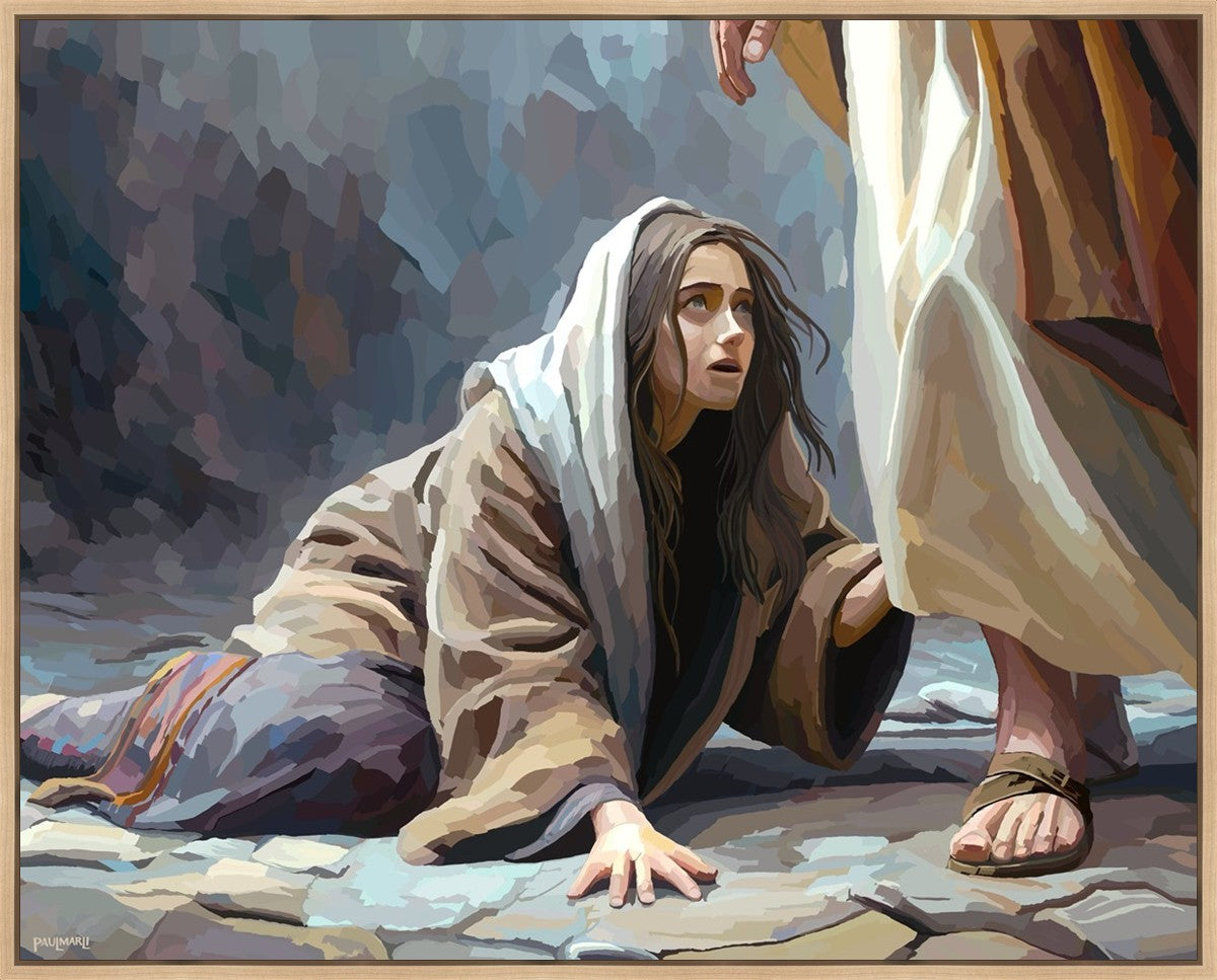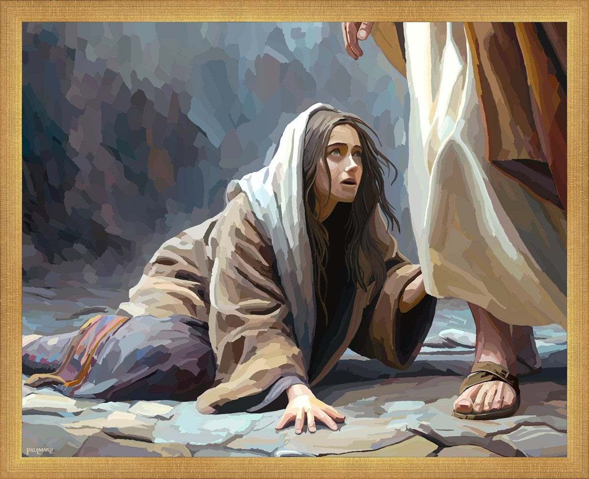 This scene found in the Bible is the woman with the issue of blood who suffered with her ailment for 12 years. Although the story portrayed a large crowd, I wanted to emphasize the one-on-one aspect of this story. Any “run-ins” with the Savior are personal between us and Him. I hope to portray this in part with the image of just the woman and Jesus without any other person.
