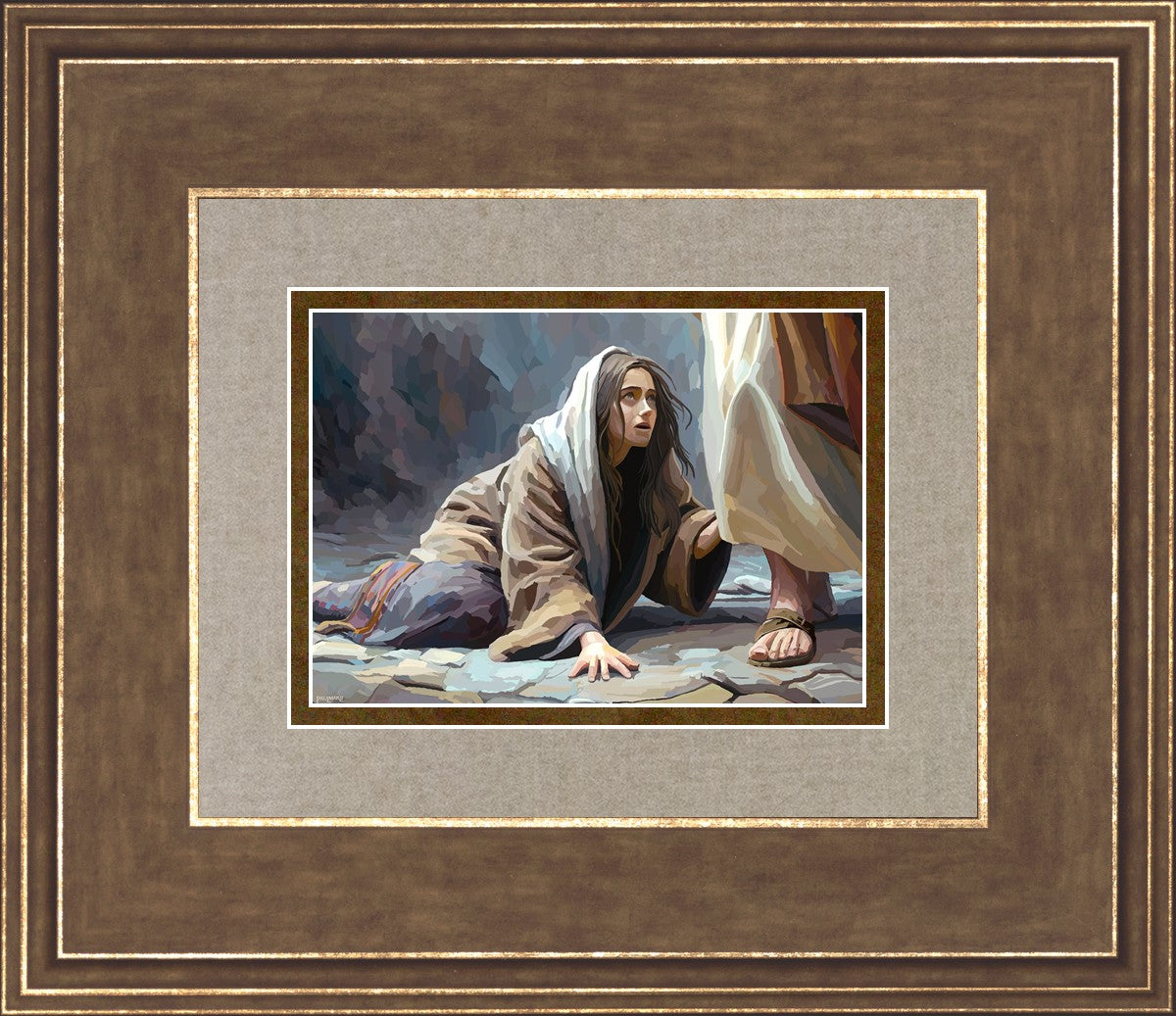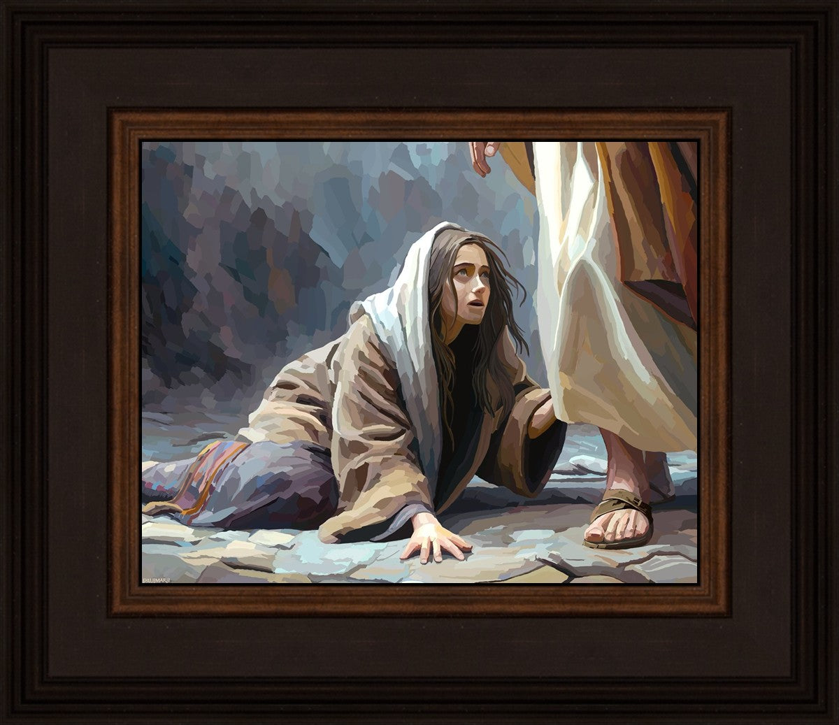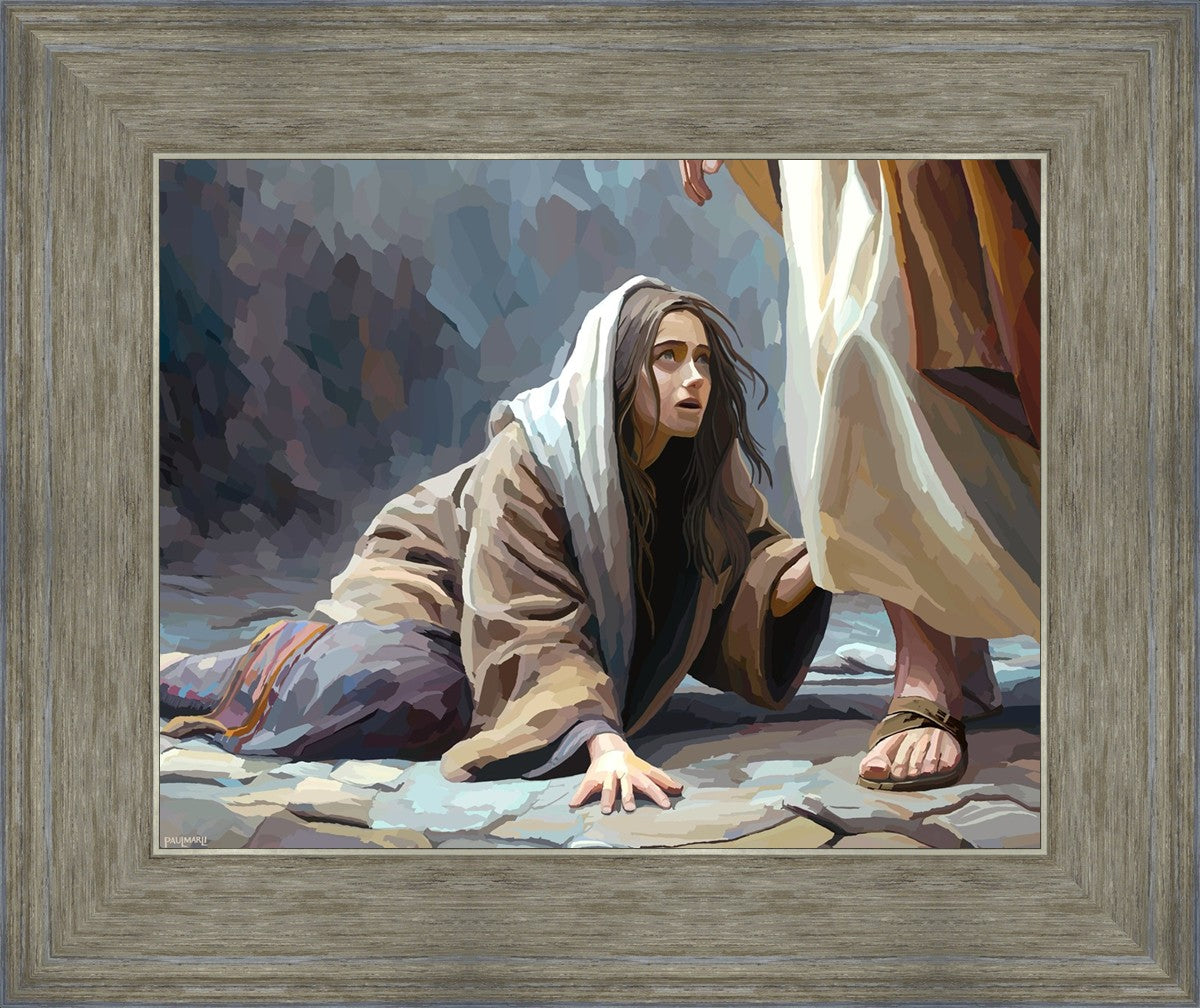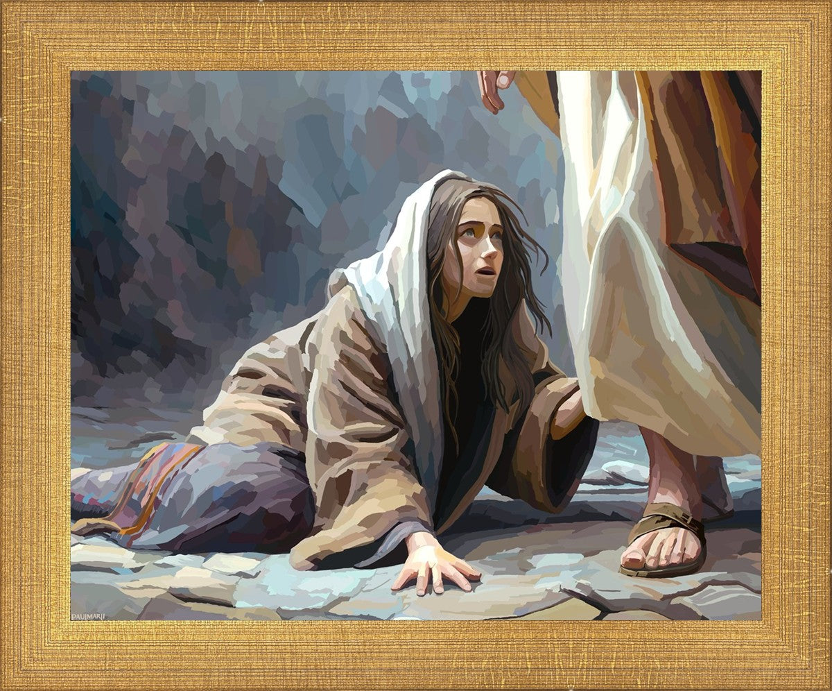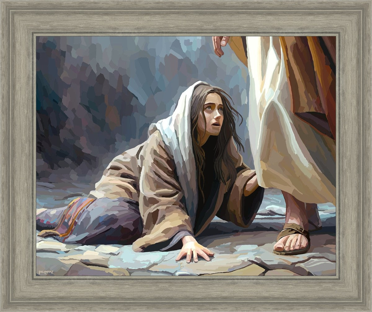 This scene found in the Bible is the woman with the issue of blood who suffered with her ailment for 12 years. Although the story portrayed a large crowd, I wanted to emphasize the one-on-one aspect of this story. Any “run-ins” with the Savior are personal between us and Him. I hope to portray this in part with the image of just the woman and Jesus without any other person.