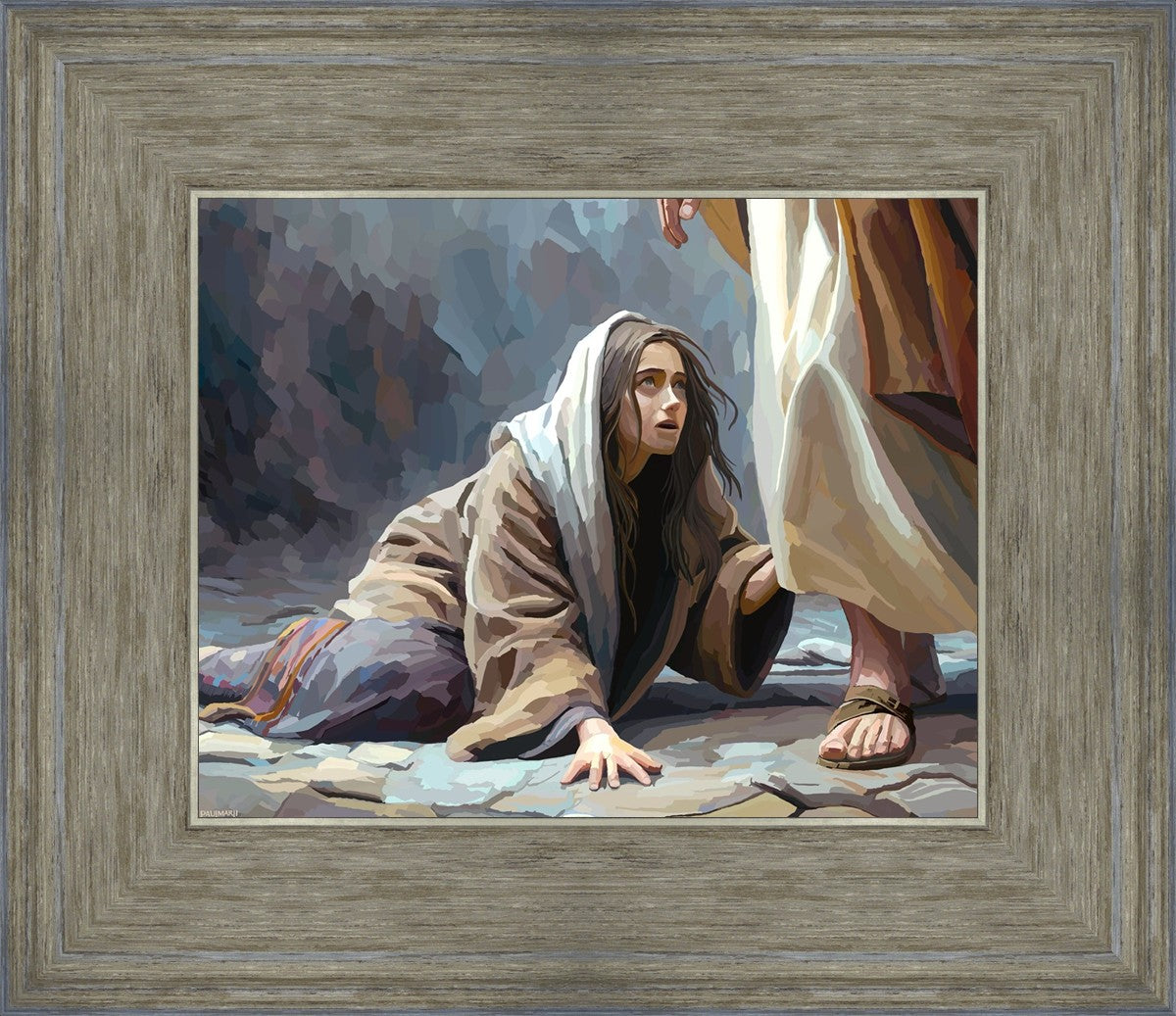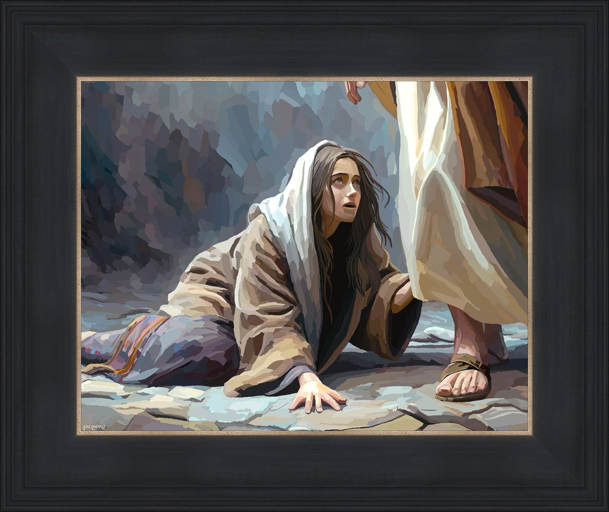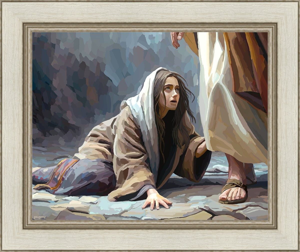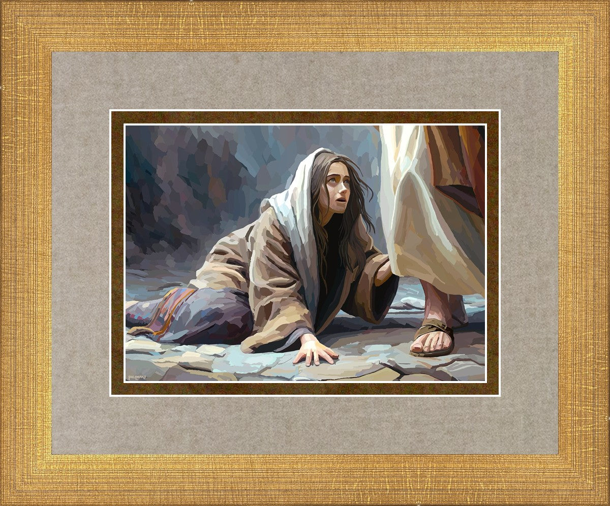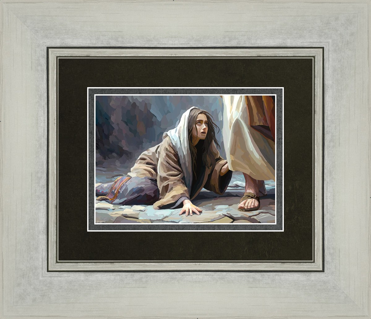 This scene found in the Bible is the woman with the issue of blood who suffered with her ailment for 12 years. Although the story portrayed a large crowd, I wanted to emphasize the one-on-one aspect of this story. Any “run-ins” with the Savior are personal between us and Him. I hope to portray this in part with the image of just the woman and Jesus without any other person.