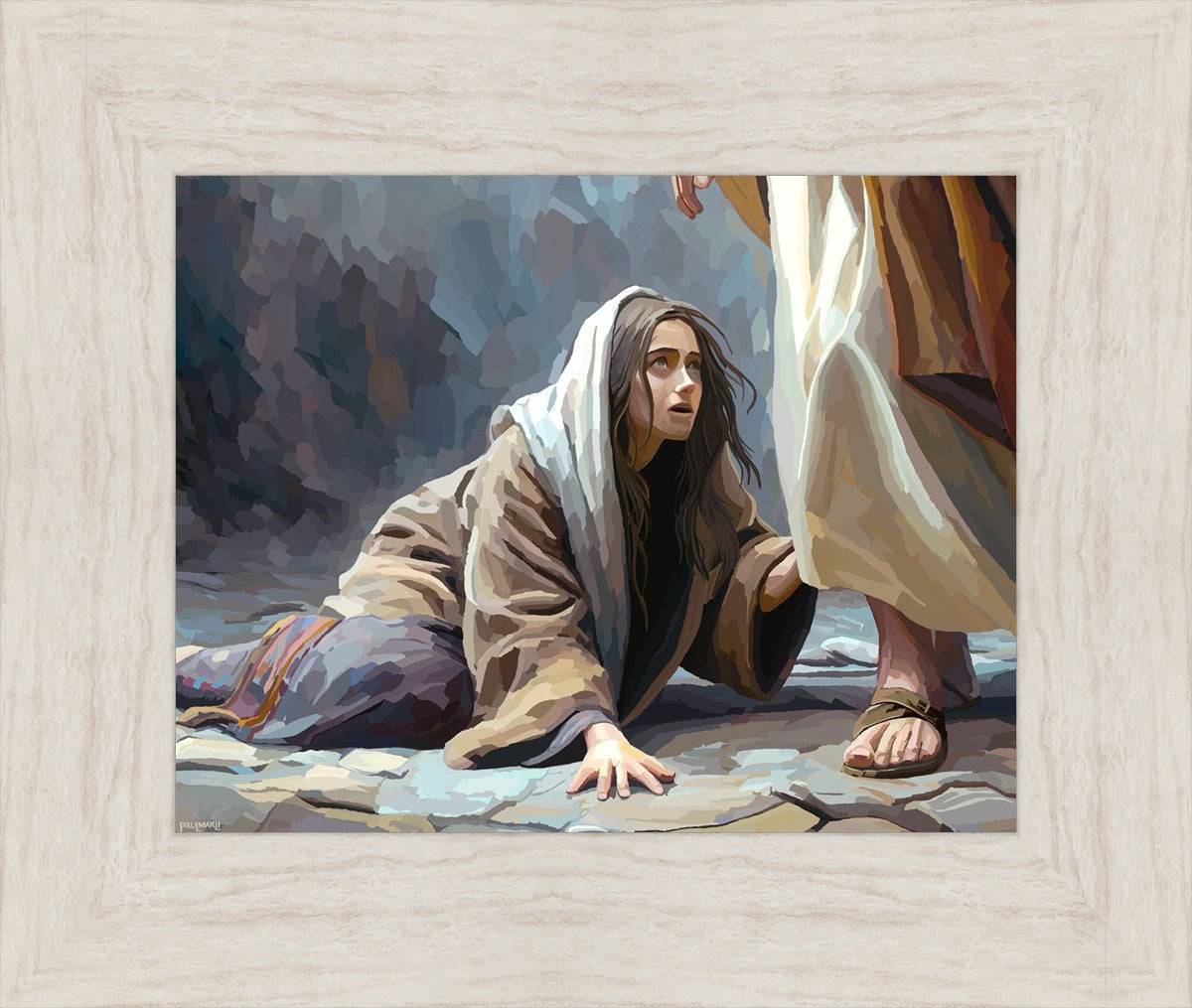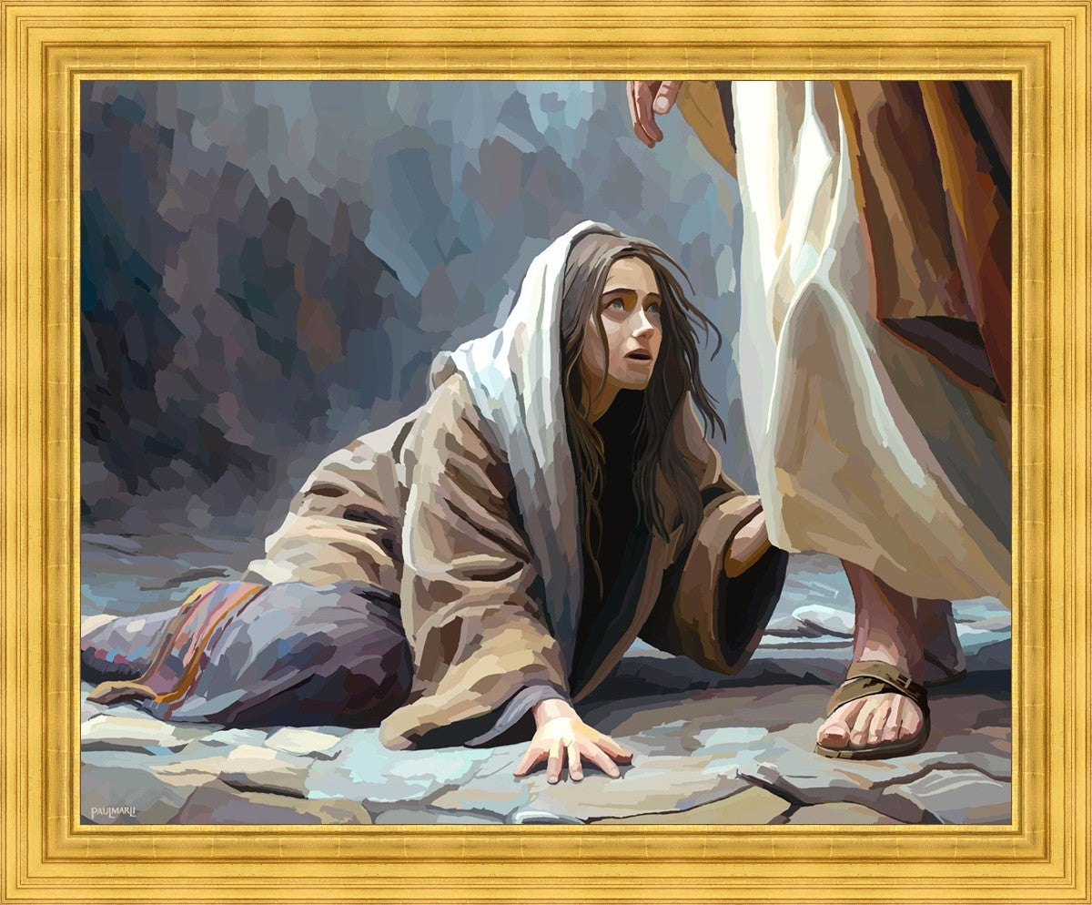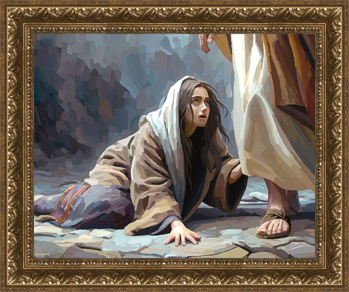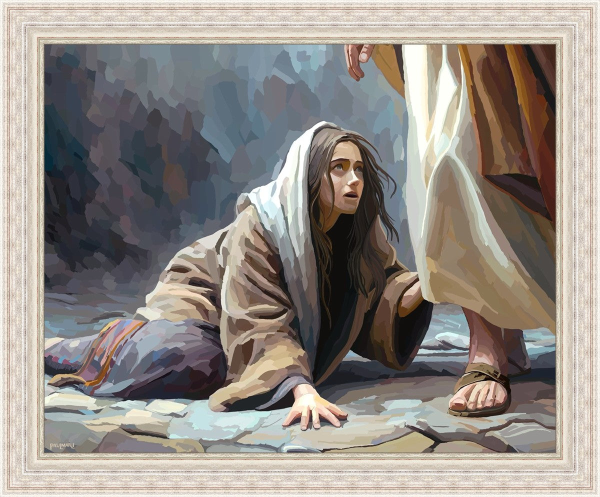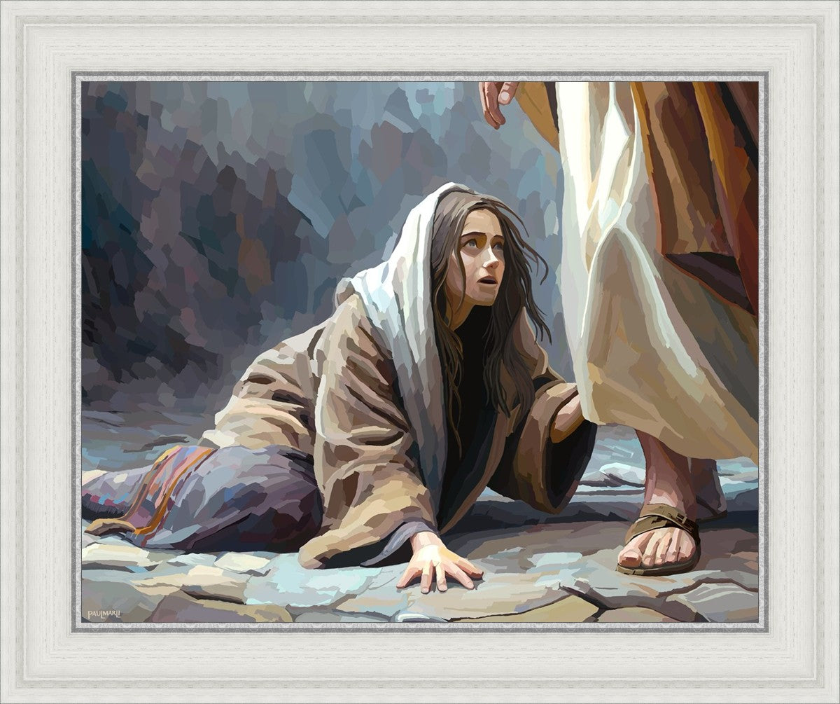 This scene found in the Bible is the woman with the issue of blood who suffered with her ailment for 12 years. Although the story portrayed a large crowd, I wanted to emphasize the one-on-one aspect of this story. Any “run-ins” with the Savior are personal between us and Him. I hope to portray this in part with the image of just the woman and Jesus without any other person.