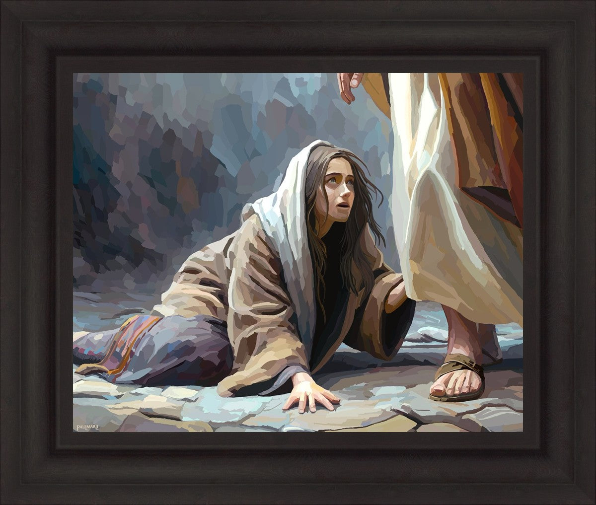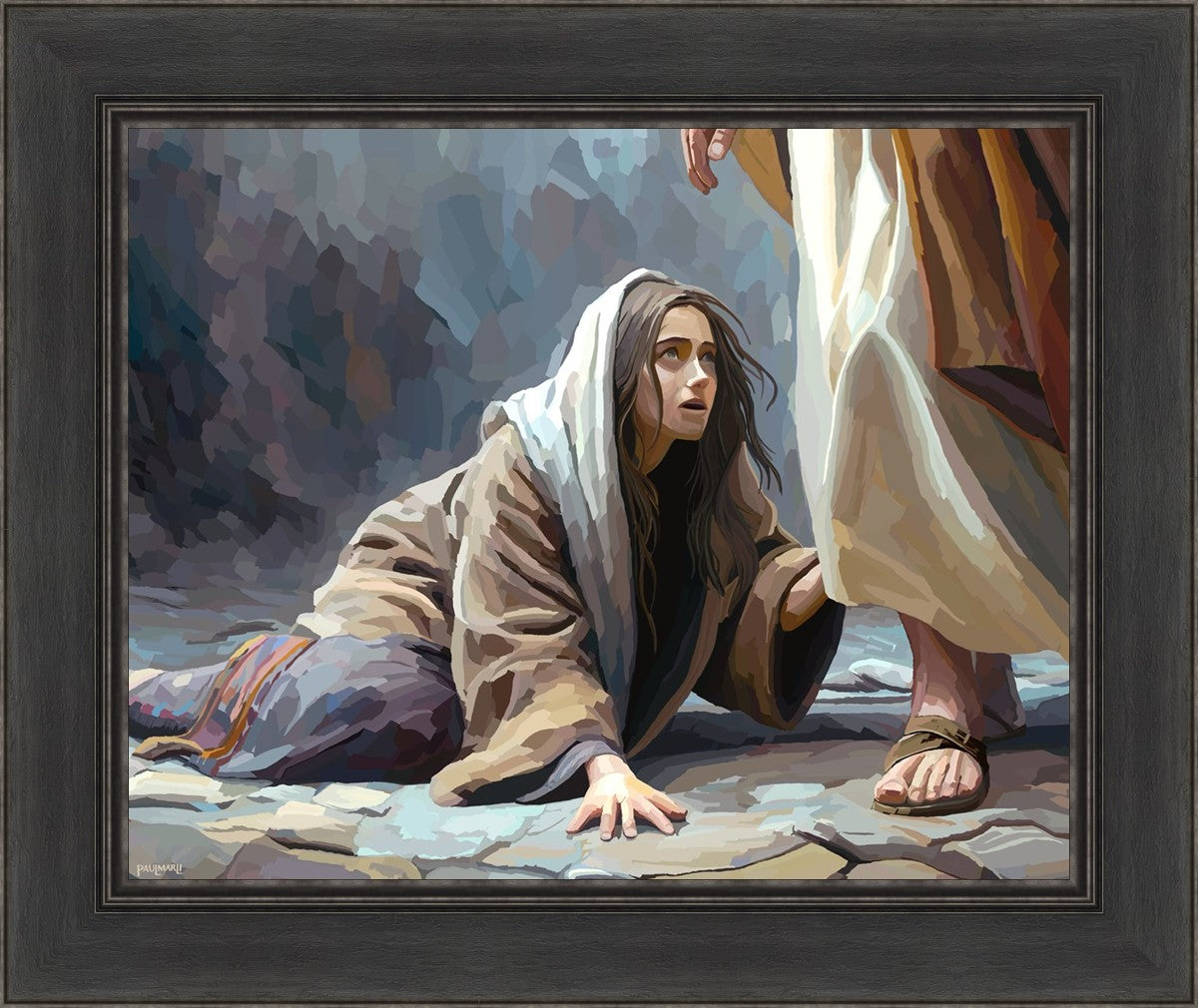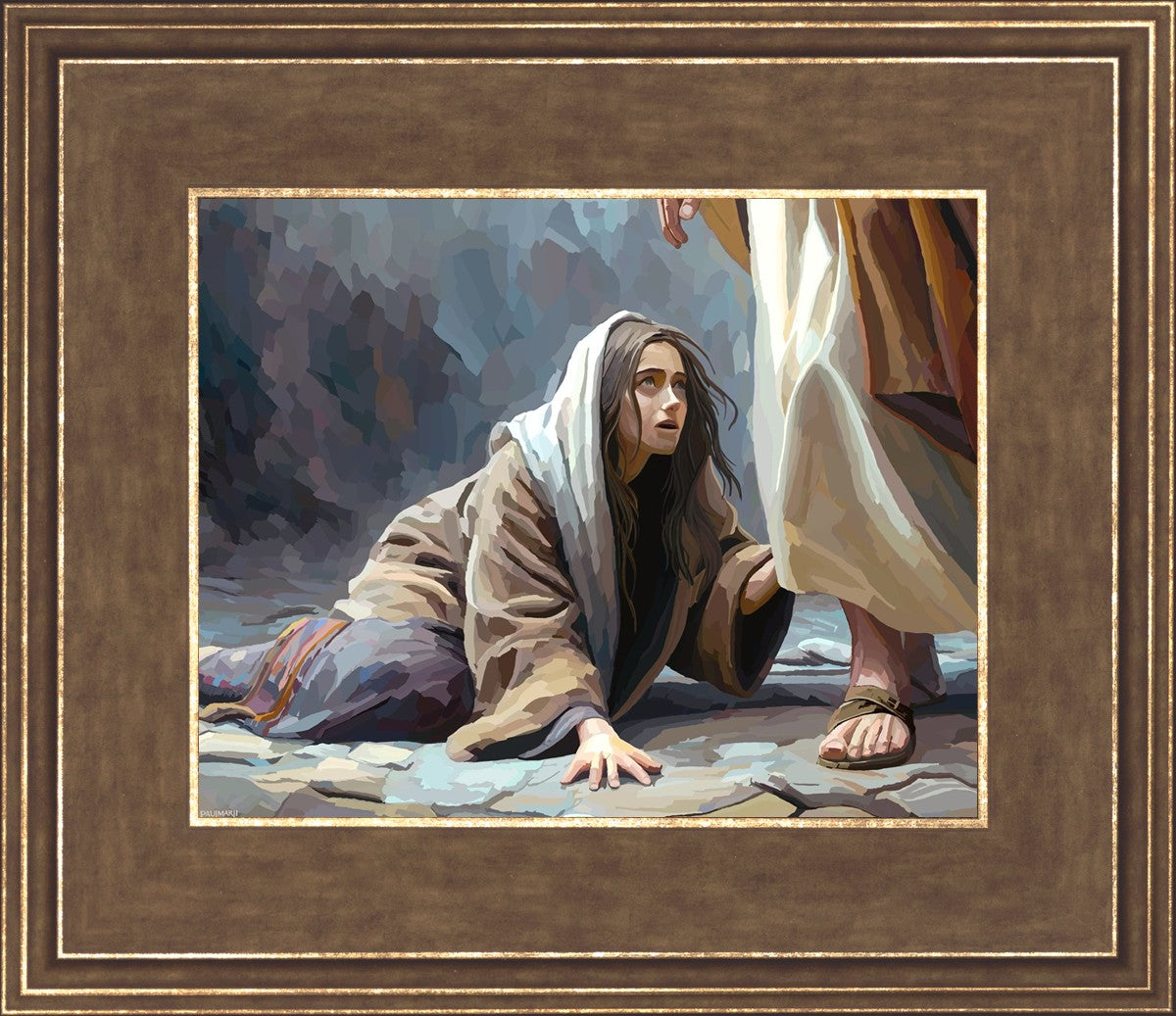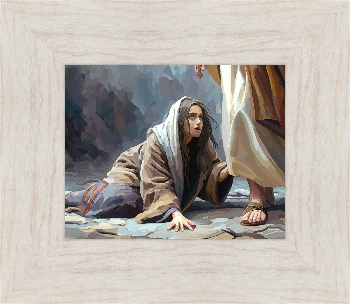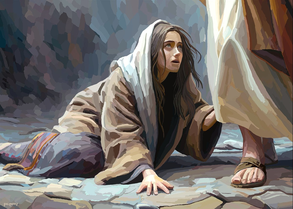 This scene found in the Bible is the woman with the issue of blood who suffered with her ailment for 12 years. Although the story portrayed a large crowd, I wanted to emphasize the one-on-one aspect of this story. Any “run-ins” with the Savior are personal between us and Him. I hope to portray this in part with the image of just the woman and Jesus without any other person.